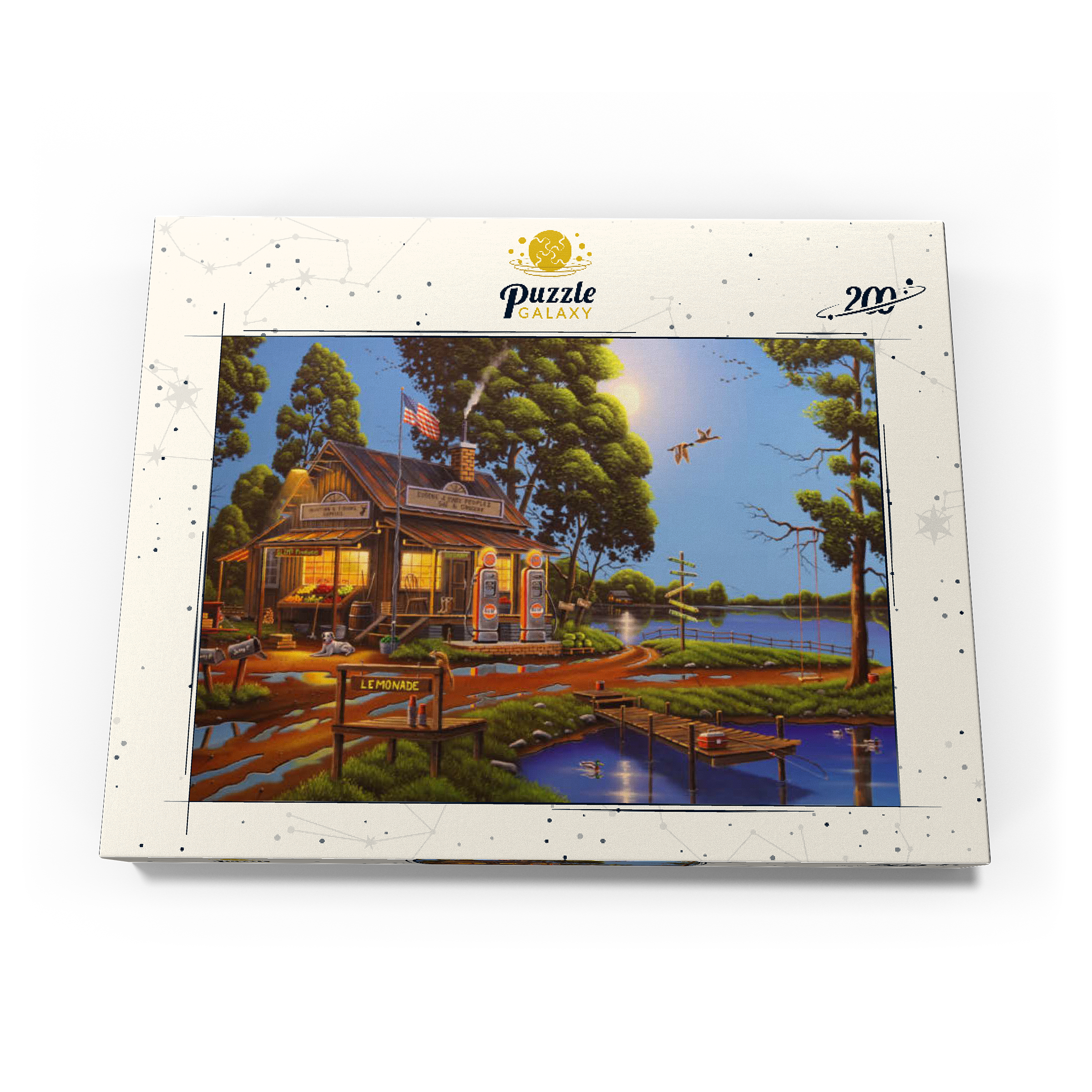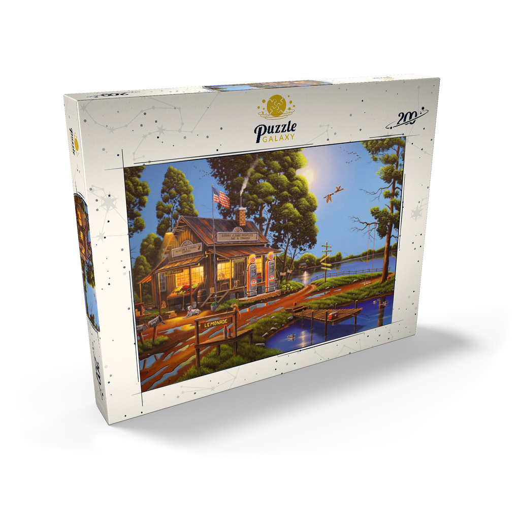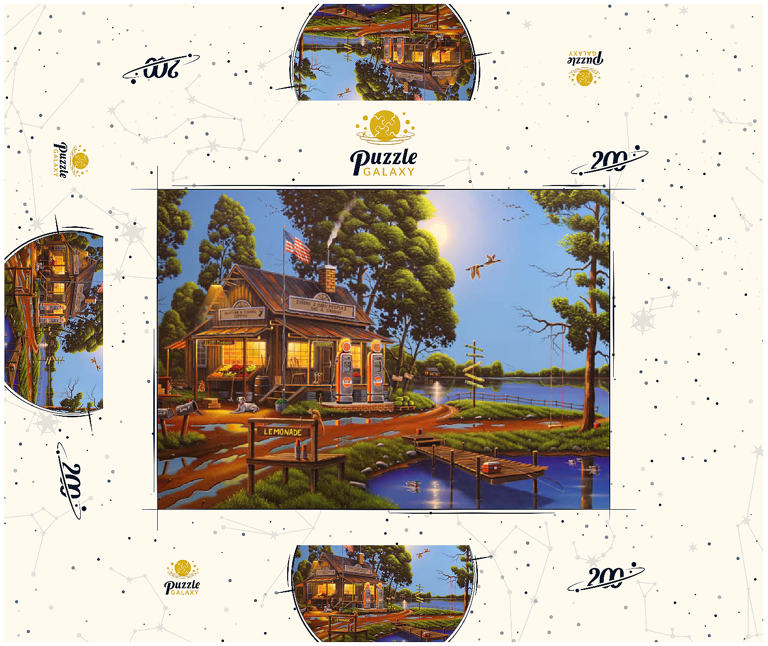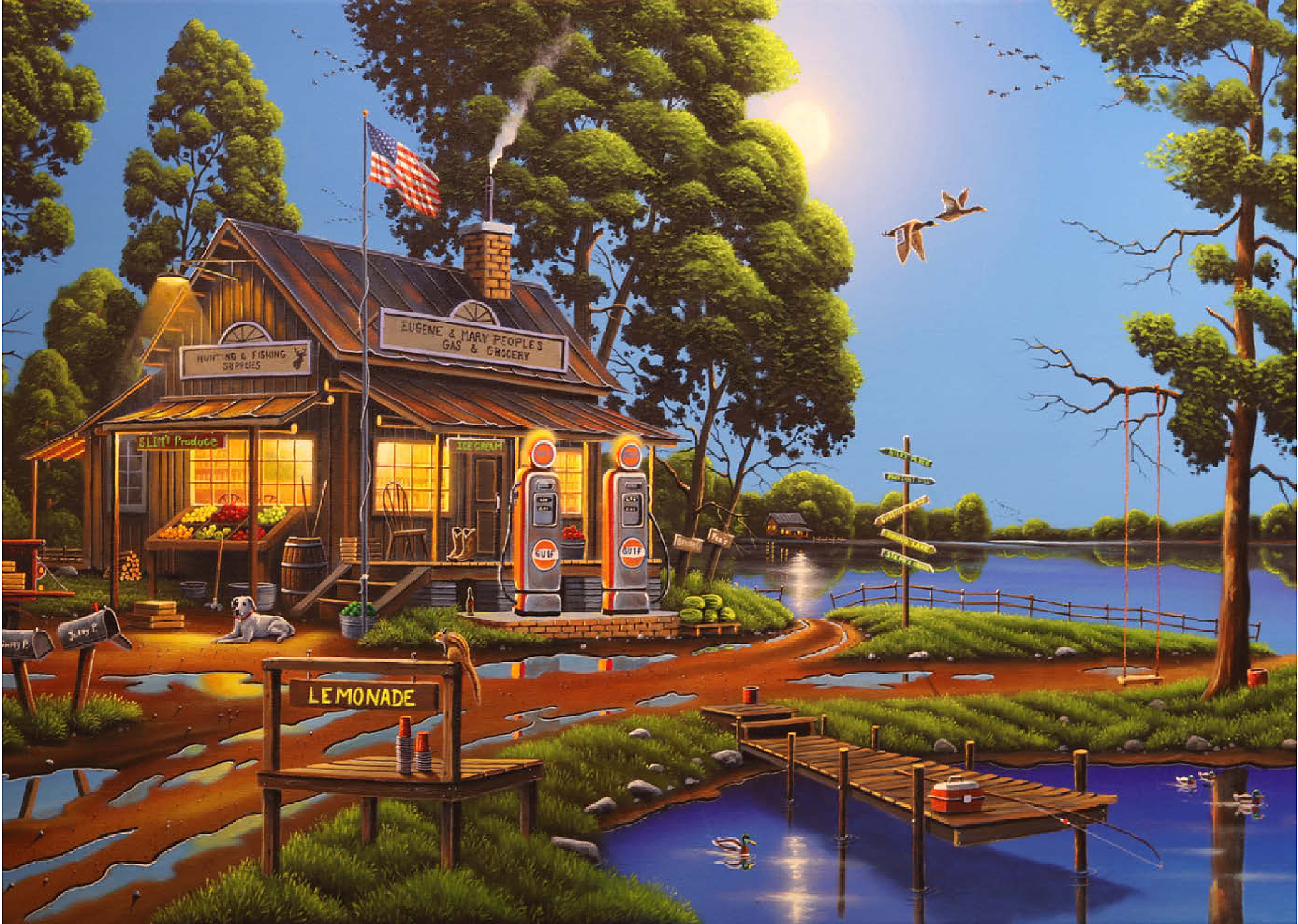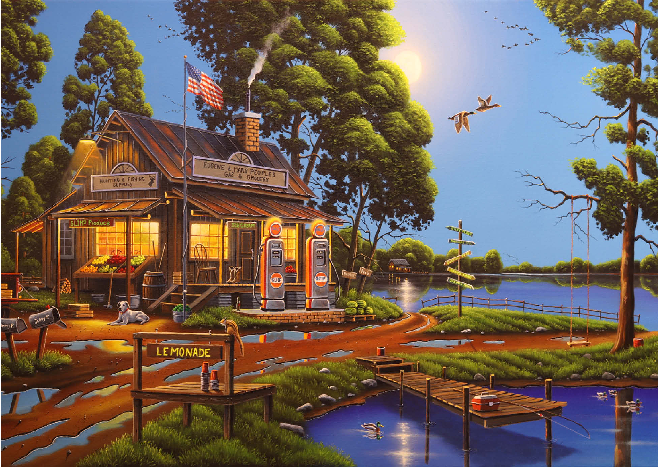 Diese charmante Seestattkulisse zeigt eine nostalgische Tankstelle und einen Lebensmittelladen auf dem Land im sanften Mondlicht. Der Laden mit dem Namen „Eugene & Mary People's Gas & Grocery” bietet Obst und Gemüse, Jagdausrüstung und Eis an, alles in einem einladenden Licht erstrahlend. Vor dem Laden stehen zwei alte Zapfsäulen, ein klassischer roter Lastwagen und ein freundlicher Hund runden die heimelige Atmosphäre ab. Ein Limonadenstand und ein Holzsteg bieten einen Blick auf den ruhigen See, auf dem Enten paddeln und eine Angel auf einen Biss wartet. Hohe Bäume, eine Seilschaukel und eine wehende amerikanische Flagge unterstreichen die zeitlose, friedliche Kulisse einer amerikanischen Kleinstadt.