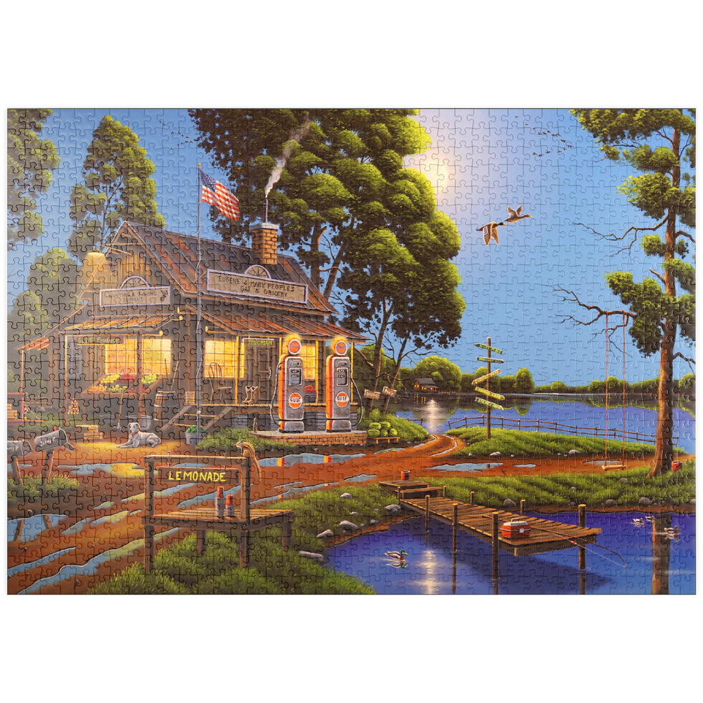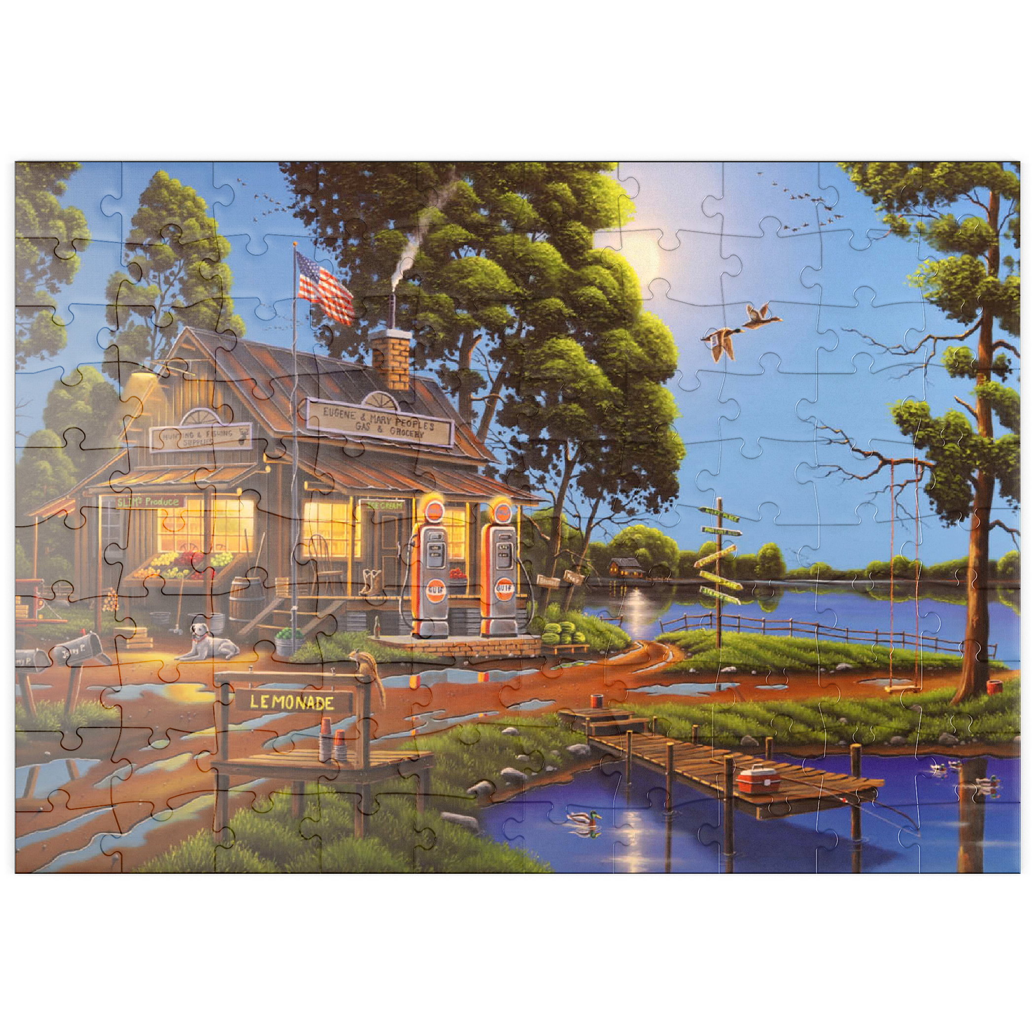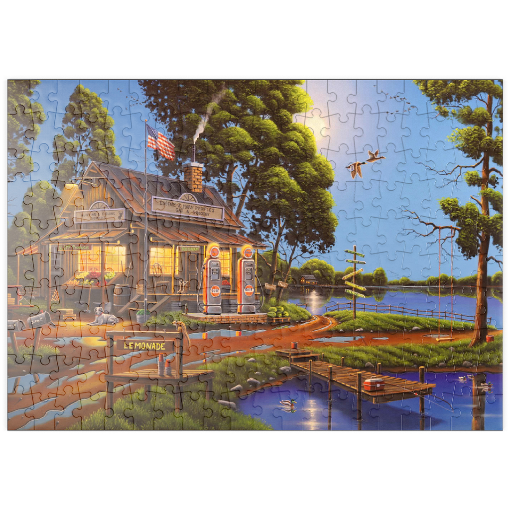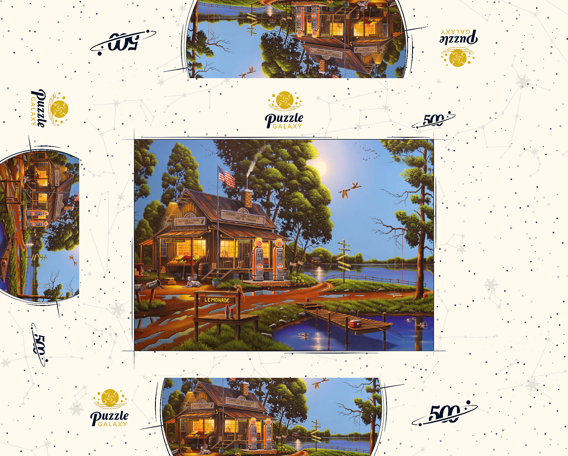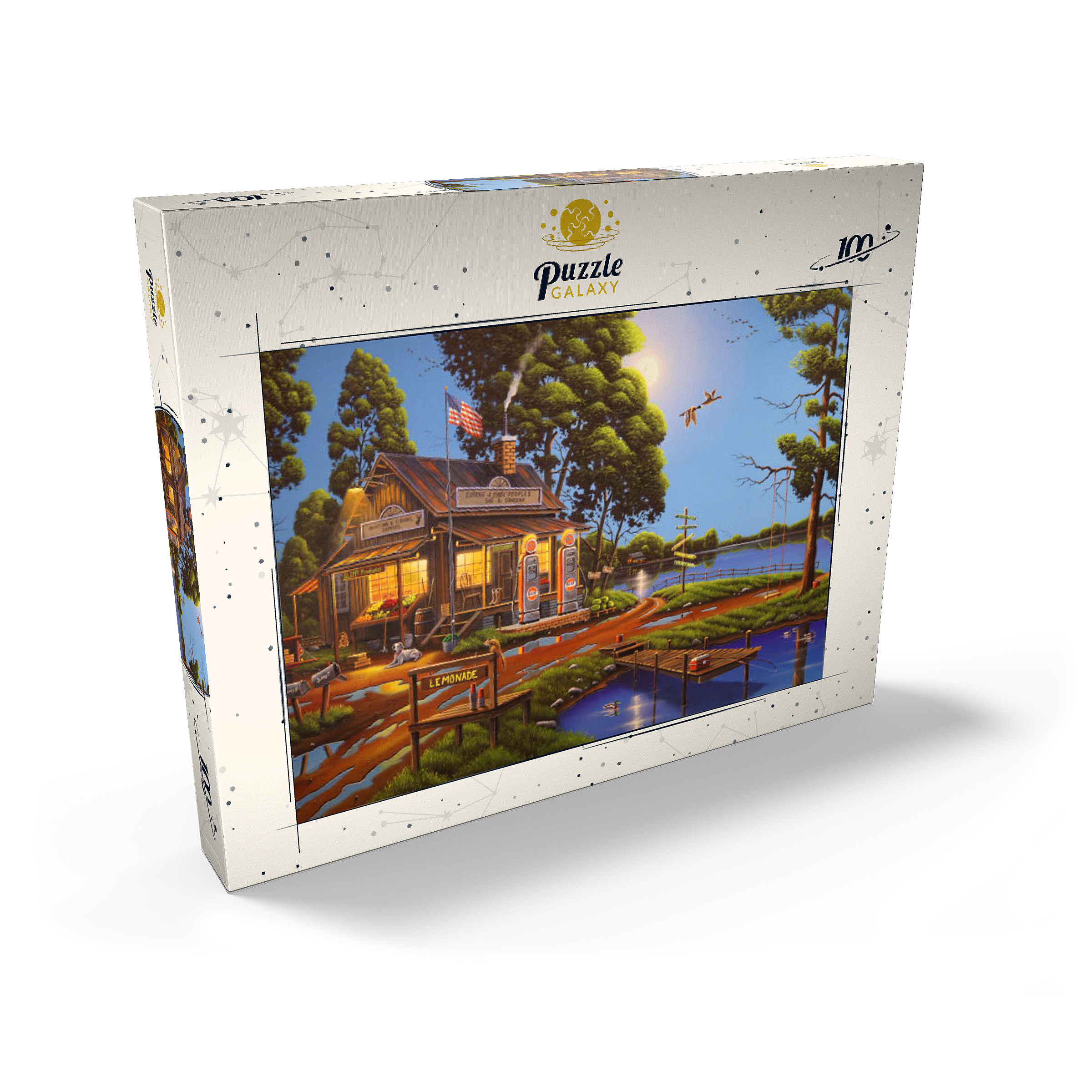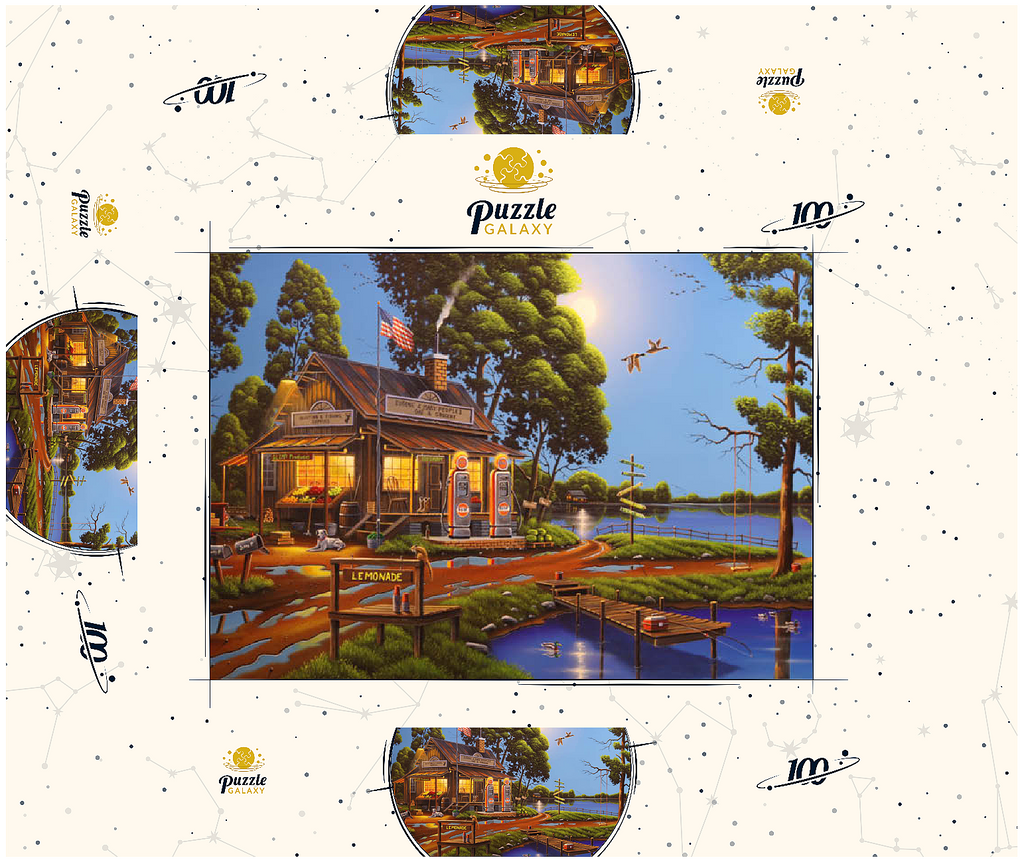 Diese charmante Seestattkulisse zeigt eine nostalgische Tankstelle und einen Lebensmittelladen auf dem Land im sanften Mondlicht. Der Laden mit dem Namen „Eugene & Mary People's Gas & Grocery” bietet Obst und Gemüse, Jagdausrüstung und Eis an, alles in einem einladenden Licht erstrahlend. Vor dem Laden stehen zwei alte Zapfsäulen, ein klassischer roter Lastwagen und ein freundlicher Hund runden die heimelige Atmosphäre ab. Ein Limonadenstand und ein Holzsteg bieten einen Blick auf den ruhigen See, auf dem Enten paddeln und eine Angel auf einen Biss wartet. Hohe Bäume, eine Seilschaukel und eine wehende amerikanische Flagge unterstreichen die zeitlose, friedliche Kulisse einer amerikanischen Kleinstadt.