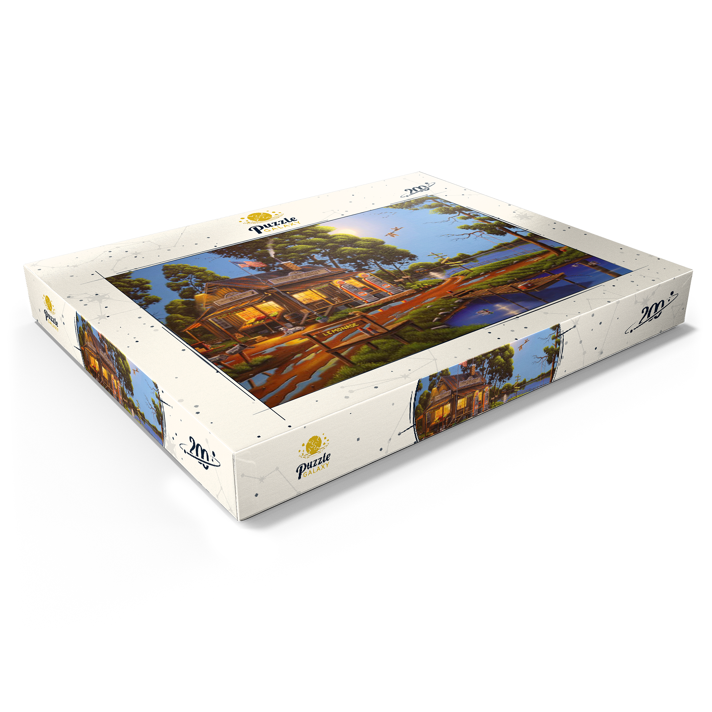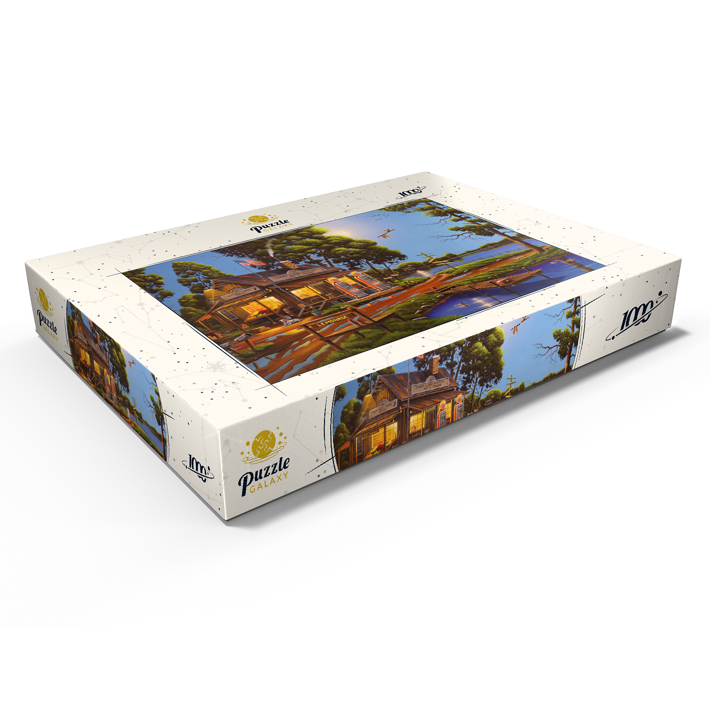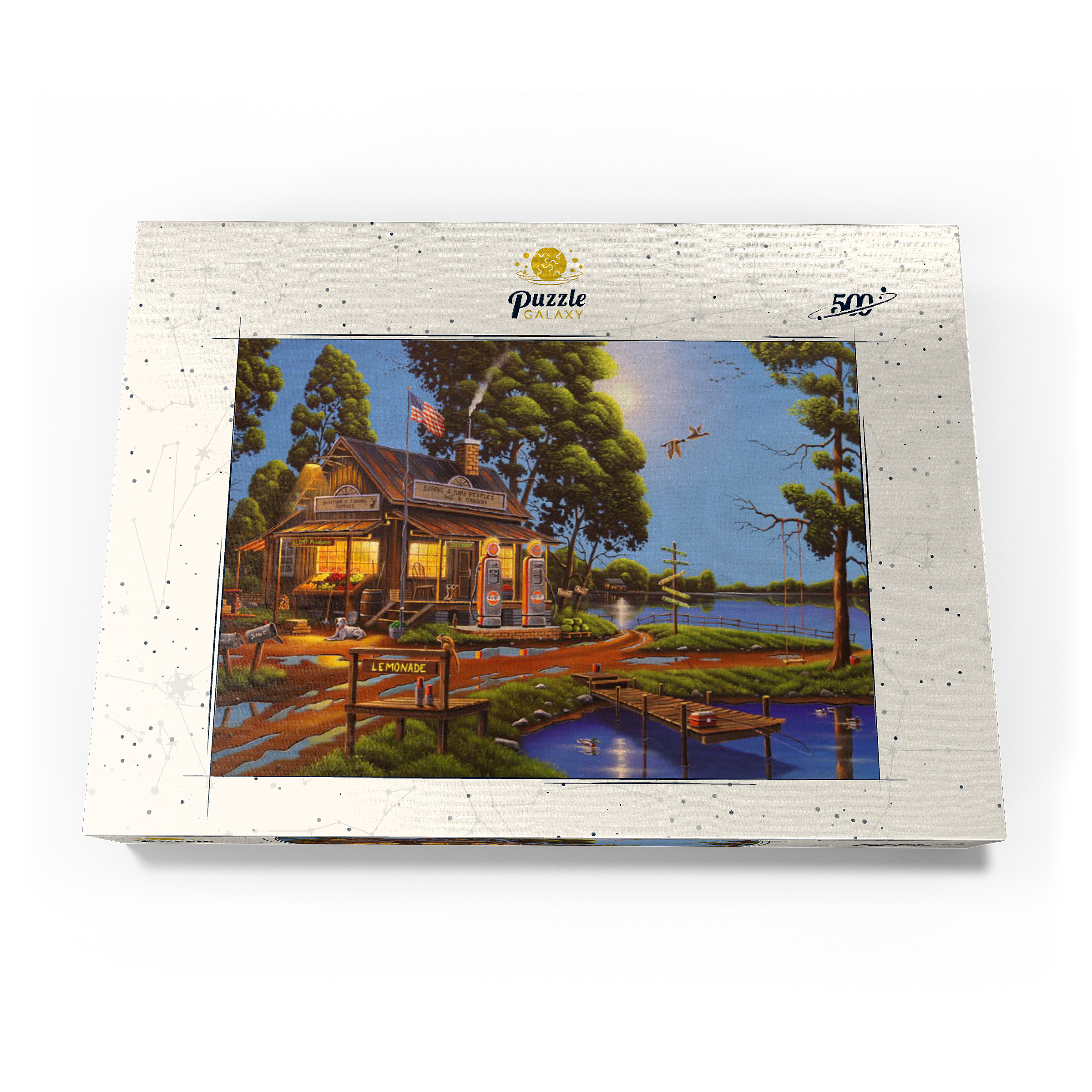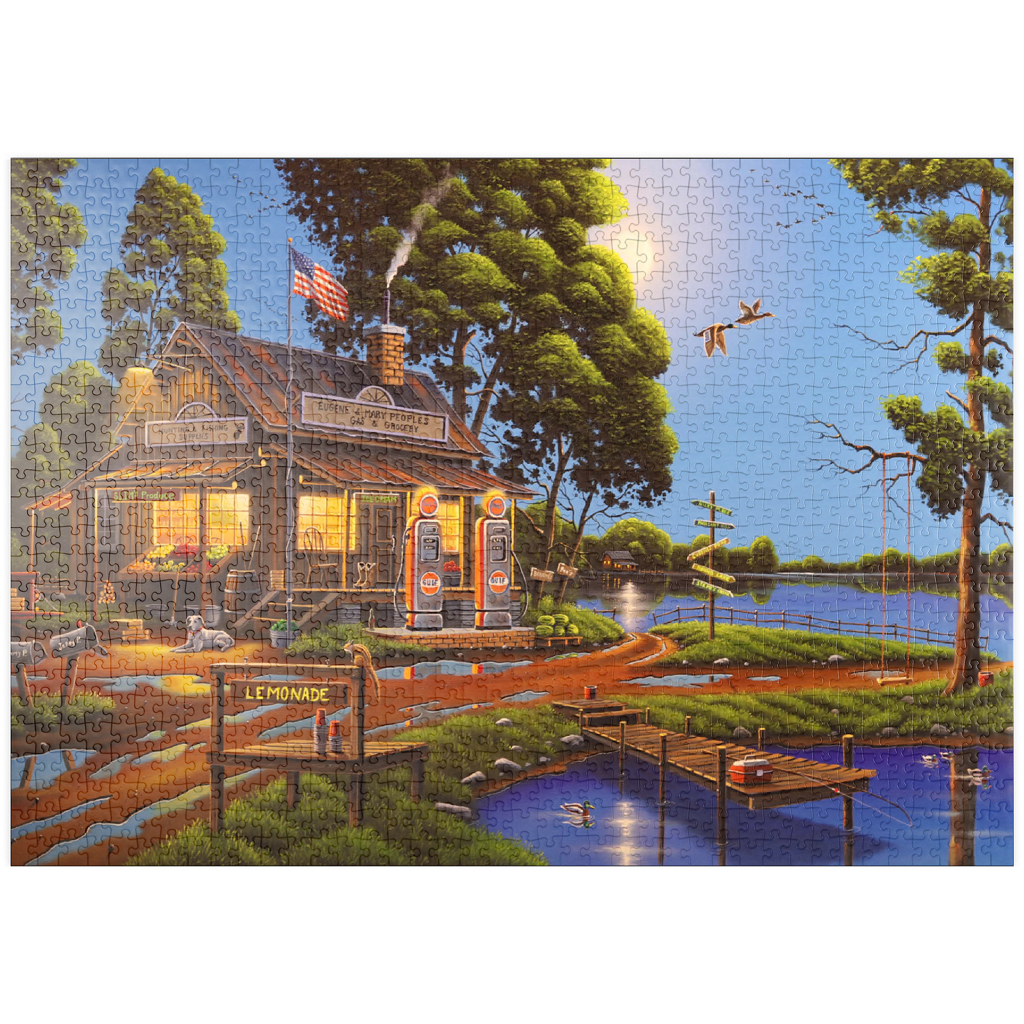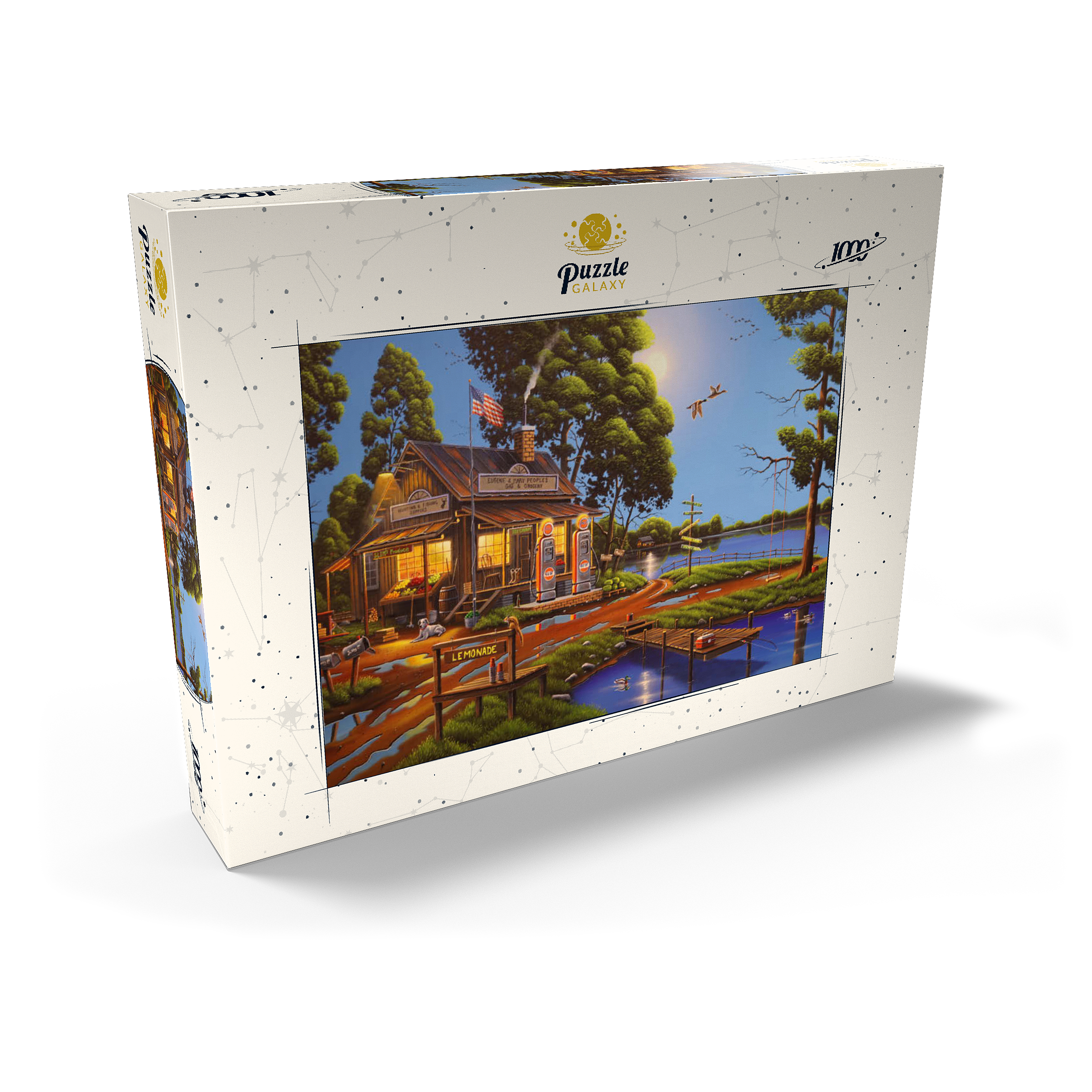 Diese charmante Seestattkulisse zeigt eine nostalgische Tankstelle und einen Lebensmittelladen auf dem Land im sanften Mondlicht. Der Laden mit dem Namen „Eugene & Mary People's Gas & Grocery” bietet Obst und Gemüse, Jagdausrüstung und Eis an, alles in einem einladenden Licht erstrahlend. Vor dem Laden stehen zwei alte Zapfsäulen, ein klassischer roter Lastwagen und ein freundlicher Hund runden die heimelige Atmosphäre ab. Ein Limonadenstand und ein Holzsteg bieten einen Blick auf den ruhigen See, auf dem Enten paddeln und eine Angel auf einen Biss wartet. Hohe Bäume, eine Seilschaukel und eine wehende amerikanische Flagge unterstreichen die zeitlose, friedliche Kulisse einer amerikanischen Kleinstadt.