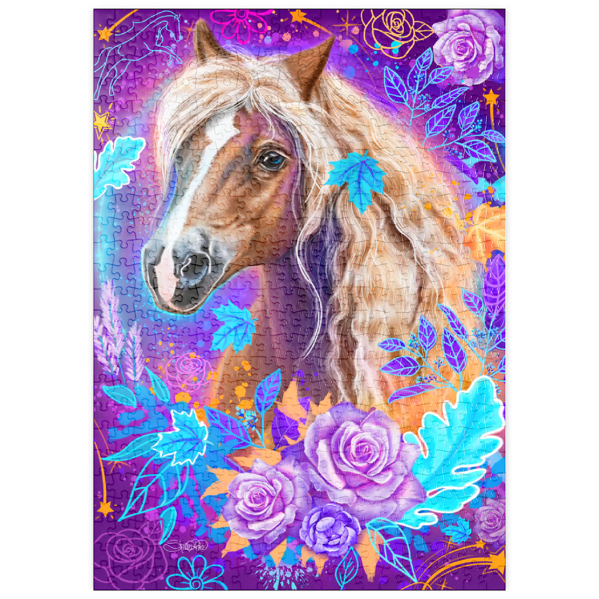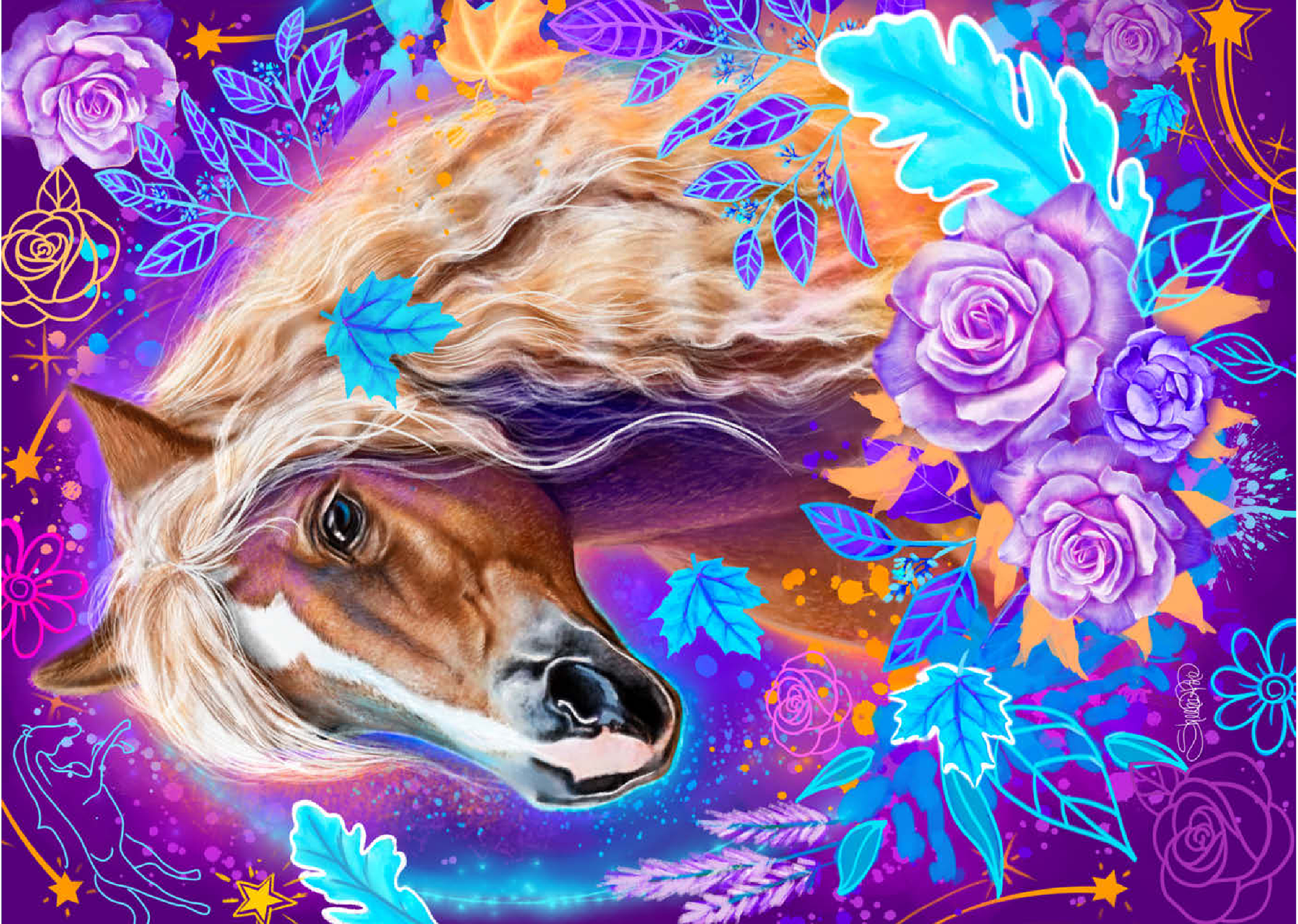 Es strotzt nur so vor einer reichen Palette aus tiefen Violetttönen, Neonblau, lebhaftem Lavendel und leuchtenden orangefarbenen Akzenten. Im Mittelpunkt steht ein wunderschön dargestelltes Pferd mit einer fließenden, hellen Mähne und einem ausdrucksstarken, fesselnden Blick. Es ist umgeben von einem ätherischen Rand aus leuchtenden Blumen, Rosen und stilisierten Blättern in leuchtenden Türkis- und Amethysttönen. Der Hintergrund ist ein dichter, kosmischer Nachthimmel, auf dem winzige Sterne und wirbelnde himmlische Elemente den rohen, ungezähmten Geist des Tieres darstellen.