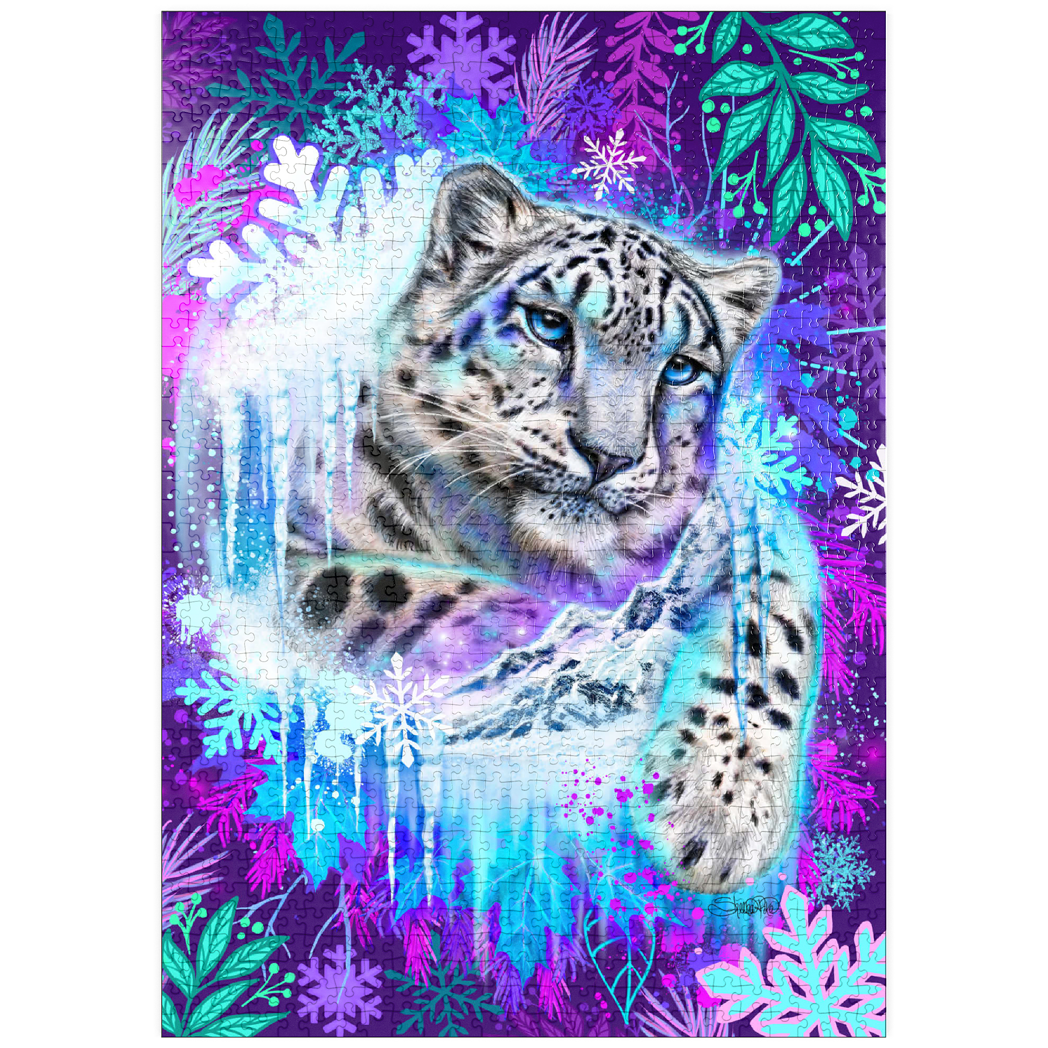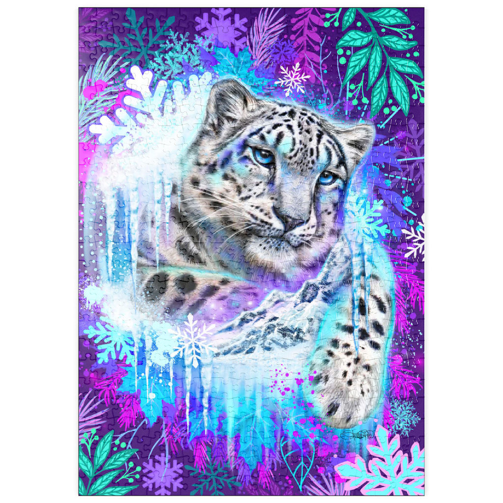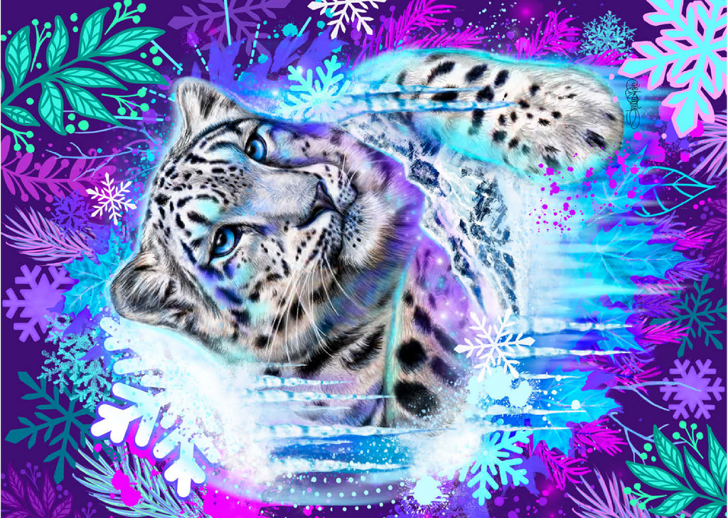 Ein äußerst lebendiges und atmosphärisches Porträt des majestätischen Schneeleoparden. Dieses atemberaubende Design fängt den Geist des Bergjägers inmitten einer Flut mystischer, arktischer Farben ein. Der Leopard, der mit fotorealistischen Details dargestellt ist, besticht durch seine faszinierenden eisblauen Augen und sein charakteristisches geflecktes Fell und scheint aus einem gefrorenen Portal hervorzutreten. Er wird dramatisch eingerahmt von leuchtenden türkisfarbenen Eiszapfen und einem dynamischen Rand aus überdimensionalen, dekorativen Schneeflocken und Winterlaub. Der Hintergrund ist eine dichte, elektrisch violette und magentafarbene Leinwand, die einen atemberaubenden Kontrast zu den kühlen Tönen des Eises und des Fells des Leoparden bildet.