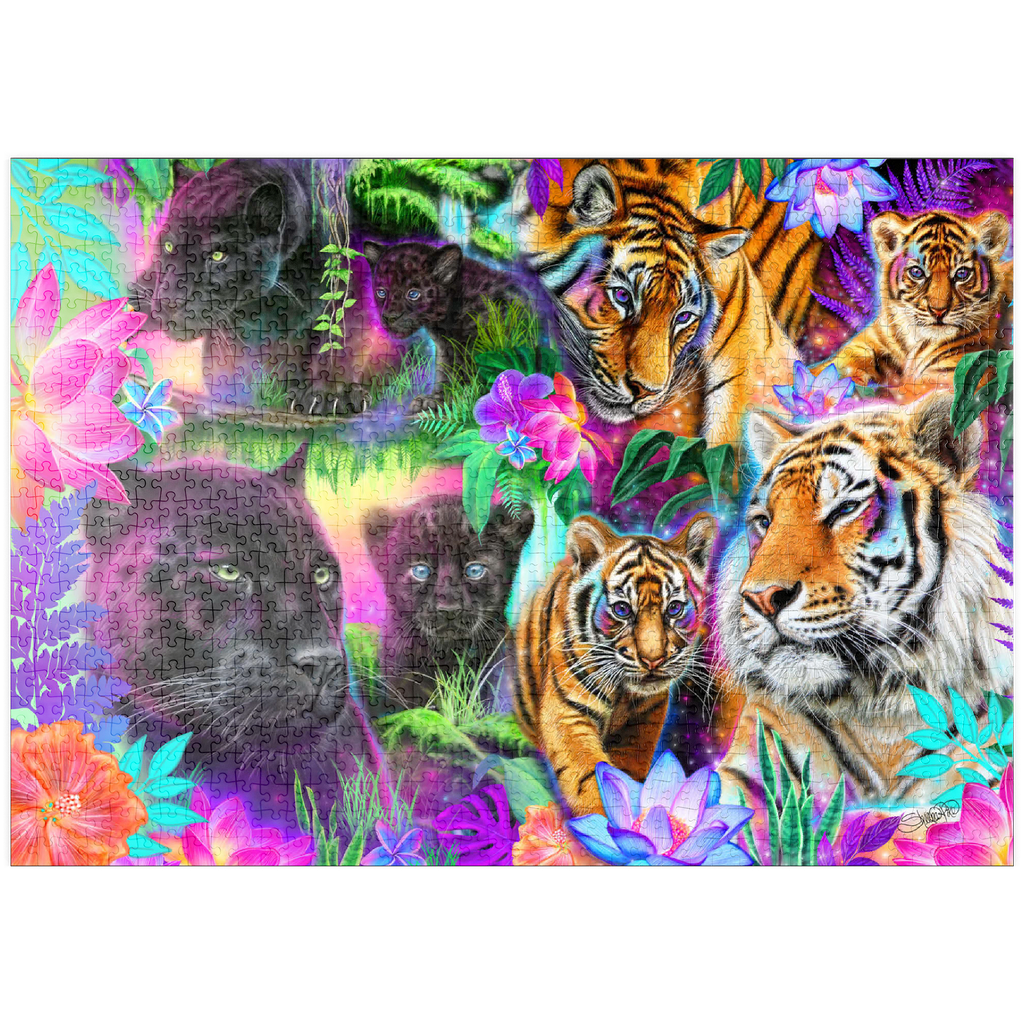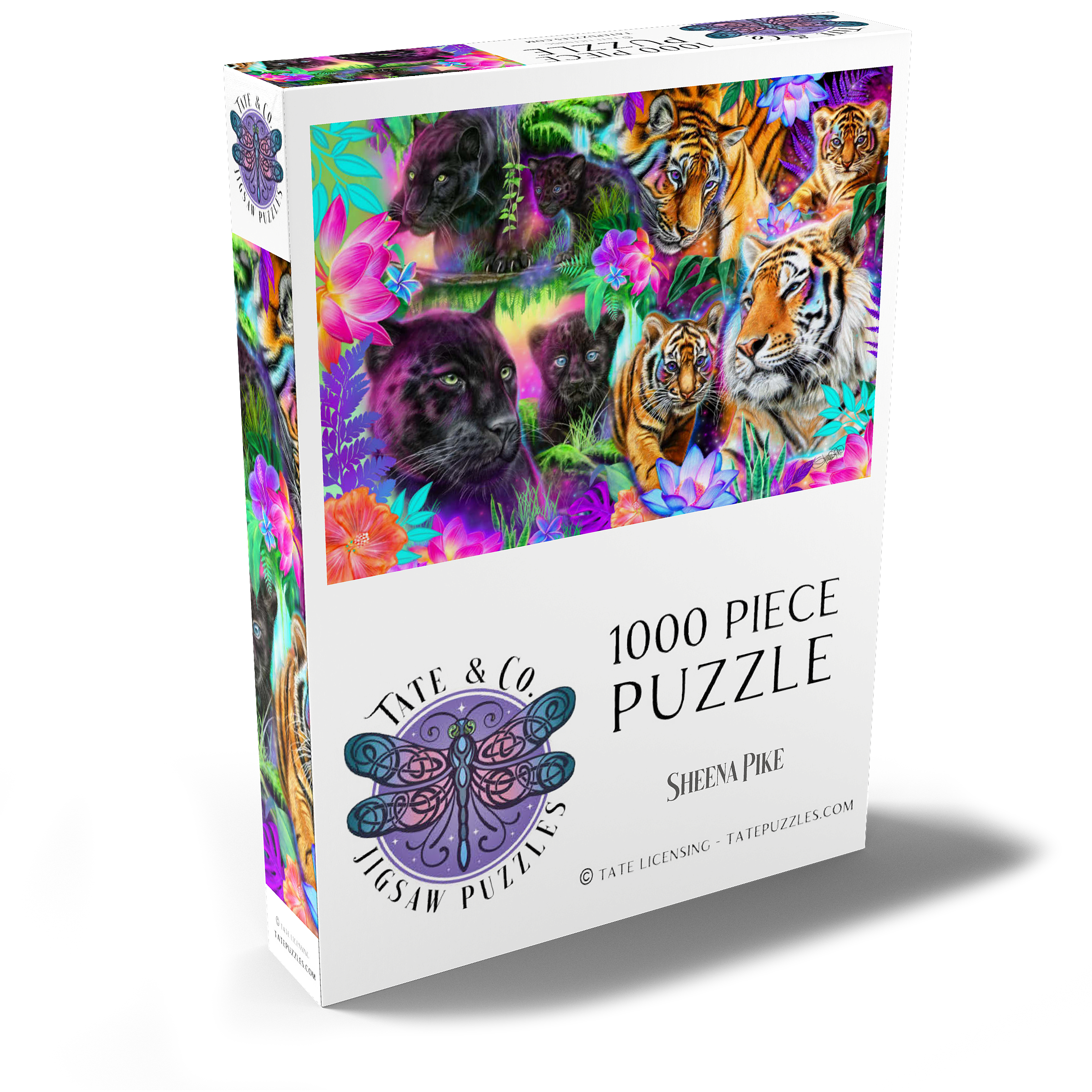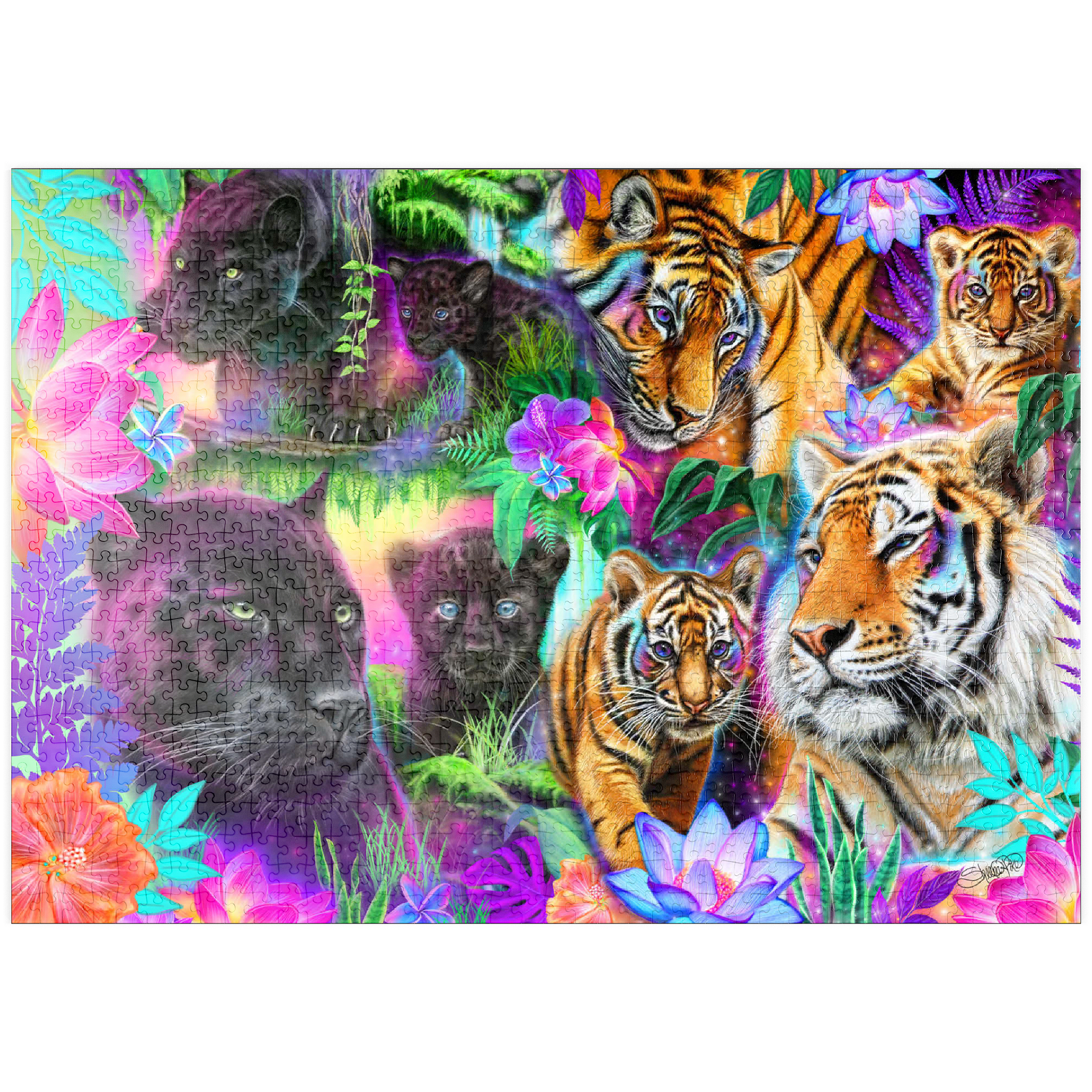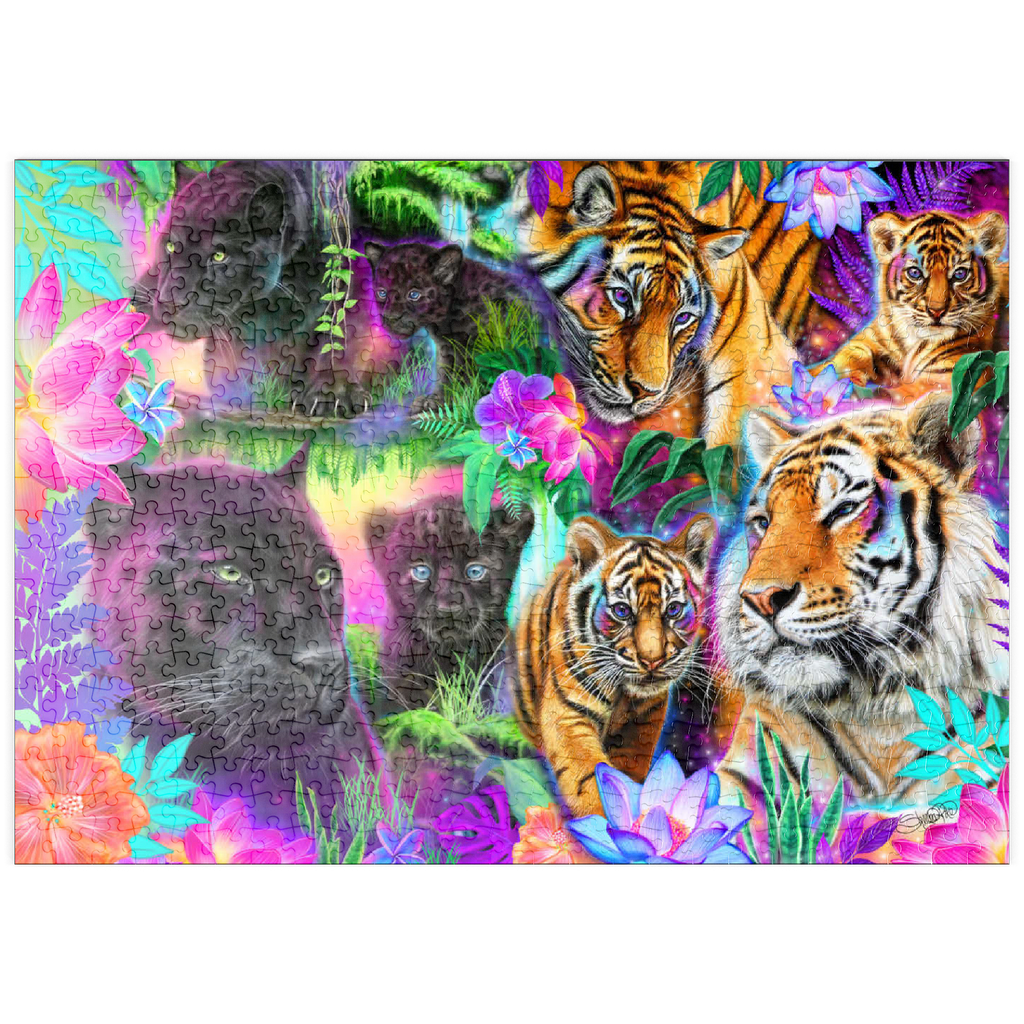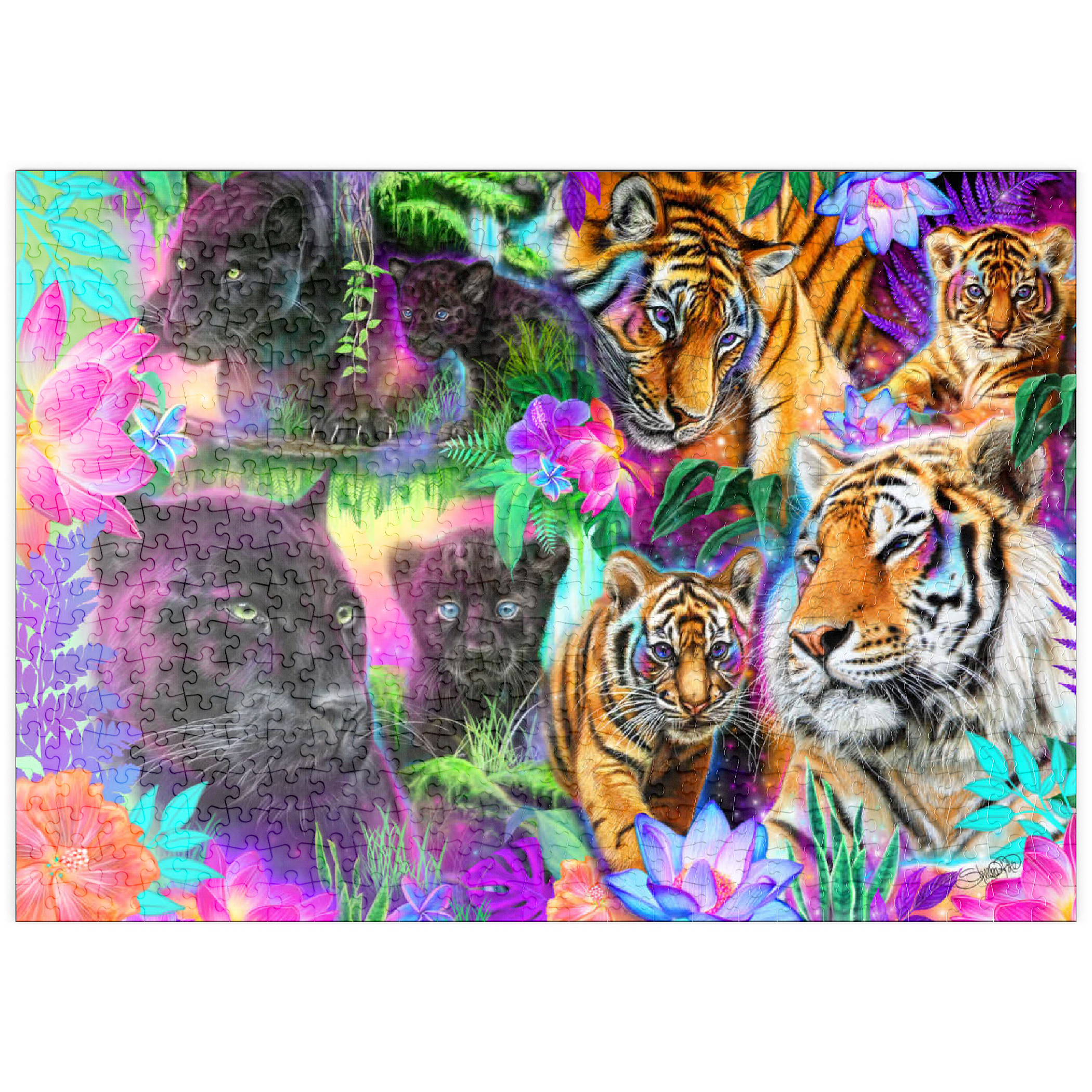 Dieses Kunstwerk von Sheena Pike strotzt vor leuchtenden tropischen Farben und zeigt mächtige Jaguare und Tiger inmitten üppiger Vegetation. Die auffällige Neonpalette – satte Rosa-, leuchtende Grün- und kräftige Gelbtöne – schafft eine traumhafte Atmosphäre und erweckt den Dschungel zum Leben. Exotische Blumen und wirbelnde Ranken verleihen dem Bild Tiefe, während die dynamischen Posen der Tiere Bewegung und Wildheit vermitteln. Dieses faszinierende Werk eignet sich perfekt zum Puzzeln, da jeder Abschnitt komplexe Details und atemberaubende Farbkombinationen offenbart und dazu einlädt, dieses schillernde tropische Paradies zu erkunden.