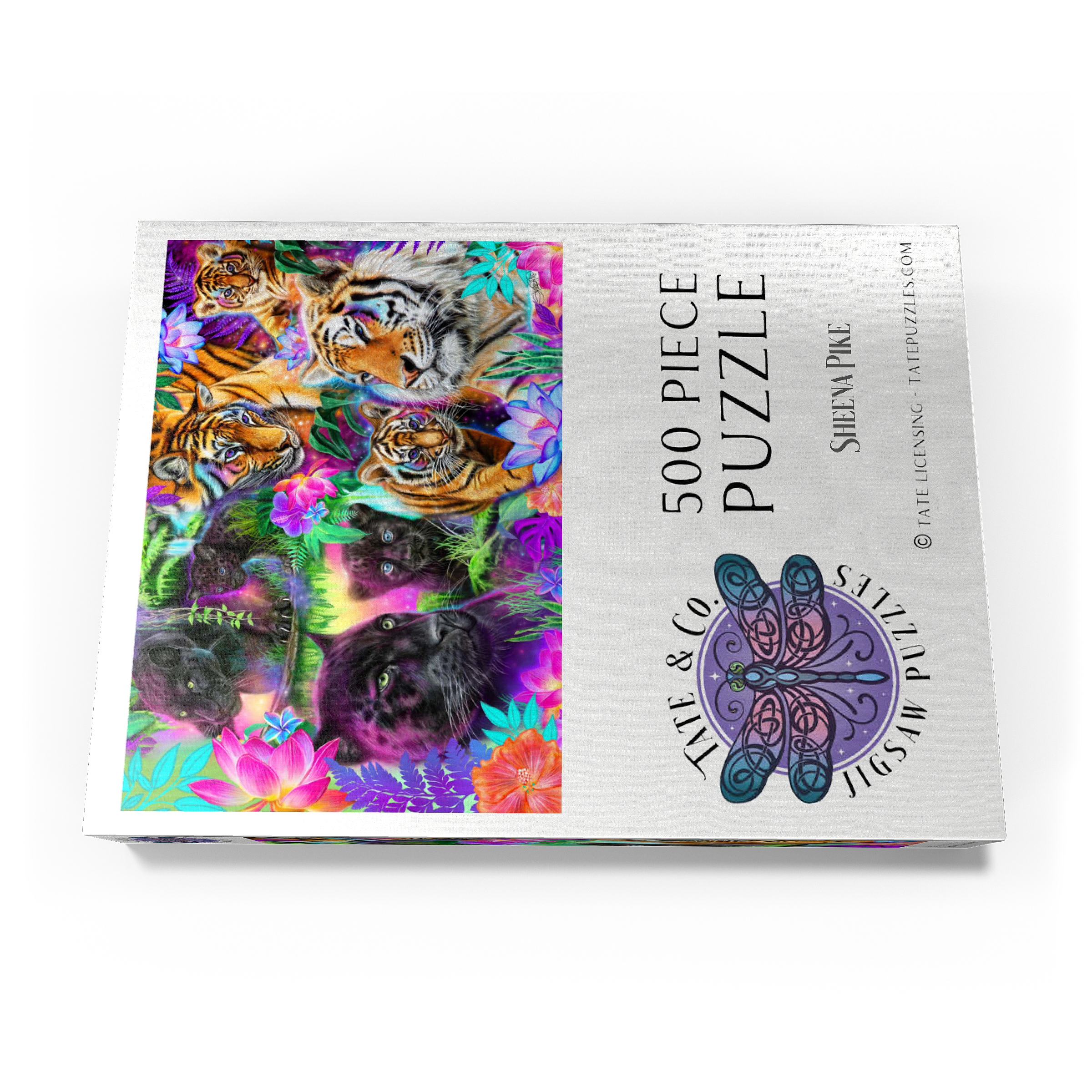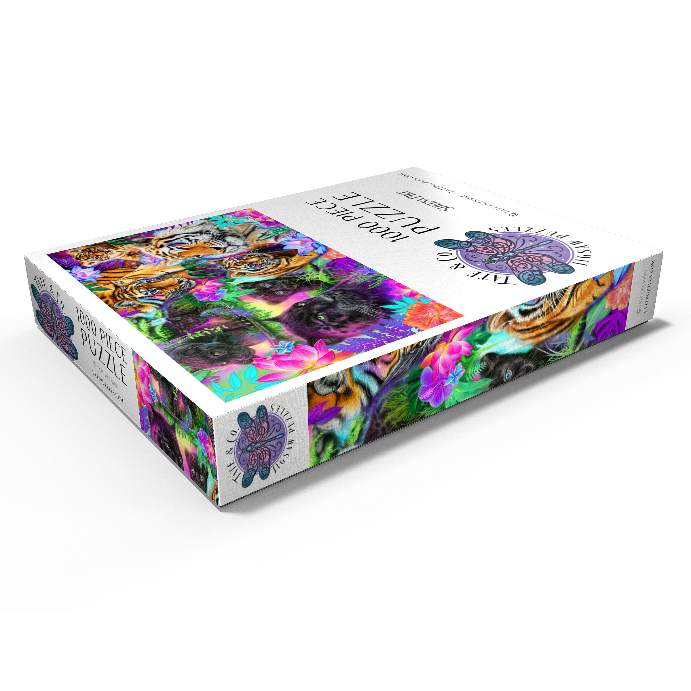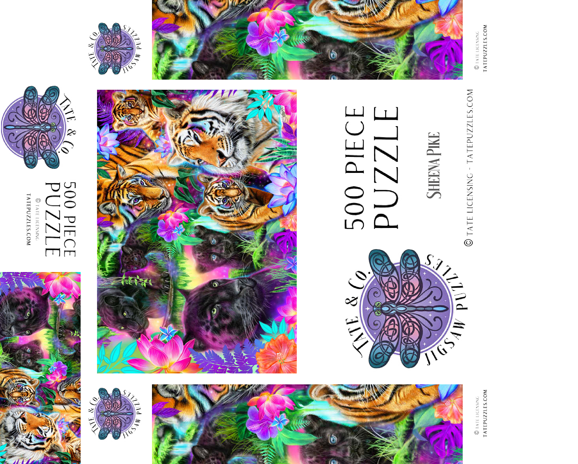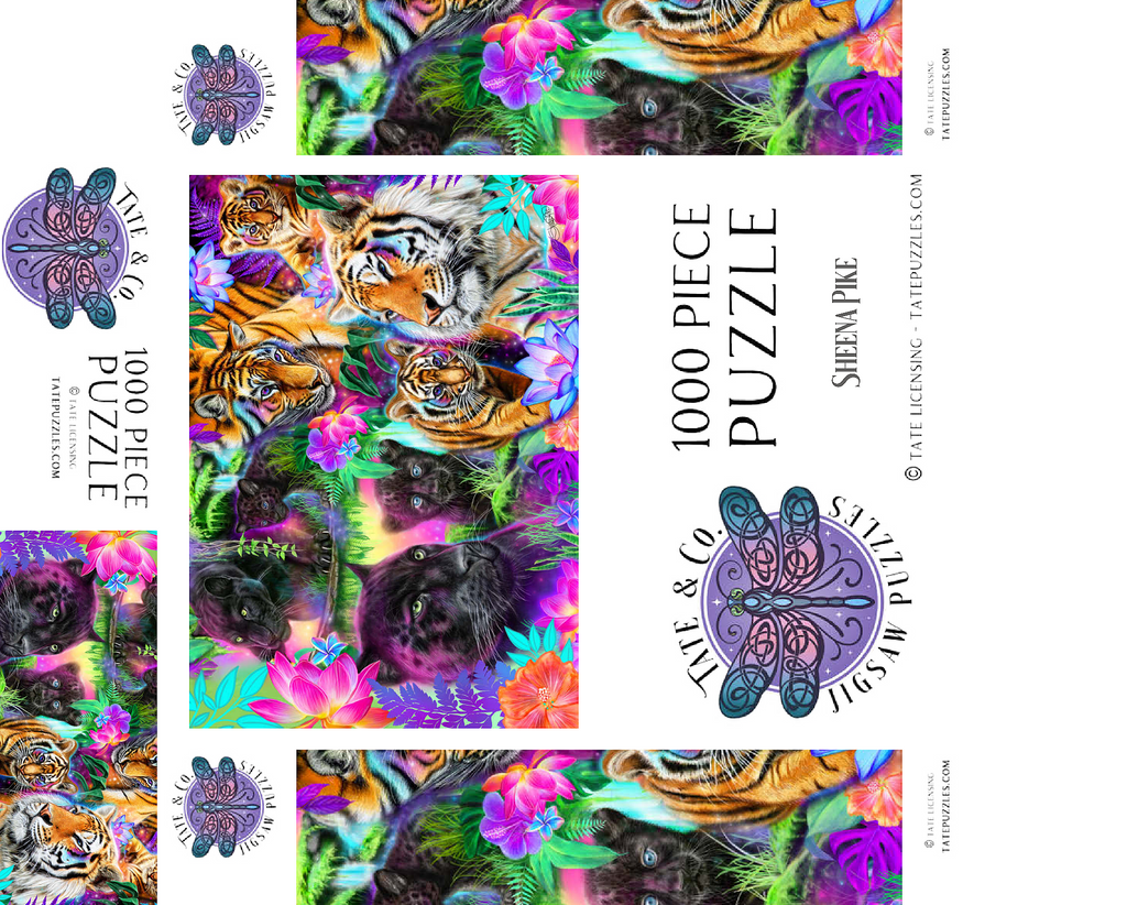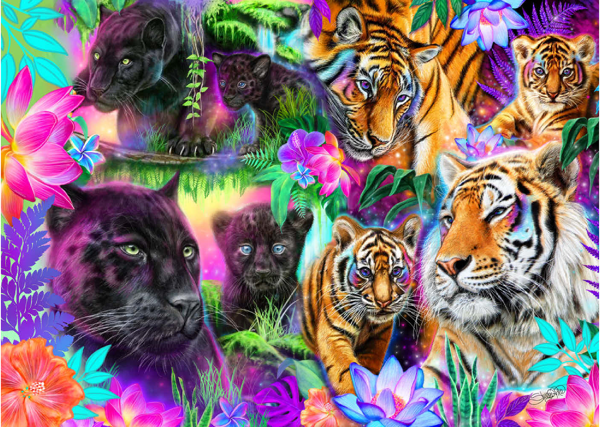 Dieses Kunstwerk von Sheena Pike strotzt vor leuchtenden tropischen Farben und zeigt mächtige Jaguare und Tiger inmitten üppiger Vegetation. Die auffällige Neonpalette – satte Rosa-, leuchtende Grün- und kräftige Gelbtöne – schafft eine traumhafte Atmosphäre und erweckt den Dschungel zum Leben. Exotische Blumen und wirbelnde Ranken verleihen dem Bild Tiefe, während die dynamischen Posen der Tiere Bewegung und Wildheit vermitteln. Dieses faszinierende Werk eignet sich perfekt zum Puzzeln, da jeder Abschnitt komplexe Details und atemberaubende Farbkombinationen offenbart und dazu einlädt, dieses schillernde tropische Paradies zu erkunden.