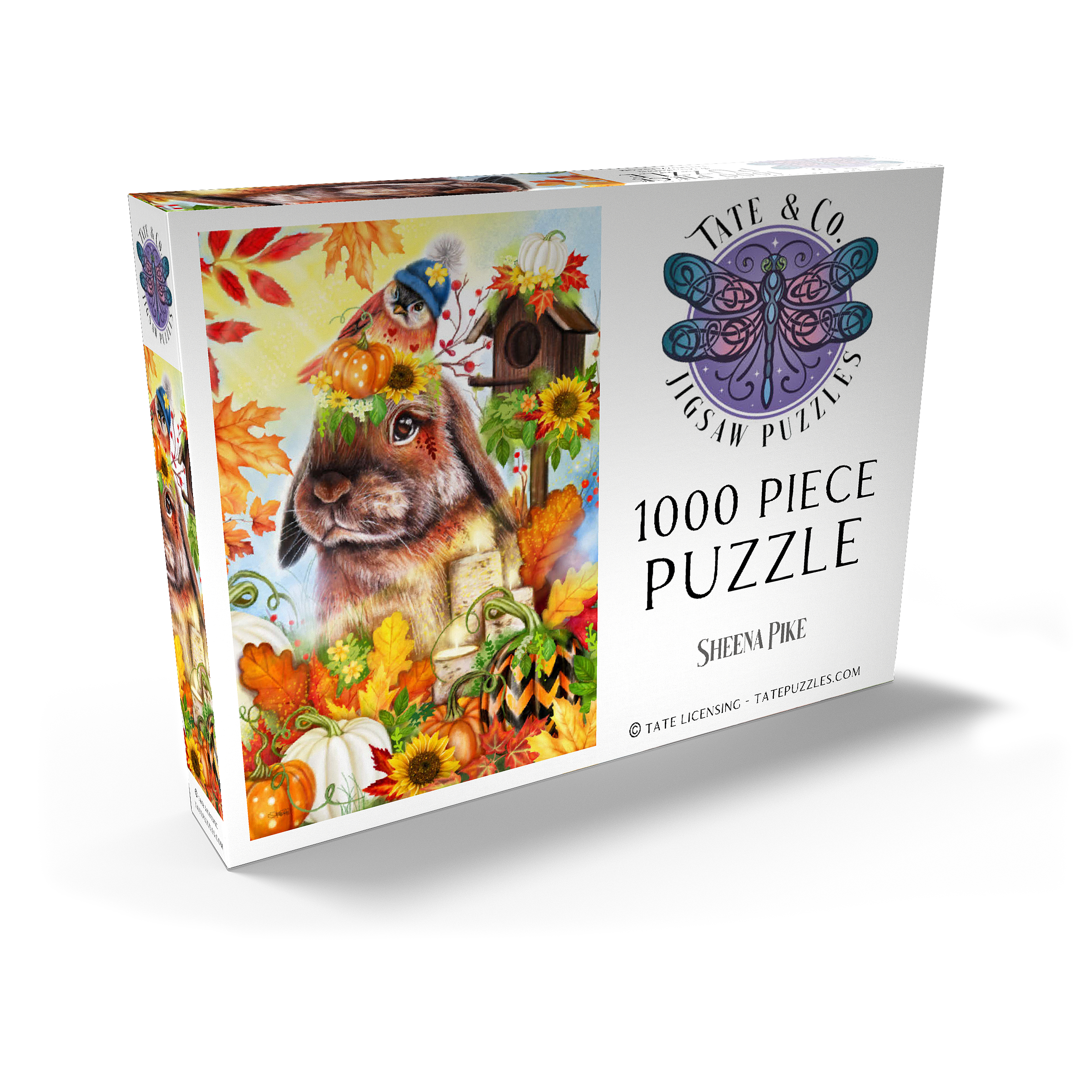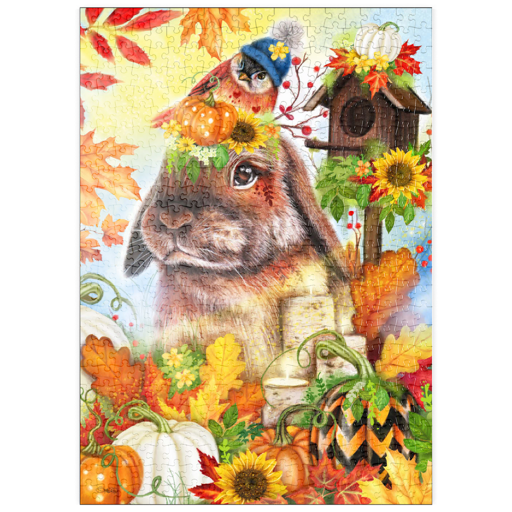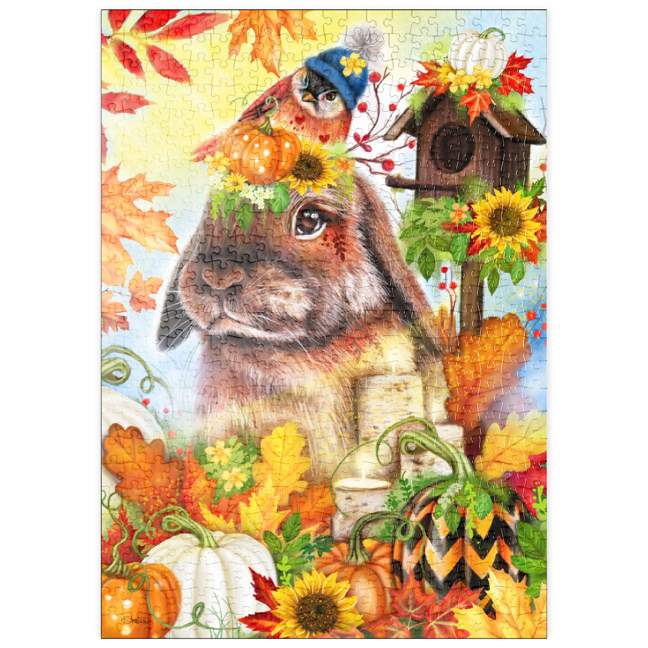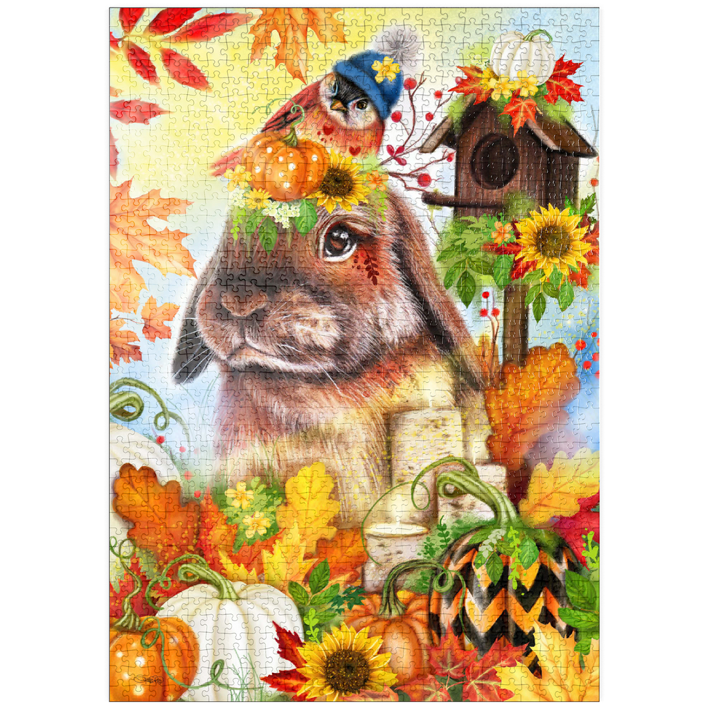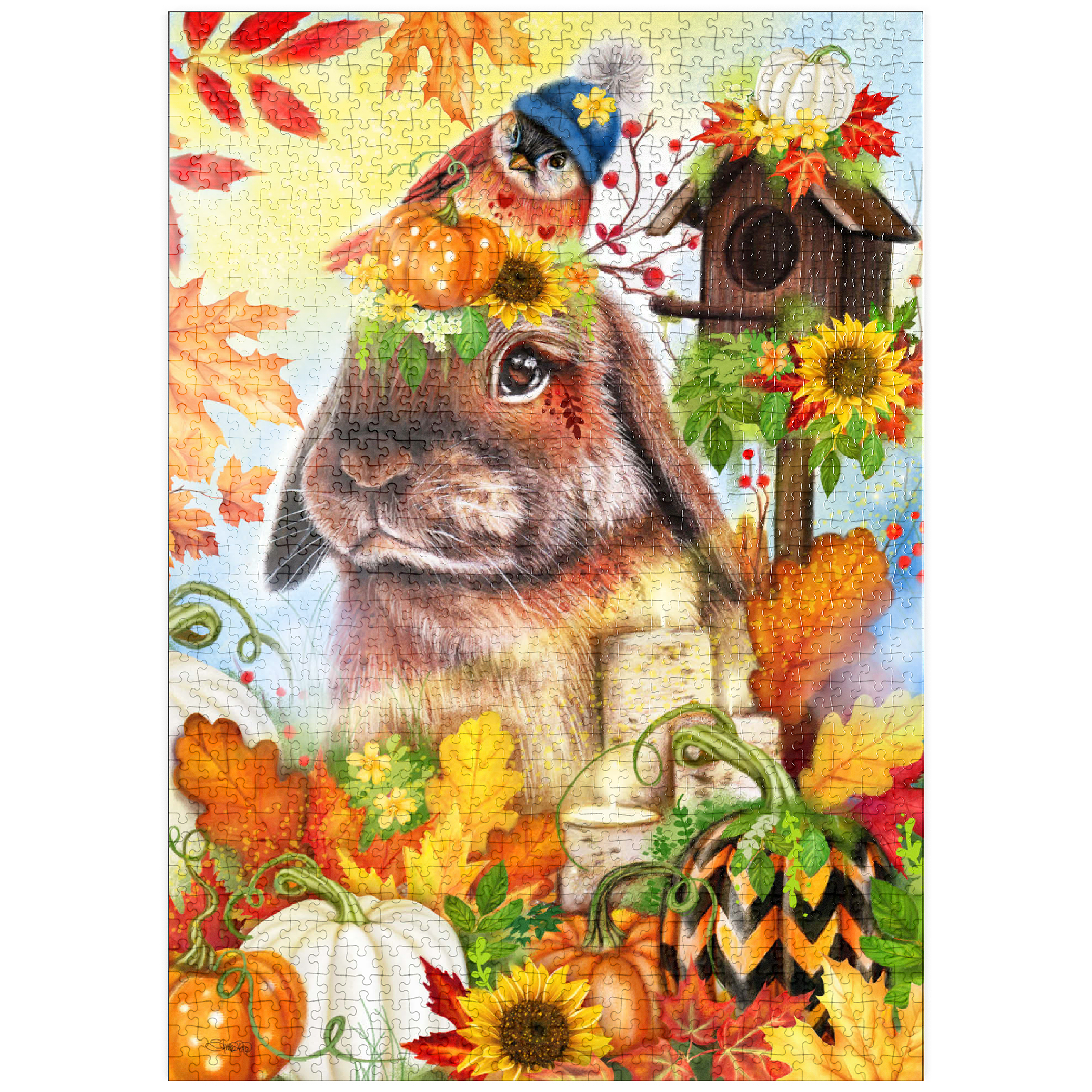 Eine bezaubernde und idyllische Herbstszene, meisterhaft illustriert. Ein sanftes Kaninchen, die zentrale Figur, wird von einem niedlichen Vogel auf seinem Kopf geziert, was ein herzerwärmendes Gefühl der Verbundenheit vermittelt. Die Umgebung strahlt in den leuchtenden Farben des Herbstlaubs, durchsetzt mit Kürbissen und zarten Blumen, und vermittelt ein Gefühl von rustikaler Gemütlichkeit. Die Szene erinnert an einen idyllischen Garten, der Wärme und Ruhe ausstrahlt. Inspiriert von der Kunst von Sheena Pike, eignet sich dieses Bild ideal für ein faszinierendes Puzzle, das den Betrachter in eine Welt voller sanfter Harmonie und saisonaler Schönheit entführt.