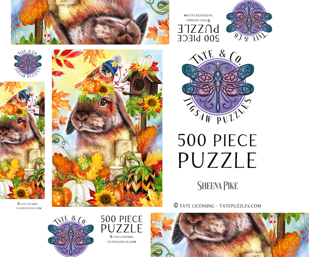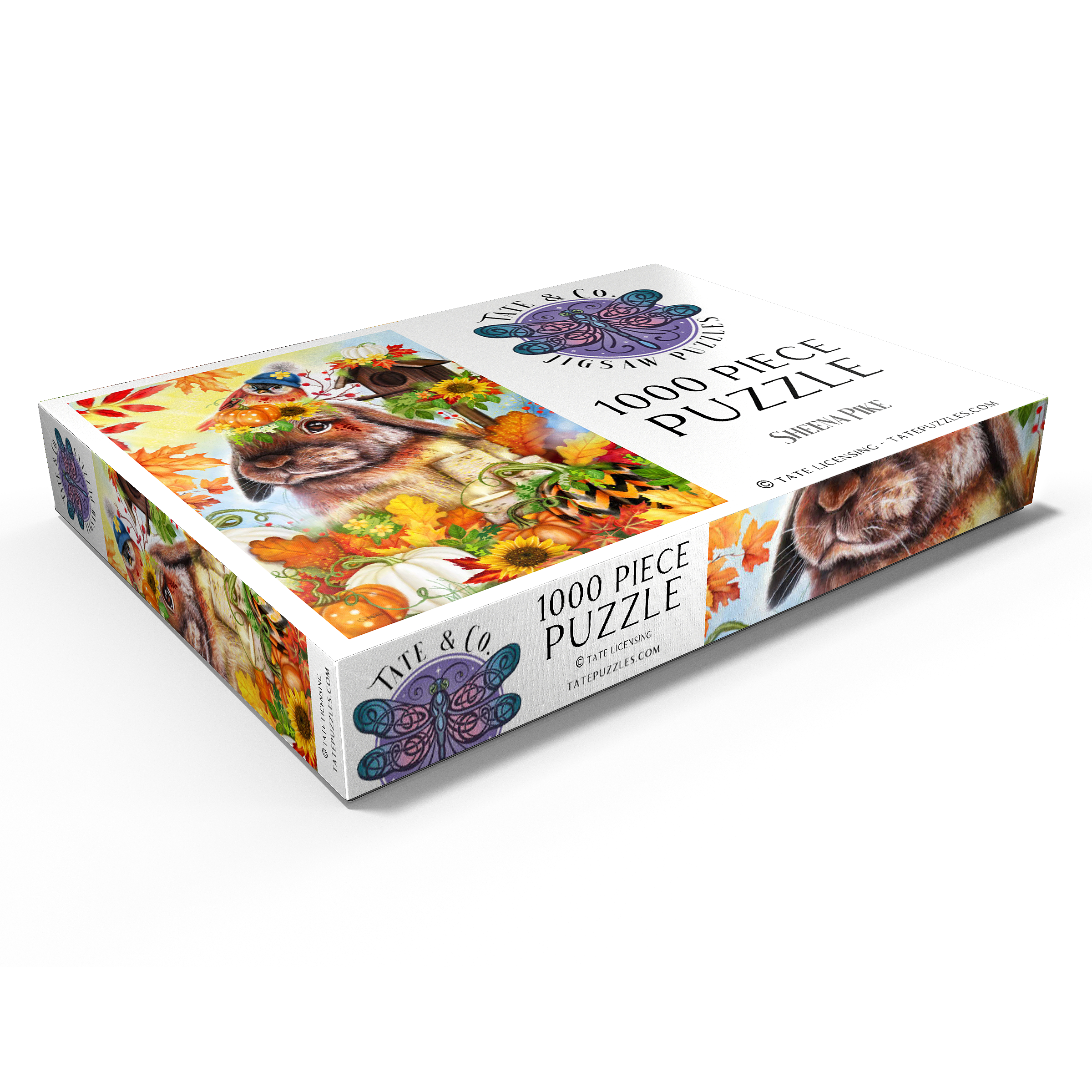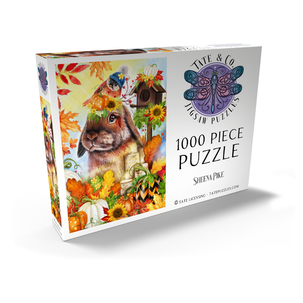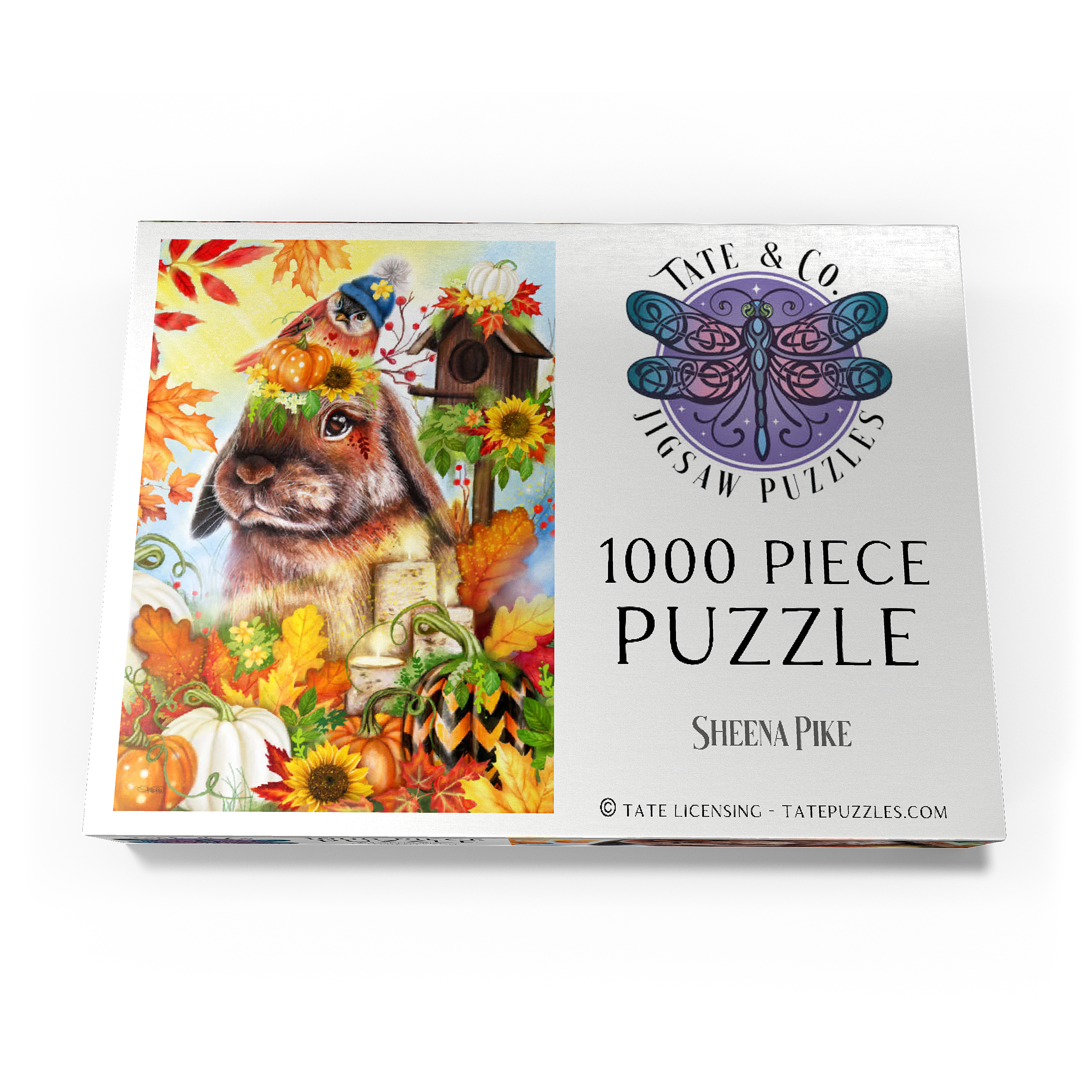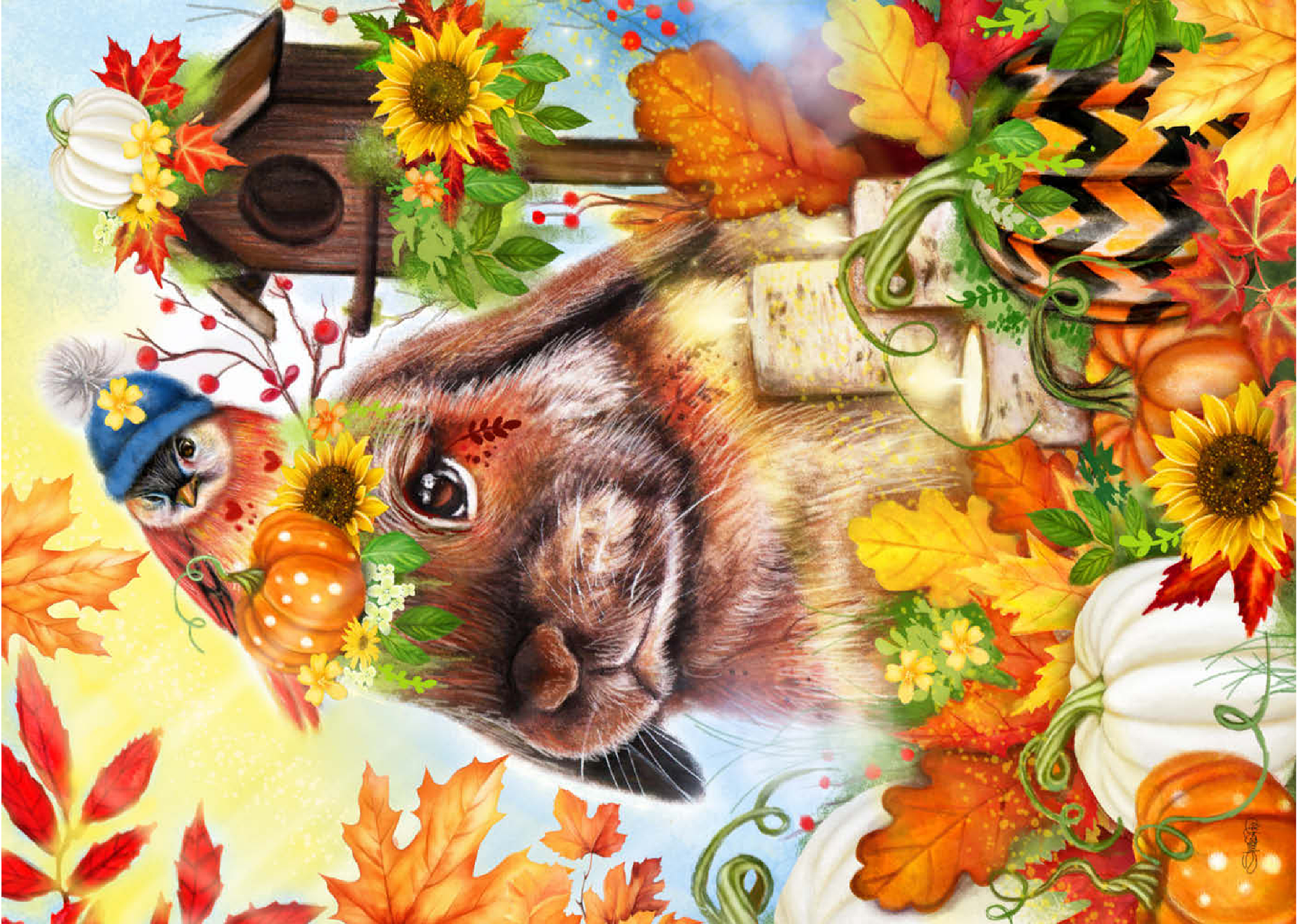 Eine bezaubernde und idyllische Herbstszene, meisterhaft illustriert. Ein sanftes Kaninchen, die zentrale Figur, wird von einem niedlichen Vogel auf seinem Kopf geziert, was ein herzerwärmendes Gefühl der Verbundenheit vermittelt. Die Umgebung strahlt in den leuchtenden Farben des Herbstlaubs, durchsetzt mit Kürbissen und zarten Blumen, und vermittelt ein Gefühl von rustikaler Gemütlichkeit. Die Szene erinnert an einen idyllischen Garten, der Wärme und Ruhe ausstrahlt. Inspiriert von der Kunst von Sheena Pike, eignet sich dieses Bild ideal für ein faszinierendes Puzzle, das den Betrachter in eine Welt voller sanfter Harmonie und saisonaler Schönheit entführt.