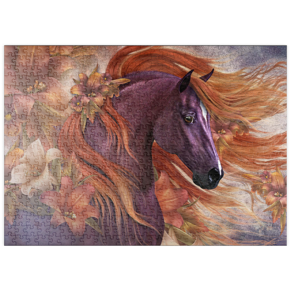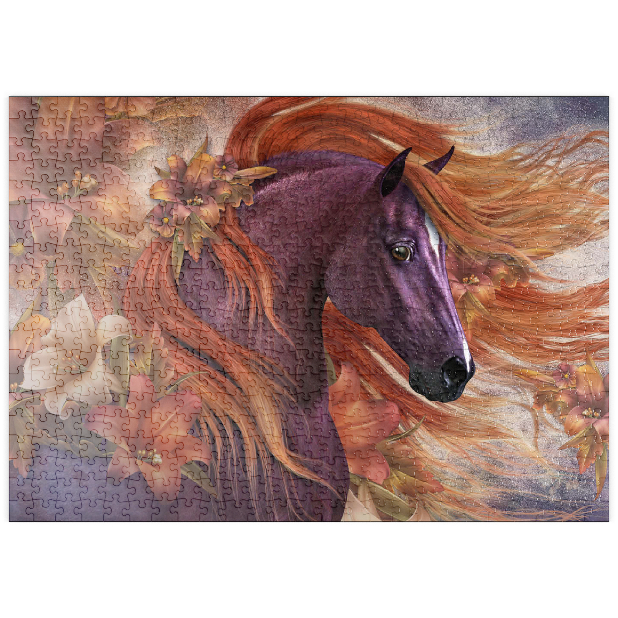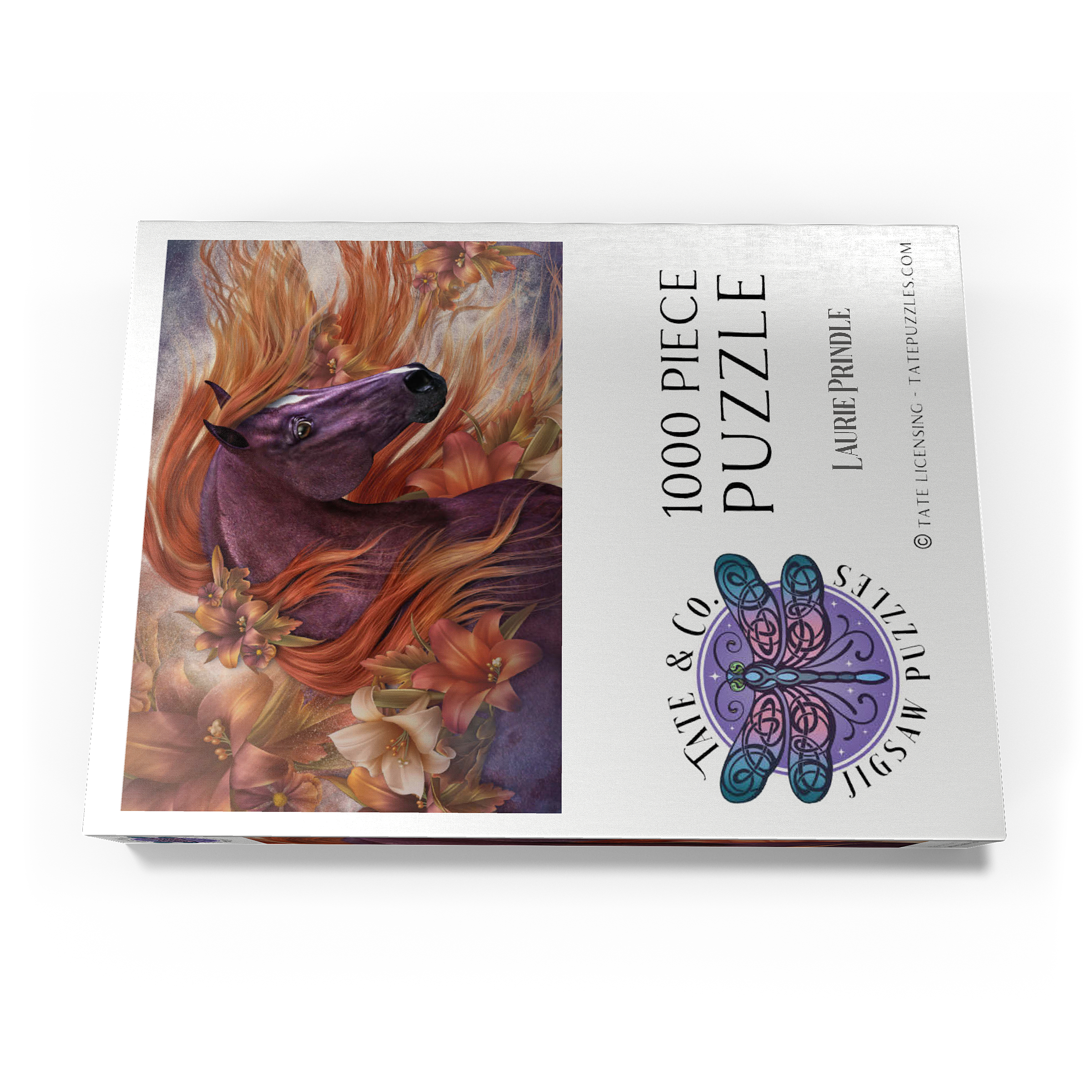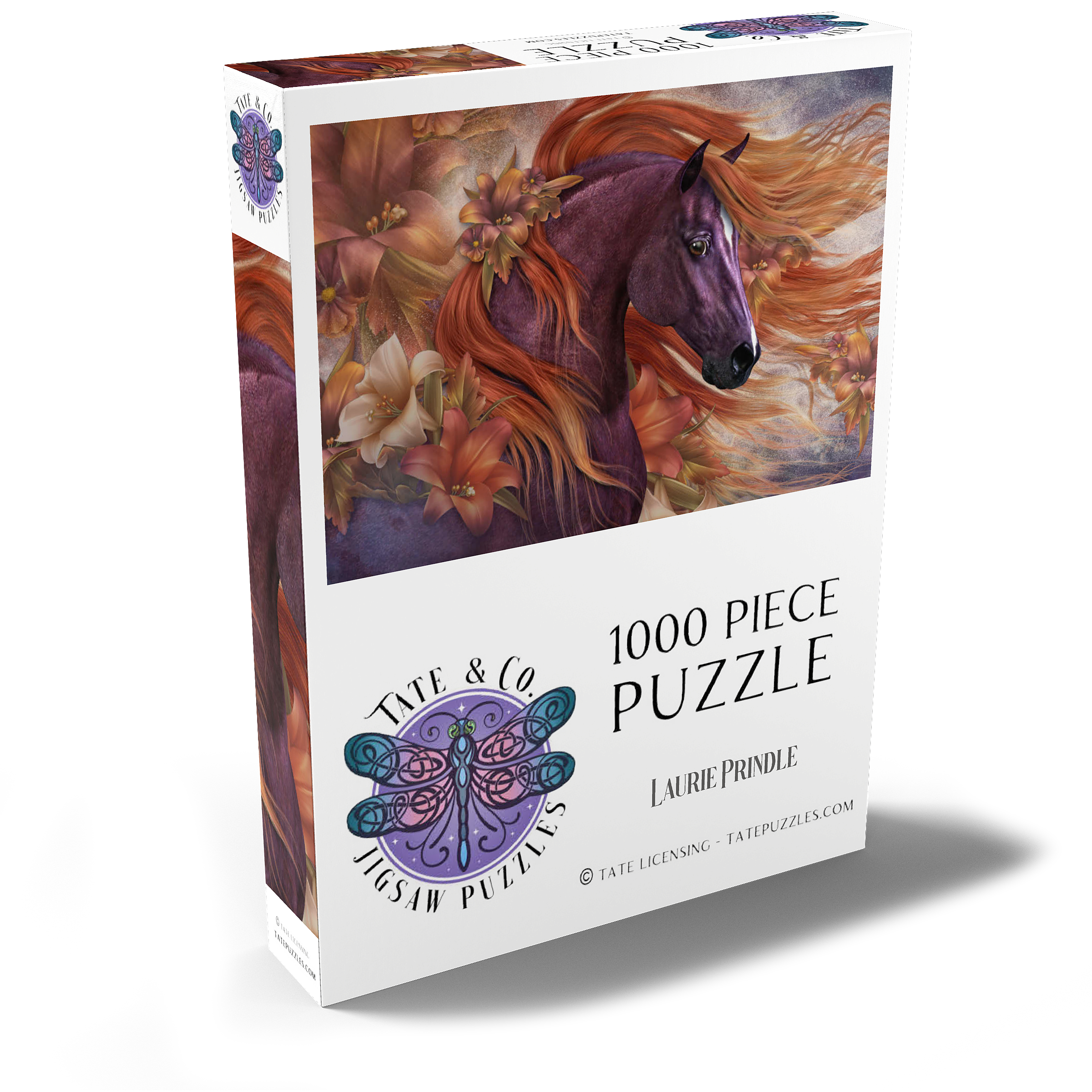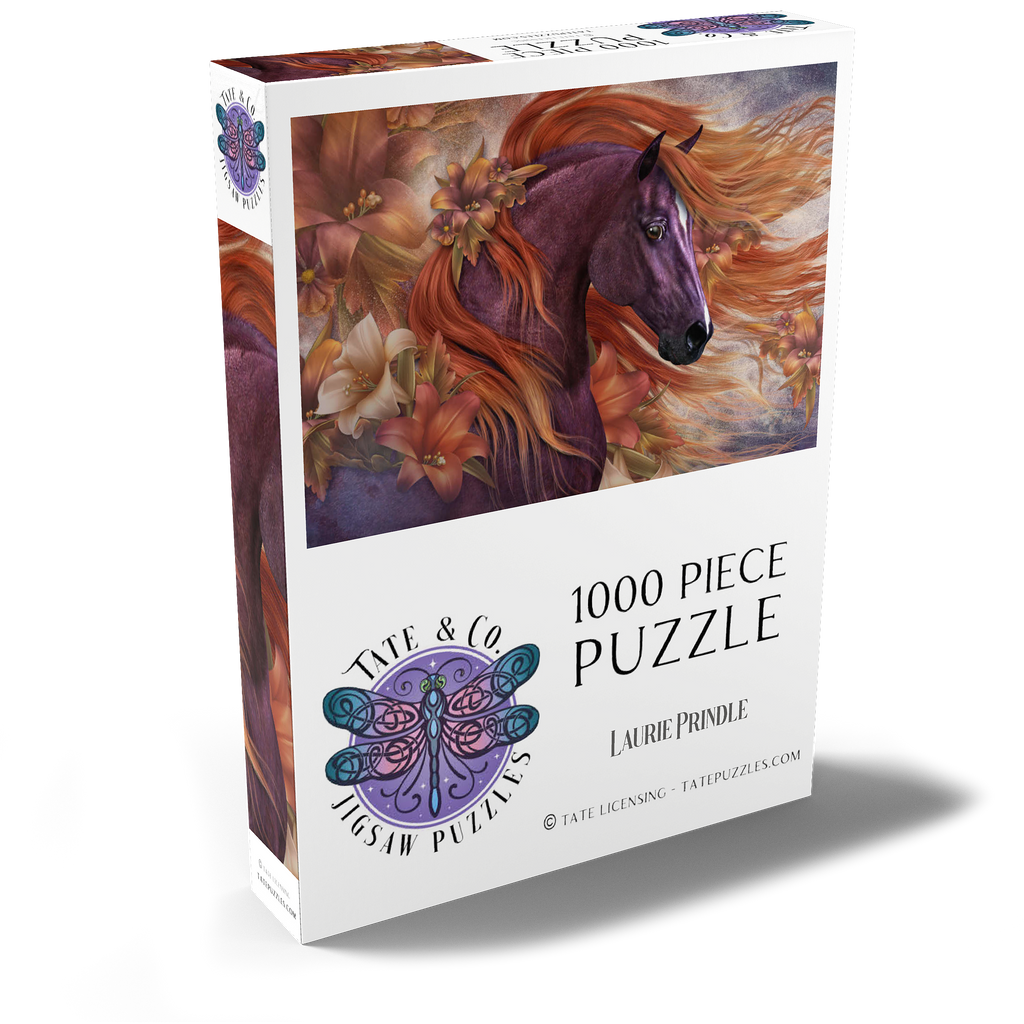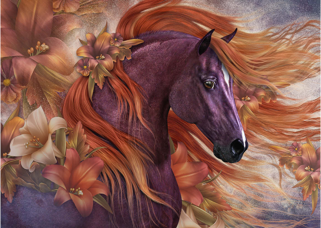 Ein majestätisches Pferd mit einem auffälligen fuchsfarbenen Fell und einer prächtigen, langen und wallenden flachsblonden Mähne in feurigen Orange- und Rottönen ist mit eleganten Herbstlilien und zartem Laub geschmückt. Der Hintergrund ist geprägt von einer sanften, ätherischen Mischung aus warmen Orange- und Violetttönen mit einem Hauch von Weiß, wobei subtile Blumenformen die magische Atmosphäre unterstreichen. Dieses Fantasy-Kunstwerk von Laurie Prindle erinnert an Themen wie Herbst, Feuer, Schönheit und mythische Pferde und schafft eine faszinierende und warme Herbstszene.
