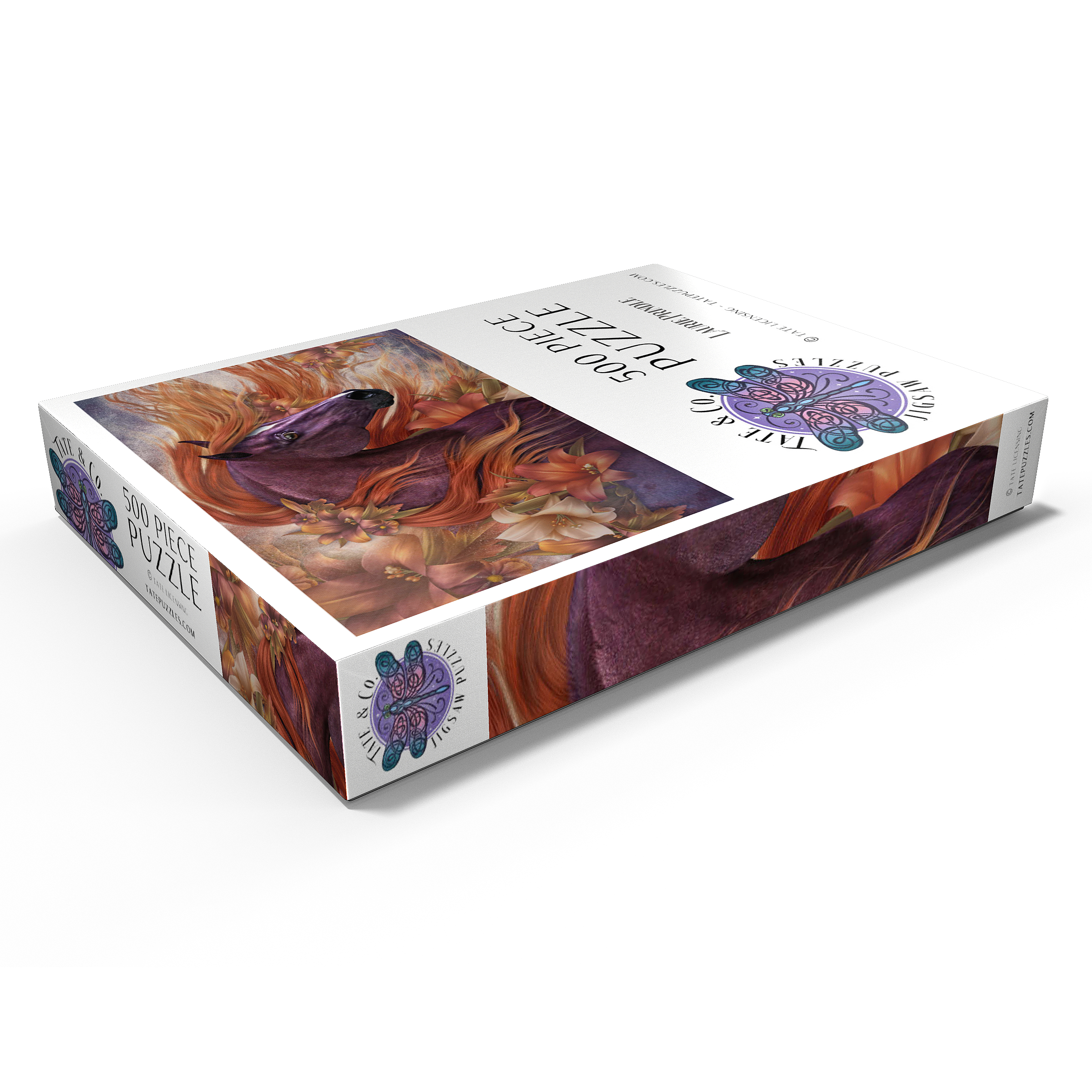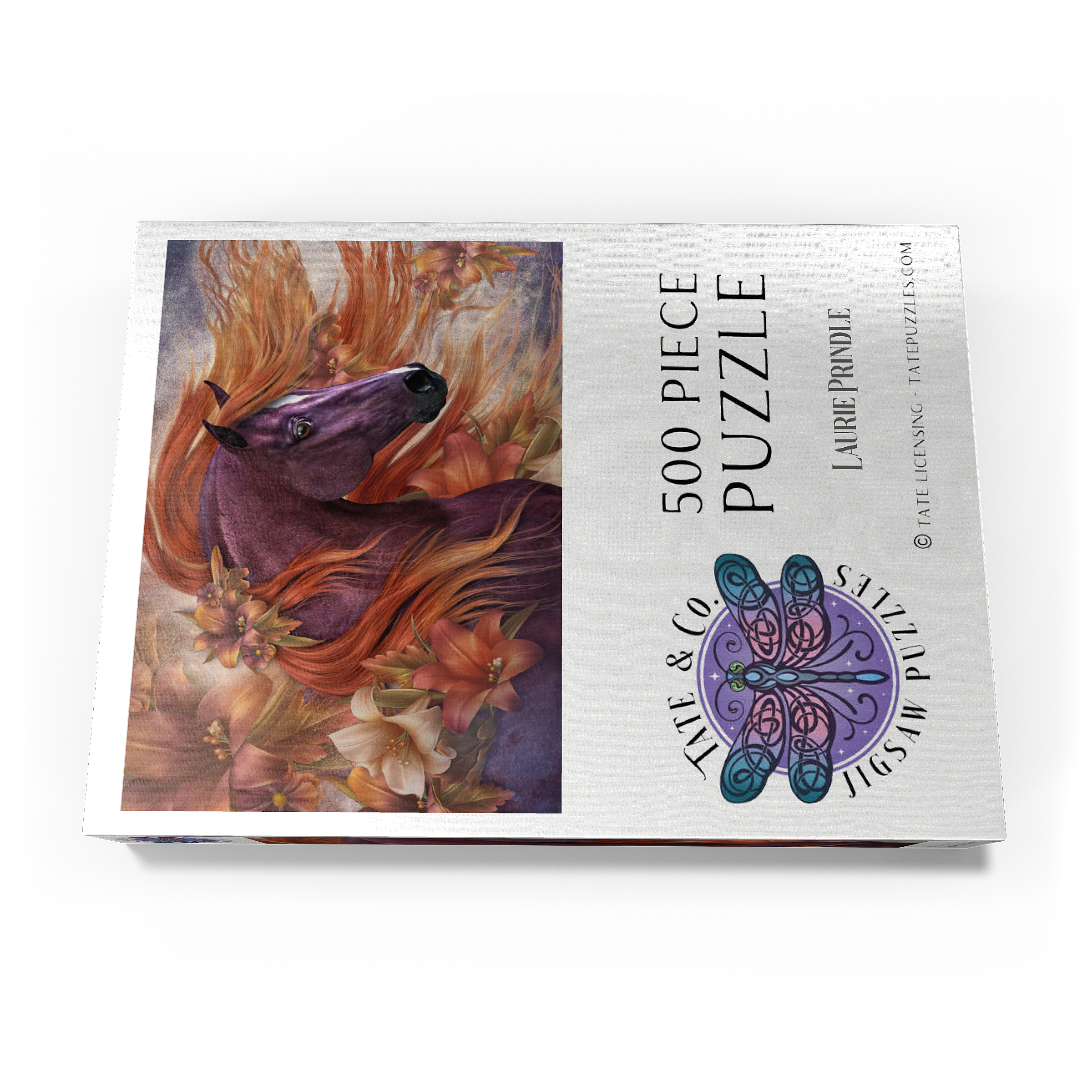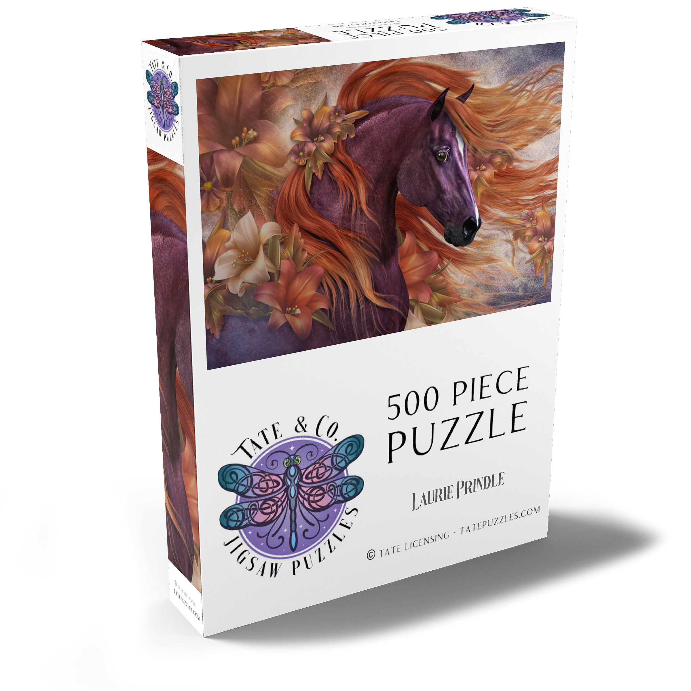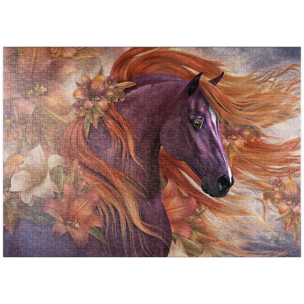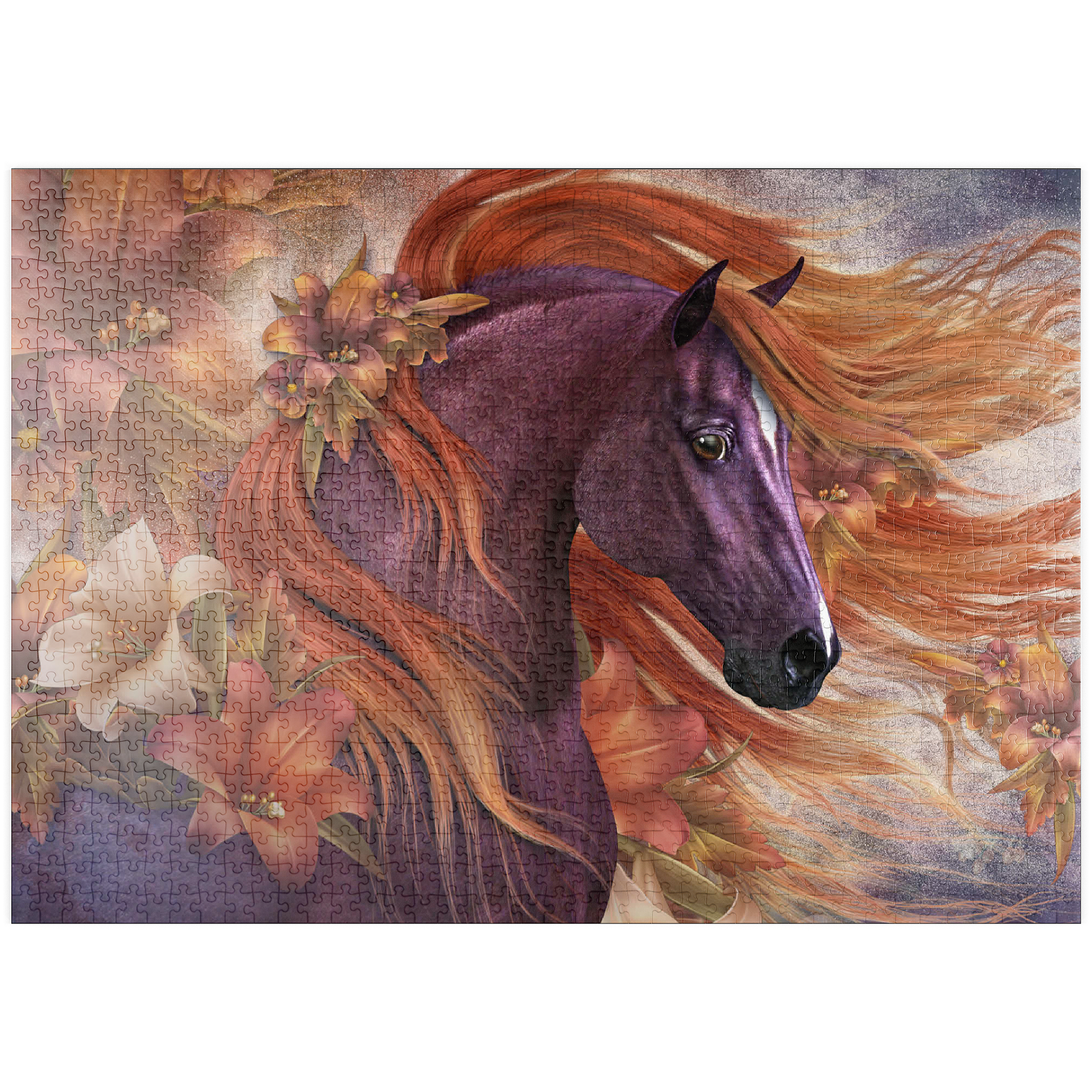 Ein majestätisches Pferd mit einem auffälligen fuchsfarbenen Fell und einer prächtigen, langen und wallenden flachsblonden Mähne in feurigen Orange- und Rottönen ist mit eleganten Herbstlilien und zartem Laub geschmückt. Der Hintergrund ist geprägt von einer sanften, ätherischen Mischung aus warmen Orange- und Violetttönen mit einem Hauch von Weiß, wobei subtile Blumenformen die magische Atmosphäre unterstreichen. Dieses Fantasy-Kunstwerk von Laurie Prindle erinnert an Themen wie Herbst, Feuer, Schönheit und mythische Pferde und schafft eine faszinierende und warme Herbstszene.