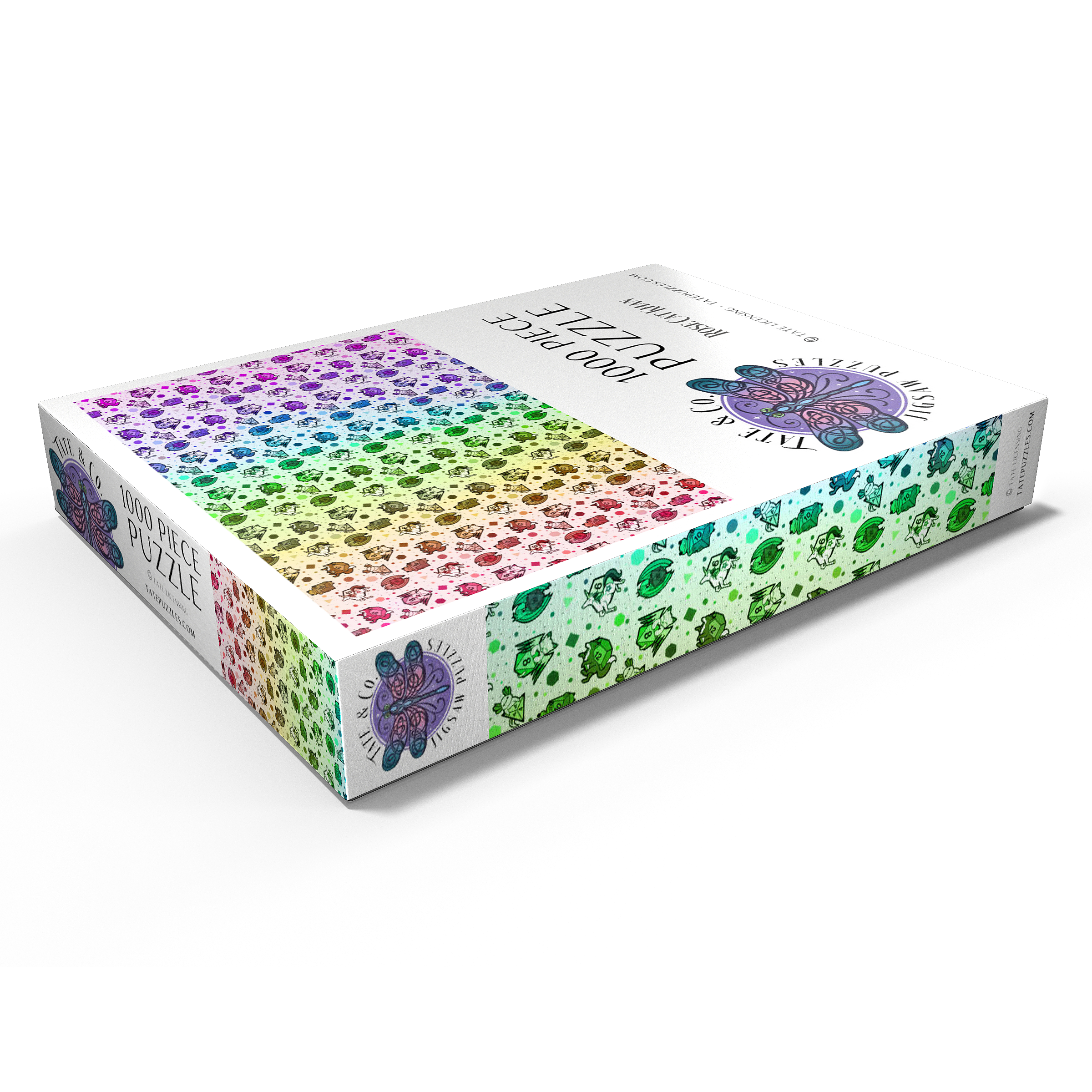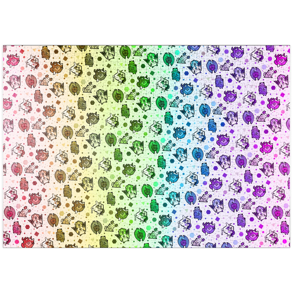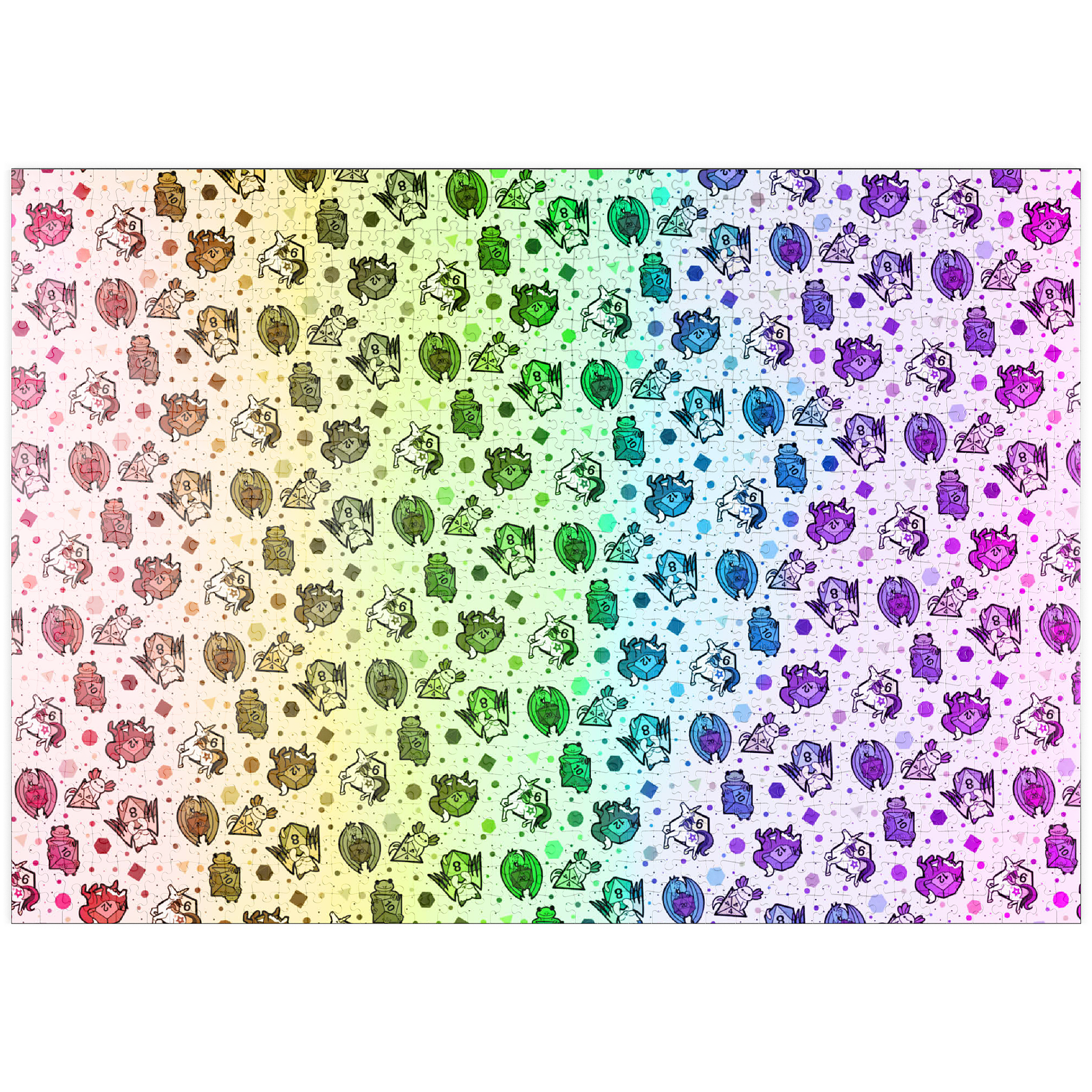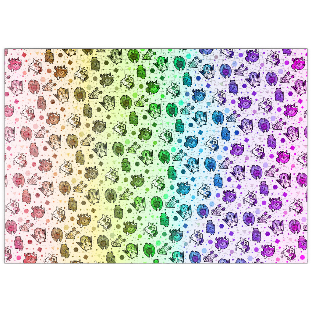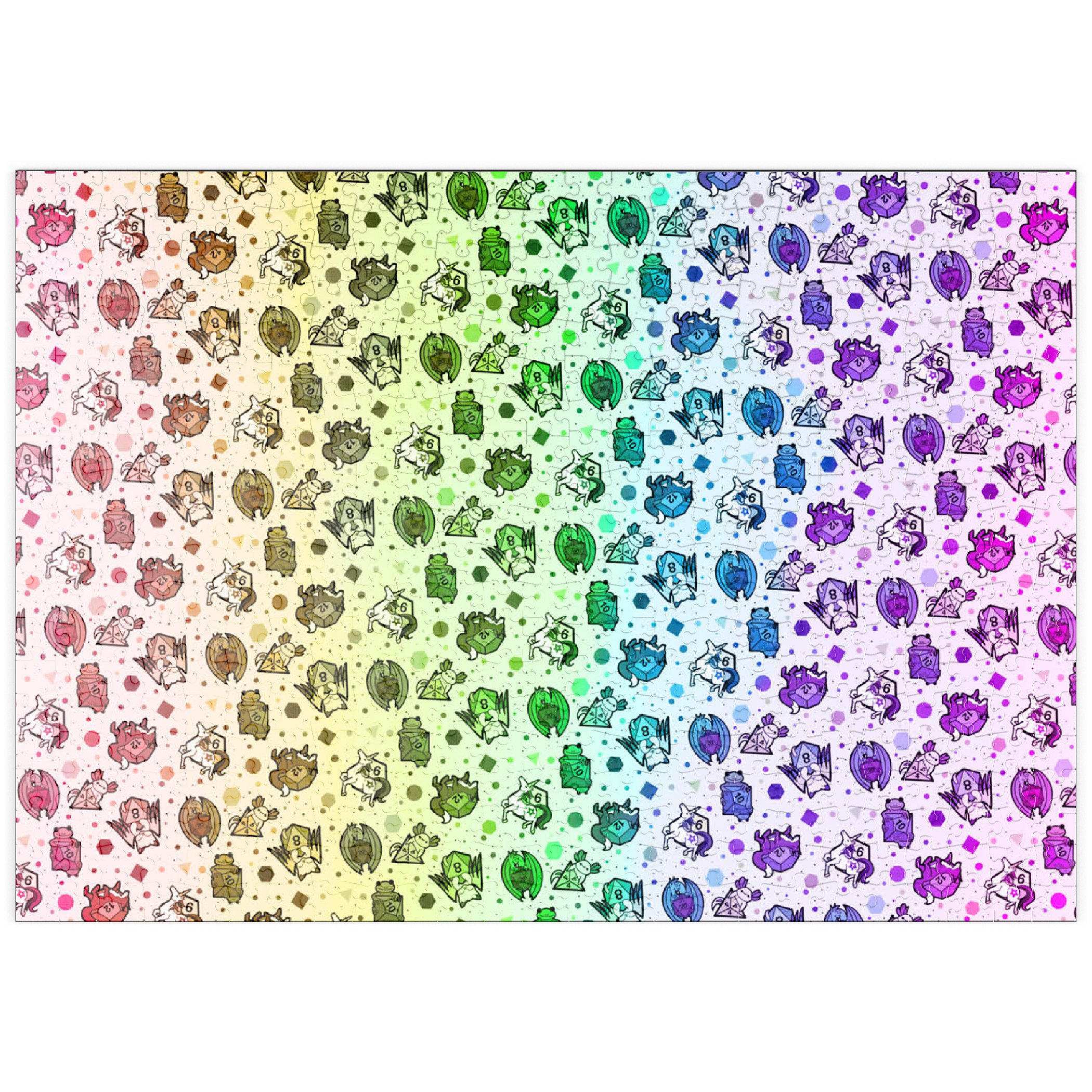 Sind Sie ein Gamer, der bereit ist, seine Rätselfähigkeiten auf die nächste Stufe zu heben? Dieses lebhafte Rätsel von Rose Cat Khan besteht aus einem Regenbogen-Gitter mit einem niedlichen, nerdigen RPG-Würfelset. Überall verstreut finden sich skurrile Fantasietiere wie Axolotls, Einhörner, Drachen, Katzen, Füchse und Frösche. Auf den ersten Blick wirkt das Puzzle verspielt und farbenfroh, aber die sich wiederholenden Muster und subtilen Farbübergänge machen es zu einer echten Herausforderung für Konzentration und Entschlossenheit. Dieses psychedelische Puzzle wurde für alle entwickelt, die knifflige Aufgaben lieben, und bietet Spaß, Schwierigkeit und eine Prise chaotischen Charme.