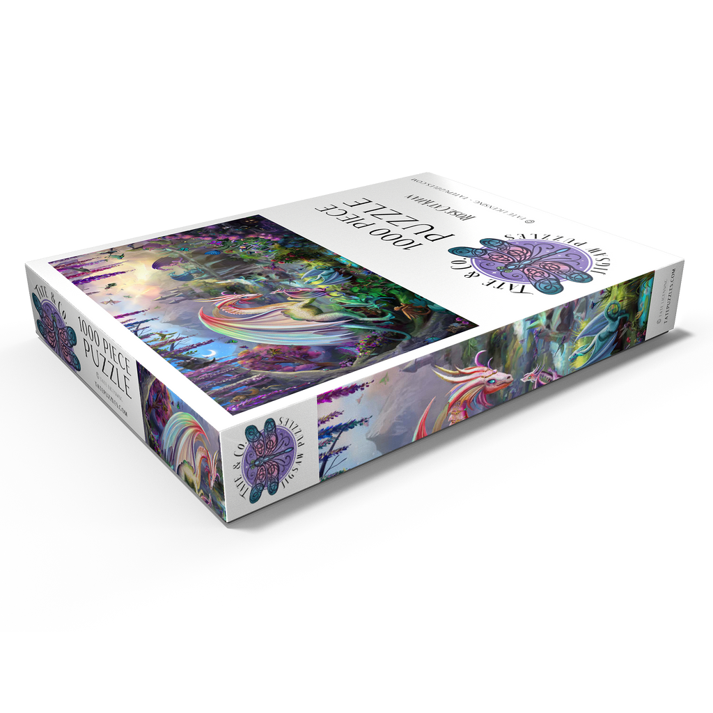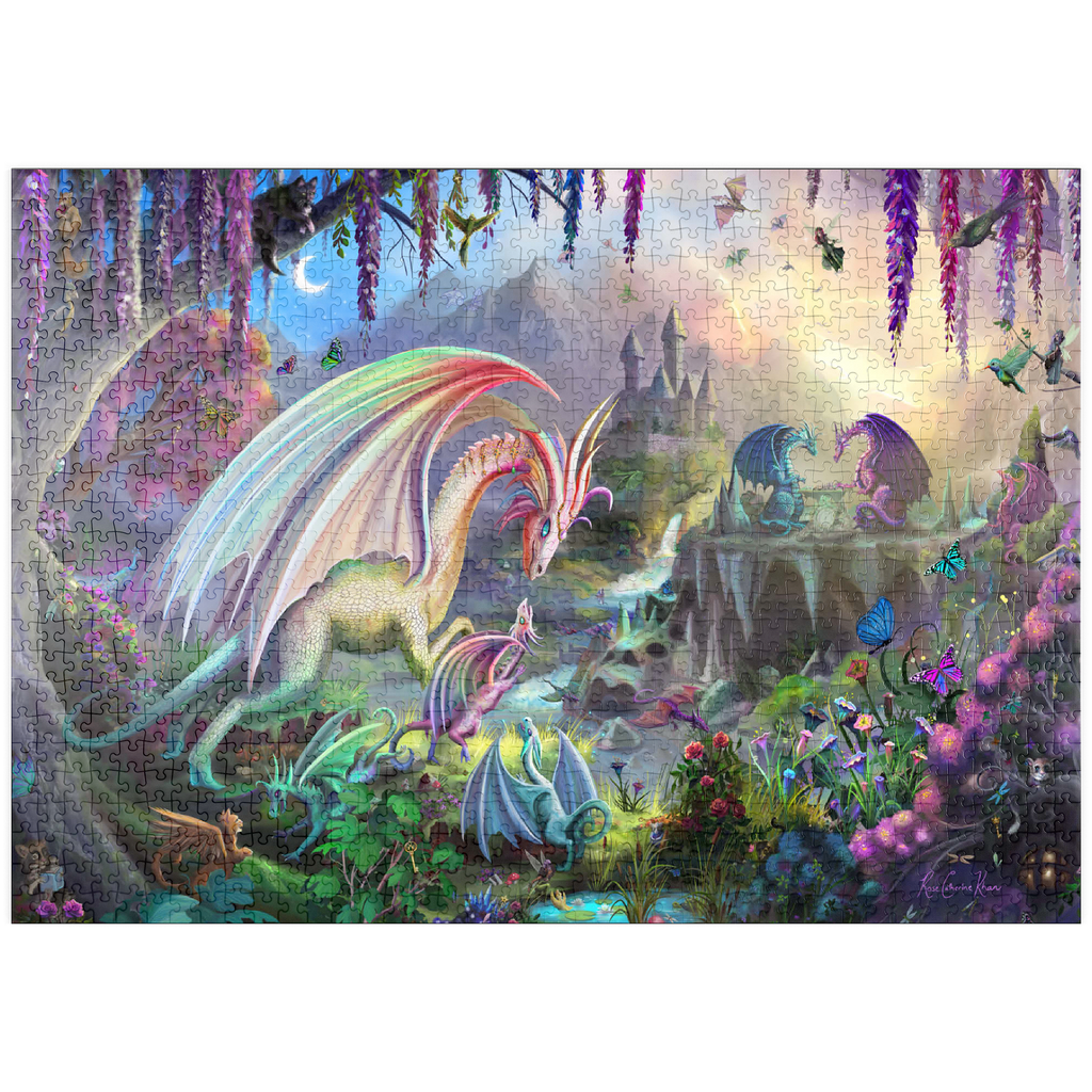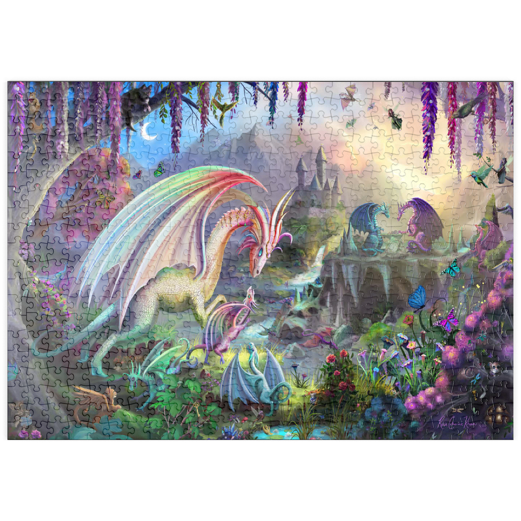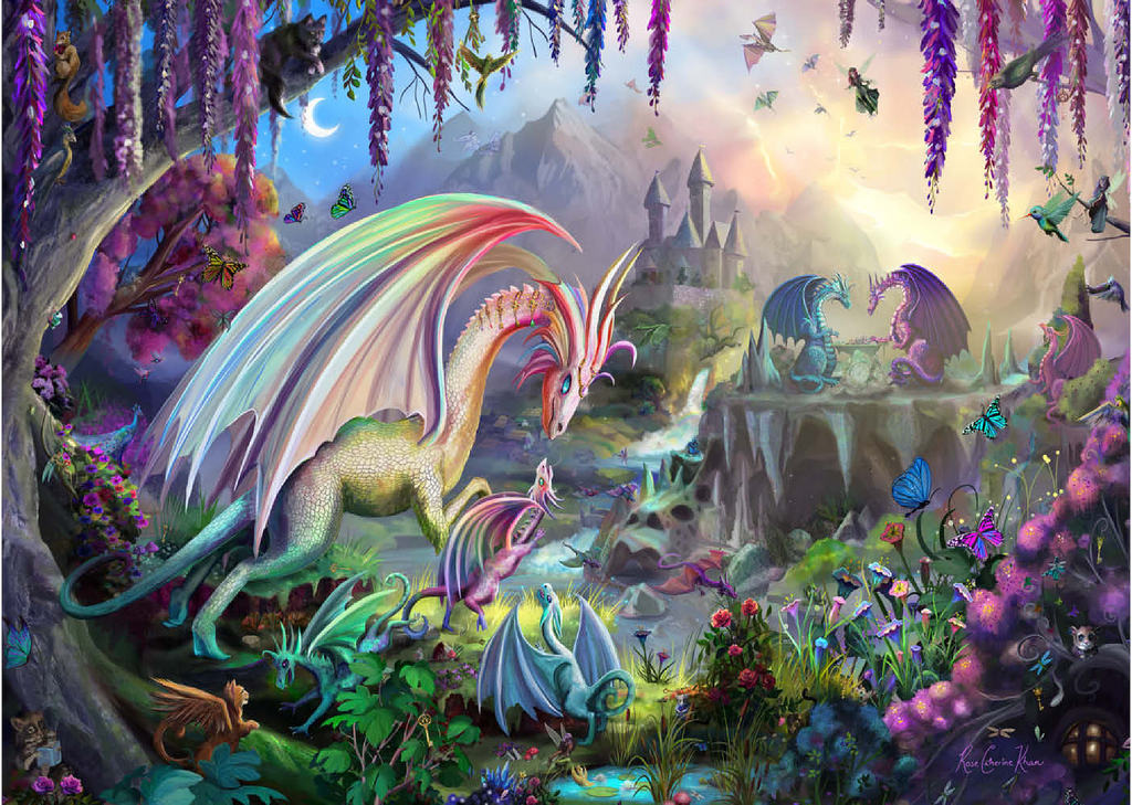 Willkommen in einer zauberhaften Schlucht, in der Drachen ihre Jungen unter einem pastellfarbenen Morgenhimmel aufziehen. Diese üppige, traumhafte Szene zeigt regenbogenfarbene Drachen, kleine Jungtiere, rauschende Wasserfälle und eine weit entfernte Burg, die sich zwischen den Bergen versteckt. Flatternde Schmetterlinge, neugierige Waldtiere und blühende Blumen erwecken jeden Winkel zum Leben. Diese beliebte Landschaft, illustriert von Rose Cat Khan, war der Startschuss für ihre Karriere als renommierte Puzzle-Illustratorin. Bekannt für ihre detailreichen Welten voller Zauber und Wunder, laden ihre international gefeierten Kunstwerke Puzzler dazu ein, die vielschichtigen Geschichten zu entdecken, die sich in jedem Teil verbergen. -Dragon Valley- ist eine zeitlose Reise voller Wärme, Fantasie und Vorstellungskraft.