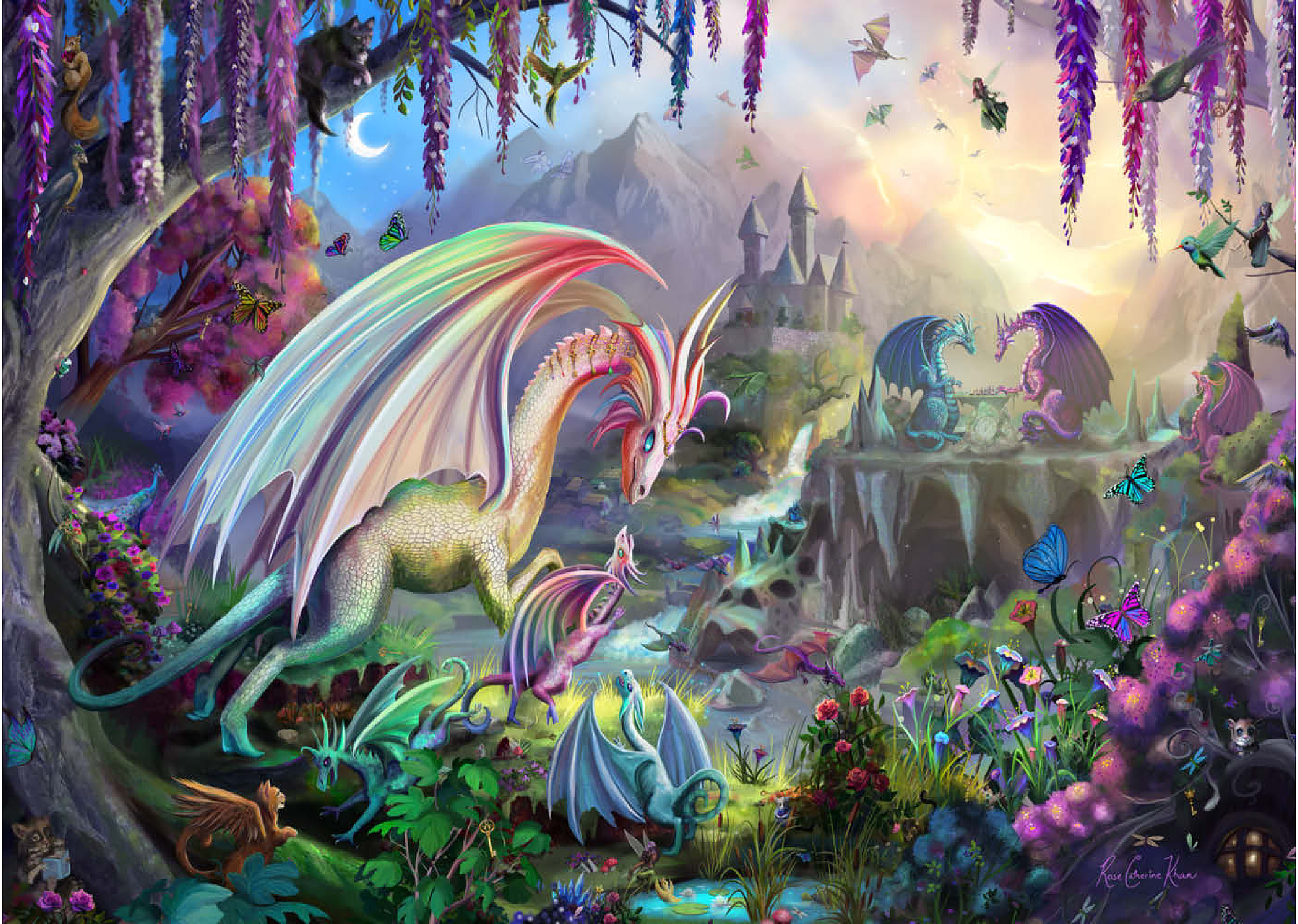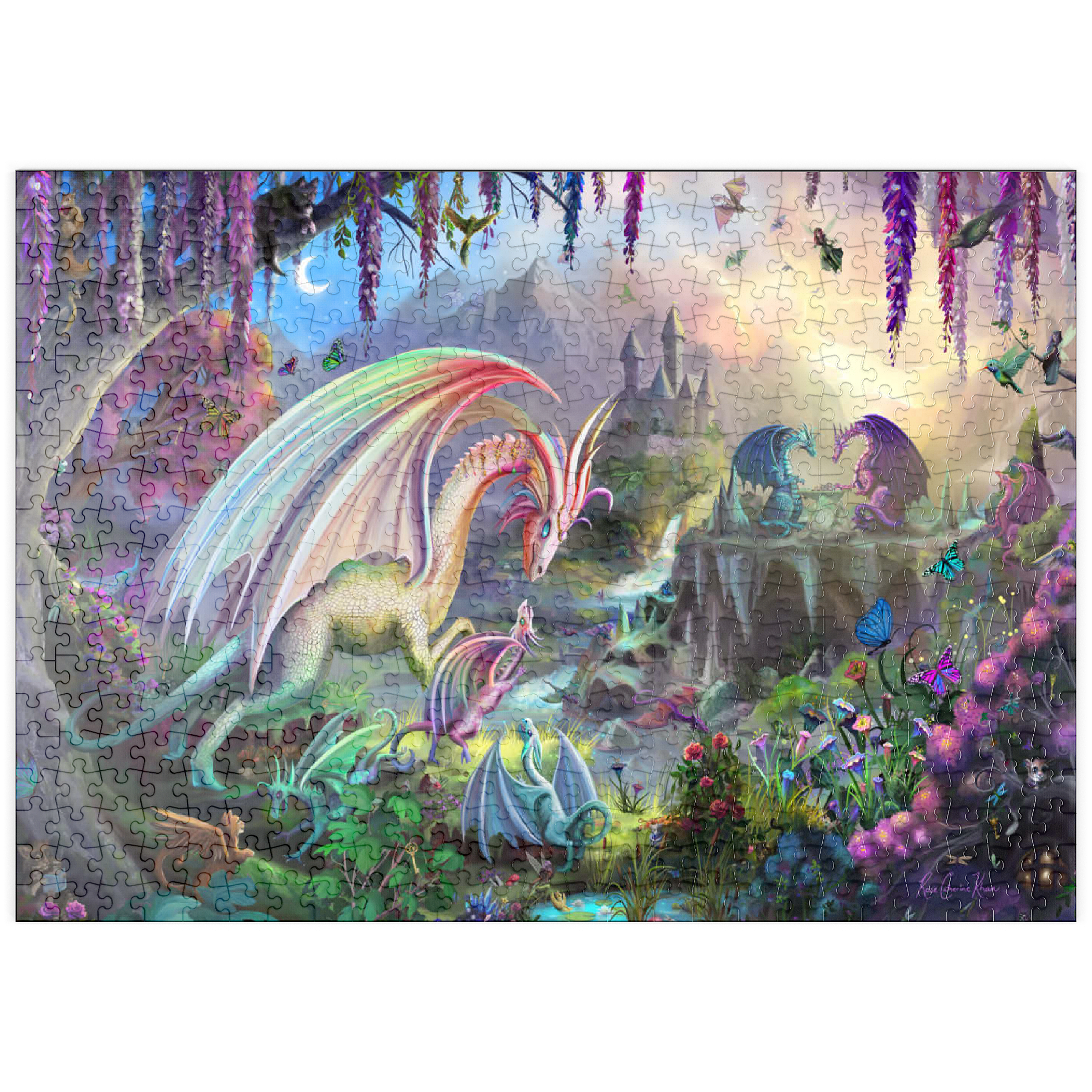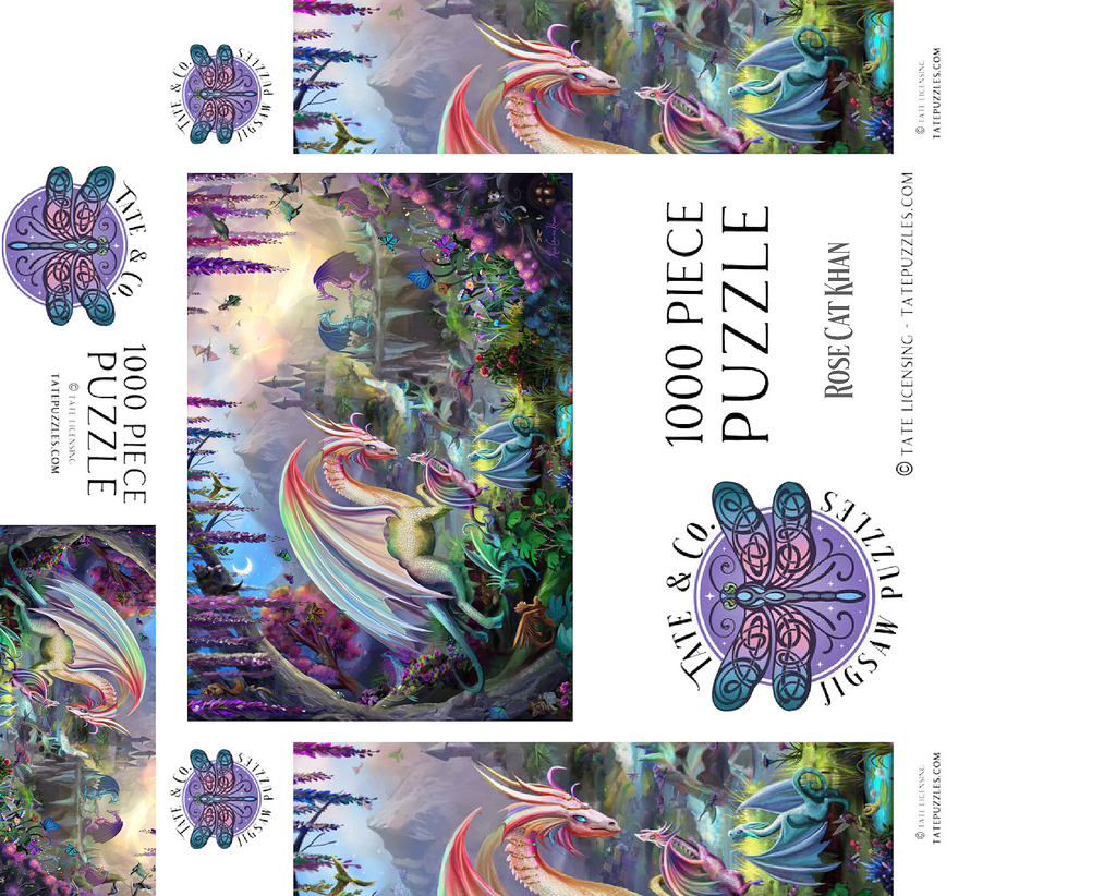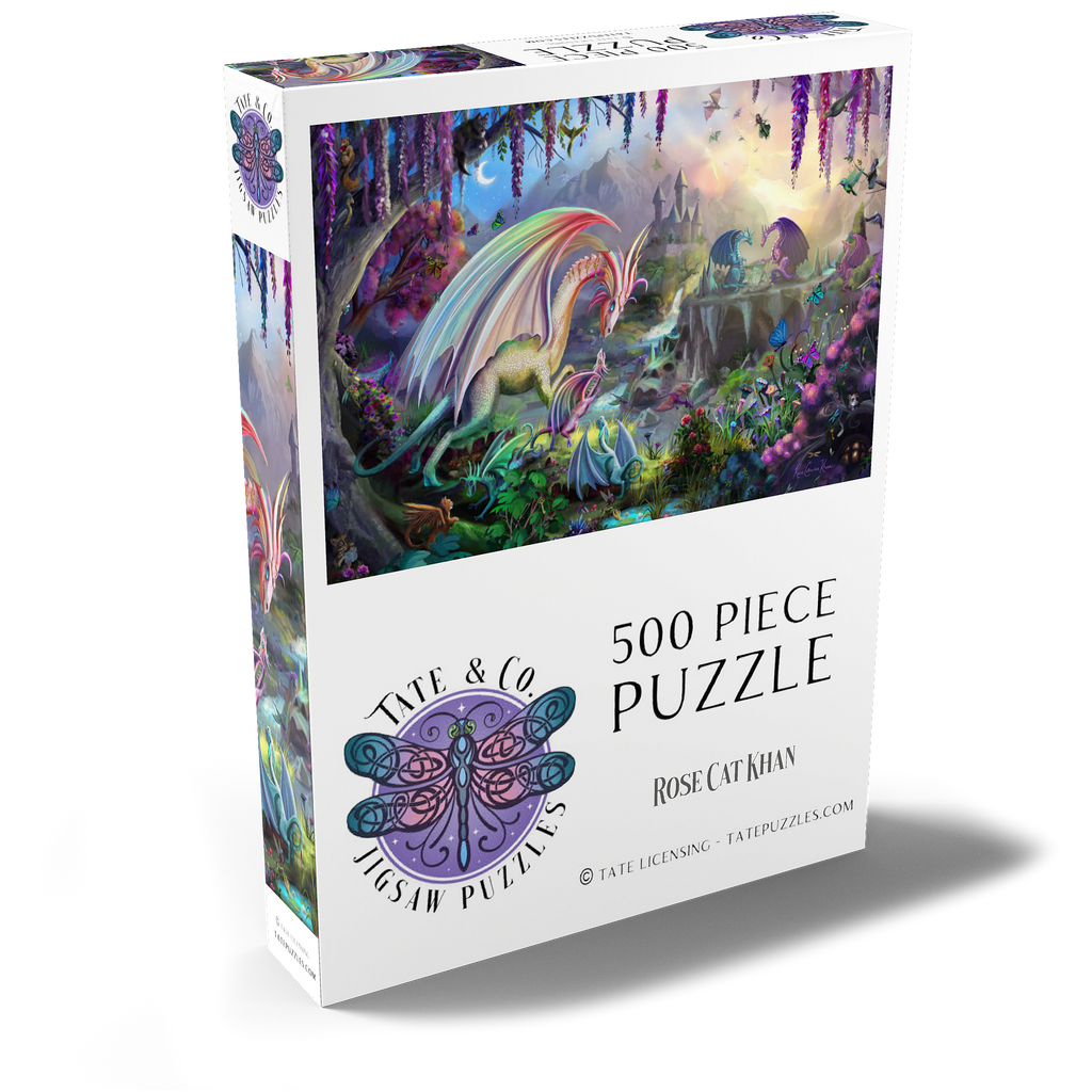 Willkommen in einer zauberhaften Schlucht, in der Drachen ihre Jungen unter einem pastellfarbenen Morgenhimmel aufziehen. Diese üppige, traumhafte Szene zeigt regenbogenfarbene Drachen, kleine Jungtiere, rauschende Wasserfälle und eine weit entfernte Burg, die sich zwischen den Bergen versteckt. Flatternde Schmetterlinge, neugierige Waldtiere und blühende Blumen erwecken jeden Winkel zum Leben. Diese beliebte Landschaft, illustriert von Rose Cat Khan, war der Startschuss für ihre Karriere als renommierte Puzzle-Illustratorin. Bekannt für ihre detailreichen Welten voller Zauber und Wunder, laden ihre international gefeierten Kunstwerke Puzzler dazu ein, die vielschichtigen Geschichten zu entdecken, die sich in jedem Teil verbergen. -Dragon Valley- ist eine zeitlose Reise voller Wärme, Fantasie und Vorstellungskraft.
