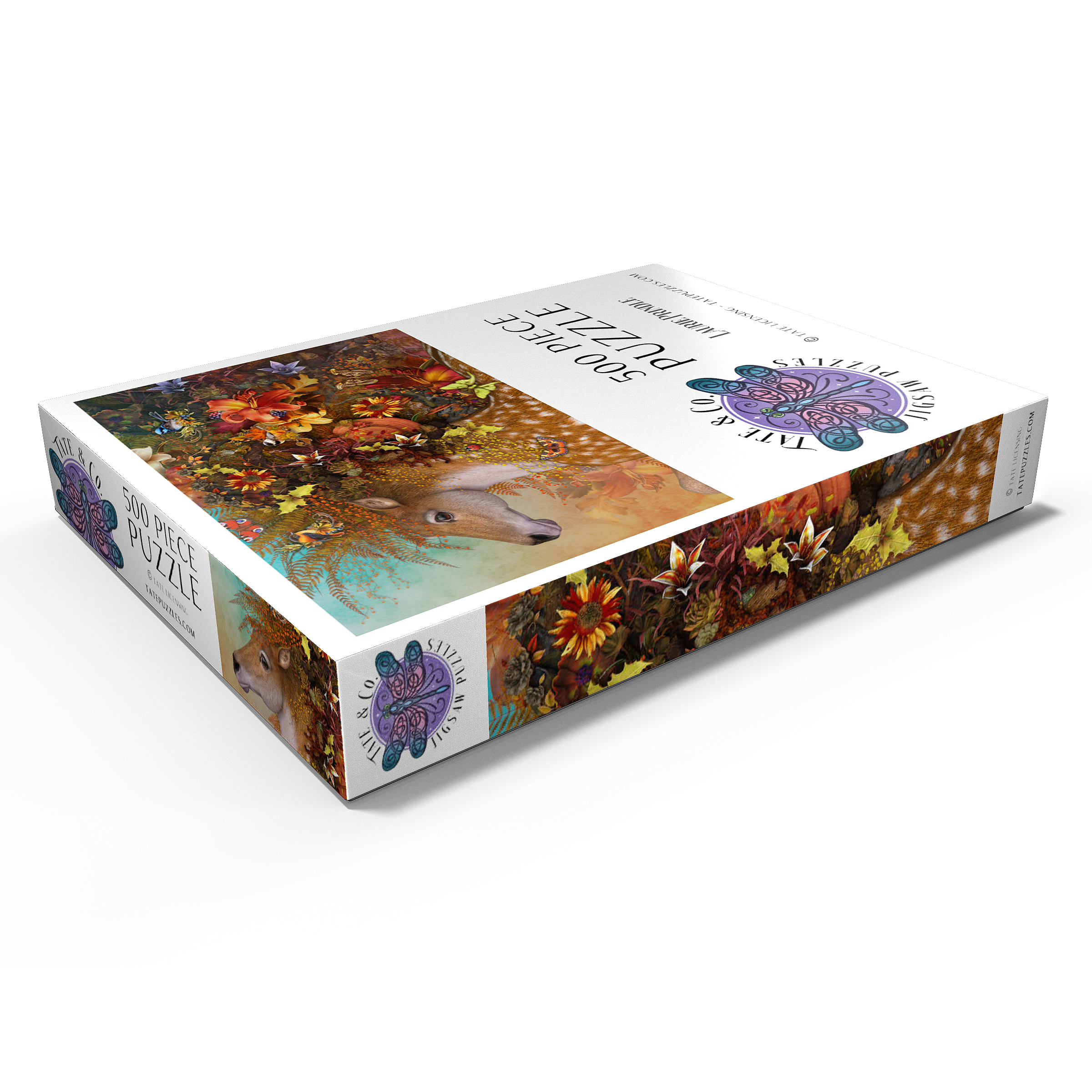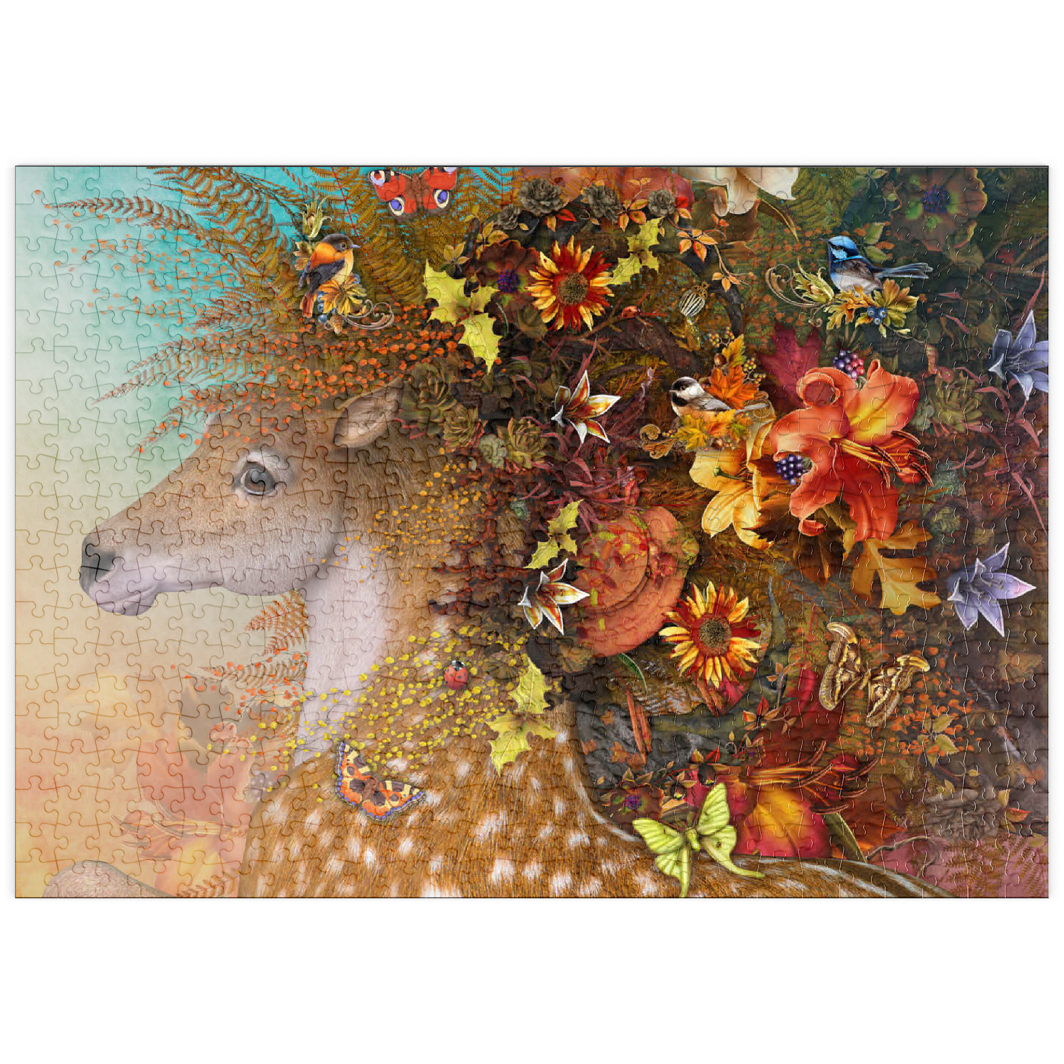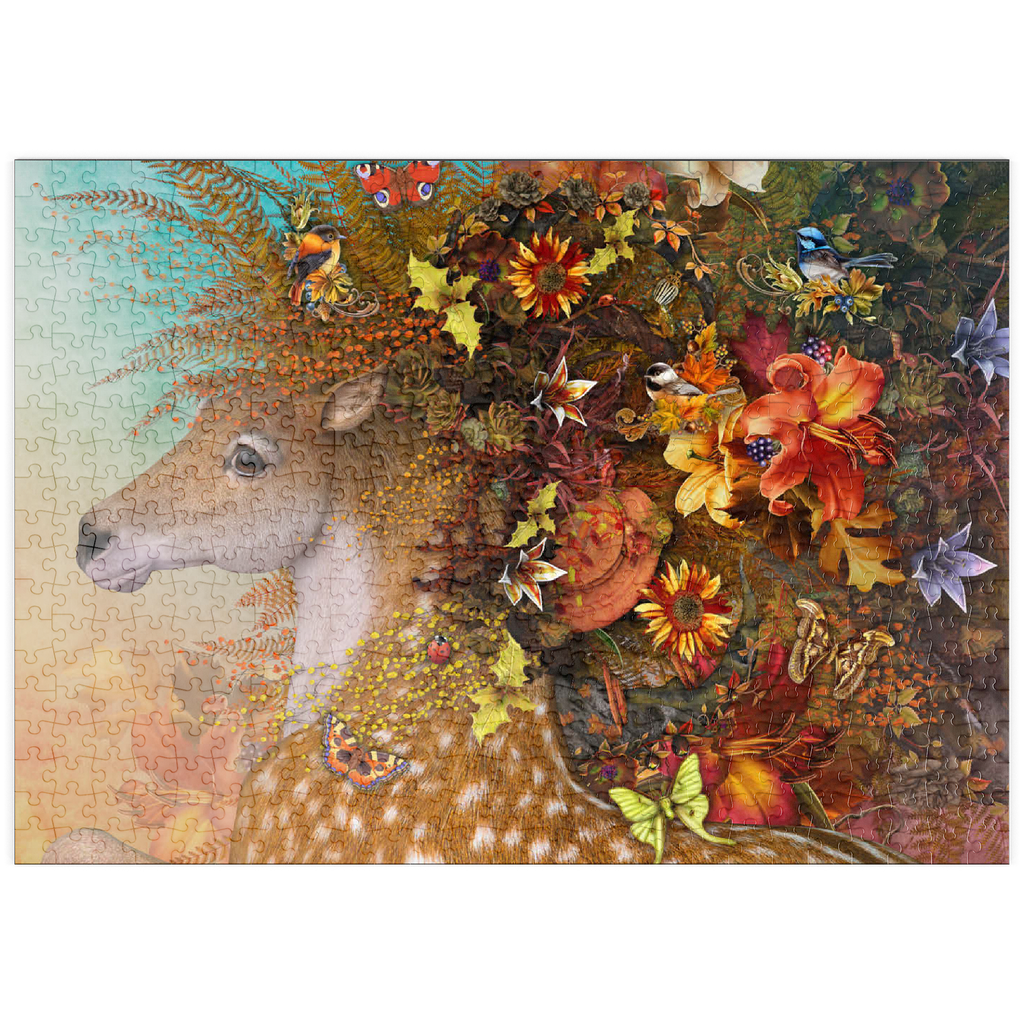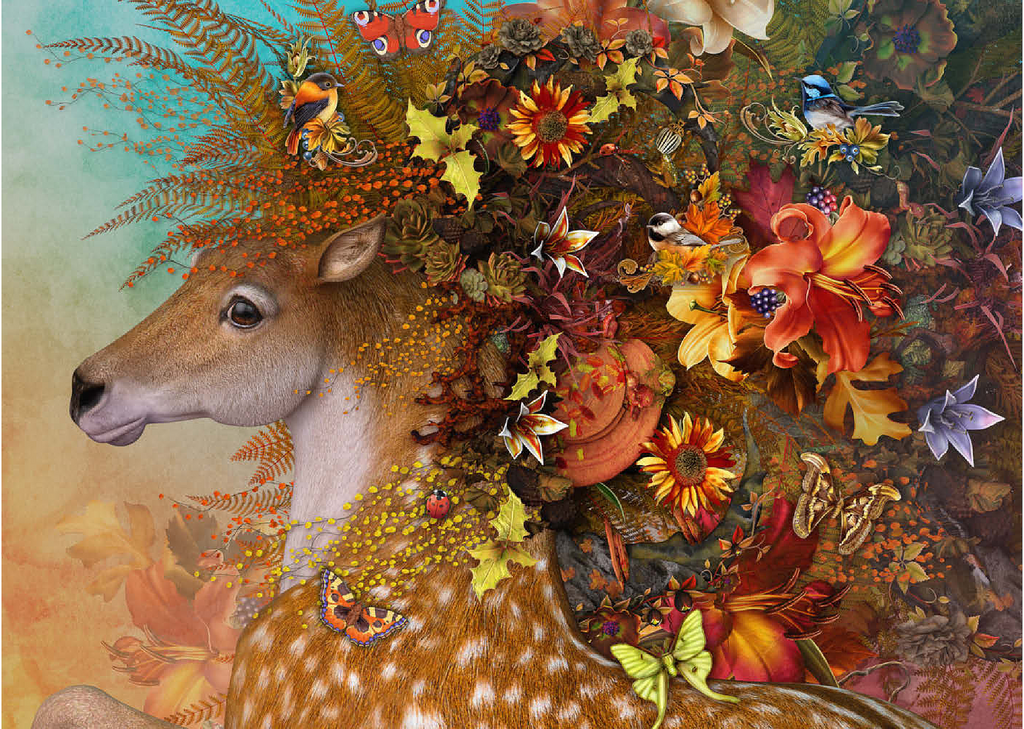 Laurie Prindles „Forest Spirit: Fall“ zelebriert die Schönheit der Natur, die Tierwelt und den Geist des Herbstes. Es handelt sich um eine lebhafte Fantasie-Darstellung eines Hirsches, der mit einer kunstvollen „Mähne“ aus Herbstlaub, darunter Farne, Sonnenblumen, Lilien und verschiedene Blätter, geschmückt ist. Kleine Vögel, Schmetterlinge und Marienkäfer haben sich in seinem üppigen botanischen Kopfschmuck eingenistet. Der Hintergrund besteht aus einer Mischung aus Blaugrün-, Orange- und Grüntönen mit dezenten floralen Elementen, die eine üppige, skurrile und bezaubernde Herbstszene schaffen.