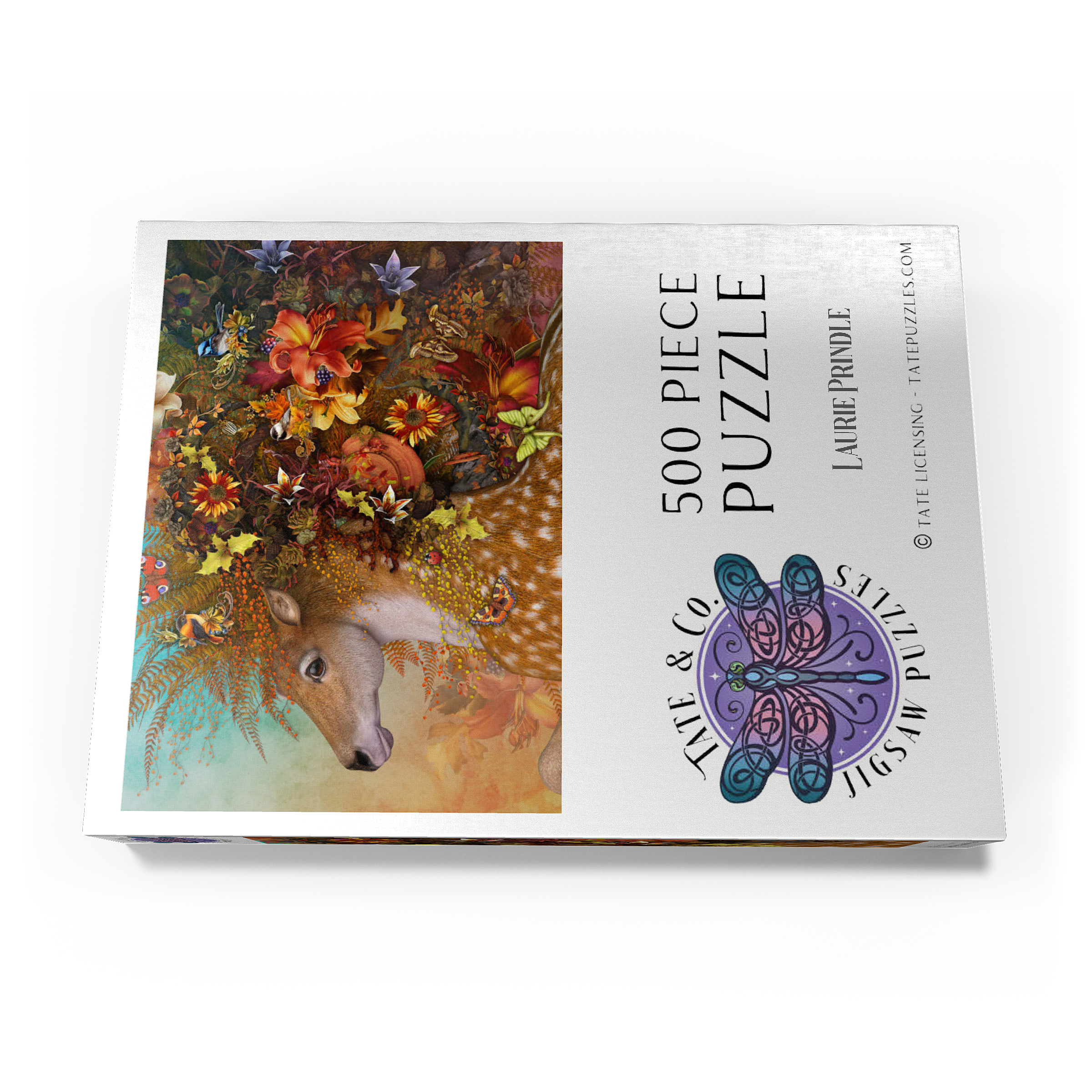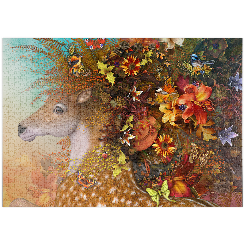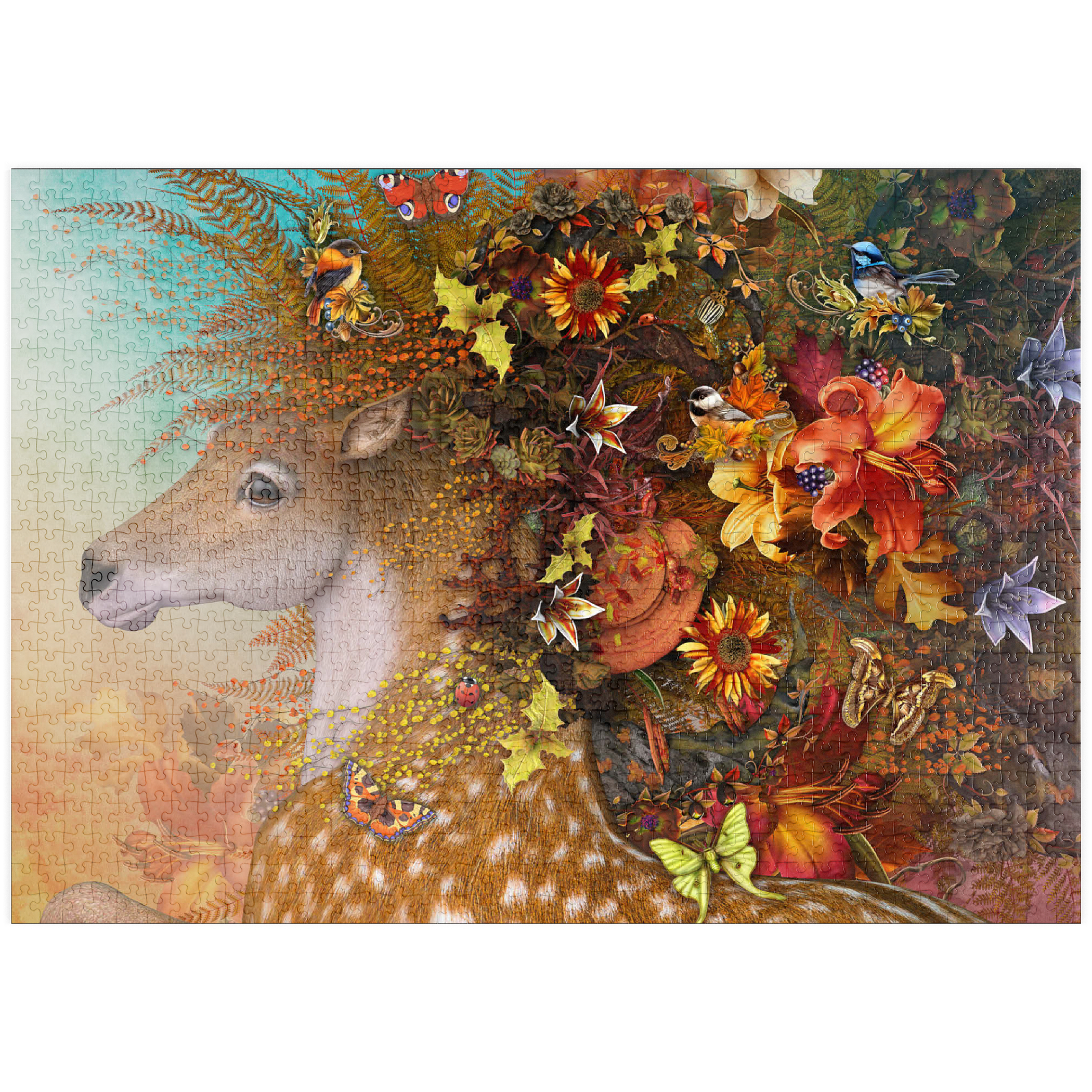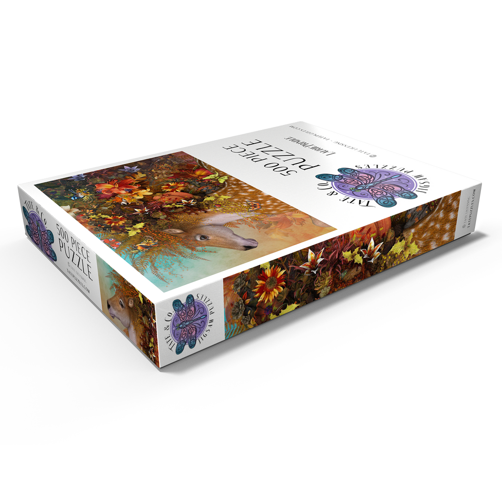 Laurie Prindles „Forest Spirit: Fall“ zelebriert die Schönheit der Natur, die Tierwelt und den Geist des Herbstes. Es handelt sich um eine lebhafte Fantasie-Darstellung eines Hirsches, der mit einer kunstvollen „Mähne“ aus Herbstlaub, darunter Farne, Sonnenblumen, Lilien und verschiedene Blätter, geschmückt ist. Kleine Vögel, Schmetterlinge und Marienkäfer haben sich in seinem üppigen botanischen Kopfschmuck eingenistet. Der Hintergrund besteht aus einer Mischung aus Blaugrün-, Orange- und Grüntönen mit dezenten floralen Elementen, die eine üppige, skurrile und bezaubernde Herbstszene schaffen.