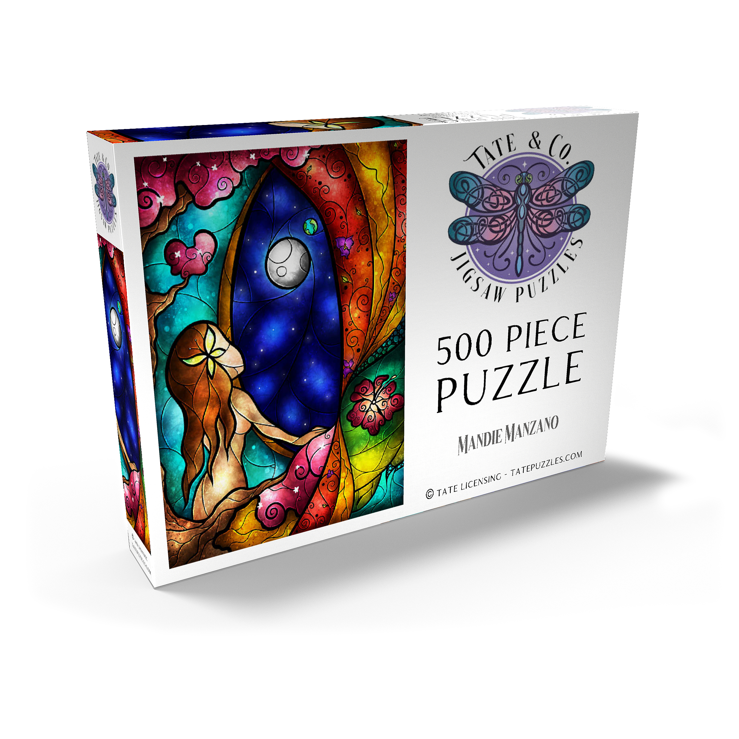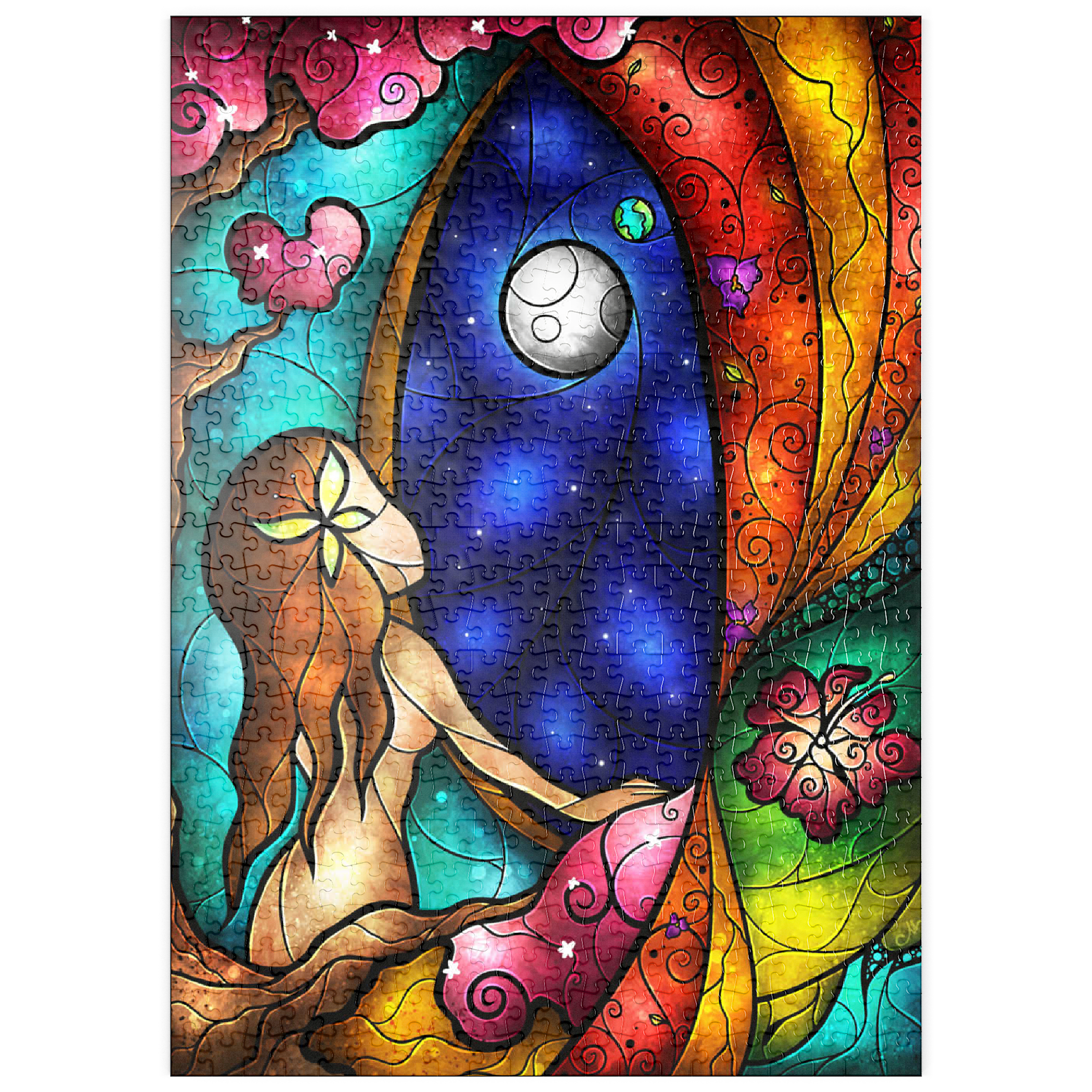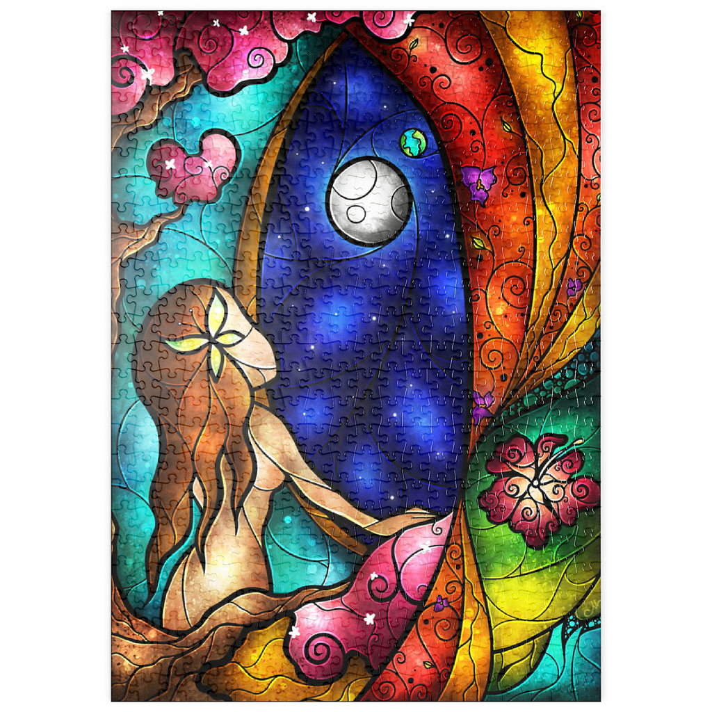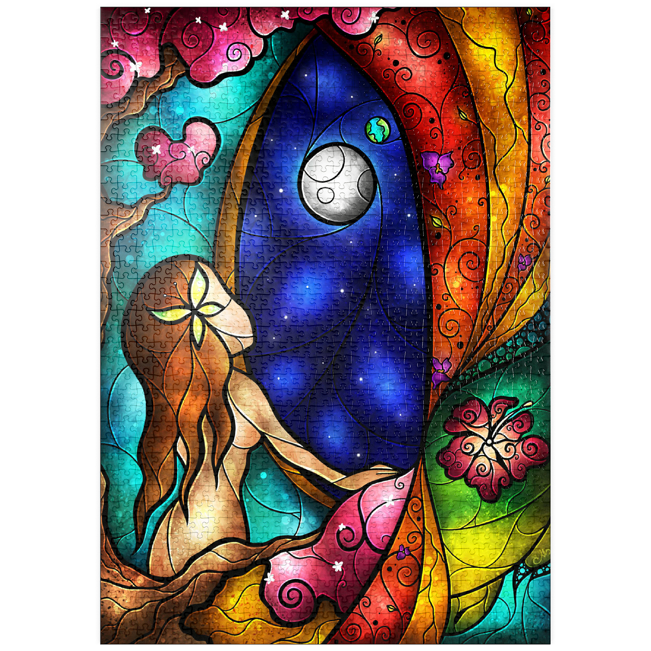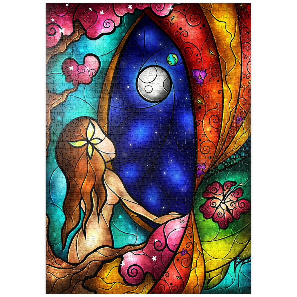 Setzen Sie dieses lebendige Kunstwerk im Stil eines Buntglasfensters von Mandie Manzano mit dem Titel „I Miss You“ zusammen. Ein sehnsüchtiges Mädchen mit wallendem rotbraunem Haar und einem Schmetterlingsakzent blickt aus einem geschwungenen Fenster in einen tiefblauen, sternenübersäten Kosmos. Hinter dem Mond leuchtet die ferne Erde. Bunte Blumen und wirbelnde organische Muster rahmen die Szene ein und deuten auf eine Welt hin, nach der sie sich sehnt. Erleben Sie die zarten Emotionen in jedem einzigartig geformten Puzzleteil.