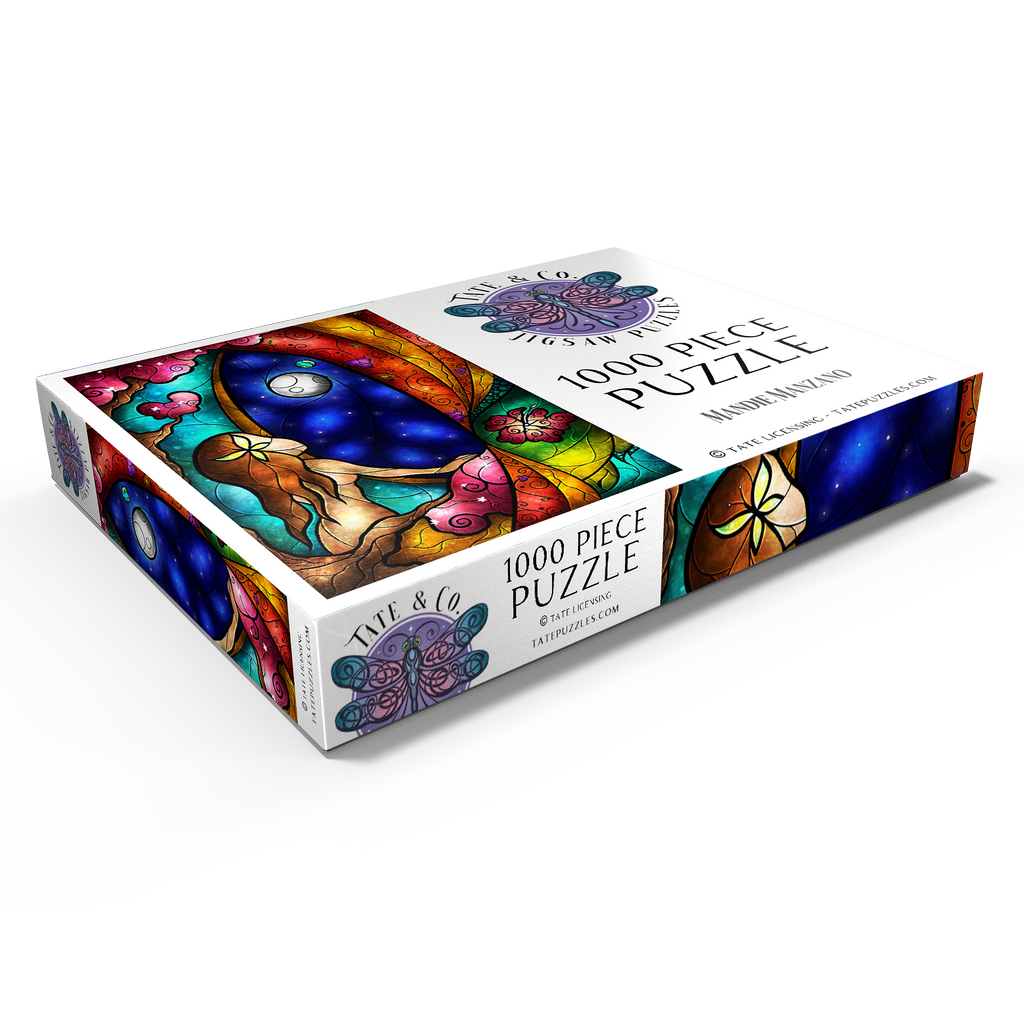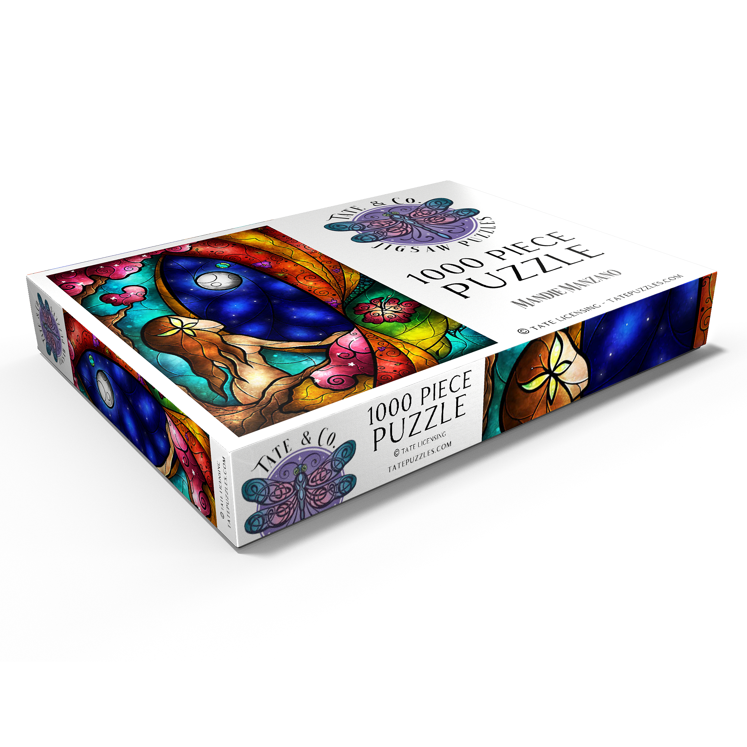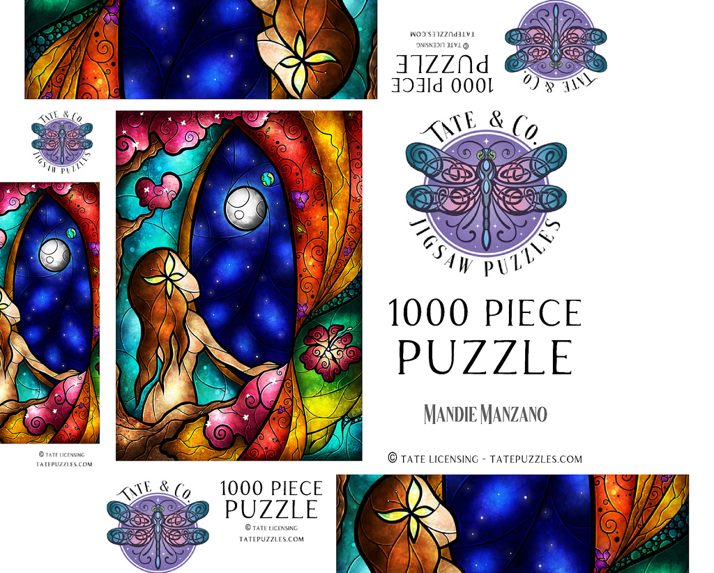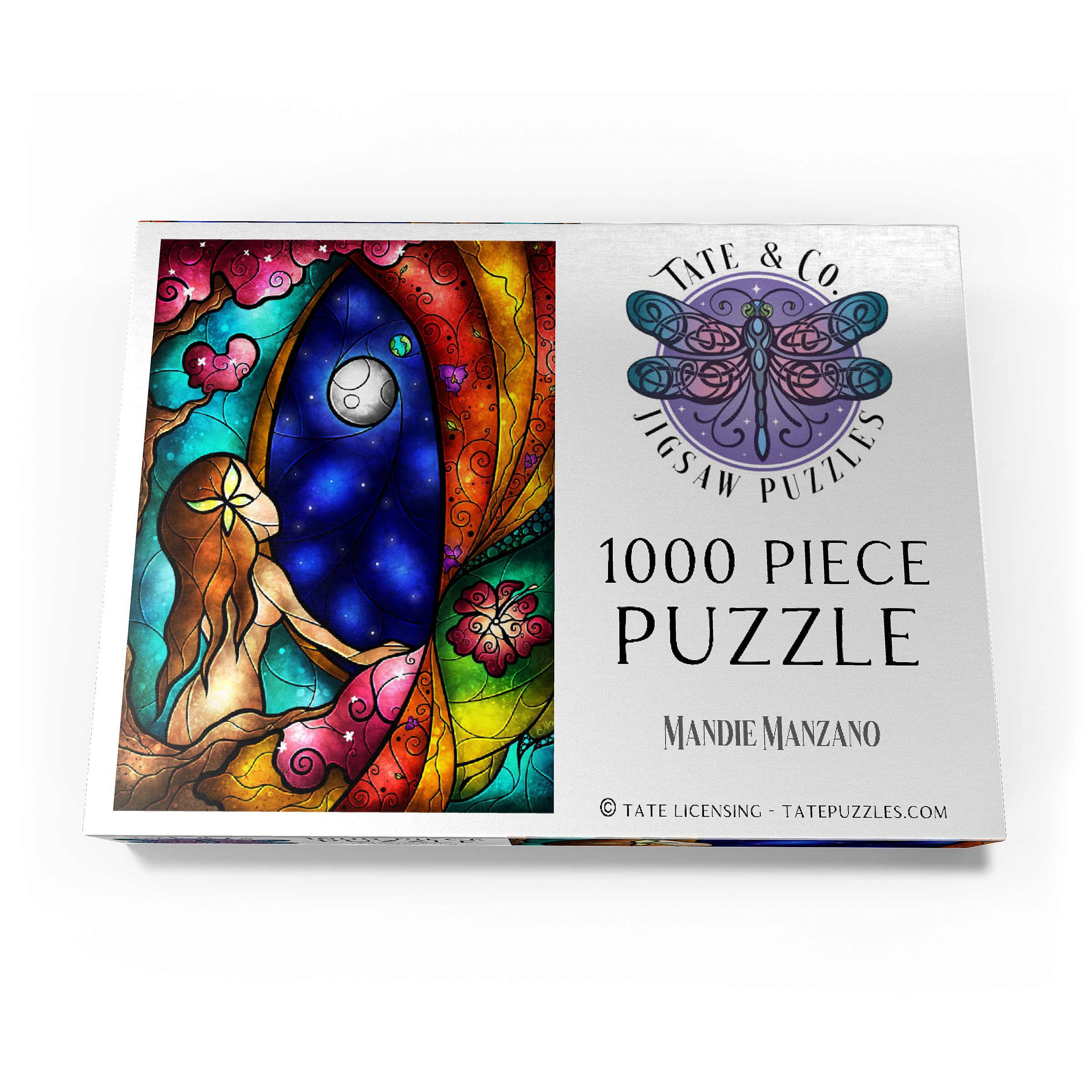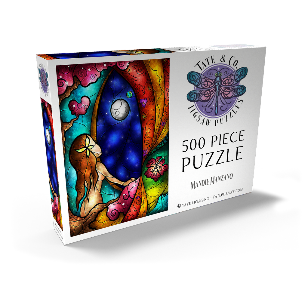 Setzen Sie dieses lebendige Kunstwerk im Stil eines Buntglasfensters von Mandie Manzano mit dem Titel „I Miss You“ zusammen. Ein sehnsüchtiges Mädchen mit wallendem rotbraunem Haar und einem Schmetterlingsakzent blickt aus einem geschwungenen Fenster in einen tiefblauen, sternenübersäten Kosmos. Hinter dem Mond leuchtet die ferne Erde. Bunte Blumen und wirbelnde organische Muster rahmen die Szene ein und deuten auf eine Welt hin, nach der sie sich sehnt. Erleben Sie die zarten Emotionen in jedem einzigartig geformten Puzzleteil.