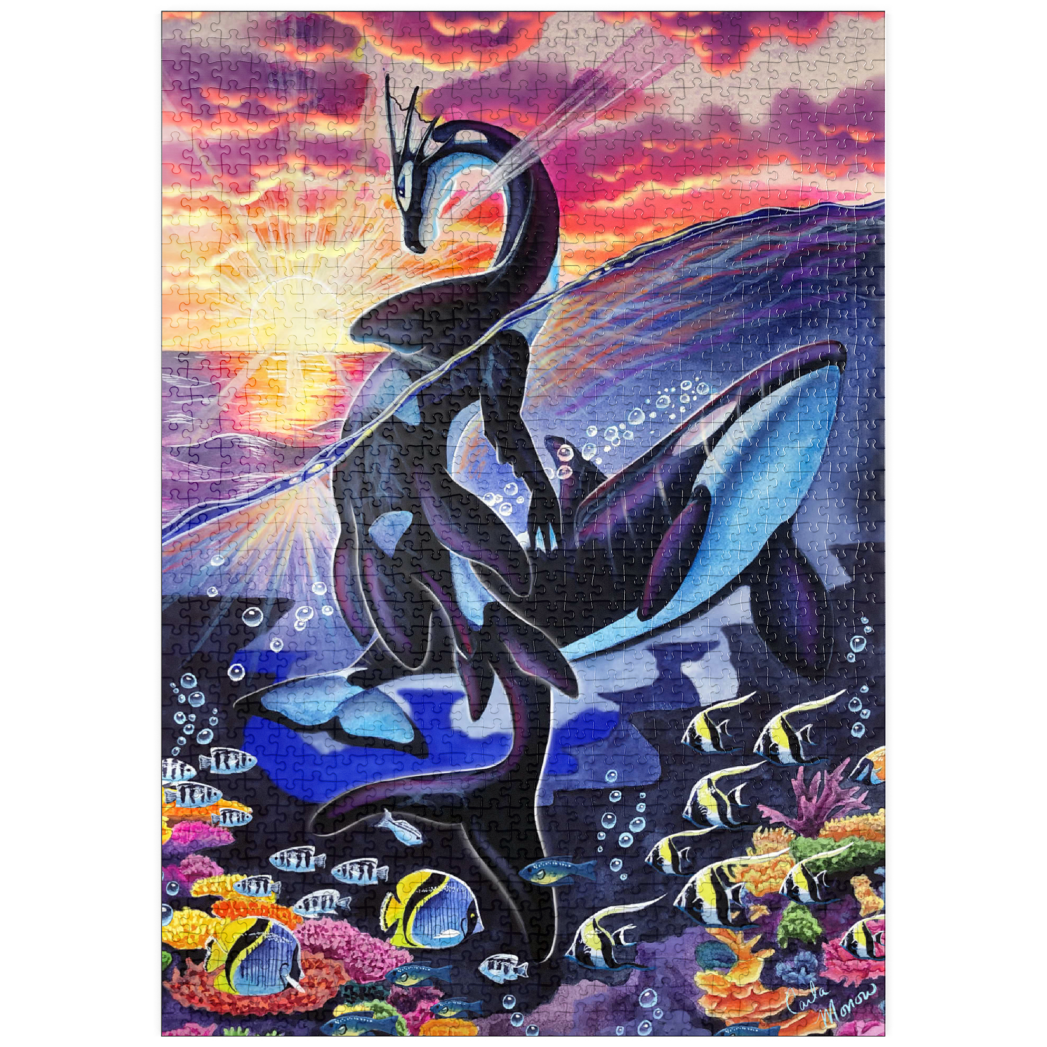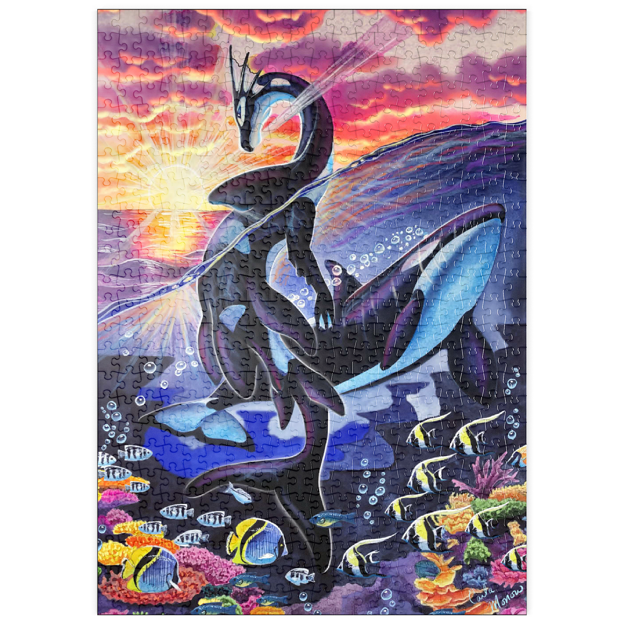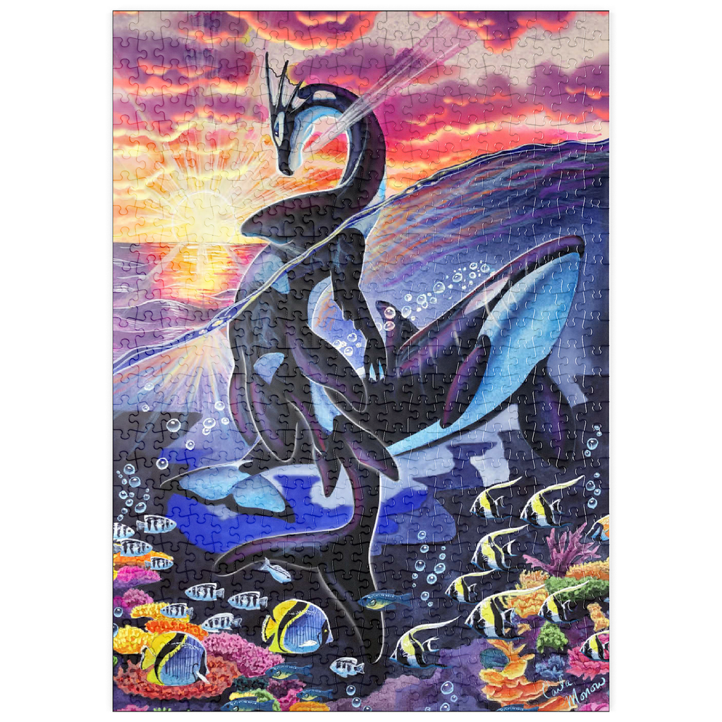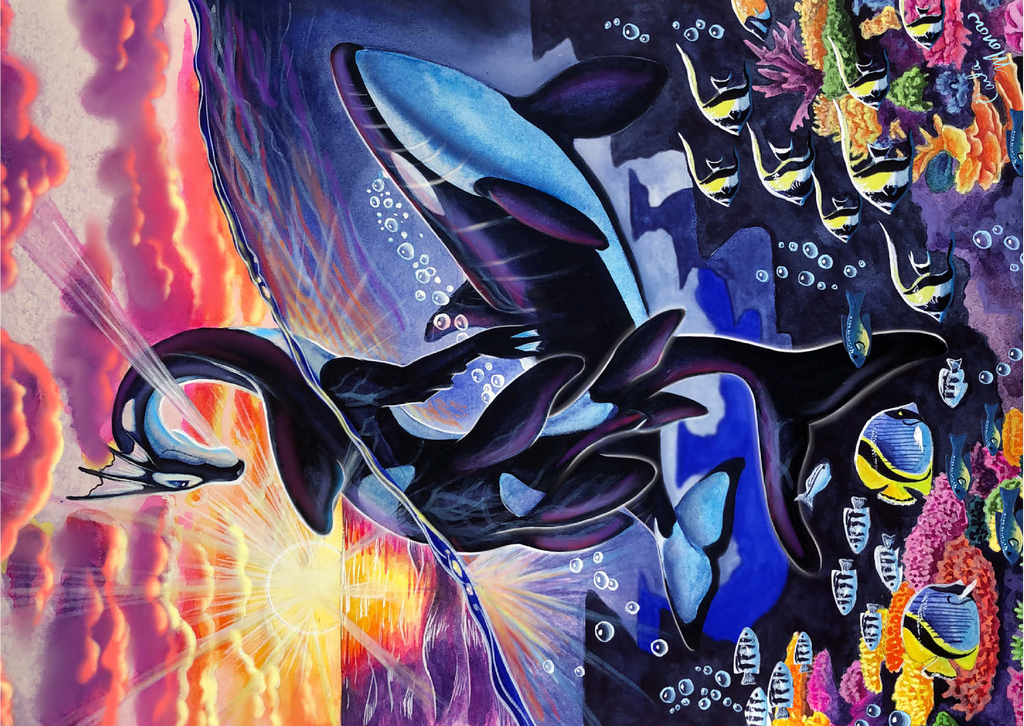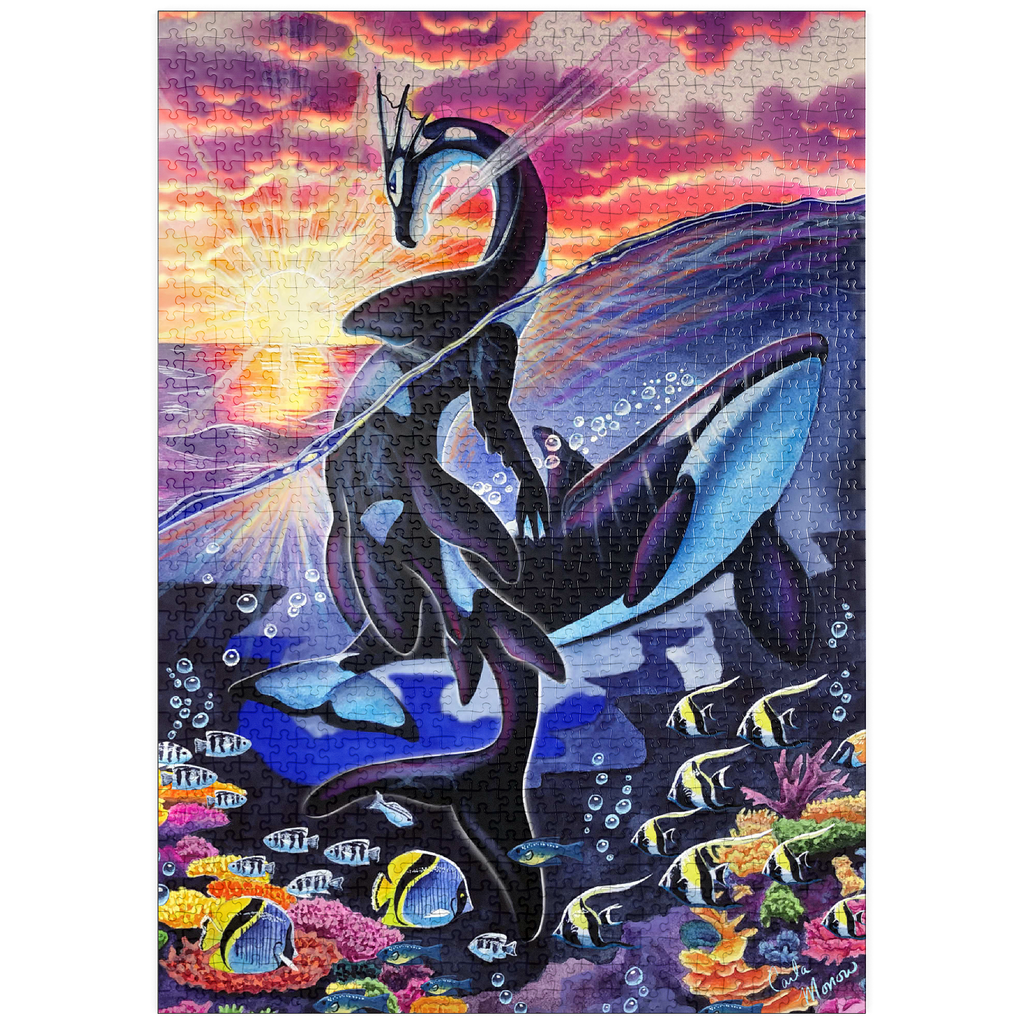 Dieses atemberaubende Werk mit dem Titel „Ocean’s Sunrise“ fängt die magische Dualität von Meer und Himmel durch die anmutige Form eines Wasserdrachen ein. Die Szene ist geteilt zwischen der leuchtenden Oberfläche eines von Sonnenstrahlen überfluteten Ozeans und dem pulsierenden Leben eines Korallenriffs darunter. Der Drache, schlank und fließend im Design, spiegelt die Markierungen eines Orcas wider, während er sich über die Wellen erhebt und sein Körper sich elegant durch die Wasserlinie wölbt. Sonnenstrahlen durchdringen die Wolken und reflektieren sich auf der Oberfläche, wodurch strahlende Lichtreflexe entstehen, die den Blick des Betrachters vom feurigen Himmel auf das ruhige Blau darunter lenken. Um den Drachen herum schwimmen Schwärme tropischer Fische und üppige Korallenformationen, die vor Farben und Bewegung nur so wimmeln. Dieses Kunstwerk ist eine atemberaubende Hommage an die miteinander verbundene Schönheit des Meereslebens und des Himmelslichts und strahlt in seiner Feier der Geheimnisse des Ozeans sowohl Ruhe als auch Kraft aus.