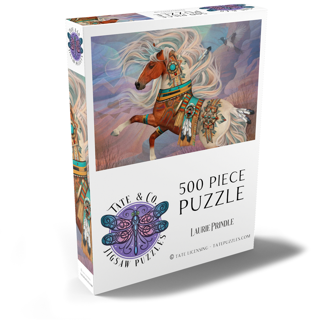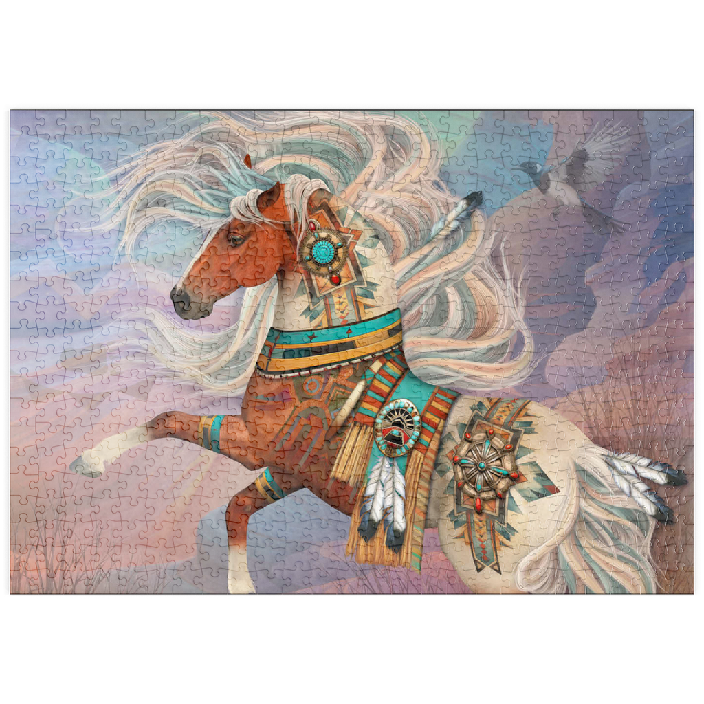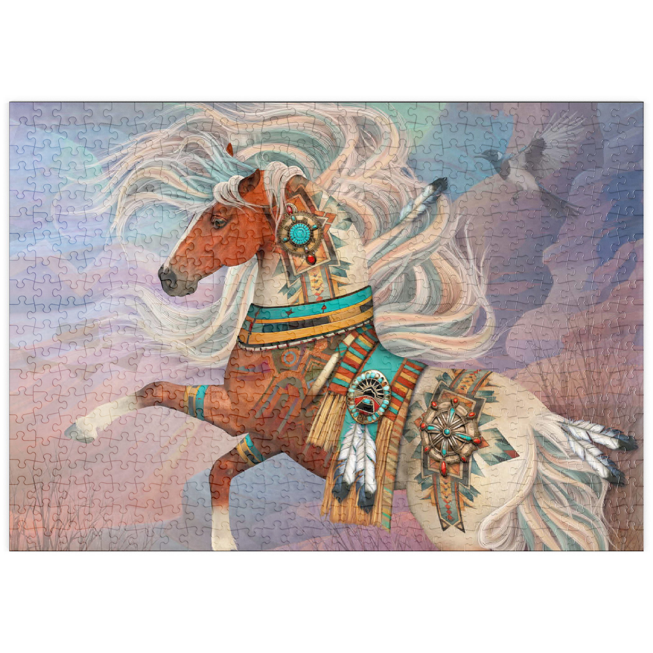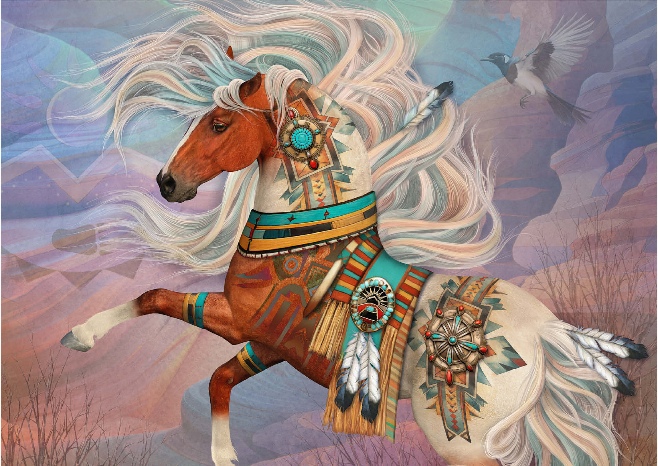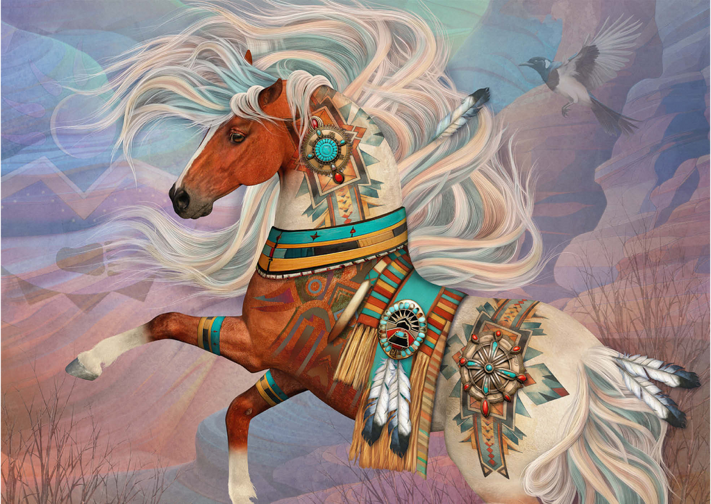 Laurie Prindles „Redrock Mystic“ zeigt ein lebhaftes, mystisches Kastanienbraunes Kriegspferd mit einer prächtigen, wallenden Mähne und einem Schweif in wirbelnden Weiß- und Blaugrüntönen. Es ist aufwendig verziert mit komplizierten Mustern der amerikanischen Ureinwohner, Conchos, Türkis- und roten Jaspissteinen, Adlerfedern und einer detailreichen Satteldecke im Stil der Ureinwohner, vor dem Hintergrund abstrakter roter Felsformationen unter einem Abendhimmel. Eine hochfliegende Elster vervollständigt dieses kraftvolle und spirituelle Kunstwerk.