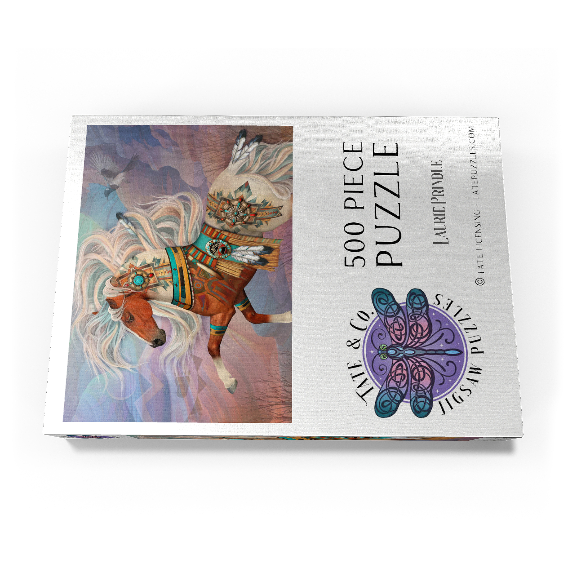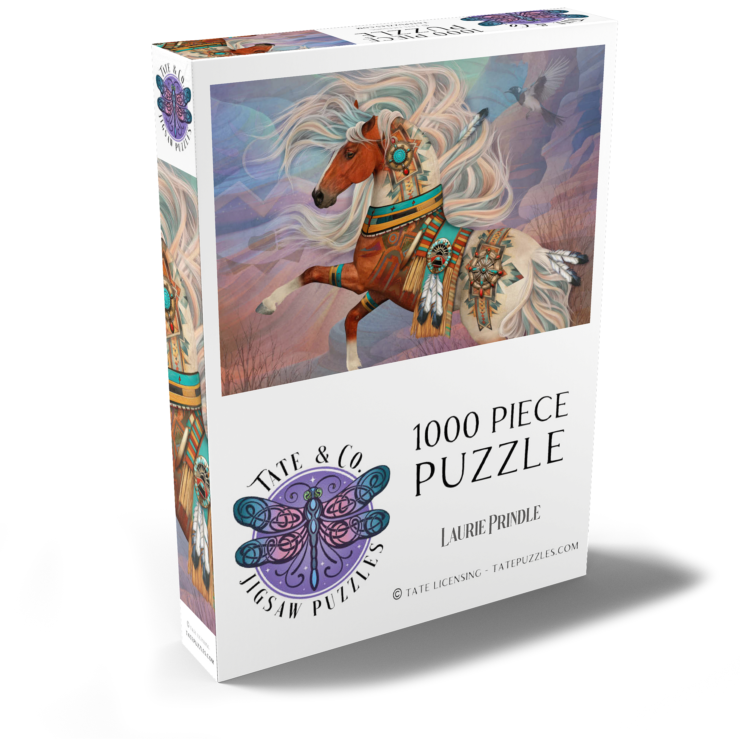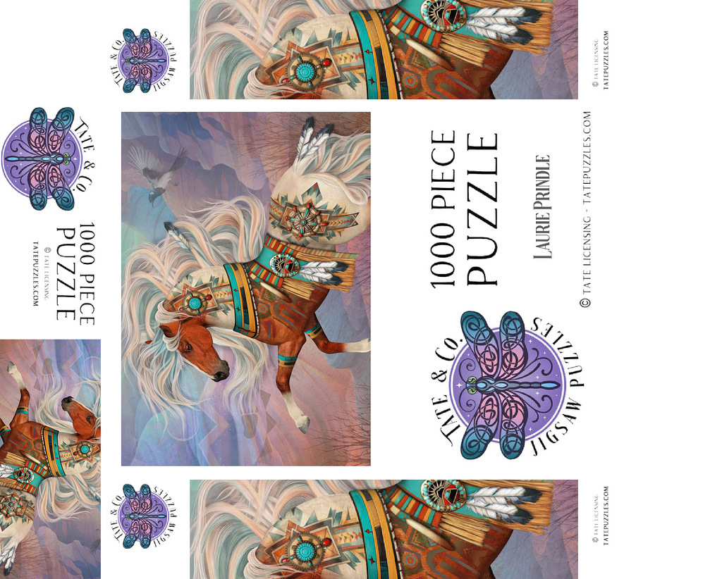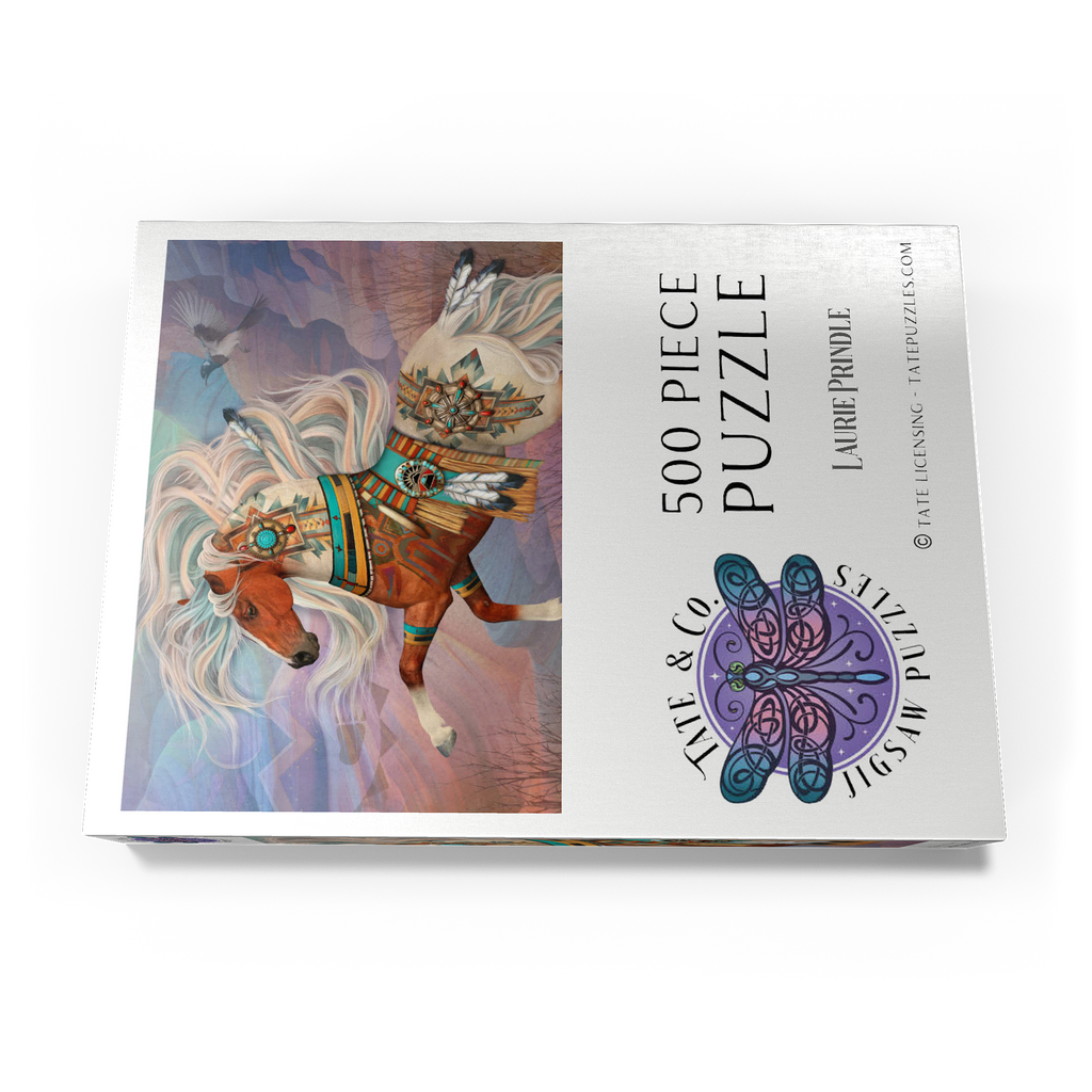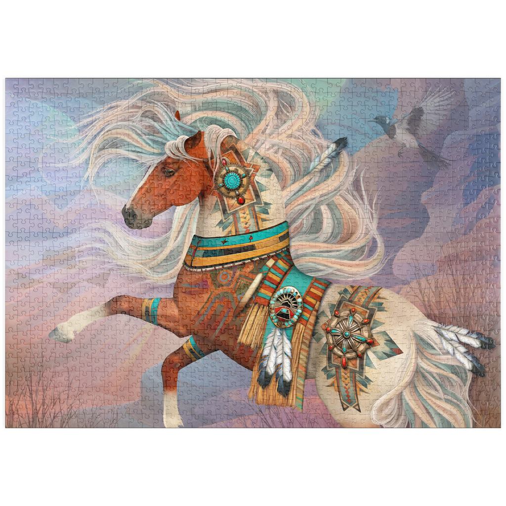 Laurie Prindles „Redrock Mystic“ zeigt ein lebhaftes, mystisches Kastanienbraunes Kriegspferd mit einer prächtigen, wallenden Mähne und einem Schweif in wirbelnden Weiß- und Blaugrüntönen. Es ist aufwendig verziert mit komplizierten Mustern der amerikanischen Ureinwohner, Conchos, Türkis- und roten Jaspissteinen, Adlerfedern und einer detailreichen Satteldecke im Stil der Ureinwohner, vor dem Hintergrund abstrakter roter Felsformationen unter einem Abendhimmel. Eine hochfliegende Elster vervollständigt dieses kraftvolle und spirituelle Kunstwerk.