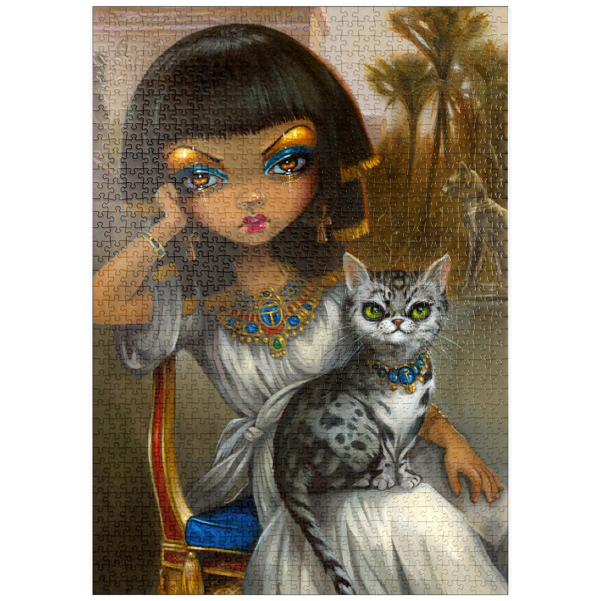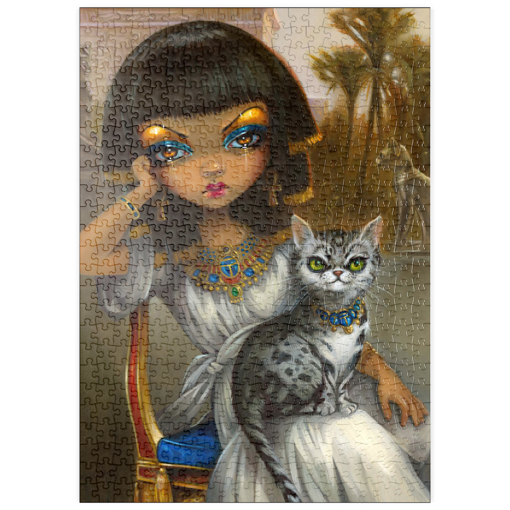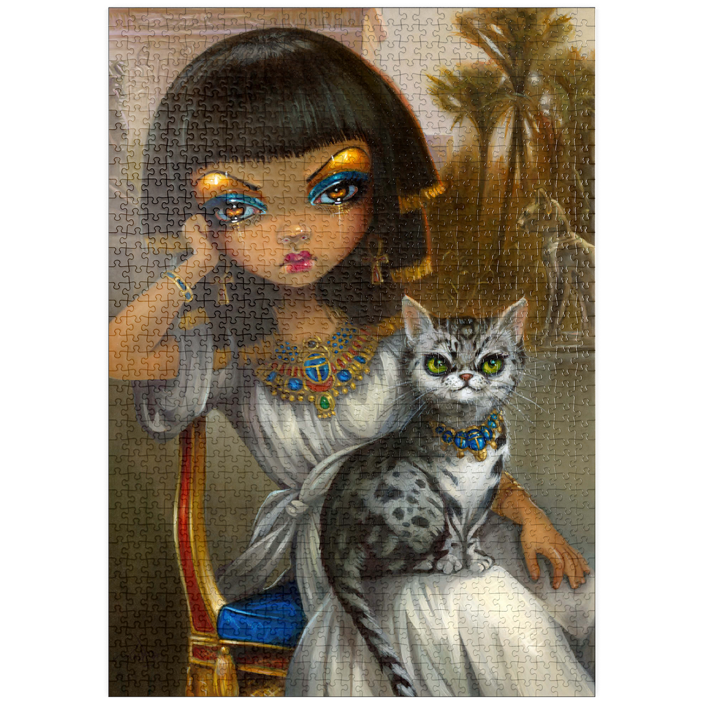 Lüfte das Geheimnis der ägyptischen Prinzessin Sanura! Setze dieses faszinierende Puzzle mit ihrer eleganten ägyptischen Mau-Katze zusammen. Entdecke eine Mischung aus dem ägyptischen Revival des viktorianischen Englands, französischer akademischer Kunst und den romantischen Kulissen von Alma-Tadema und Gerome, alles mit einem Hauch von zeitgenössischem Pop-Surrealismus. Setze diese einzigartige kulturelle Fusion zusammen!