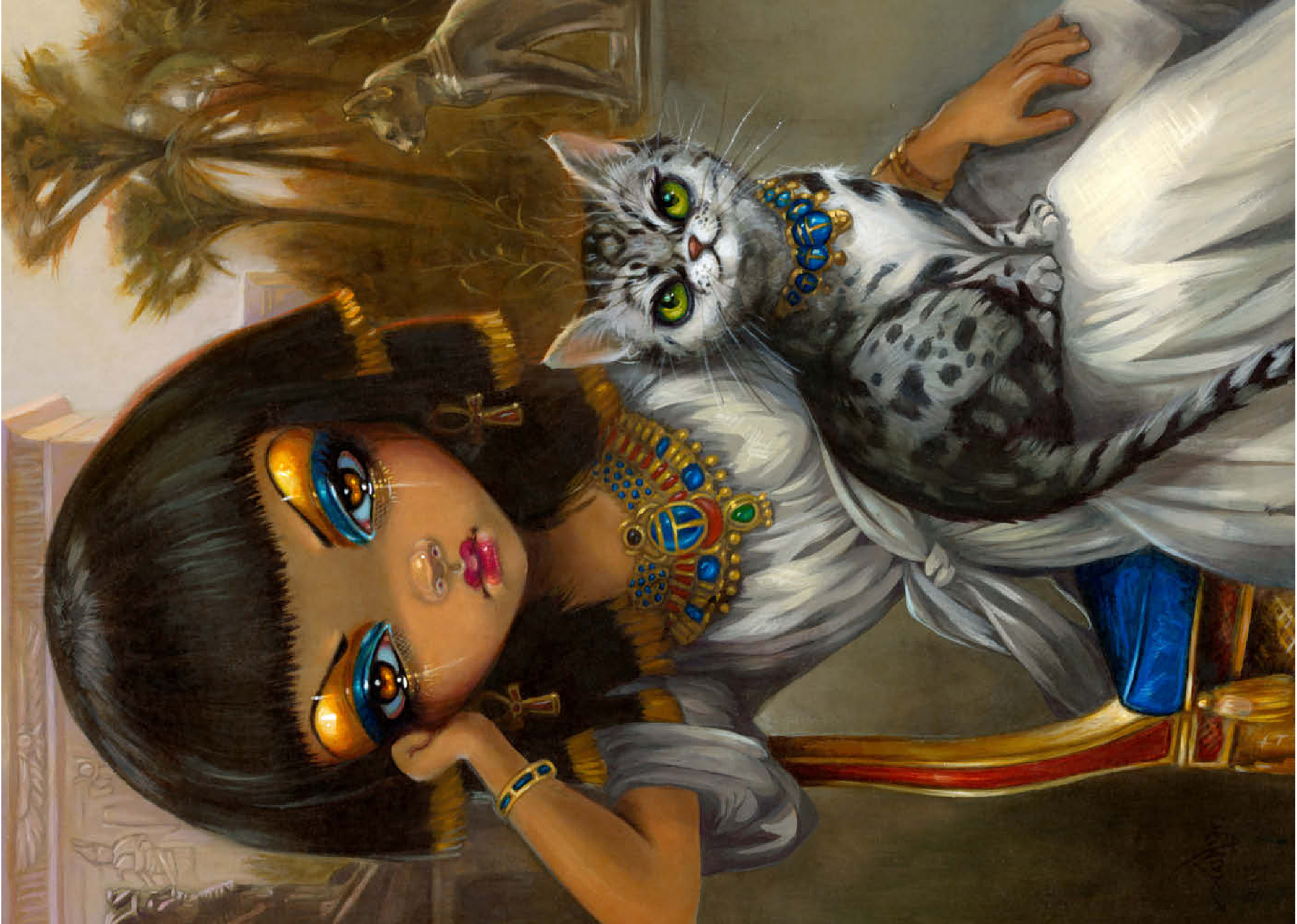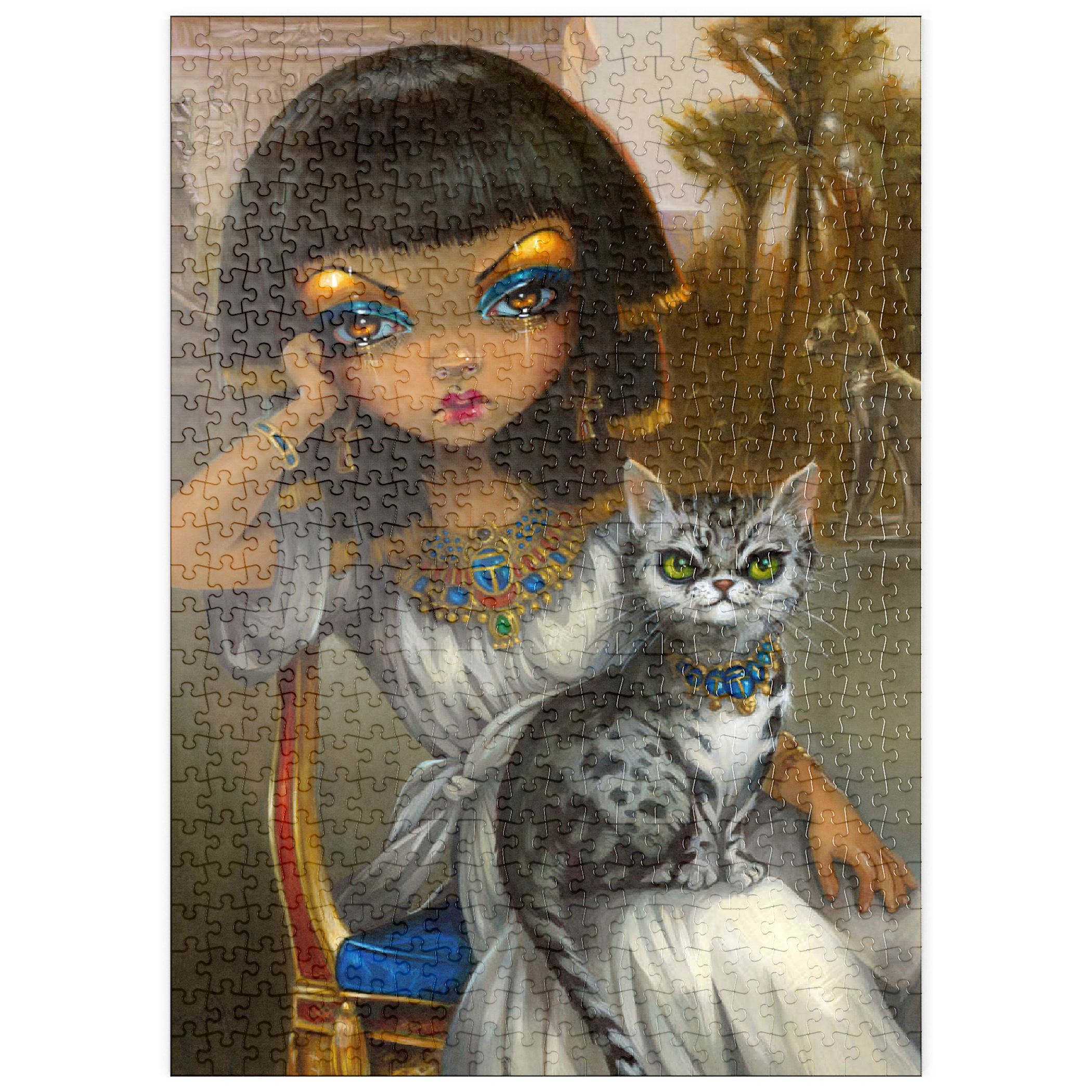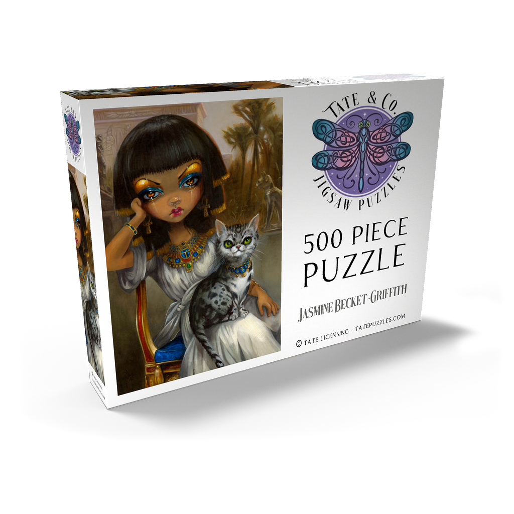 Lüfte das Geheimnis der ägyptischen Prinzessin Sanura! Setze dieses faszinierende Puzzle mit ihrer eleganten ägyptischen Mau-Katze zusammen. Entdecke eine Mischung aus dem ägyptischen Revival des viktorianischen Englands, französischer akademischer Kunst und den romantischen Kulissen von Alma-Tadema und Gerome, alles mit einem Hauch von zeitgenössischem Pop-Surrealismus. Setze diese einzigartige kulturelle Fusion zusammen!
