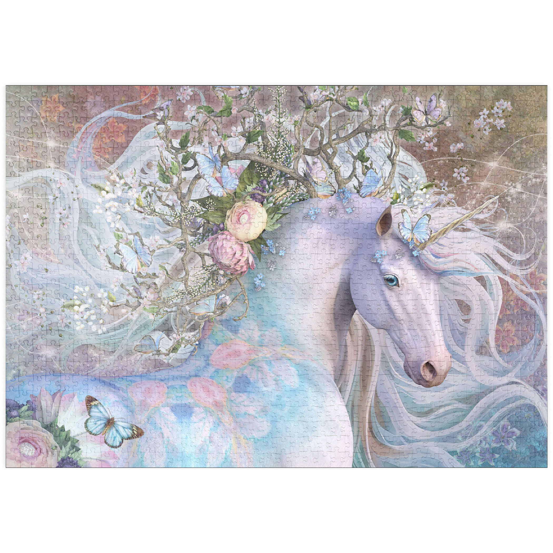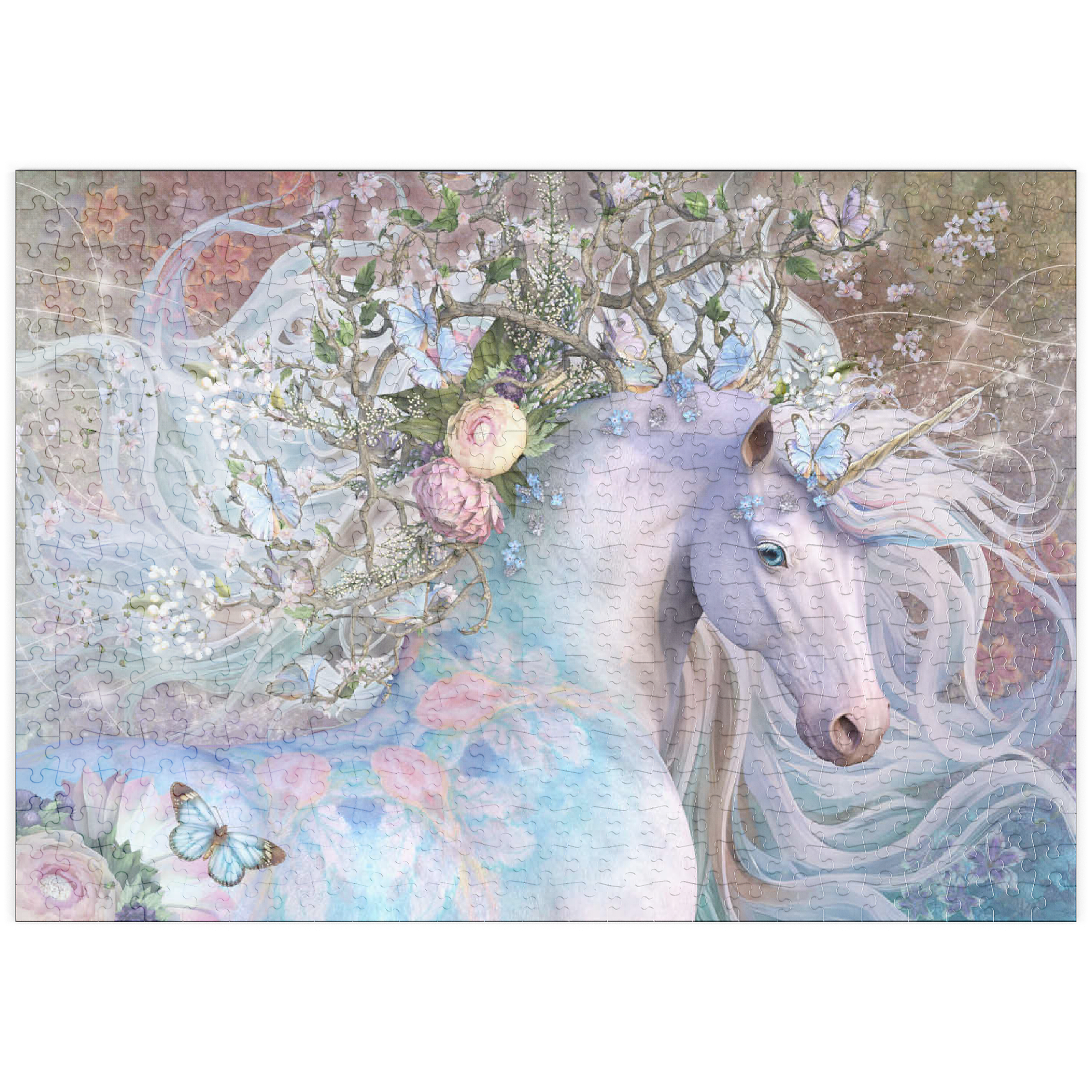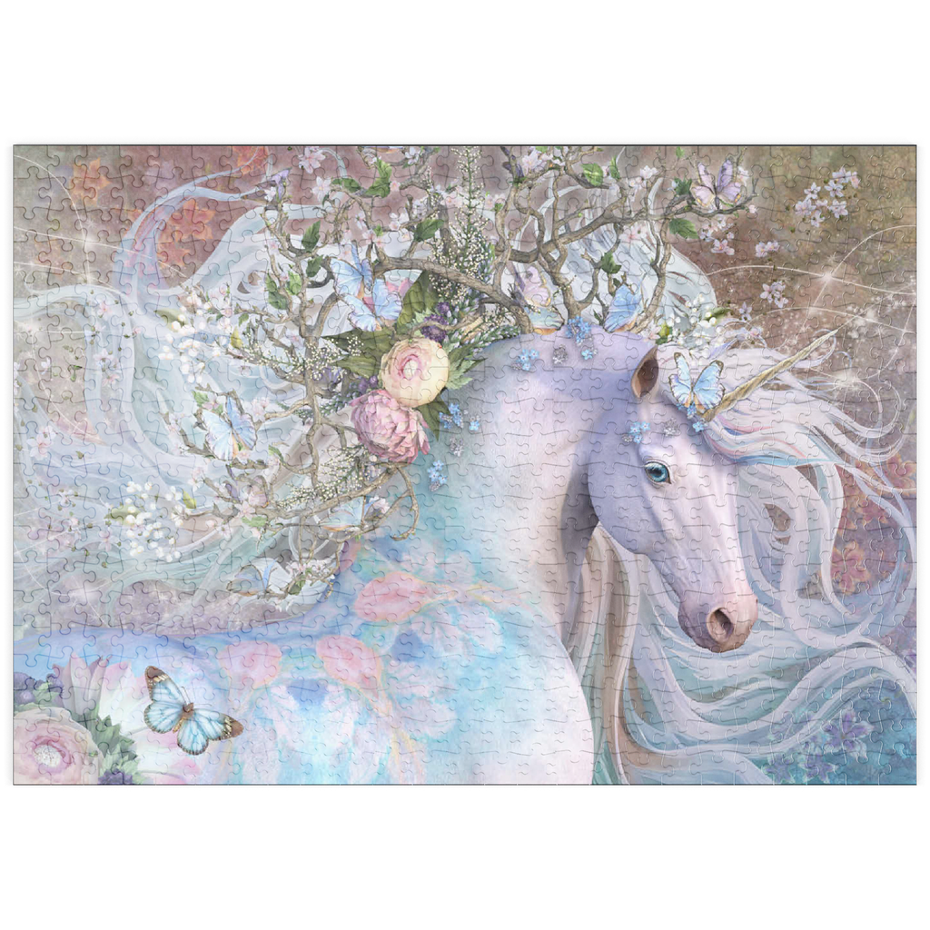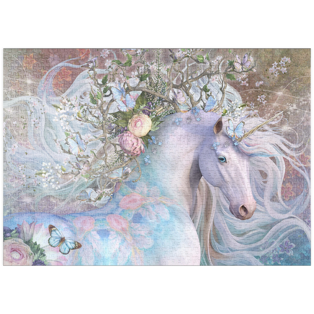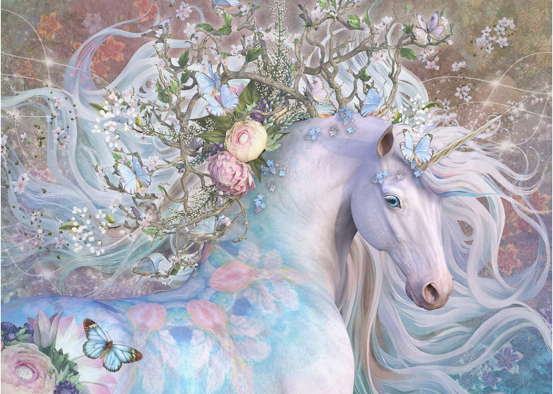 Laurie Prindles „Spring Equinox“ zeigt ein mystisches weißes Einhorn mit einer leuchtenden, wirbelnden Mähne und einem Schwanz, der mit einer fantastischen Krone aus ineinander verschlungenen Zweigen, zarten weißen Blüten und hellblauen Schmetterlingen geschmückt ist. Sein Fell ist mit dezenten pastellrosa und blauen Blumenmustern verziert, die seine ätherische Schönheit unterstreichen. Der Hintergrund ist eine sanfte, traumhafte Mischung aus Violett-, Rosa- und Grüntönen mit funkelnden Lichteffekten, die eine magische, bezaubernde und fantasievolle Atmosphäre schaffen. Das Bild verkörpert Themen wie Frühling, Erneuerung, Magie und Fabelwesen.