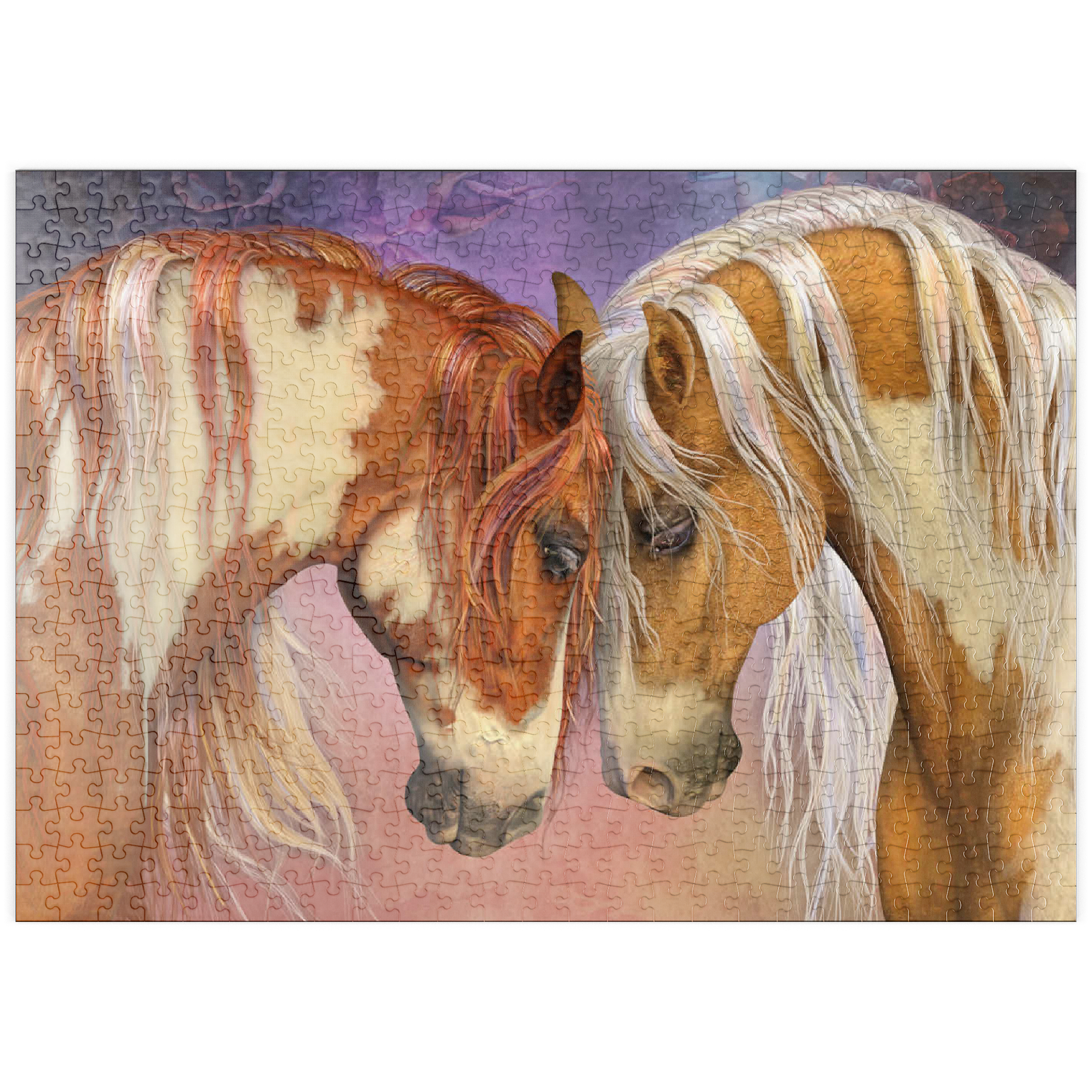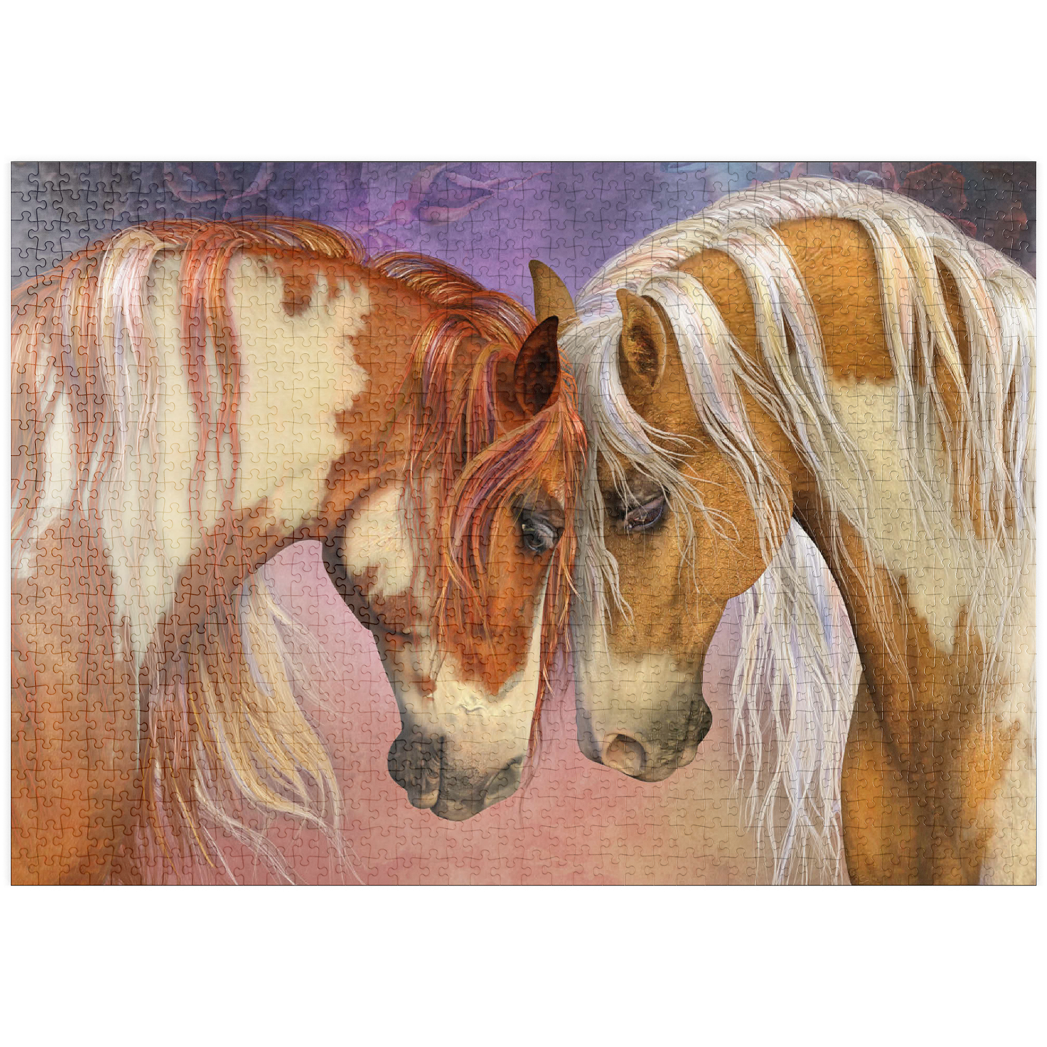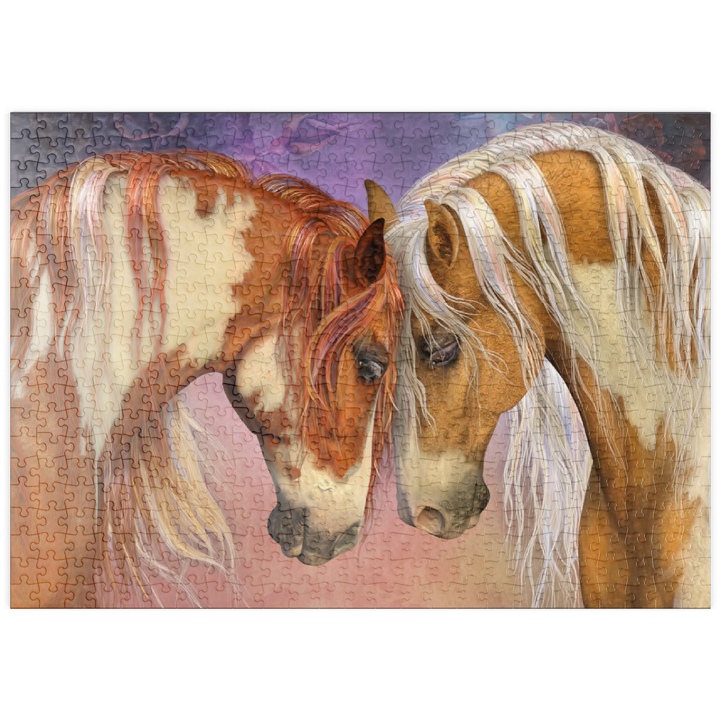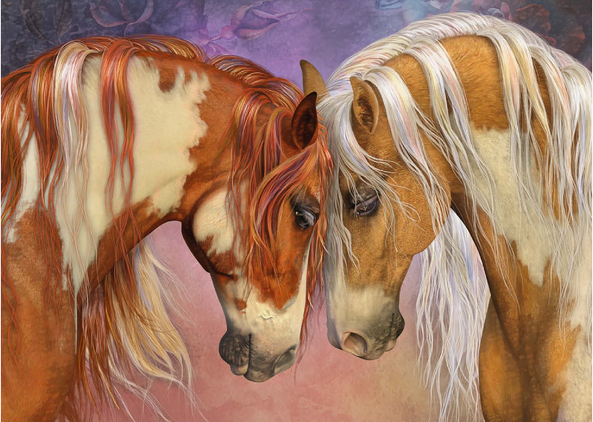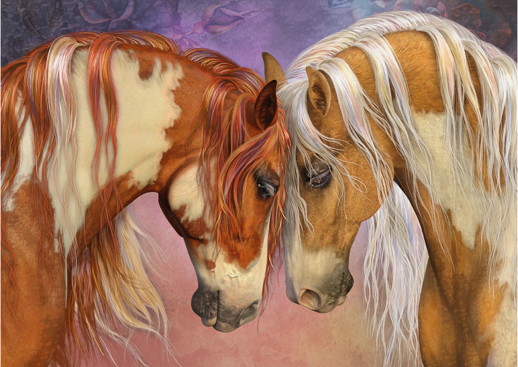 Zwei wunderschöne Pinto-Pferde, deren ausdrucksstarke Augen tiefe Zuneigung vermitteln, teilen einen innigen Moment in diesem zarten Porträt der Pferdekünstlerin Laurie Prindle. Beide besitzen prächtige, lange, fließende Mähnen, die sich vermischen und ein Gefühl von Intimität und Verbundenheit schaffen. Sie sind umgeben von einer sanften, verträumten Mischung aus Violett- und Rosatönen, die die romantische und ruhige Atmosphäre unterstreicht. Dieses herzerwärmende Pferdekunstwerk fängt Themen wie Kameradschaft, Liebe, Verbundenheit zwischen Pferden und gegenseitige Zuneigung auf wunderschöne Weise ein und zeigt die Anmut und emotionale Tiefe von Pferden.