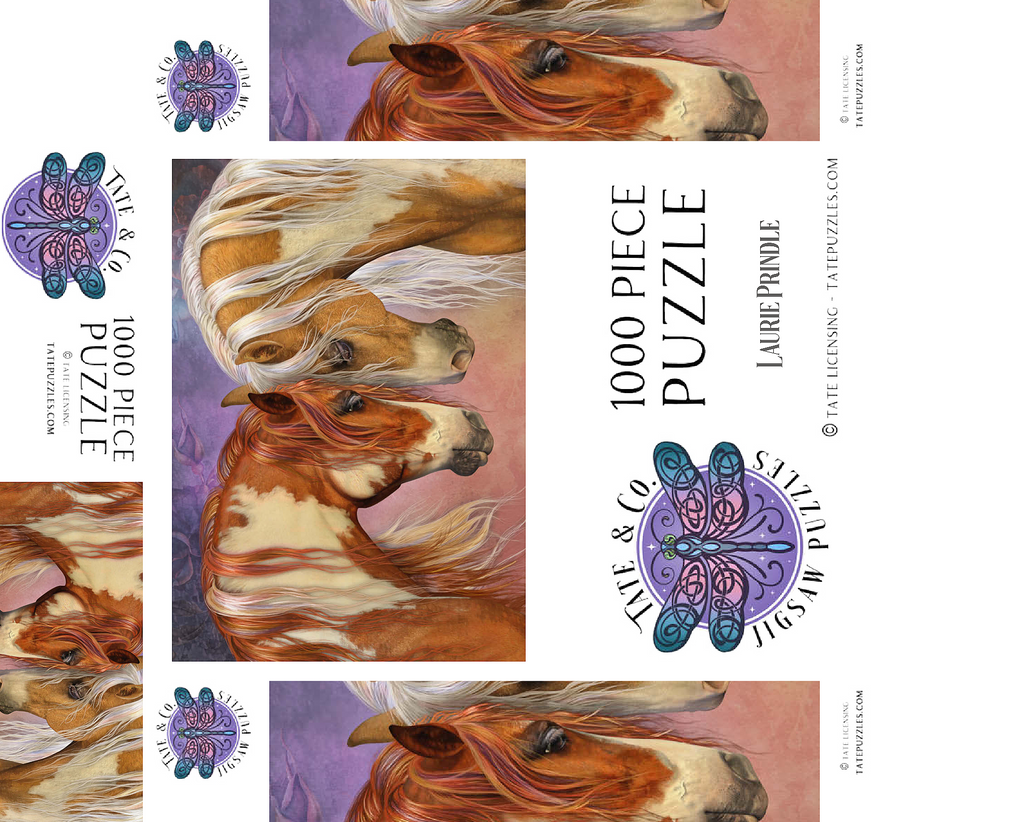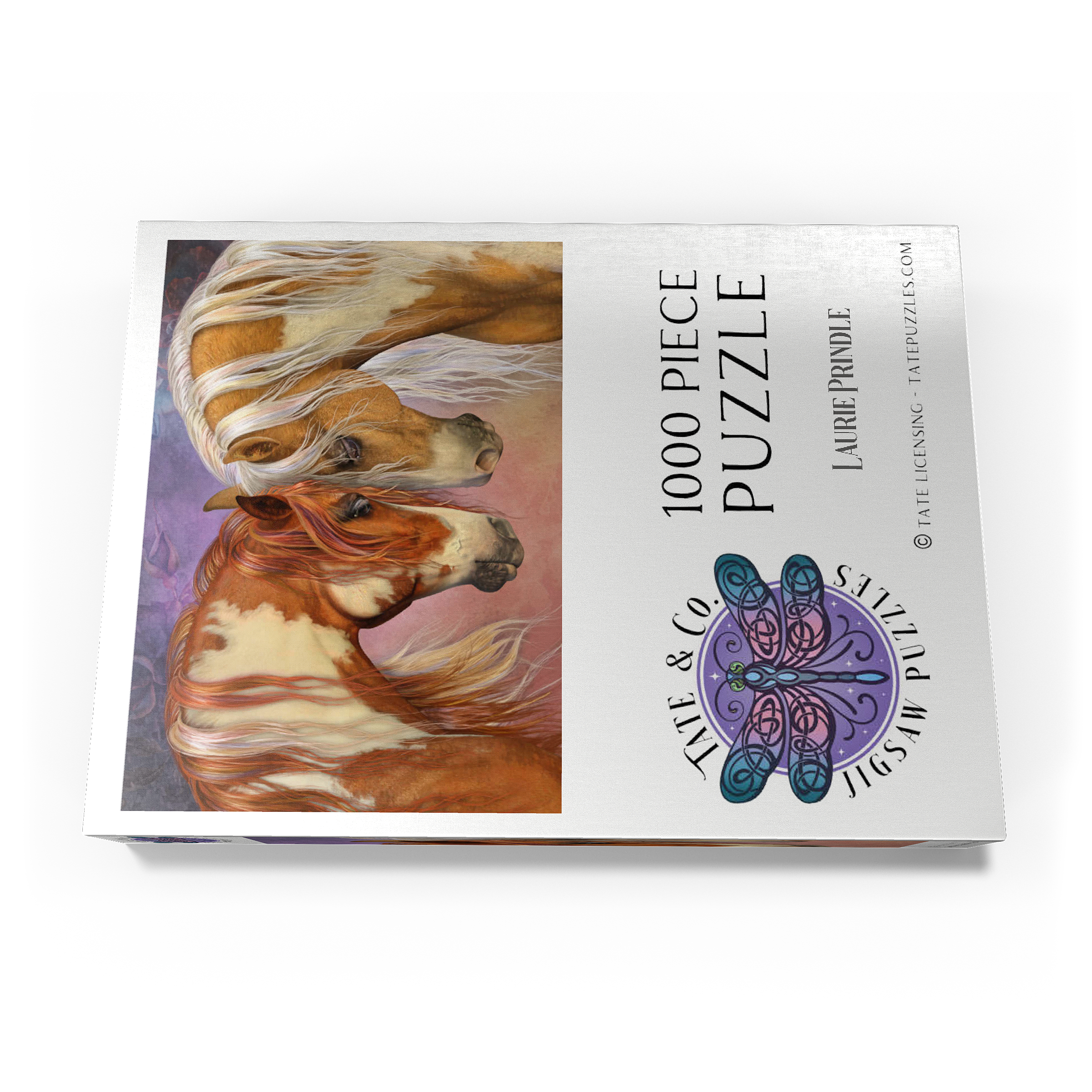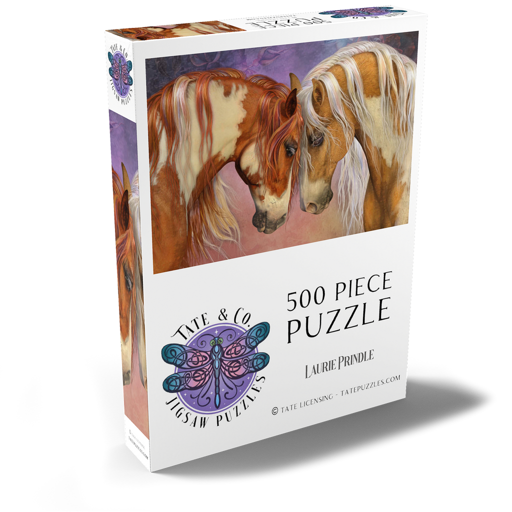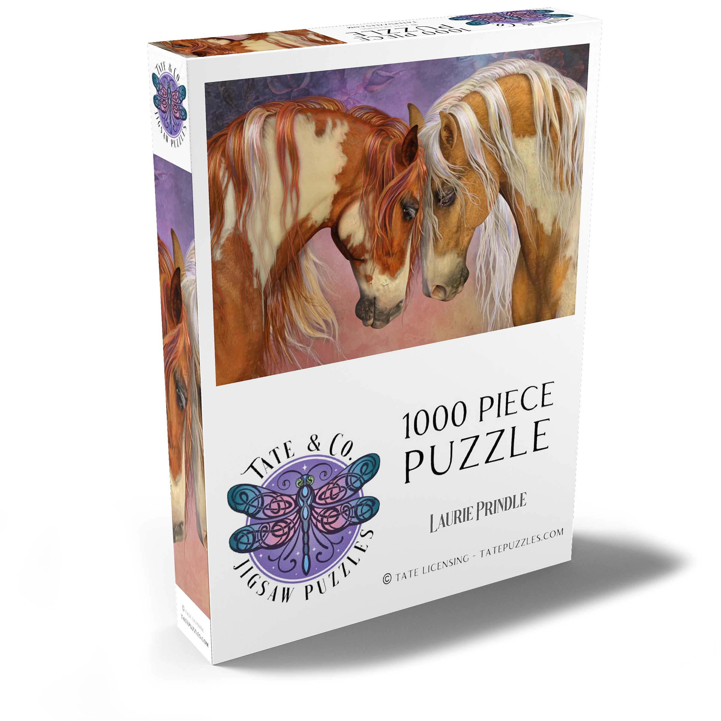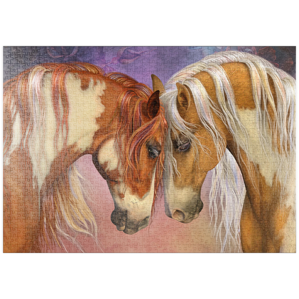 Zwei wunderschöne Pinto-Pferde, deren ausdrucksstarke Augen tiefe Zuneigung vermitteln, teilen einen innigen Moment in diesem zarten Porträt der Pferdekünstlerin Laurie Prindle. Beide besitzen prächtige, lange, fließende Mähnen, die sich vermischen und ein Gefühl von Intimität und Verbundenheit schaffen. Sie sind umgeben von einer sanften, verträumten Mischung aus Violett- und Rosatönen, die die romantische und ruhige Atmosphäre unterstreicht. Dieses herzerwärmende Pferdekunstwerk fängt Themen wie Kameradschaft, Liebe, Verbundenheit zwischen Pferden und gegenseitige Zuneigung auf wunderschöne Weise ein und zeigt die Anmut und emotionale Tiefe von Pferden.