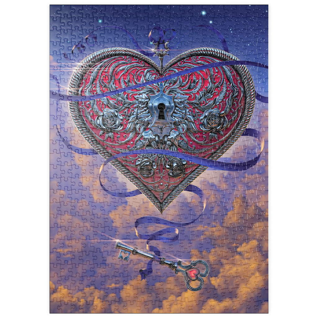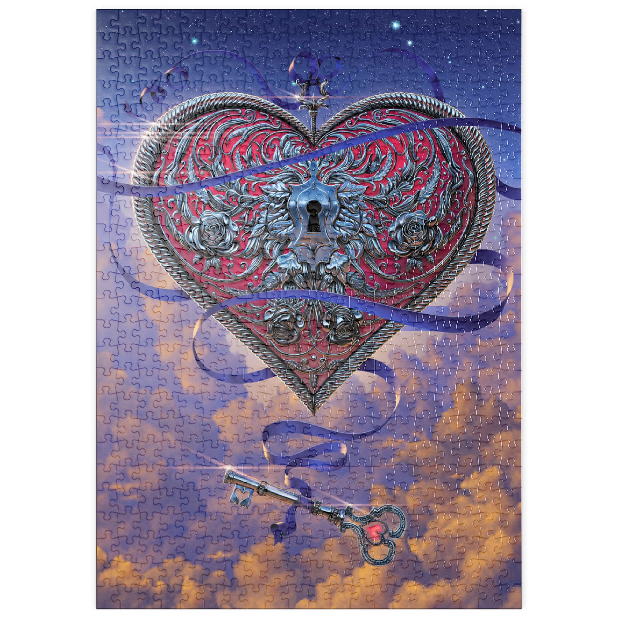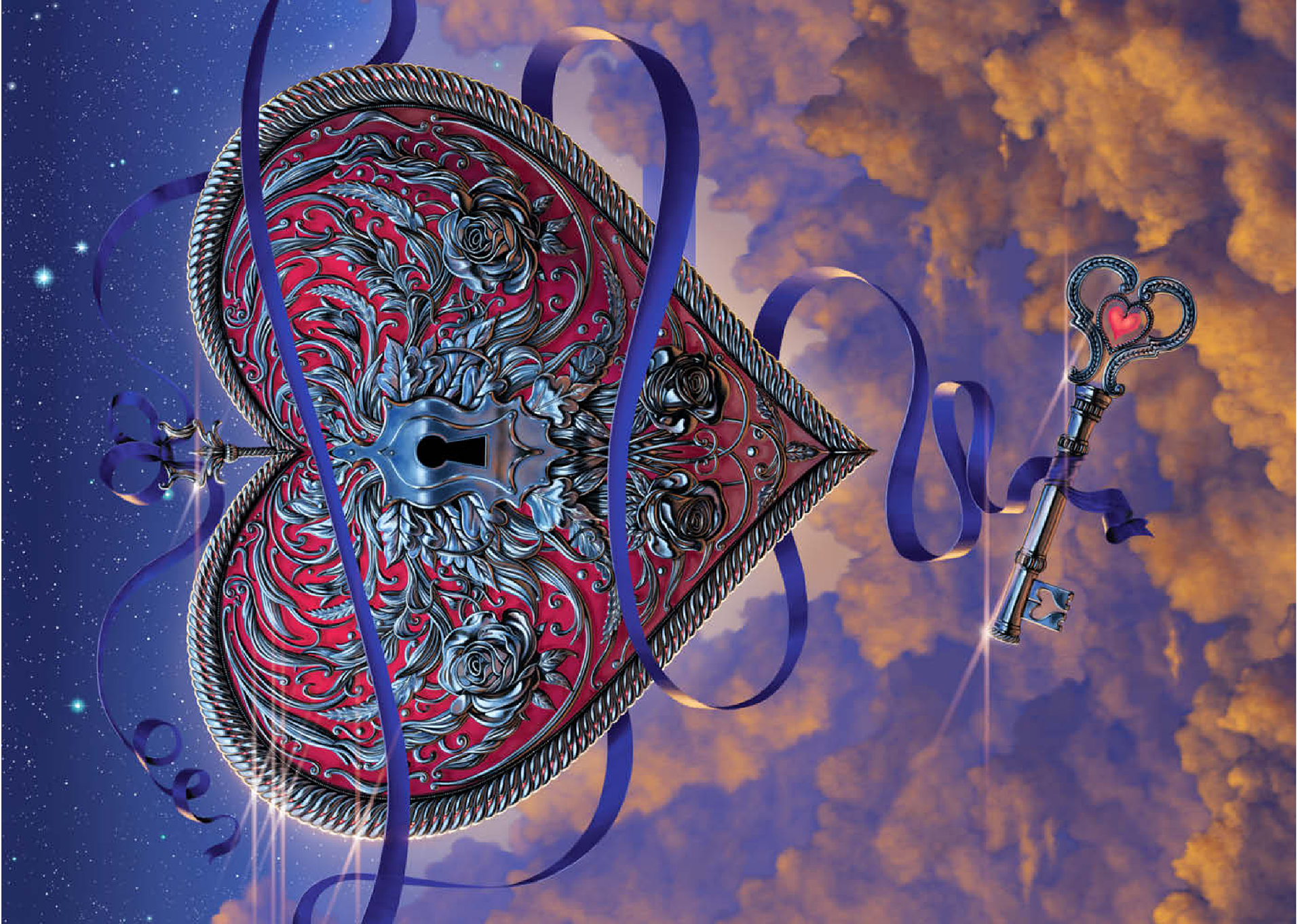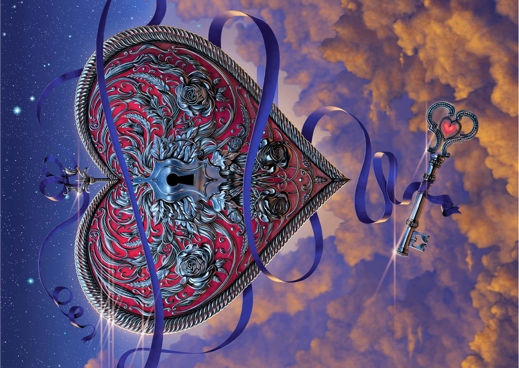 Das Kunstwerk zeigt ein kunstvolles, herzförmiges Medaillon in metallischem Silber und Rot, das inmitten eines wolkenverhangenen Abendhimmels schwebt. Ein großer, ebenfalls aufwendig gestalteter Schlüssel ist durch ein fließendes violettes Band mit dem Medaillon verbunden. Der Stil ist sehr dekorativ und fantastisch und erinnert an eine romantische oder magische Kulisse.
