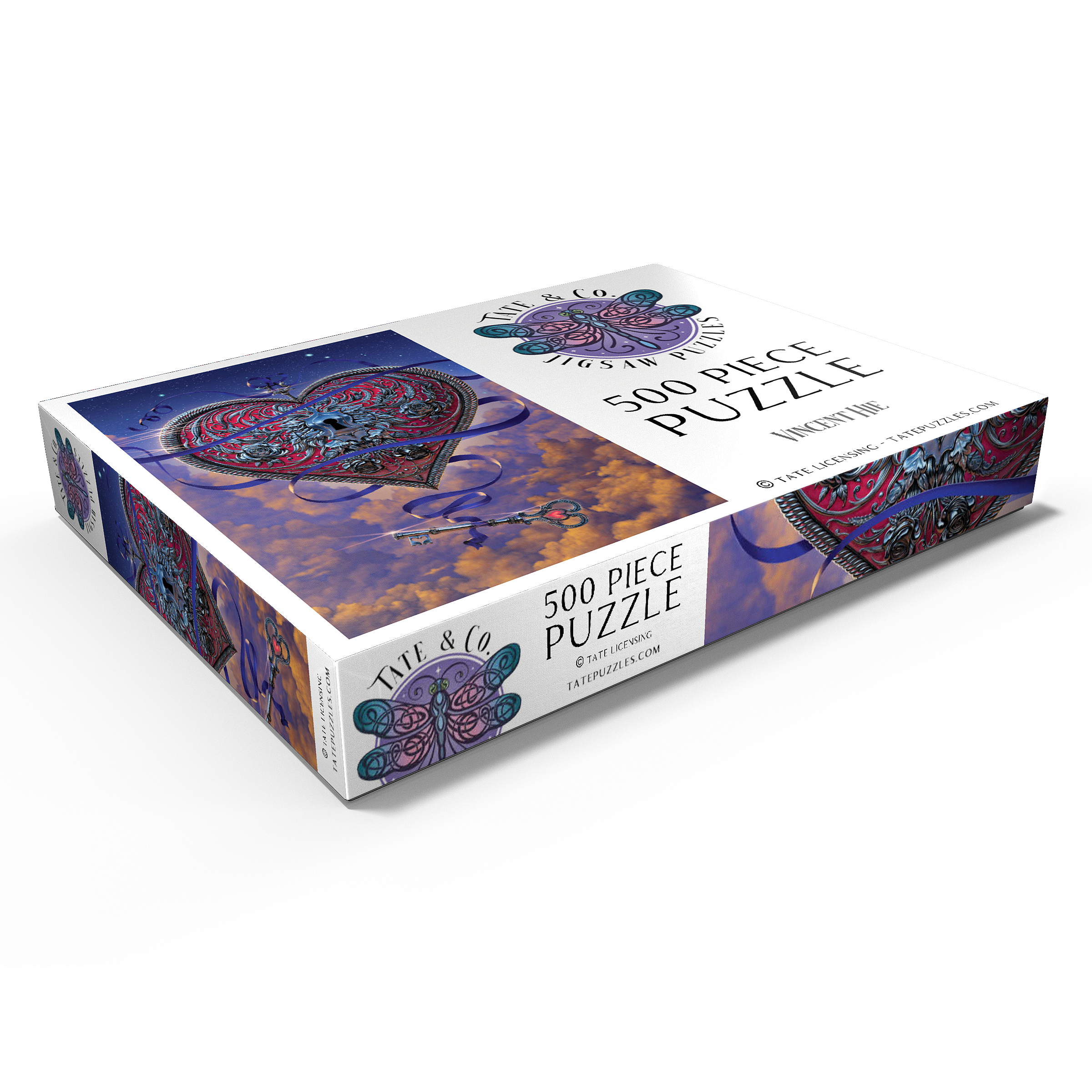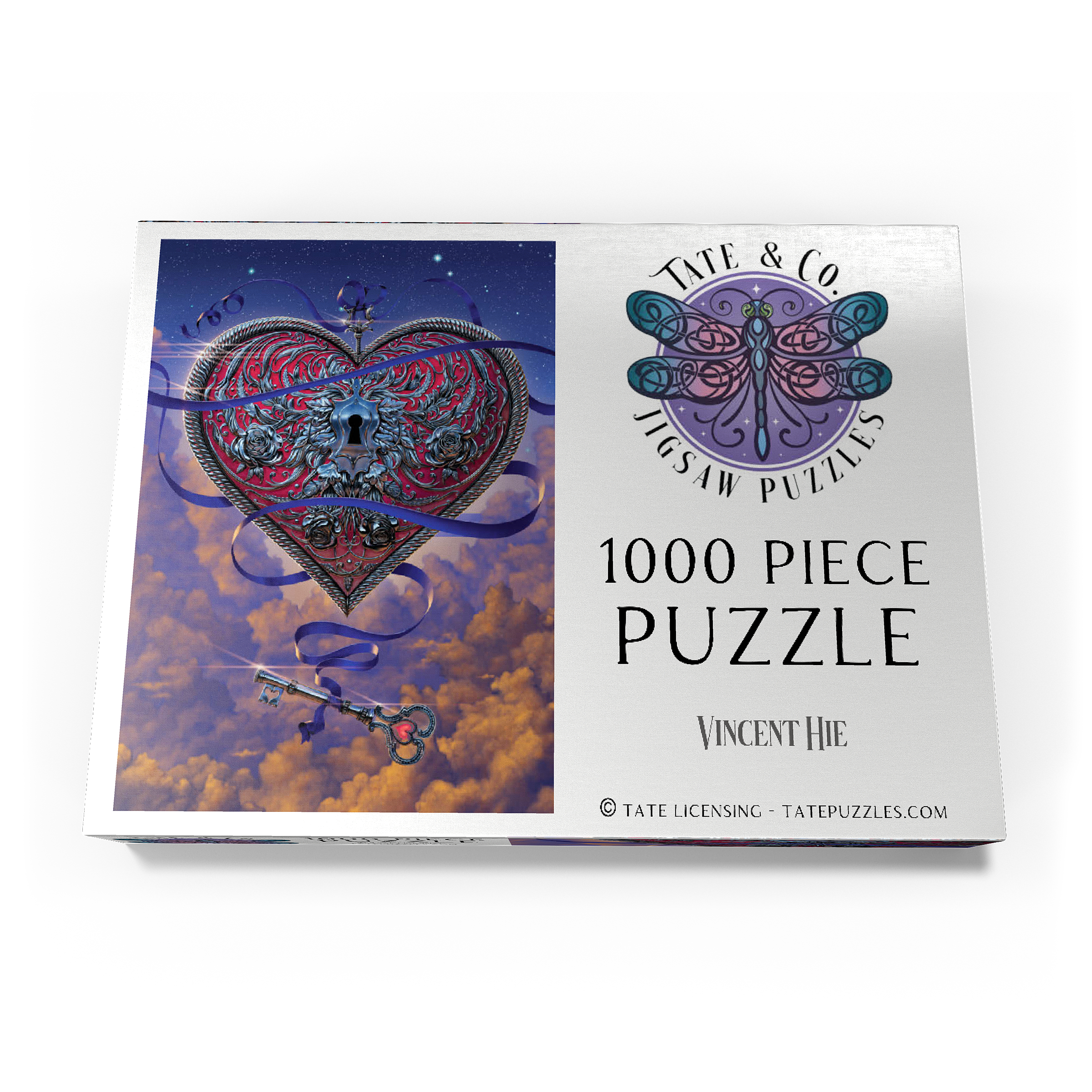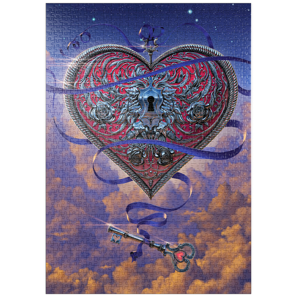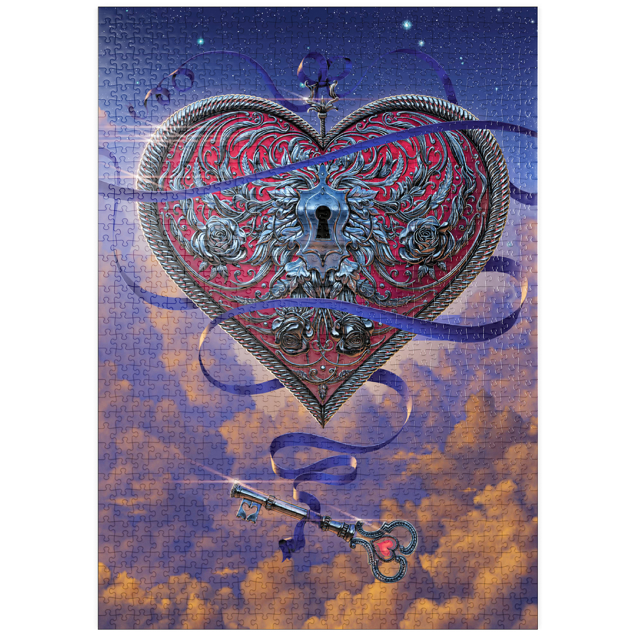 Das Kunstwerk zeigt ein kunstvolles, herzförmiges Medaillon in metallischem Silber und Rot, das inmitten eines wolkenverhangenen Abendhimmels schwebt. Ein großer, ebenfalls aufwendig gestalteter Schlüssel ist durch ein fließendes violettes Band mit dem Medaillon verbunden. Der Stil ist sehr dekorativ und fantastisch und erinnert an eine romantische oder magische Kulisse.