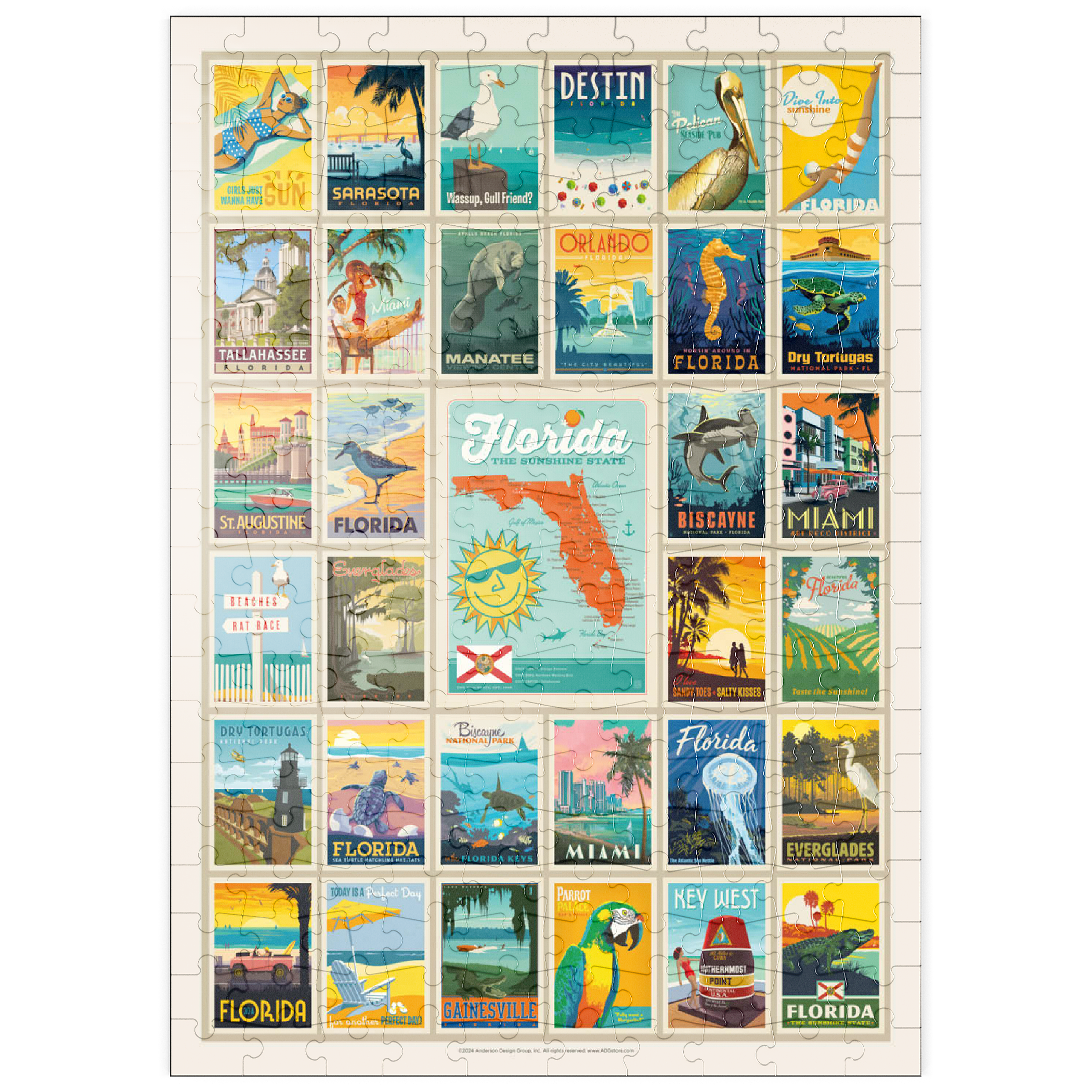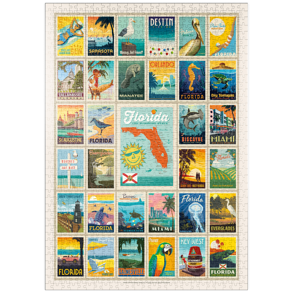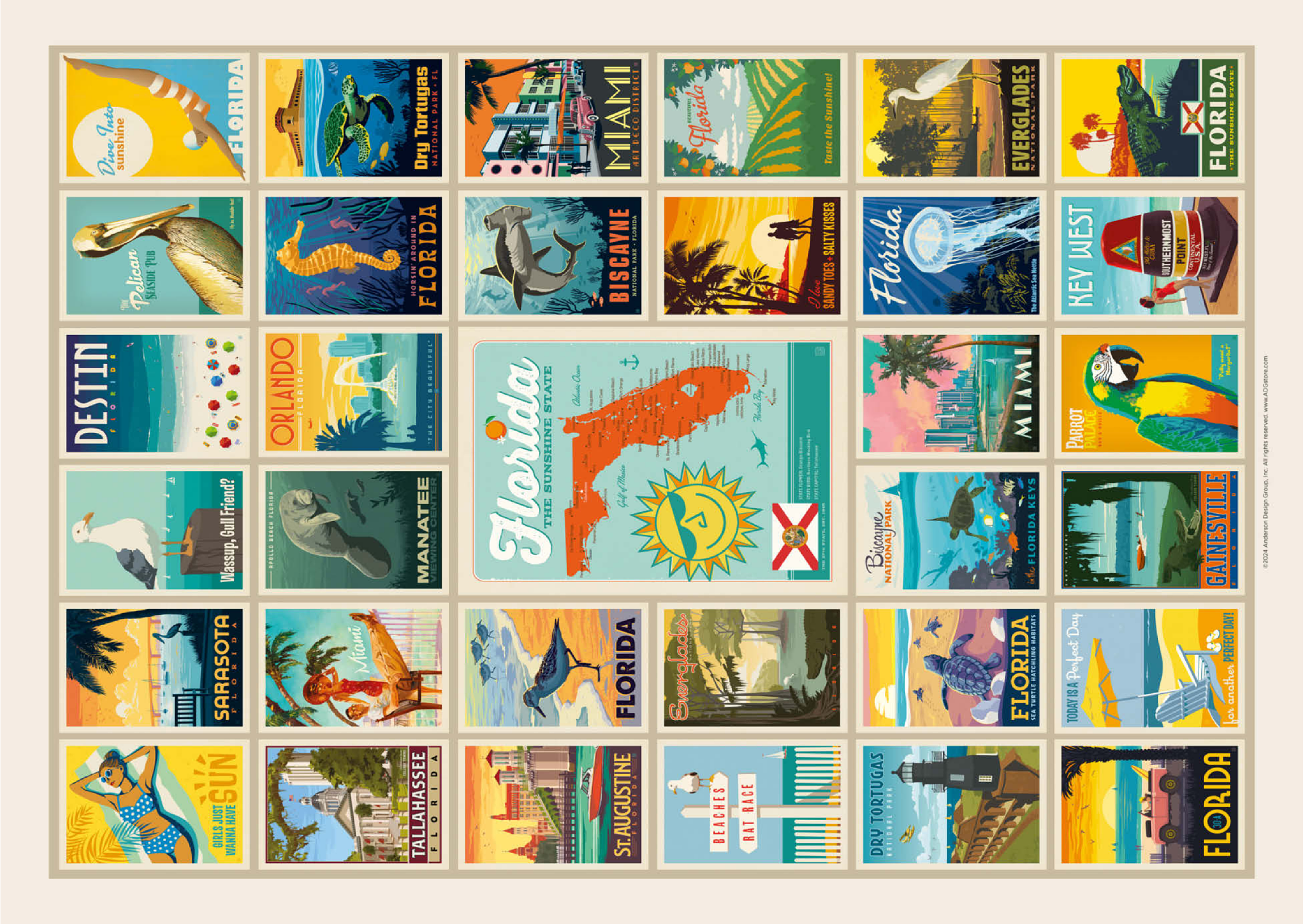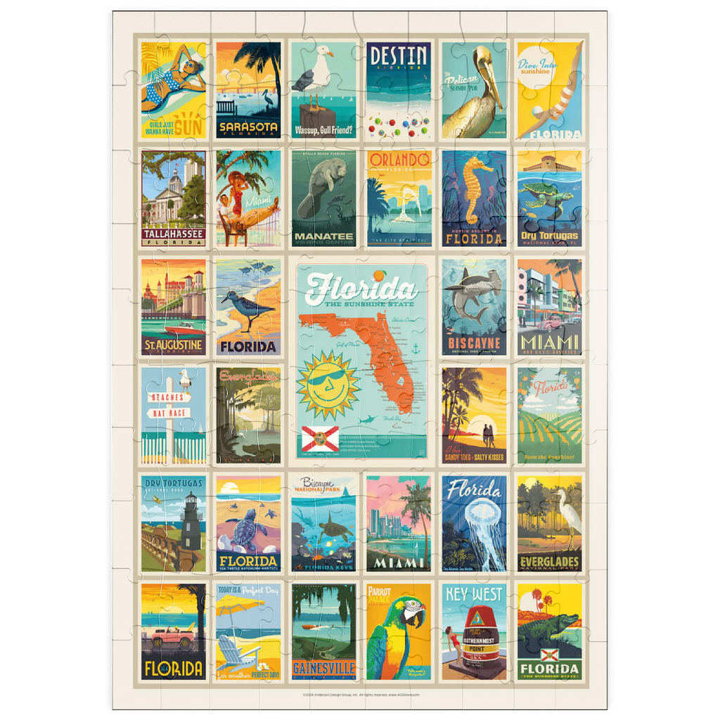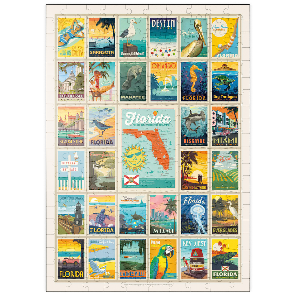 Dieser Multi-Image-Druck feiert die lebendigen und vielfältigen Landschaften Floridas und zeigt eine Sammlung von Vintage-Postern aus verschiedenen ikonischen Orten im ganzen Bundesstaat. Von den Stränden von Destin und den historischen Straßen von St. Augustine bis zur tropischen Schönheit Miamis und den ruhigen Gewässern der Everglades – jedes Bild präsentiert einen einzigartigen Teil des Sunshine State. Die kräftigen Farben und detaillierten Illustrationen fangen das Wesen der Küstenstädte, Naturparks und des sonnigen Lebensstils Floridas ein und machen es zu einer perfekten Hommage an die reichen Attraktionen des Staates.