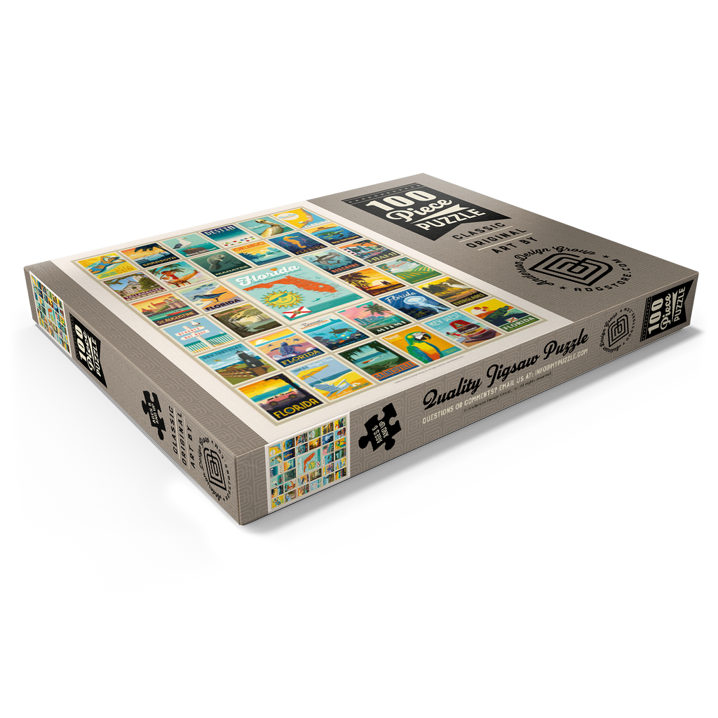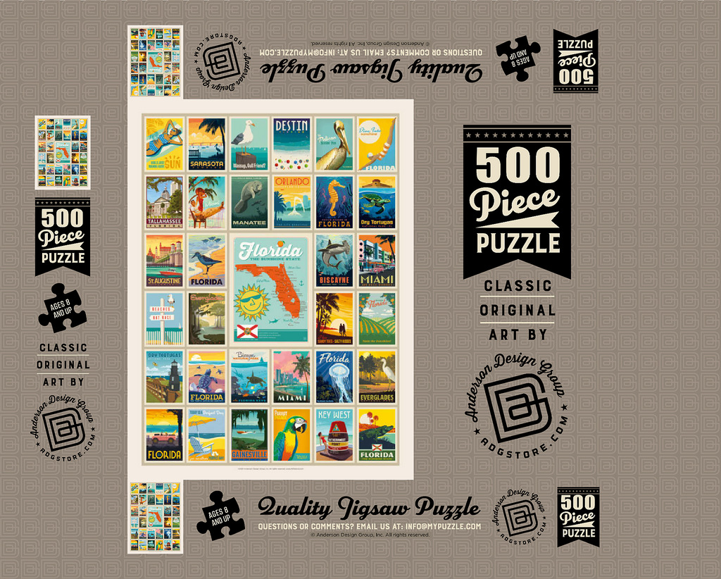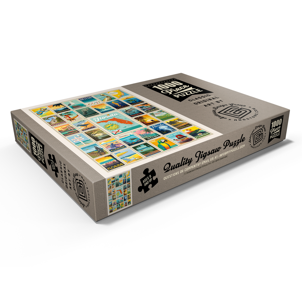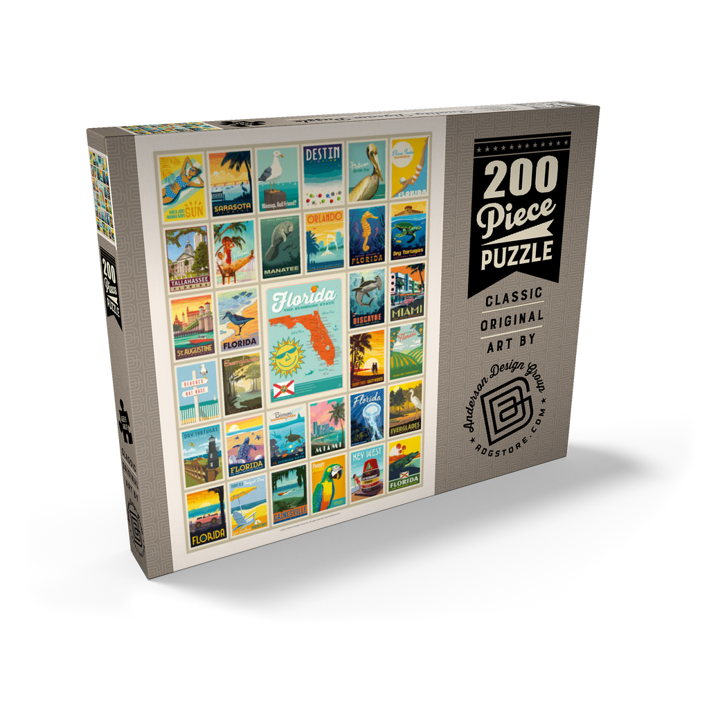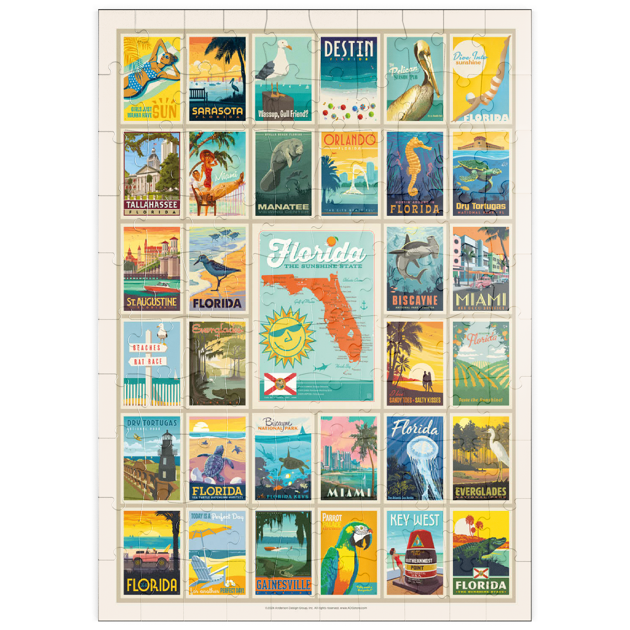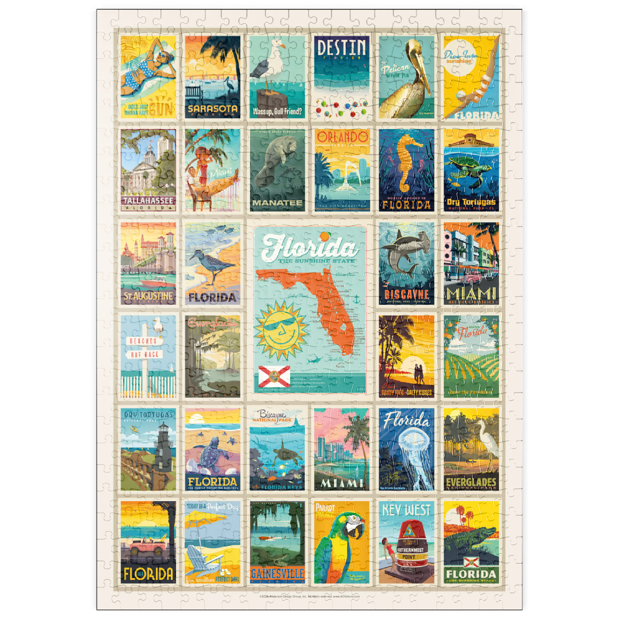 Dieser Multi-Image-Druck feiert die lebendigen und vielfältigen Landschaften Floridas und zeigt eine Sammlung von Vintage-Postern aus verschiedenen ikonischen Orten im ganzen Bundesstaat. Von den Stränden von Destin und den historischen Straßen von St. Augustine bis zur tropischen Schönheit Miamis und den ruhigen Gewässern der Everglades – jedes Bild präsentiert einen einzigartigen Teil des Sunshine State. Die kräftigen Farben und detaillierten Illustrationen fangen das Wesen der Küstenstädte, Naturparks und des sonnigen Lebensstils Floridas ein und machen es zu einer perfekten Hommage an die reichen Attraktionen des Staates.