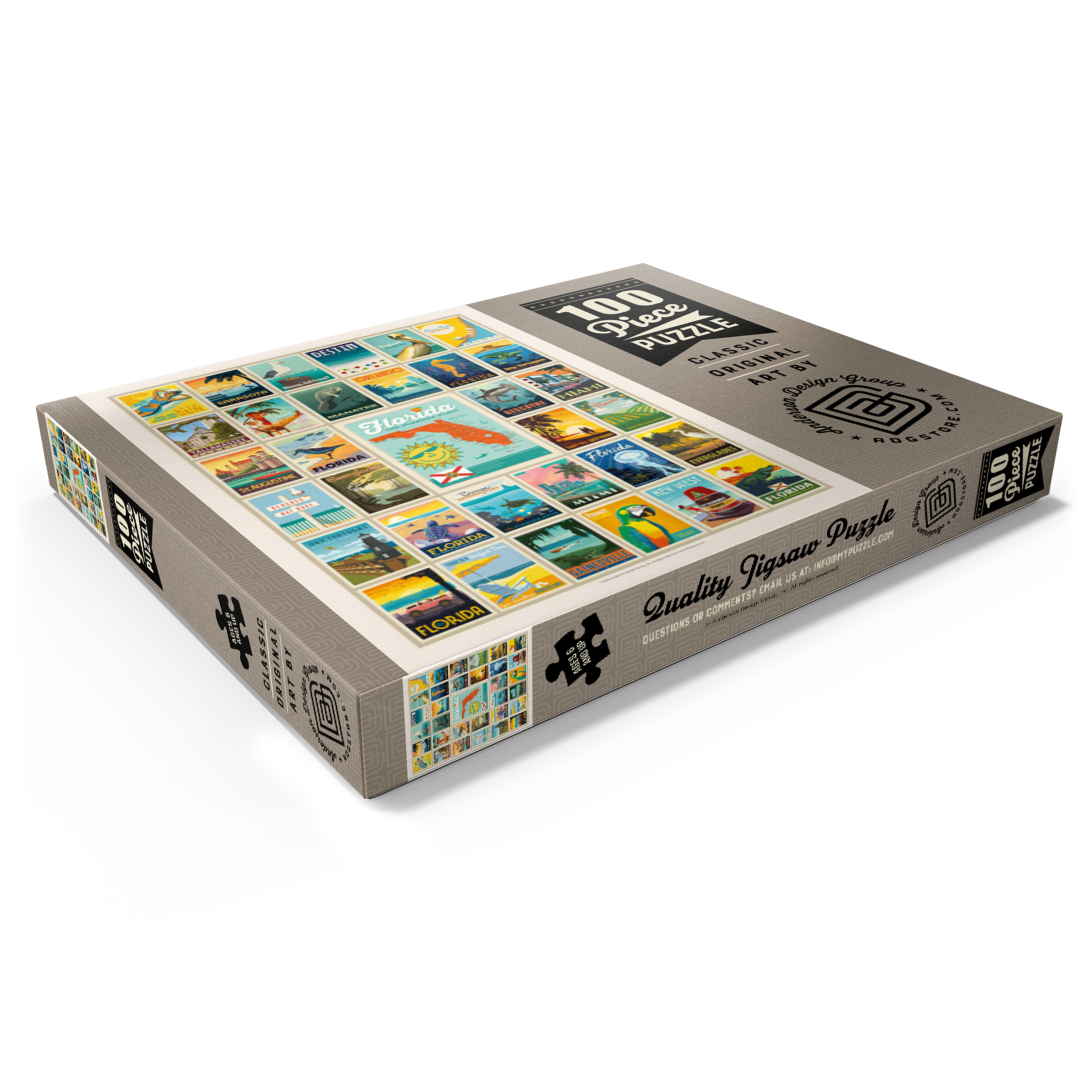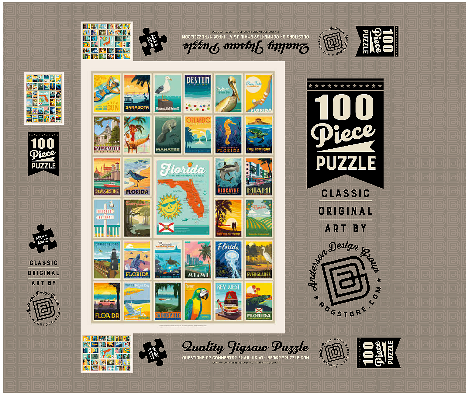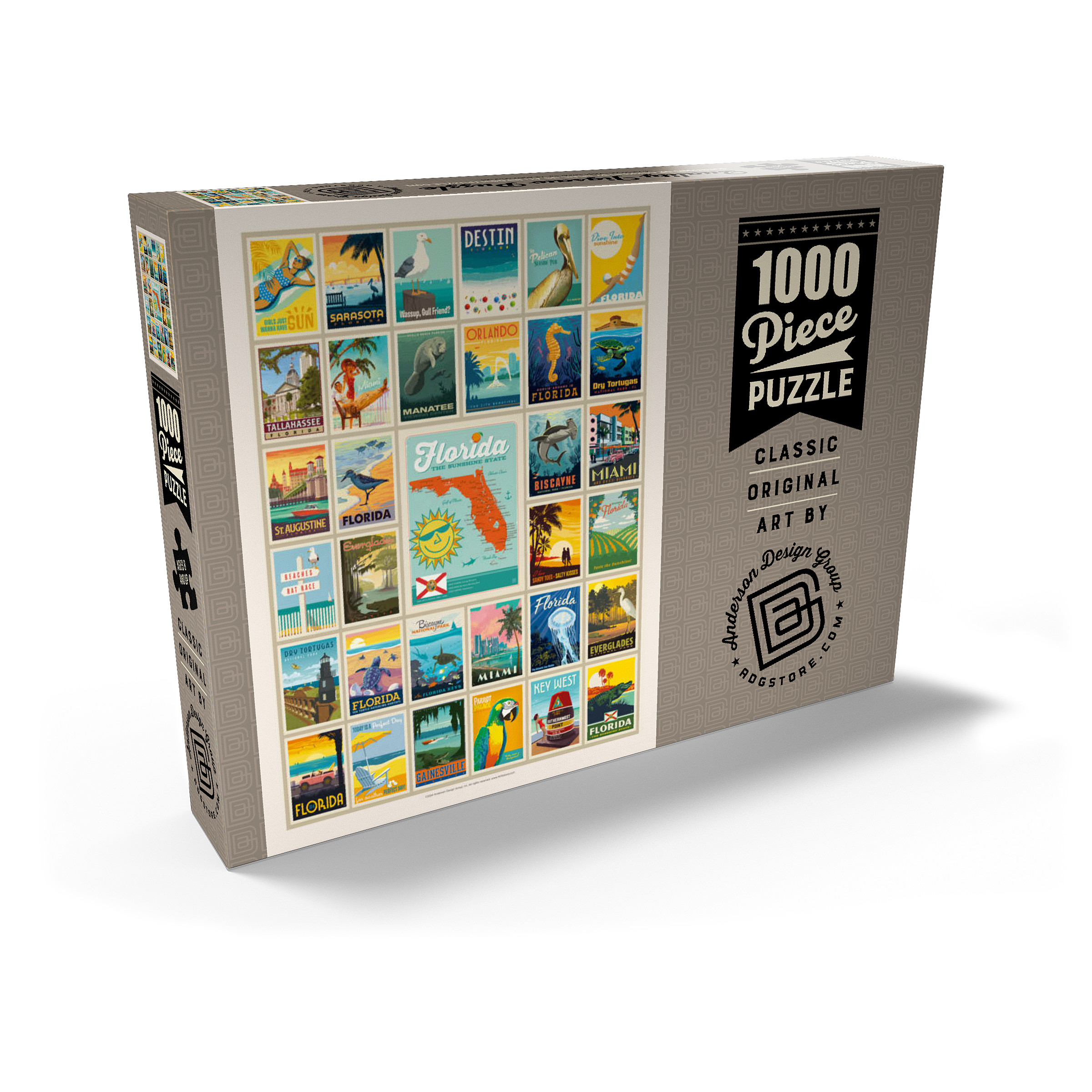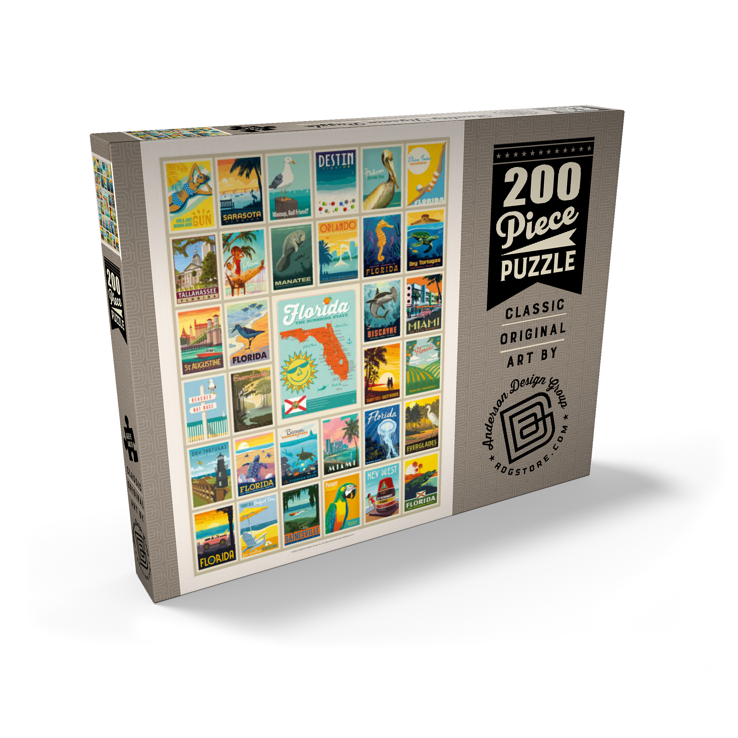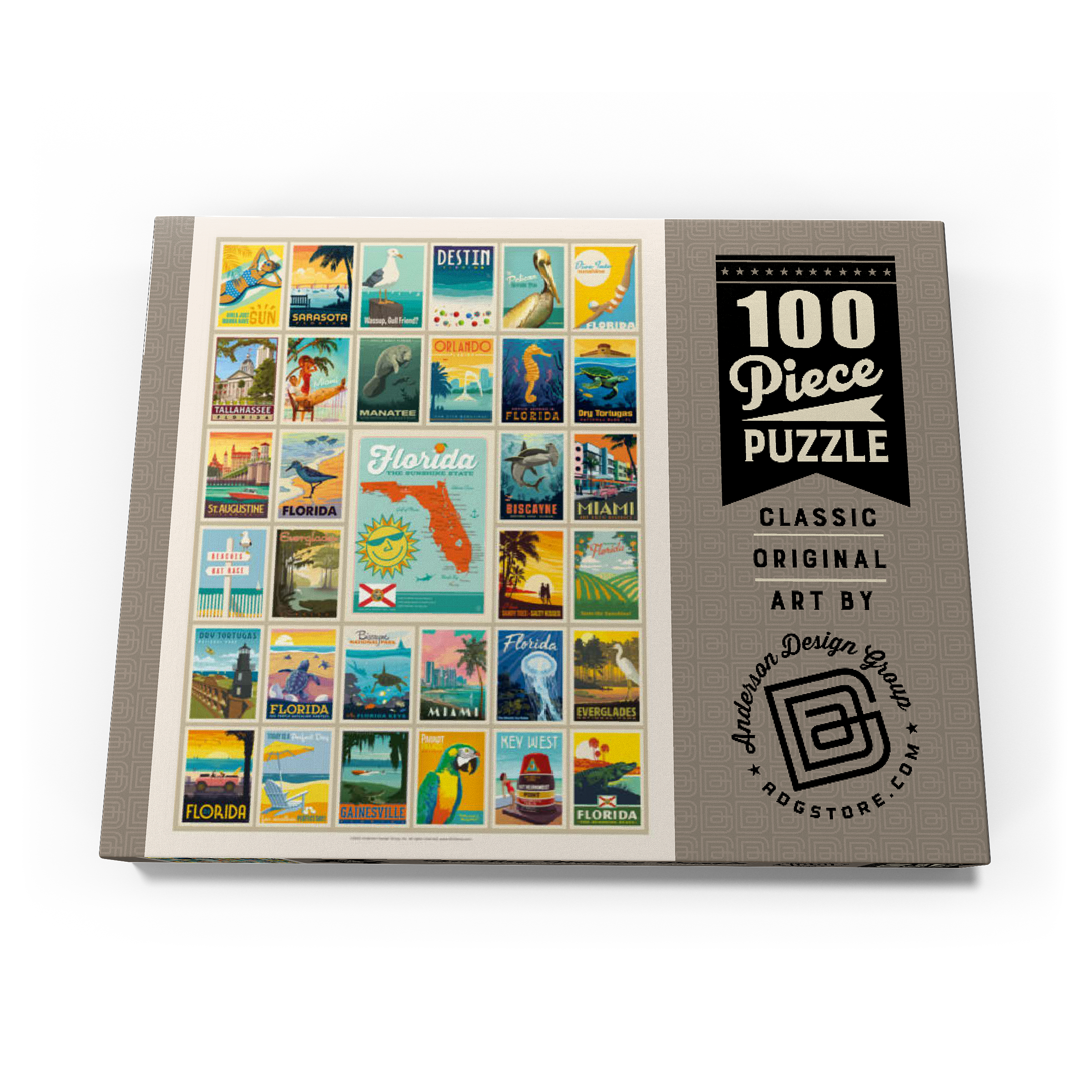 Dieser Multi-Image-Druck feiert die lebendigen und vielfältigen Landschaften Floridas und zeigt eine Sammlung von Vintage-Postern aus verschiedenen ikonischen Orten im ganzen Bundesstaat. Von den Stränden von Destin und den historischen Straßen von St. Augustine bis zur tropischen Schönheit Miamis und den ruhigen Gewässern der Everglades – jedes Bild präsentiert einen einzigartigen Teil des Sunshine State. Die kräftigen Farben und detaillierten Illustrationen fangen das Wesen der Küstenstädte, Naturparks und des sonnigen Lebensstils Floridas ein und machen es zu einer perfekten Hommage an die reichen Attraktionen des Staates.