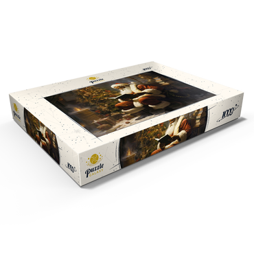 Eine heitere und festliche Szene mit dem Weihnachtsmann, der gemütlich an einem schön geschmückten Weihnachtsbaum sitzt und in ein Buch vertieft ist. Der warme Schein von goldenen Ornamenten und funkelnden Lichtern verstärkt die gemütliche Atmosphäre, während ordentlich verpackte Geschenke und Feiertagsdekoration den Raum umgeben. Das Knistern eines kleinen Feuers trägt zur Atmosphäre bei und verkörpert den friedlichen und besinnlichen Geist der Weihnachtszeit.