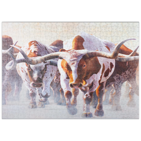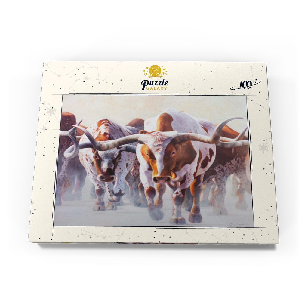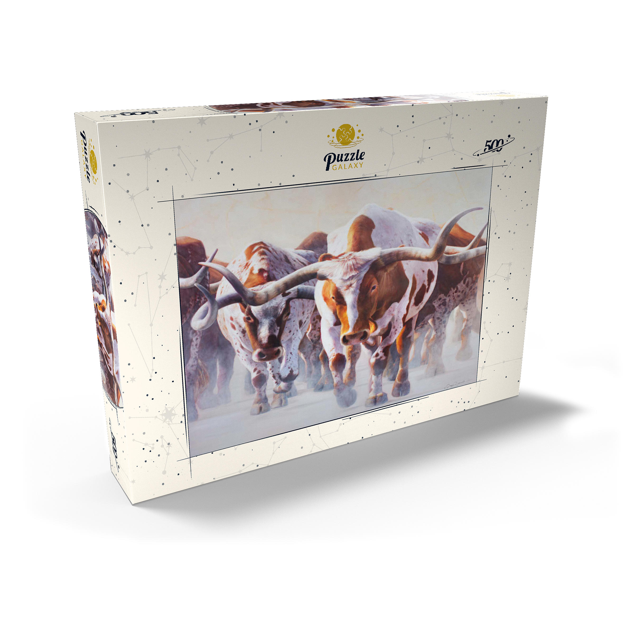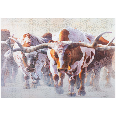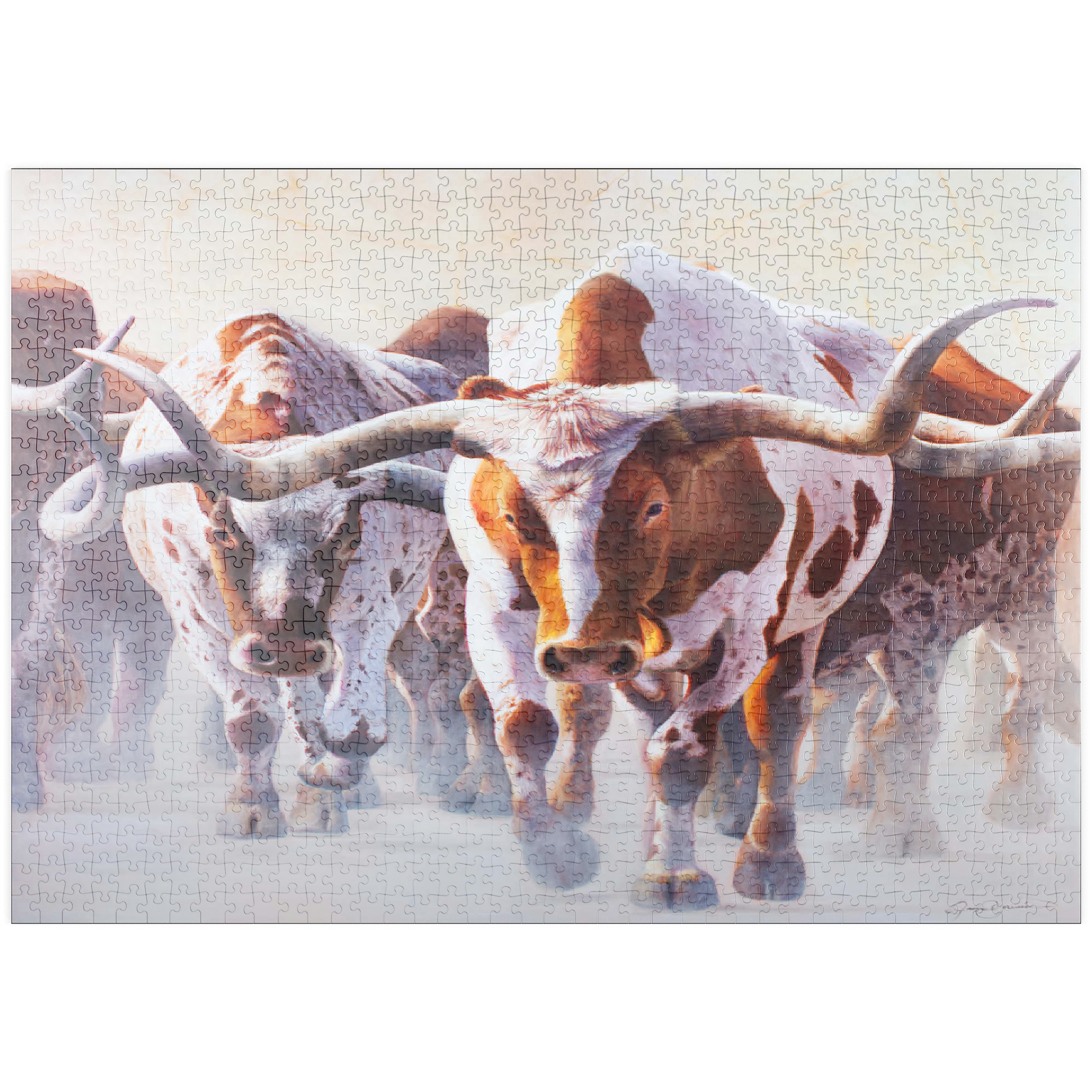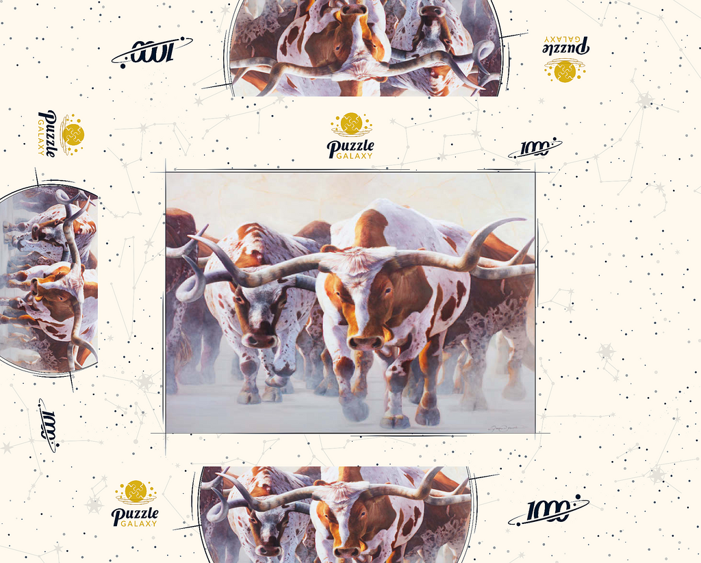 Dieses eindrucksvolle Bild zeigt eine Herde majestätischer Texas Longhorn-Rinder, deren beeindruckende Hörner und geflecktes Fell in dynamischen Details hervorgehoben werden. Die zentrale Figur führt die Herde durch eine staubige Atmosphäre, die den rauen Geist des amerikanischen Westens heraufbeschwört, mit ihrer beeindruckenden Präsenz und ihren lebhaften Markierungen. Die weiche Beleuchtung und die erdigen Töne unterstreichen die Stärke und Schönheit dieser ikonischen Rinder.