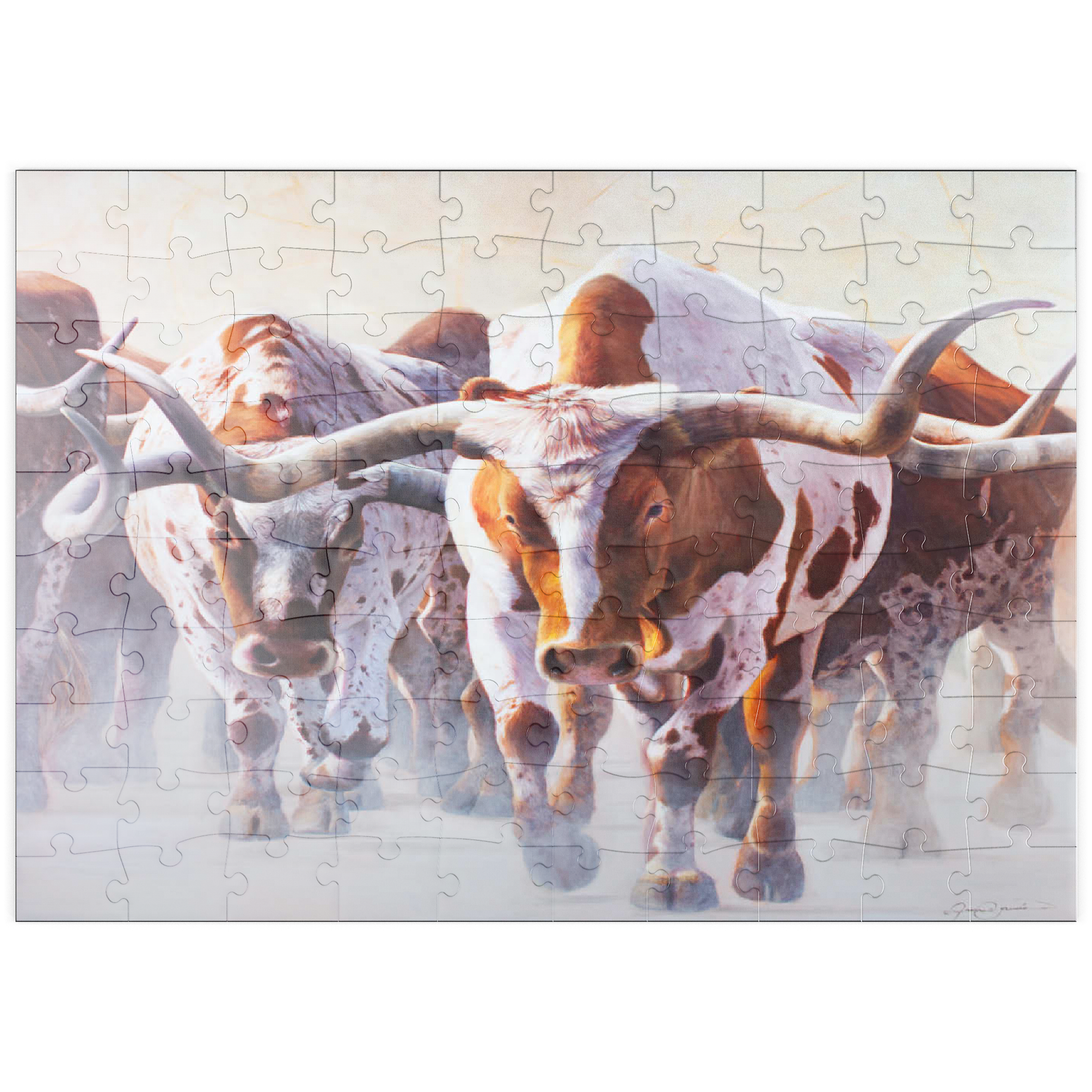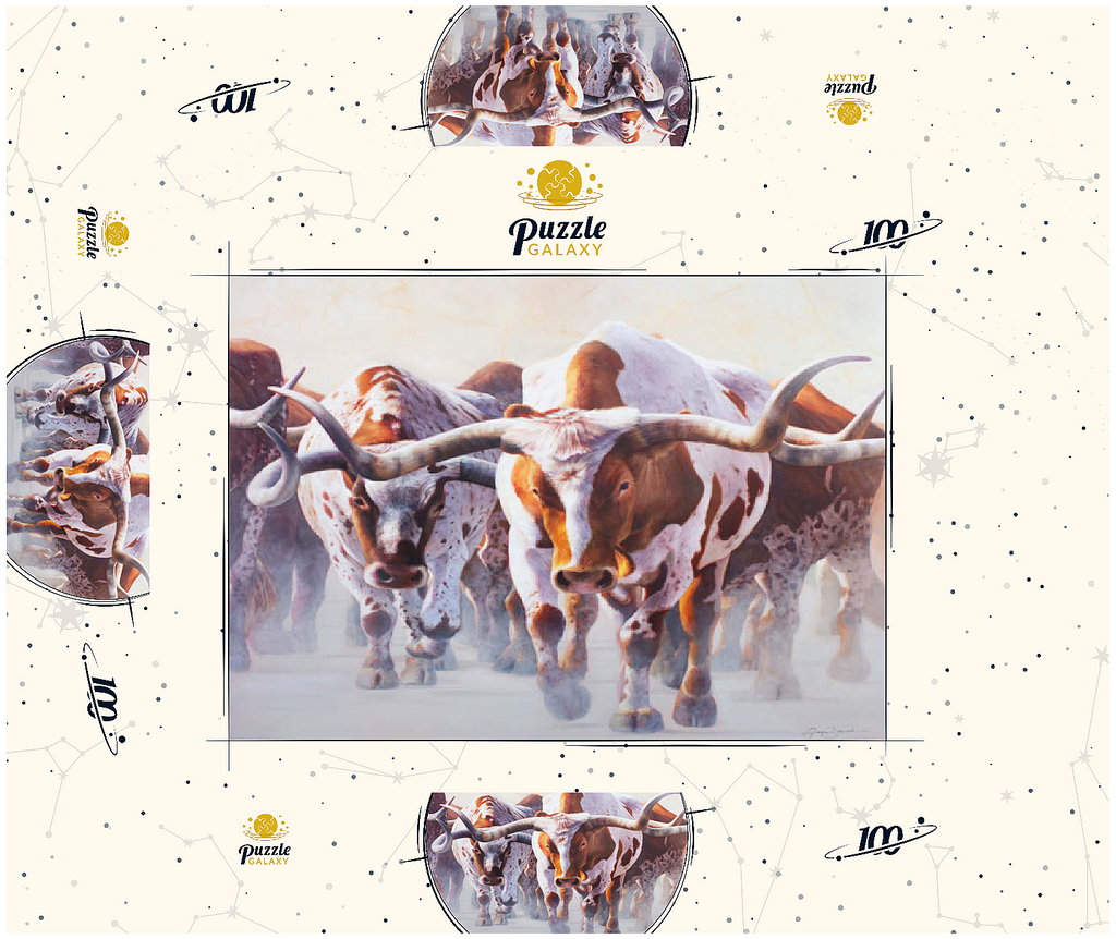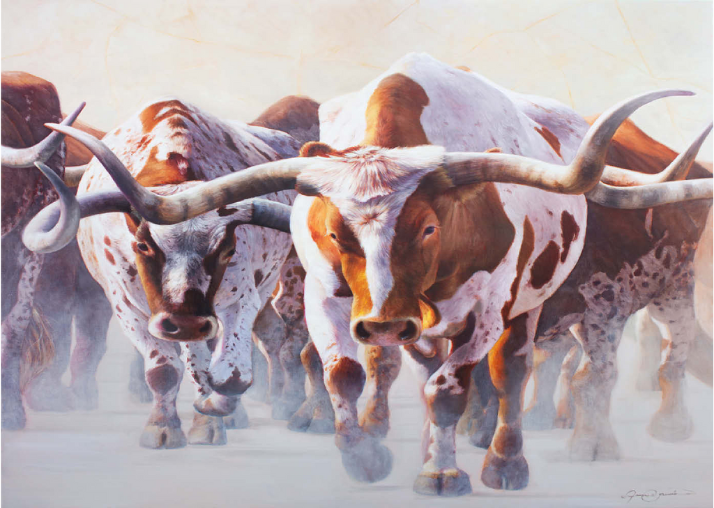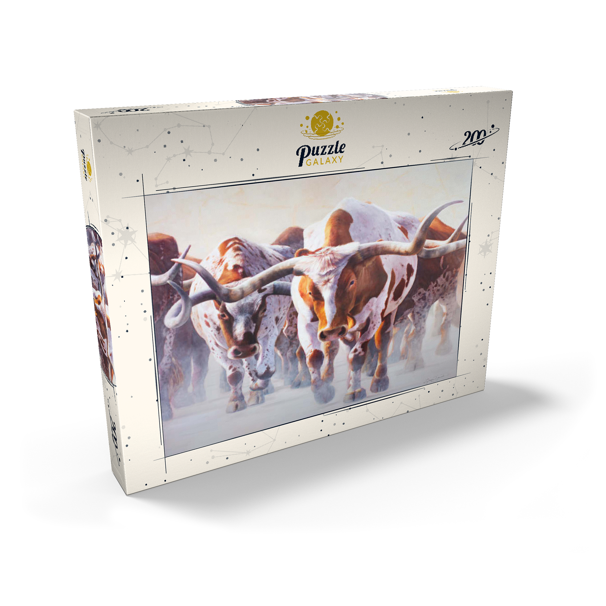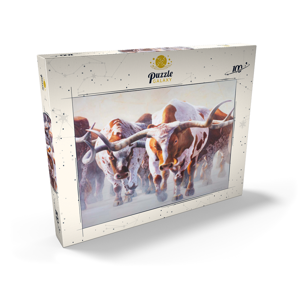 Dieses eindrucksvolle Bild zeigt eine Herde majestätischer Texas Longhorn-Rinder, deren beeindruckende Hörner und geflecktes Fell in dynamischen Details hervorgehoben werden. Die zentrale Figur führt die Herde durch eine staubige Atmosphäre, die den rauen Geist des amerikanischen Westens heraufbeschwört, mit ihrer beeindruckenden Präsenz und ihren lebhaften Markierungen. Die weiche Beleuchtung und die erdigen Töne unterstreichen die Stärke und Schönheit dieser ikonischen Rinder.