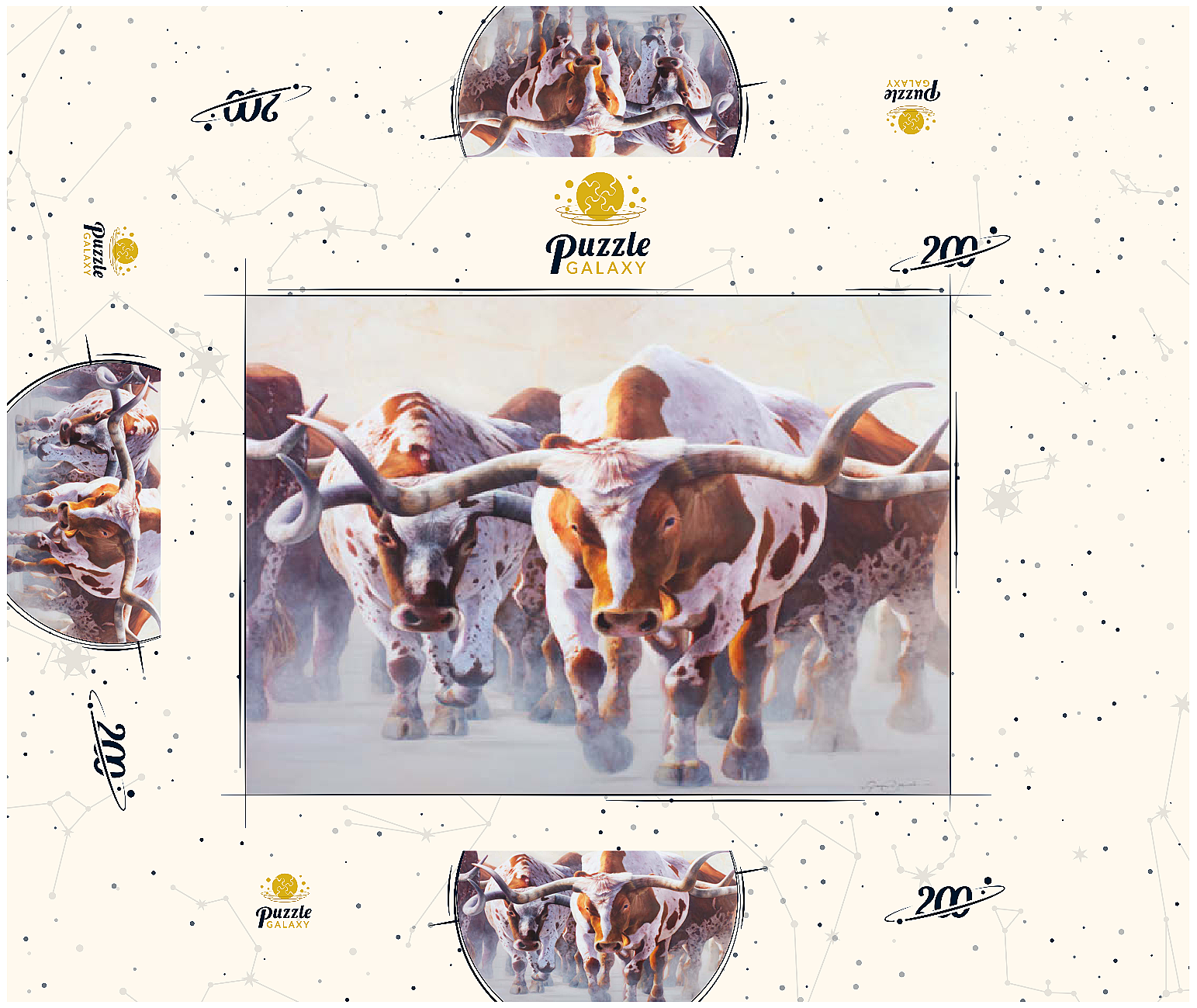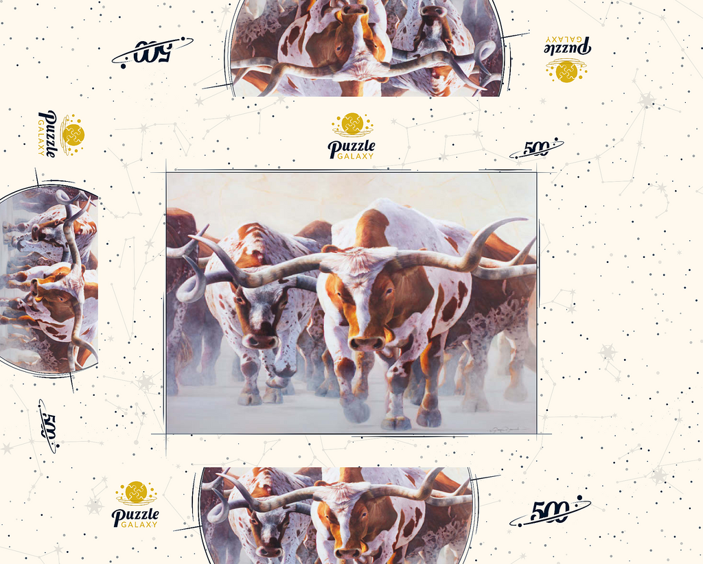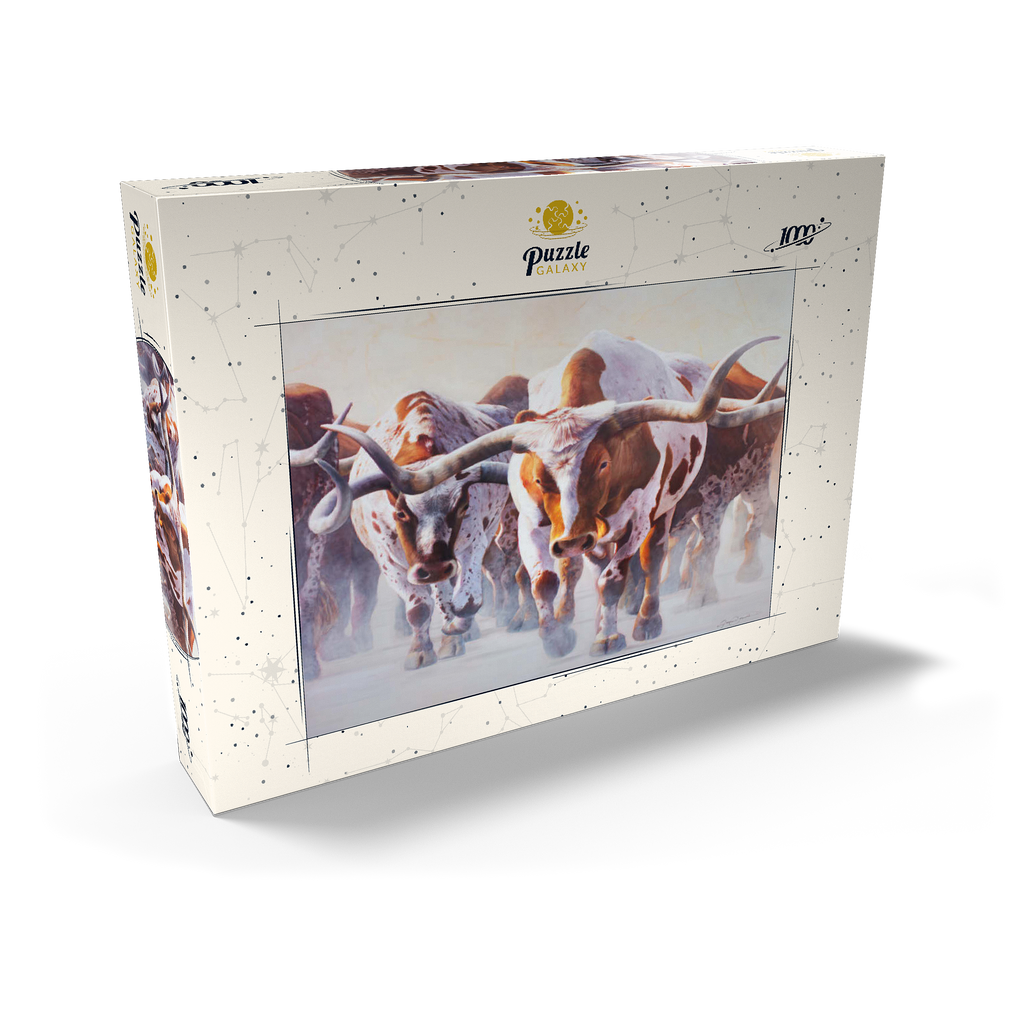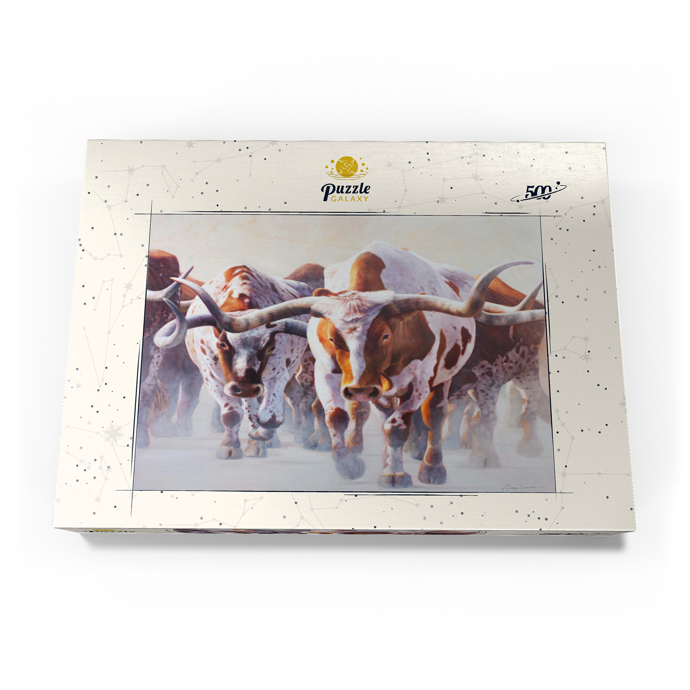 Dieses eindrucksvolle Bild zeigt eine Herde majestätischer Texas Longhorn-Rinder, deren beeindruckende Hörner und geflecktes Fell in dynamischen Details hervorgehoben werden. Die zentrale Figur führt die Herde durch eine staubige Atmosphäre, die den rauen Geist des amerikanischen Westens heraufbeschwört, mit ihrer beeindruckenden Präsenz und ihren lebhaften Markierungen. Die weiche Beleuchtung und die erdigen Töne unterstreichen die Stärke und Schönheit dieser ikonischen Rinder.