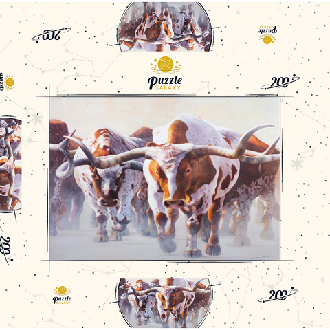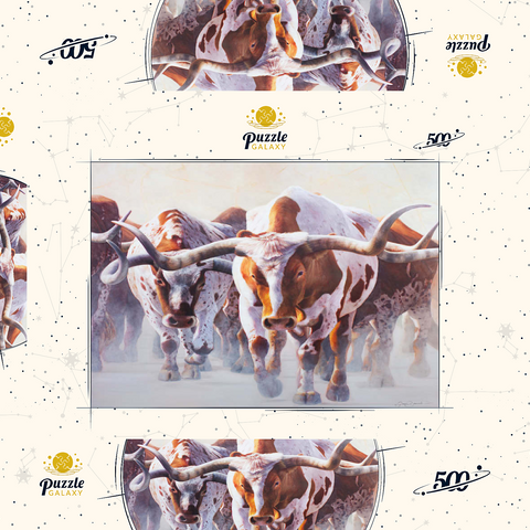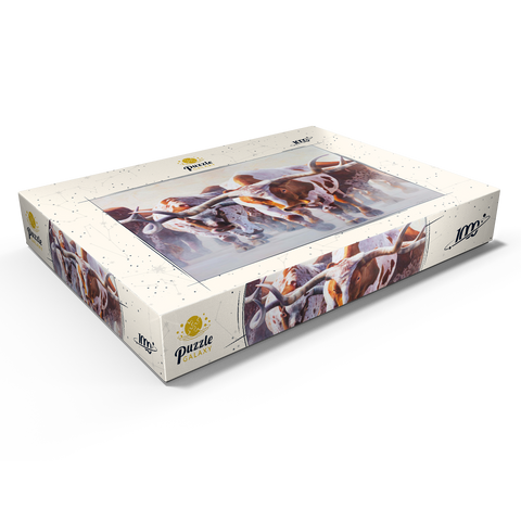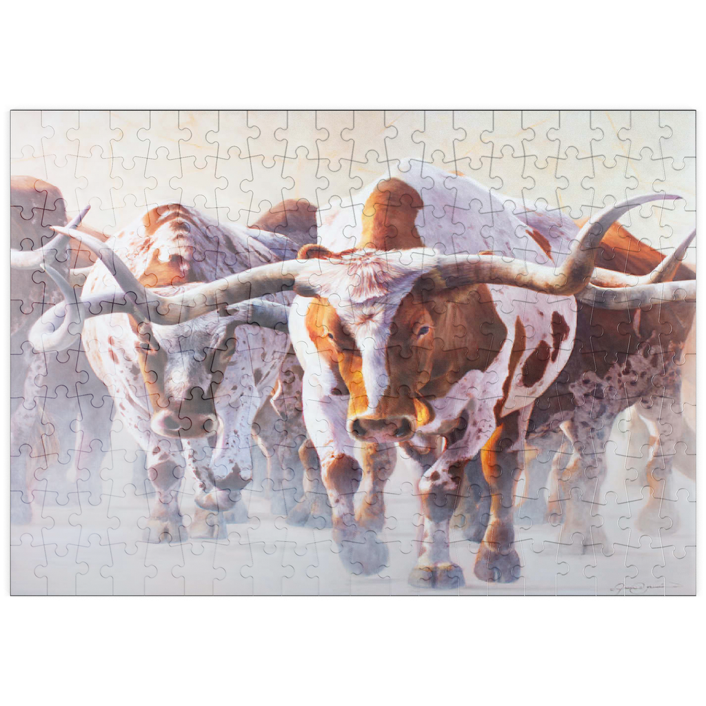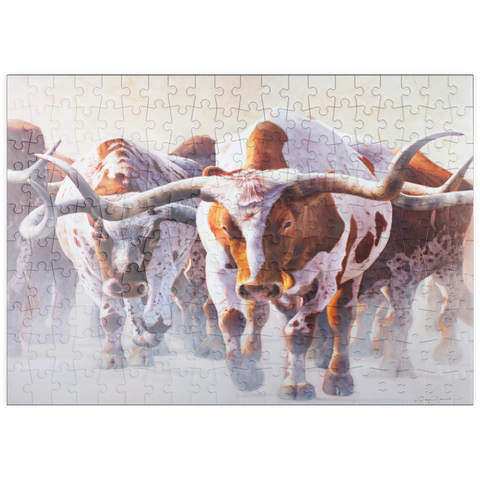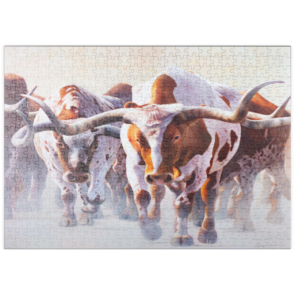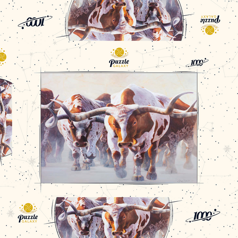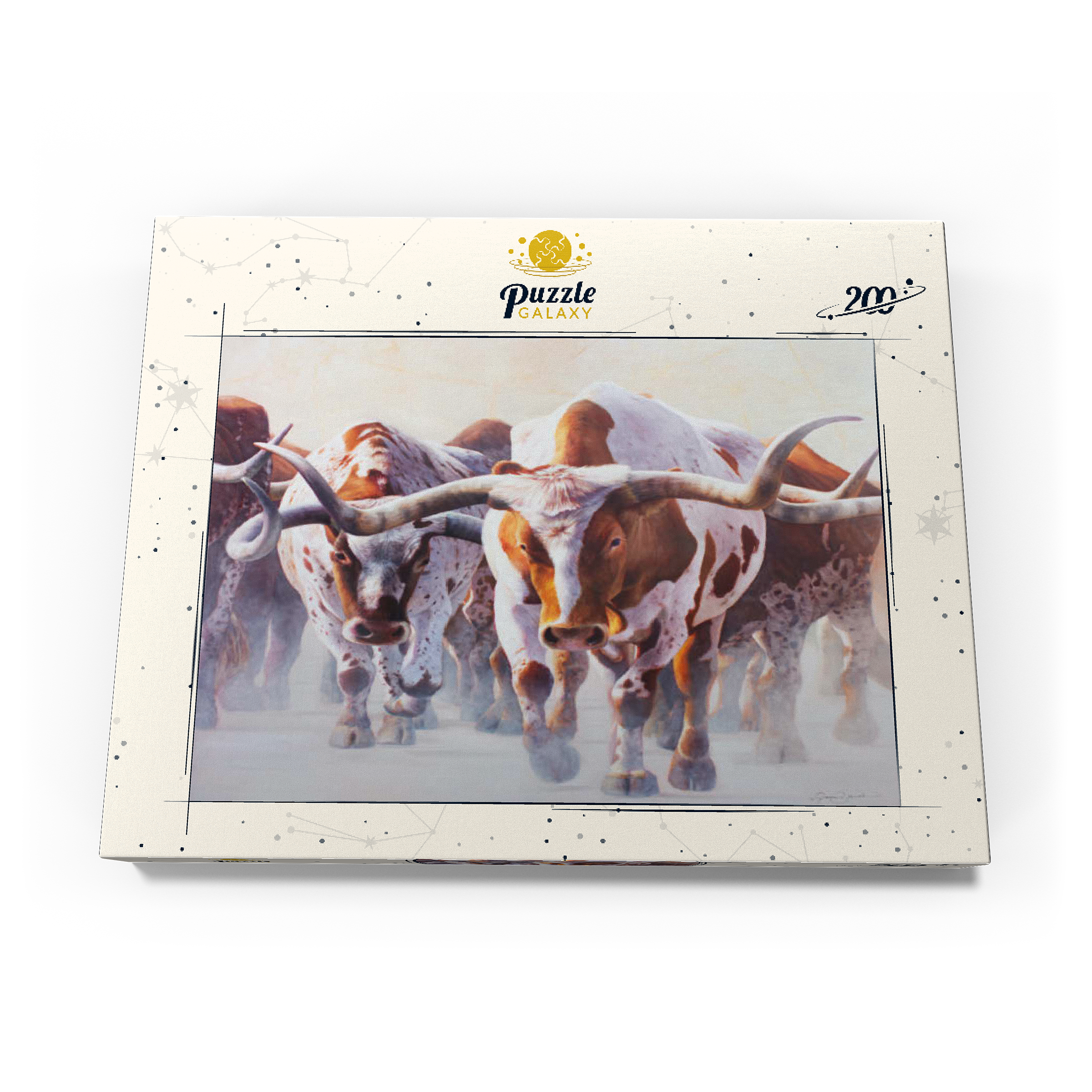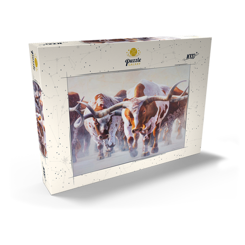 Dieses eindrucksvolle Bild zeigt eine Herde majestätischer Texas Longhorn-Rinder, deren beeindruckende Hörner und geflecktes Fell in dynamischen Details hervorgehoben werden. Die zentrale Figur führt die Herde durch eine staubige Atmosphäre, die den rauen Geist des amerikanischen Westens heraufbeschwört, mit ihrer beeindruckenden Präsenz und ihren lebhaften Markierungen. Die weiche Beleuchtung und die erdigen Töne unterstreichen die Stärke und Schönheit dieser ikonischen Rinder.