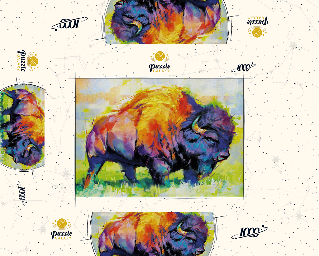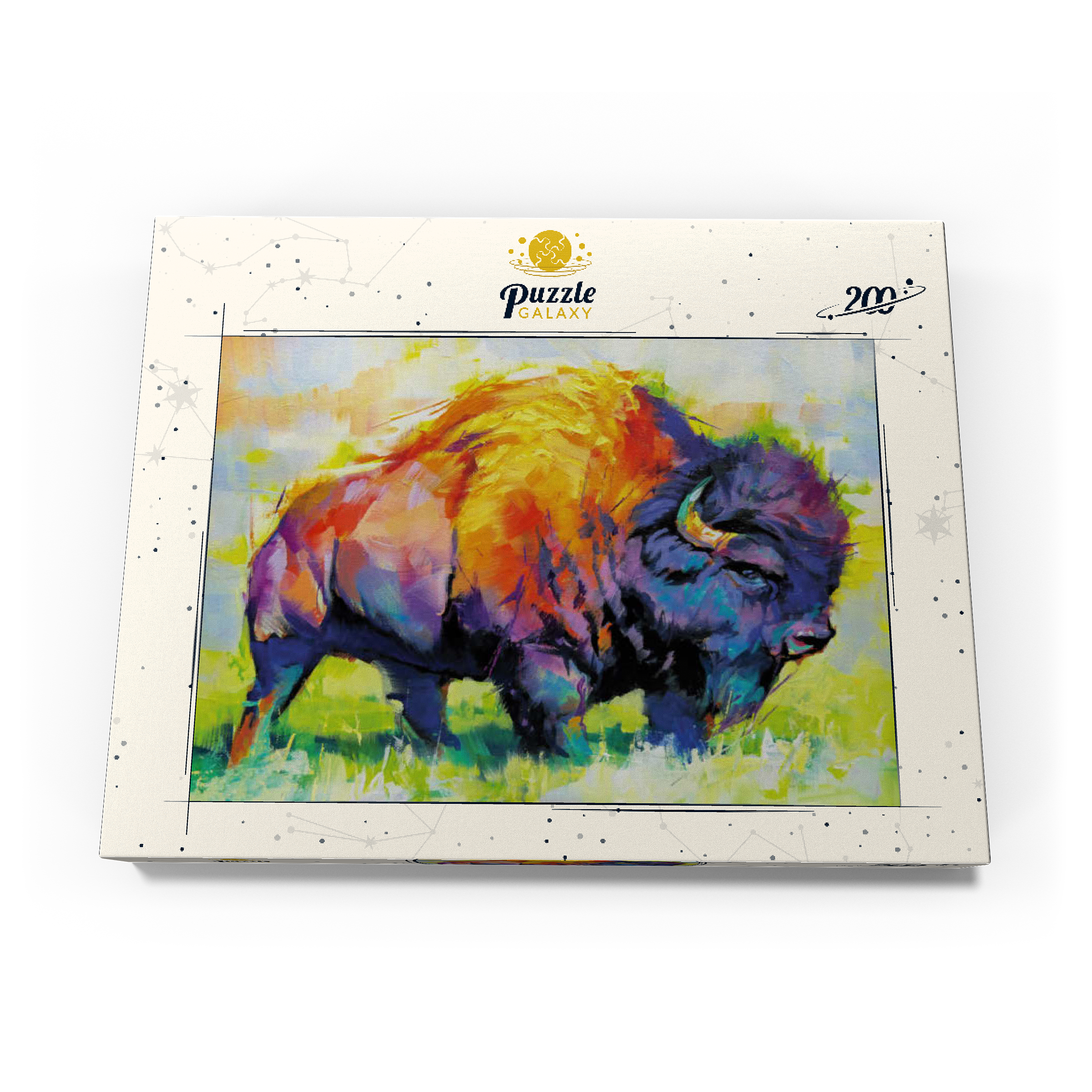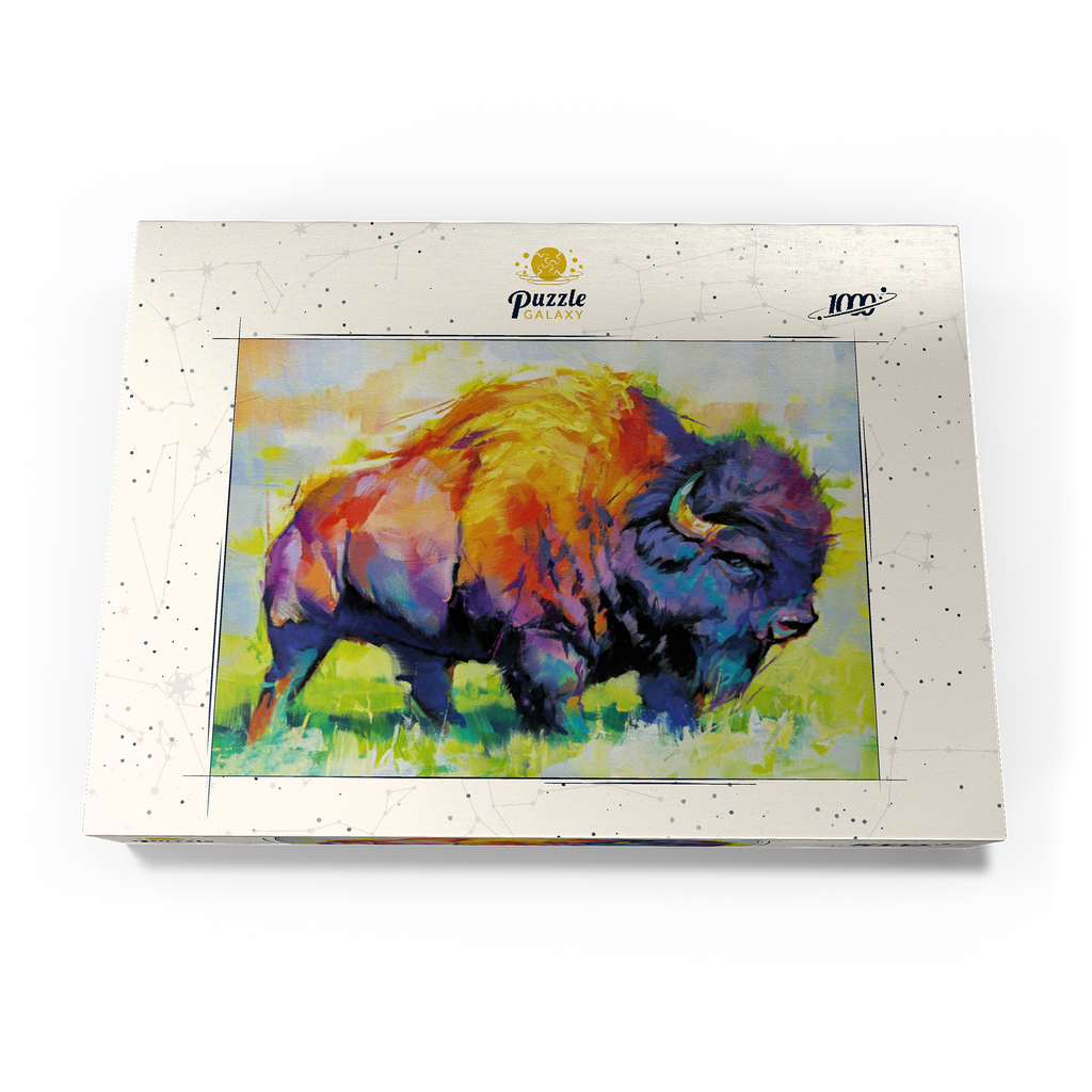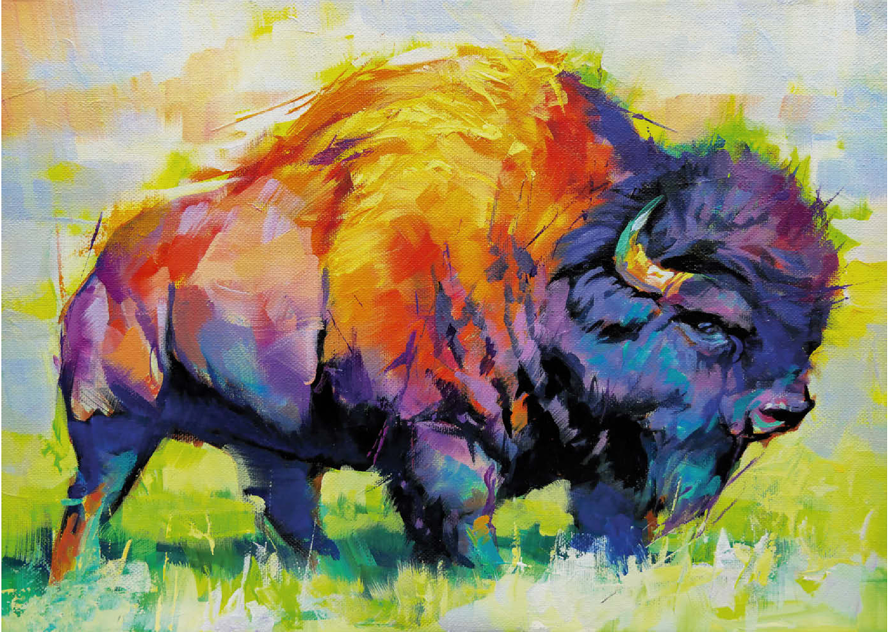 Dieses kühne und ausdrucksstarke Gemälde zeigt einen amerikanischen Bison, der durch eine lebendige Mischung aus abstrakten Farben und dynamischen Pinselstrichen dargestellt ist. Die kraftvolle Statur des Bisons wird durch leuchtende Orange-, Gelb-, Violett- und Blaugrüntöne betont, die einen energiegeladenen Kontrast zum sanften Grün und Blau des Hintergrunds bilden. Das Kunstwerk fängt den Geist und die Kraft dieses ikonischen nordamerikanischen Tieres ein und verleiht ihm gleichzeitig einen modernen künstlerischen Touch. Eine perfekte Wahl für Liebhaber von Wildtieren und zeitgenössischem Expressionismus.