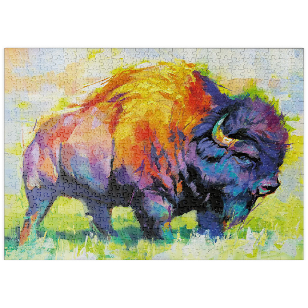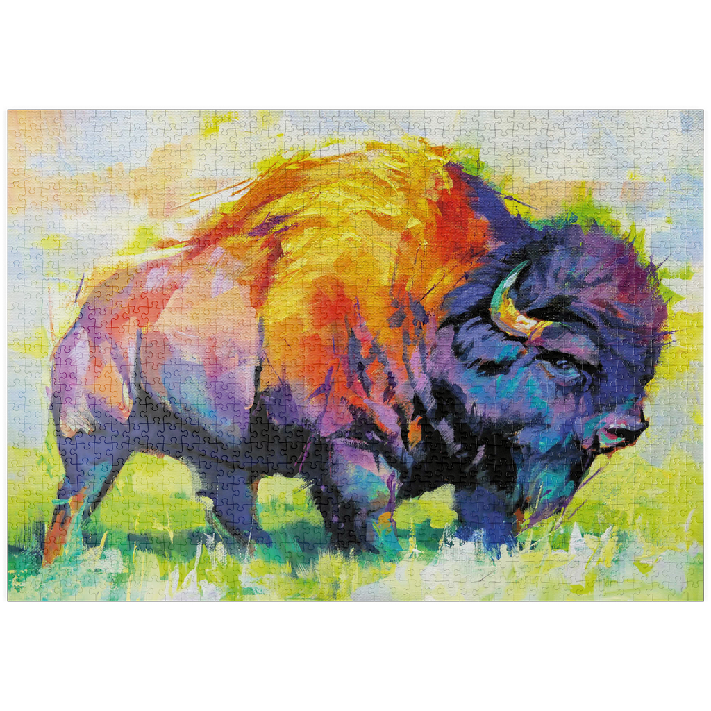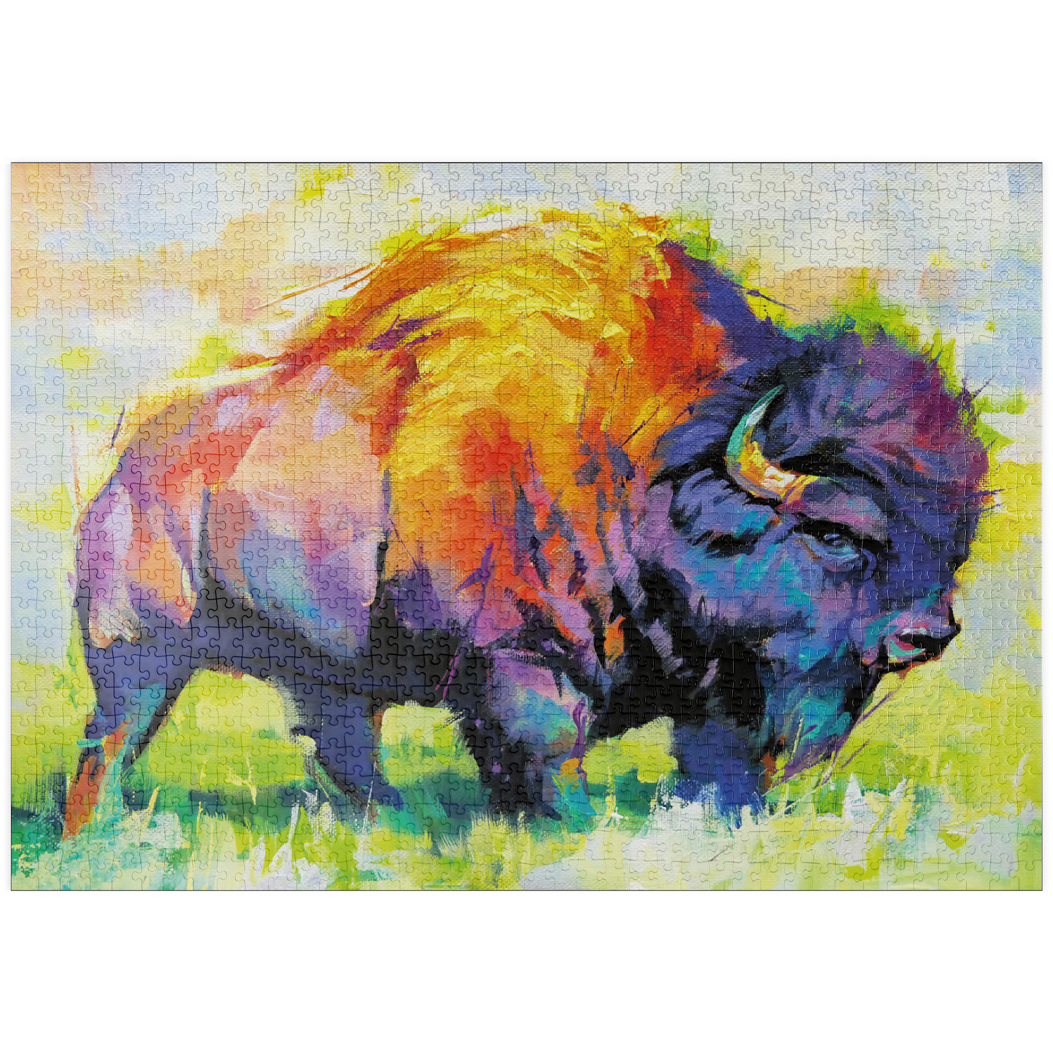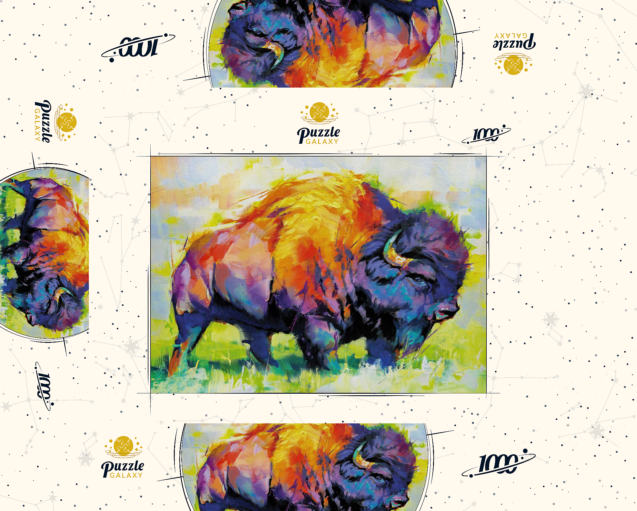 Dieses kühne und ausdrucksstarke Gemälde zeigt einen amerikanischen Bison, der durch eine lebendige Mischung aus abstrakten Farben und dynamischen Pinselstrichen dargestellt ist. Die kraftvolle Statur des Bisons wird durch leuchtende Orange-, Gelb-, Violett- und Blaugrüntöne betont, die einen energiegeladenen Kontrast zum sanften Grün und Blau des Hintergrunds bilden. Das Kunstwerk fängt den Geist und die Kraft dieses ikonischen nordamerikanischen Tieres ein und verleiht ihm gleichzeitig einen modernen künstlerischen Touch. Eine perfekte Wahl für Liebhaber von Wildtieren und zeitgenössischem Expressionismus.
