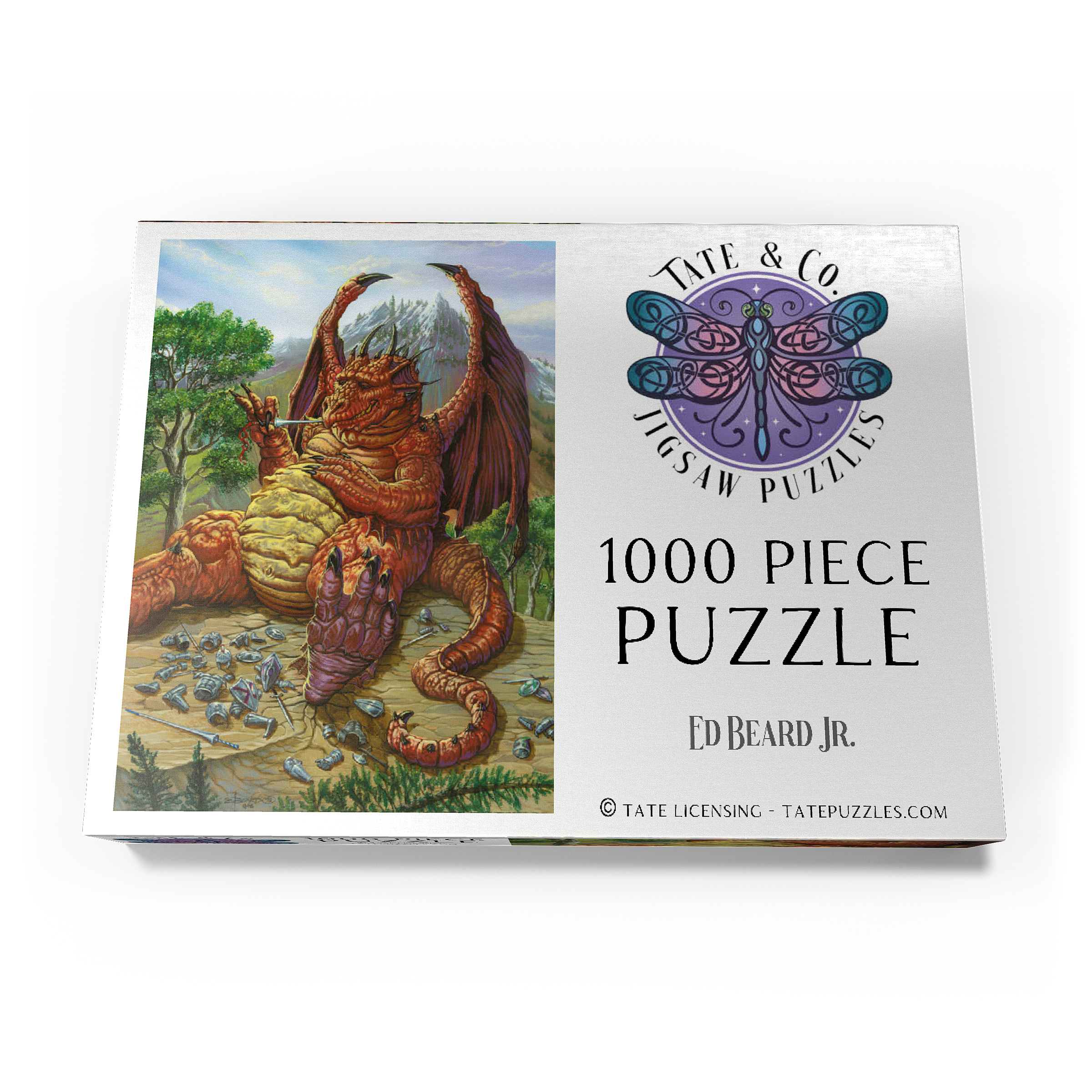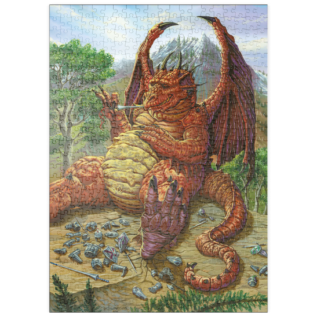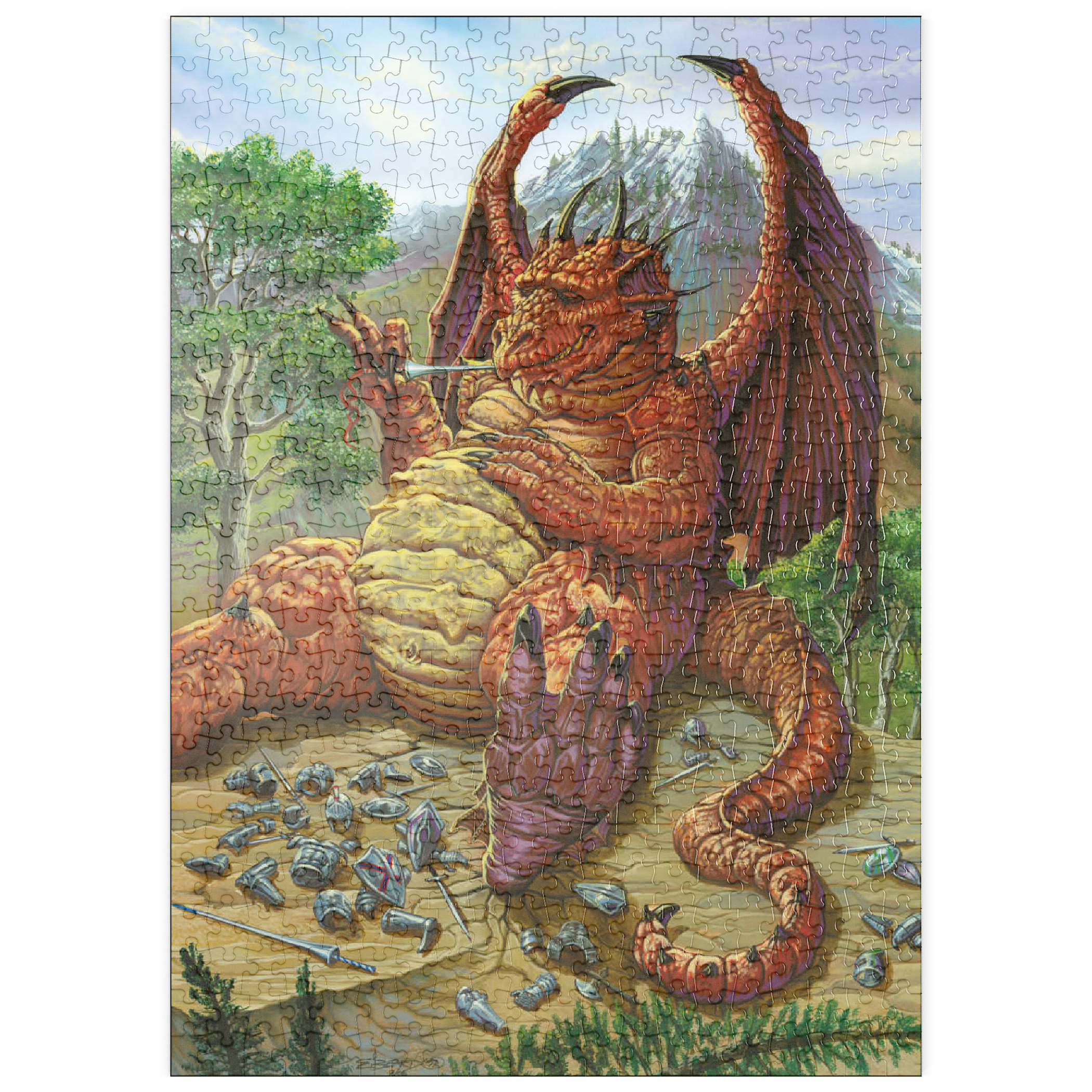 Eines Tages wollte ein müder Drache einfach nur ein Nickerchen machen. Sein lautes Schnarchen störte den König so sehr, dass er seine besten Ritter herbeirief, um der Sache nachzugehen. Der Drache war über diese Essenslieferung hocherfreut. Leider wurde der Drache dadurch zu schwer, um noch fliegen zu können – manchmal gewinnt eben doch der Drache. Die bewaldete Klippe ist eine ikonische Kulisse für dieses komische und skurrile Drachenbild.