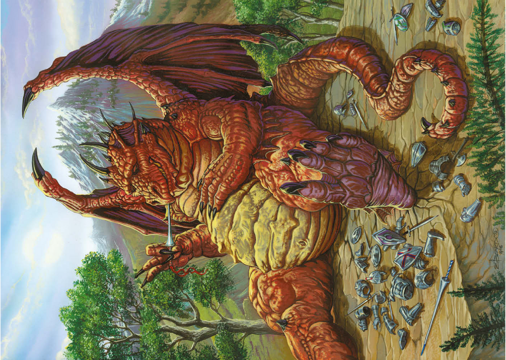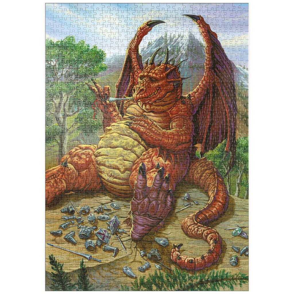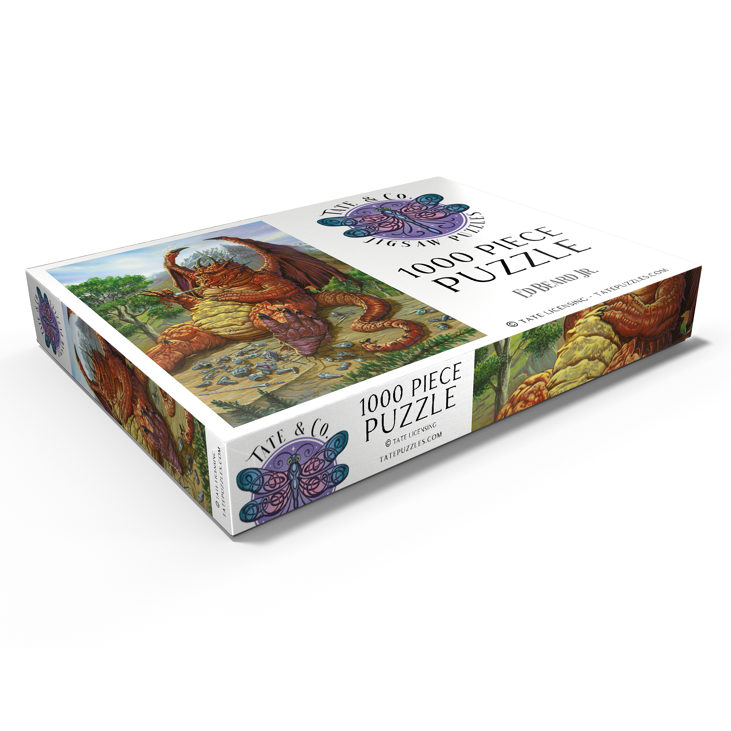 Eines Tages wollte ein müder Drache einfach nur ein Nickerchen machen. Sein lautes Schnarchen störte den König so sehr, dass er seine besten Ritter herbeirief, um der Sache nachzugehen. Der Drache war über diese Essenslieferung hocherfreut. Leider wurde der Drache dadurch zu schwer, um noch fliegen zu können – manchmal gewinnt eben doch der Drache. Die bewaldete Klippe ist eine ikonische Kulisse für dieses komische und skurrile Drachenbild.