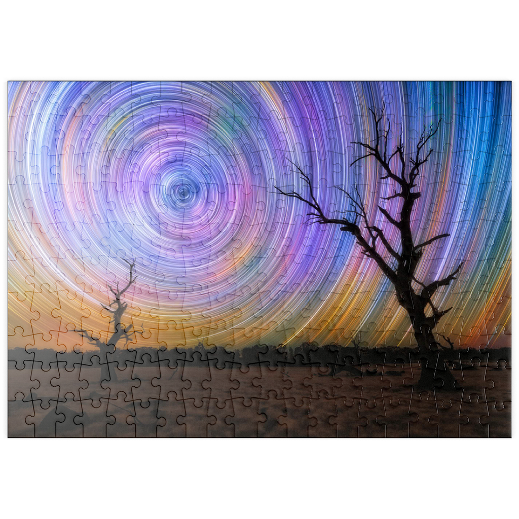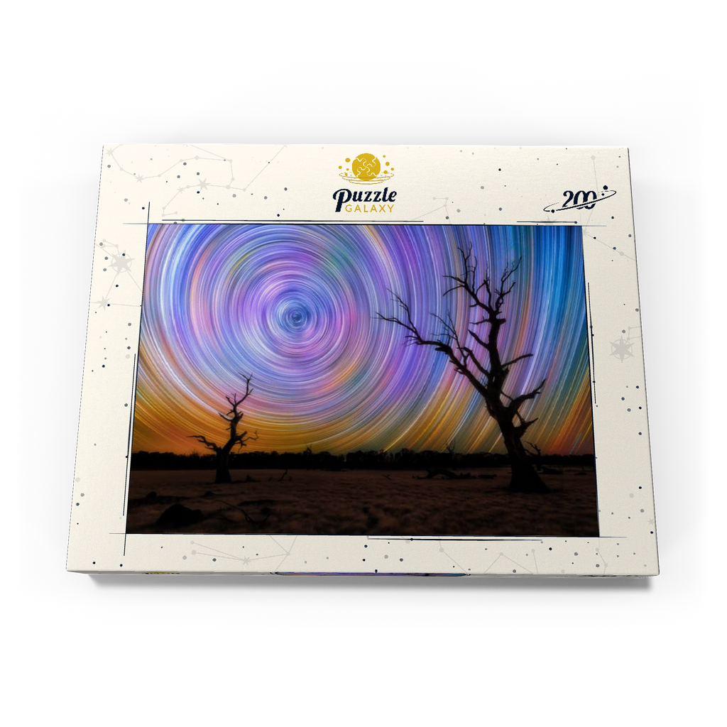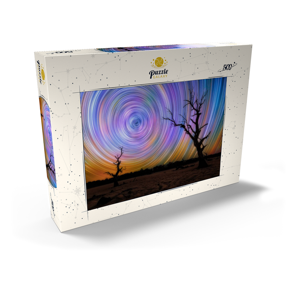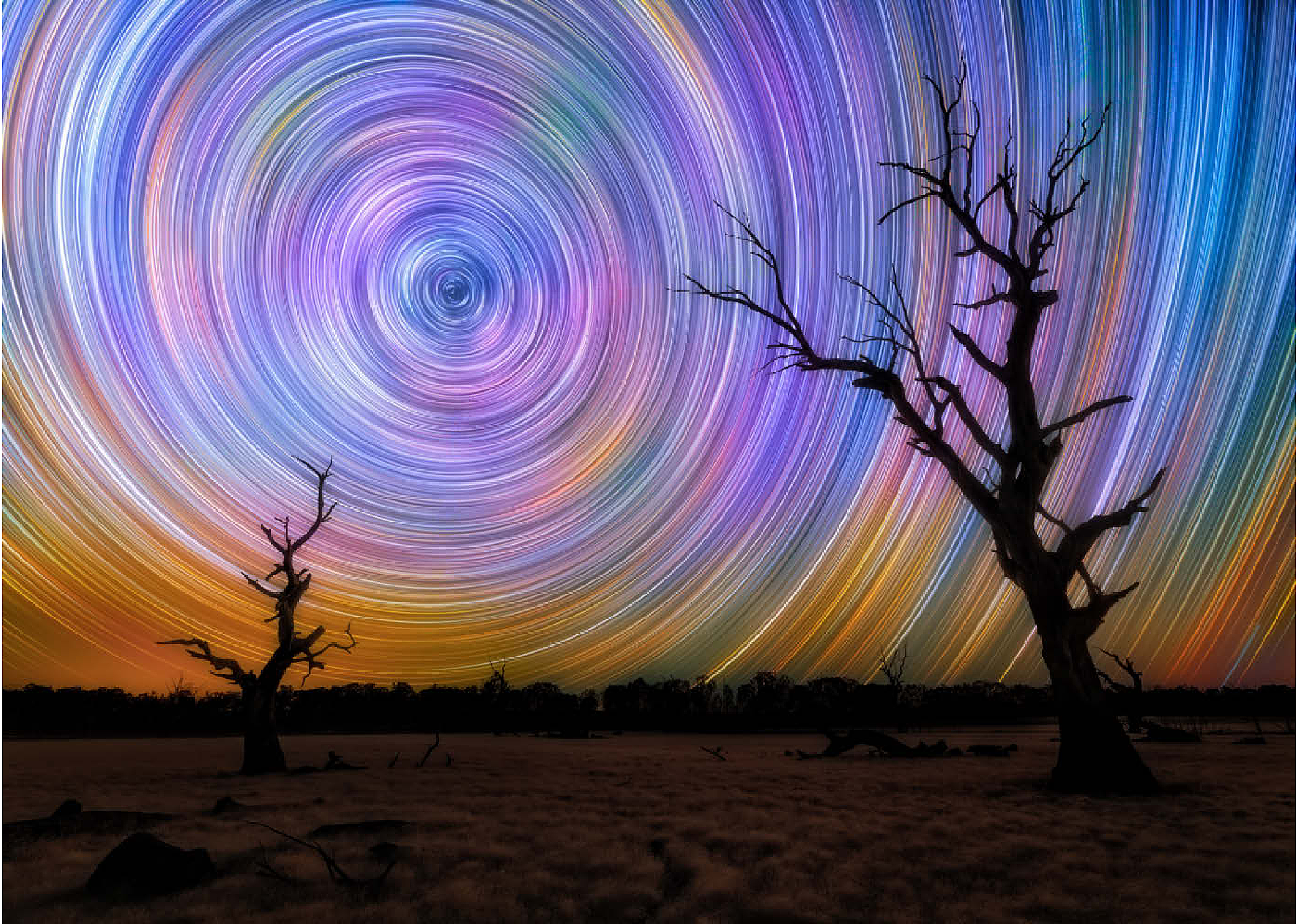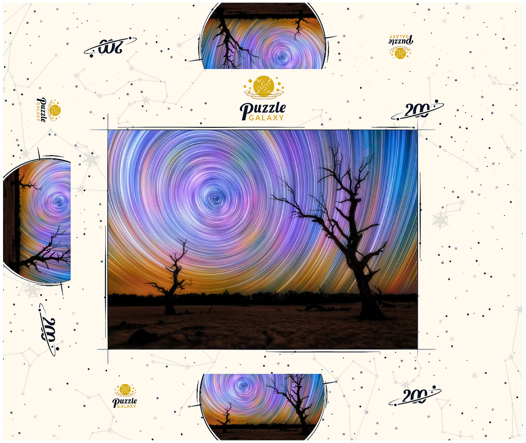 Dieses faszinierende Bild fängt die Brillanz von Sternspuren ein, die in lebhaften kreisförmigen Bewegungen über dem australischen Outback wirbeln. Die Komposition zeigt zwei verwitterte, blattlose Bäume, die sich vor einem surrealen Nachthimmel abzeichnen, der von regenbogenartigen Bögen durchzogen ist, die durch Langzeitbelichtung in der Astrofotografie entstanden sind. Der dunkle Vordergrund bildet einen wunderschönen Kontrast zu der Explosion von Farben am Himmel, die von tiefem Blau und Violett bis zu leuchtendem Orange und Gelb reicht. Diese Szene verdeutlicht die raue Schönheit und Abgeschiedenheit des australischen Landesinneren, wo die Lichtverschmutzung minimal ist und die Himmelsmuster deutlich zu sehen sind. Dieses Bild ist perfekt für Astronomie-Liebhaber, Sammler von Nachtlandschaften oder alle, die von den Wundern des Universums fasziniert sind. Es zelebriert das Zusammenspiel zwischen der Einsamkeit der Natur und der Bewegung des Kosmos.