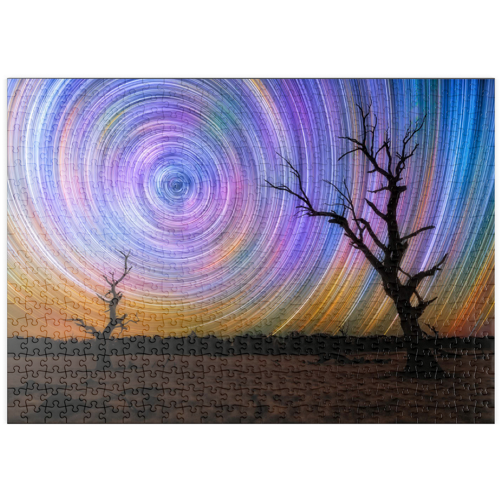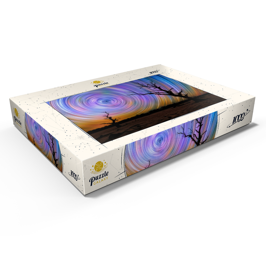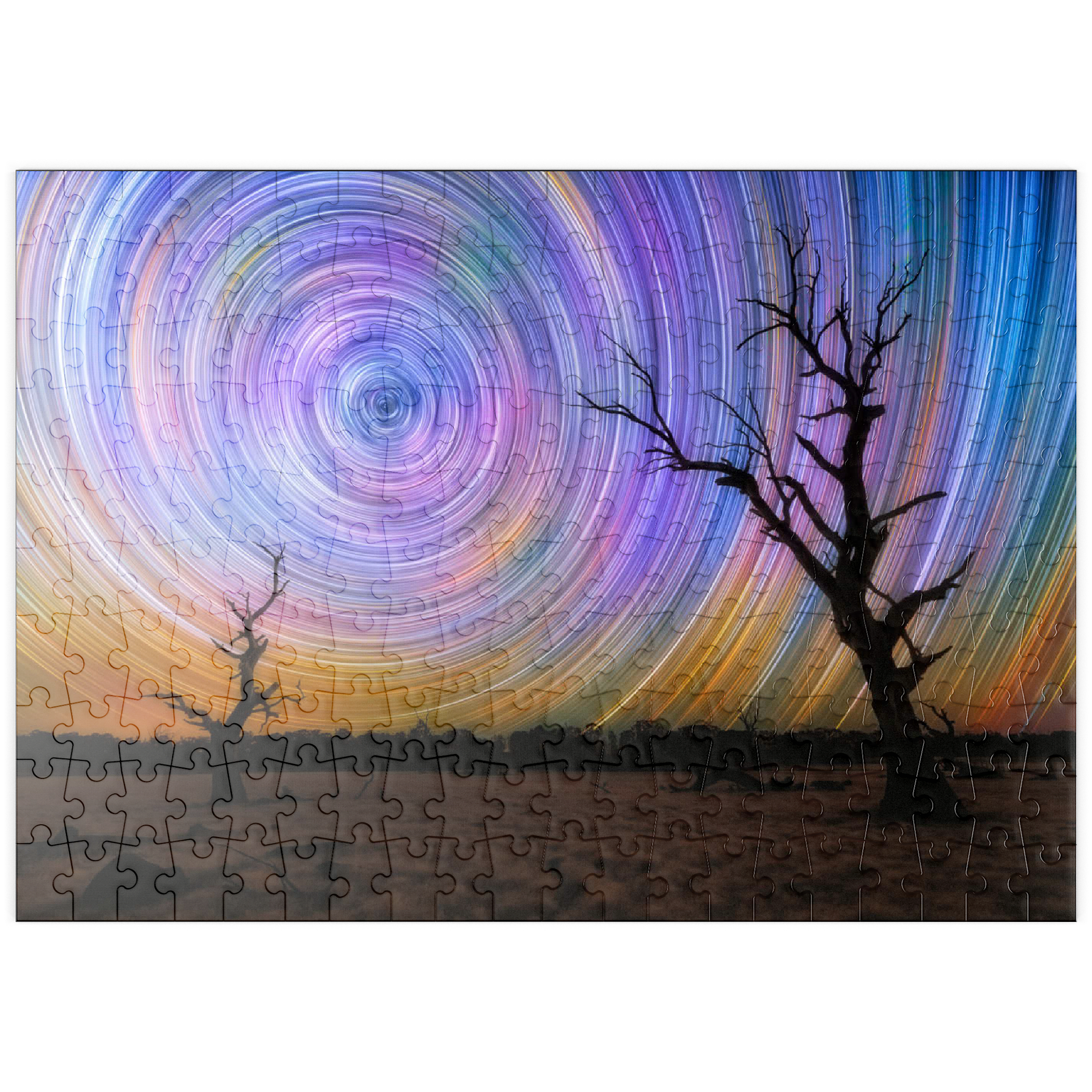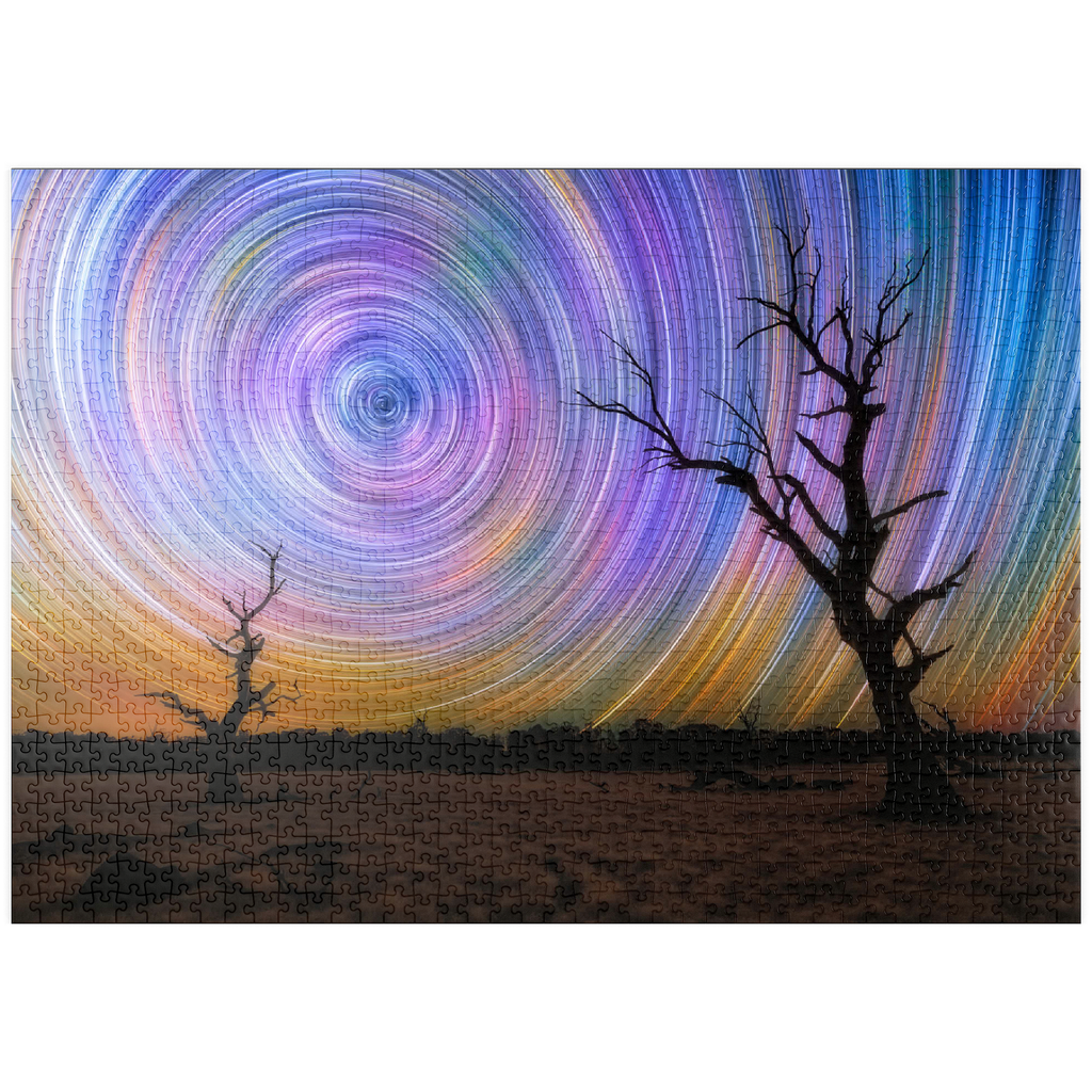 Dieses faszinierende Bild fängt die Brillanz von Sternspuren ein, die in lebhaften kreisförmigen Bewegungen über dem australischen Outback wirbeln. Die Komposition zeigt zwei verwitterte, blattlose Bäume, die sich vor einem surrealen Nachthimmel abzeichnen, der von regenbogenartigen Bögen durchzogen ist, die durch Langzeitbelichtung in der Astrofotografie entstanden sind. Der dunkle Vordergrund bildet einen wunderschönen Kontrast zu der Explosion von Farben am Himmel, die von tiefem Blau und Violett bis zu leuchtendem Orange und Gelb reicht. Diese Szene verdeutlicht die raue Schönheit und Abgeschiedenheit des australischen Landesinneren, wo die Lichtverschmutzung minimal ist und die Himmelsmuster deutlich zu sehen sind. Dieses Bild ist perfekt für Astronomie-Liebhaber, Sammler von Nachtlandschaften oder alle, die von den Wundern des Universums fasziniert sind. Es zelebriert das Zusammenspiel zwischen der Einsamkeit der Natur und der Bewegung des Kosmos.