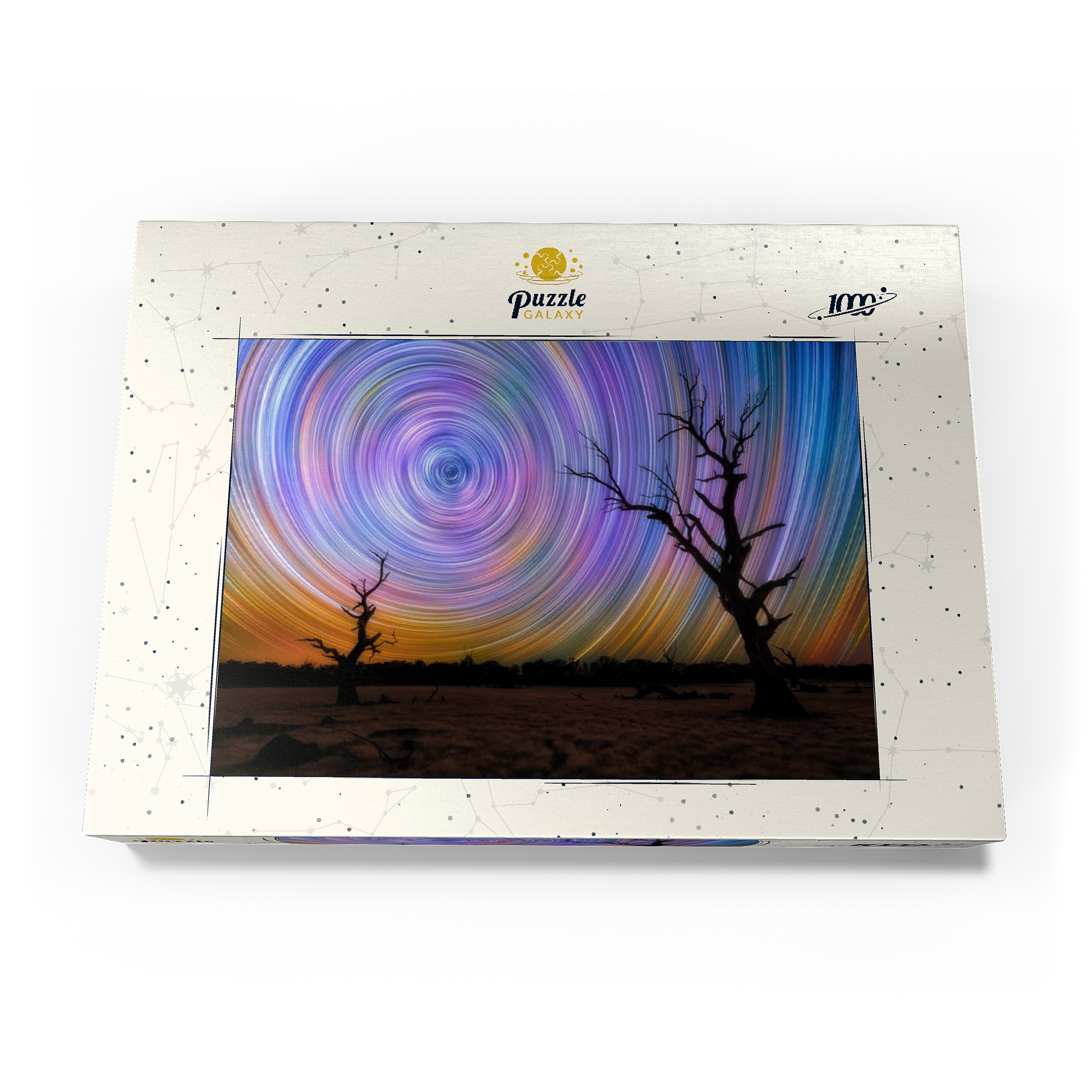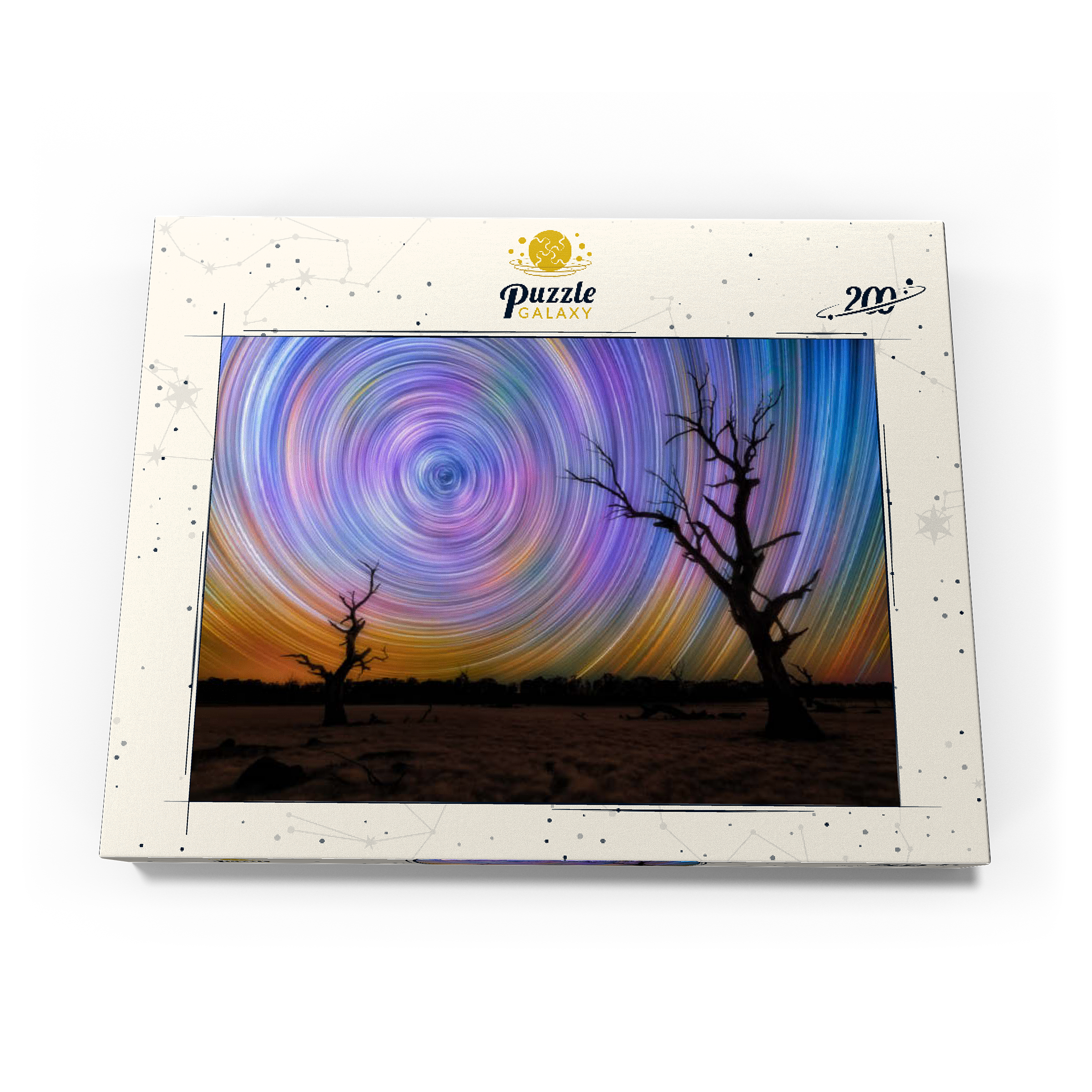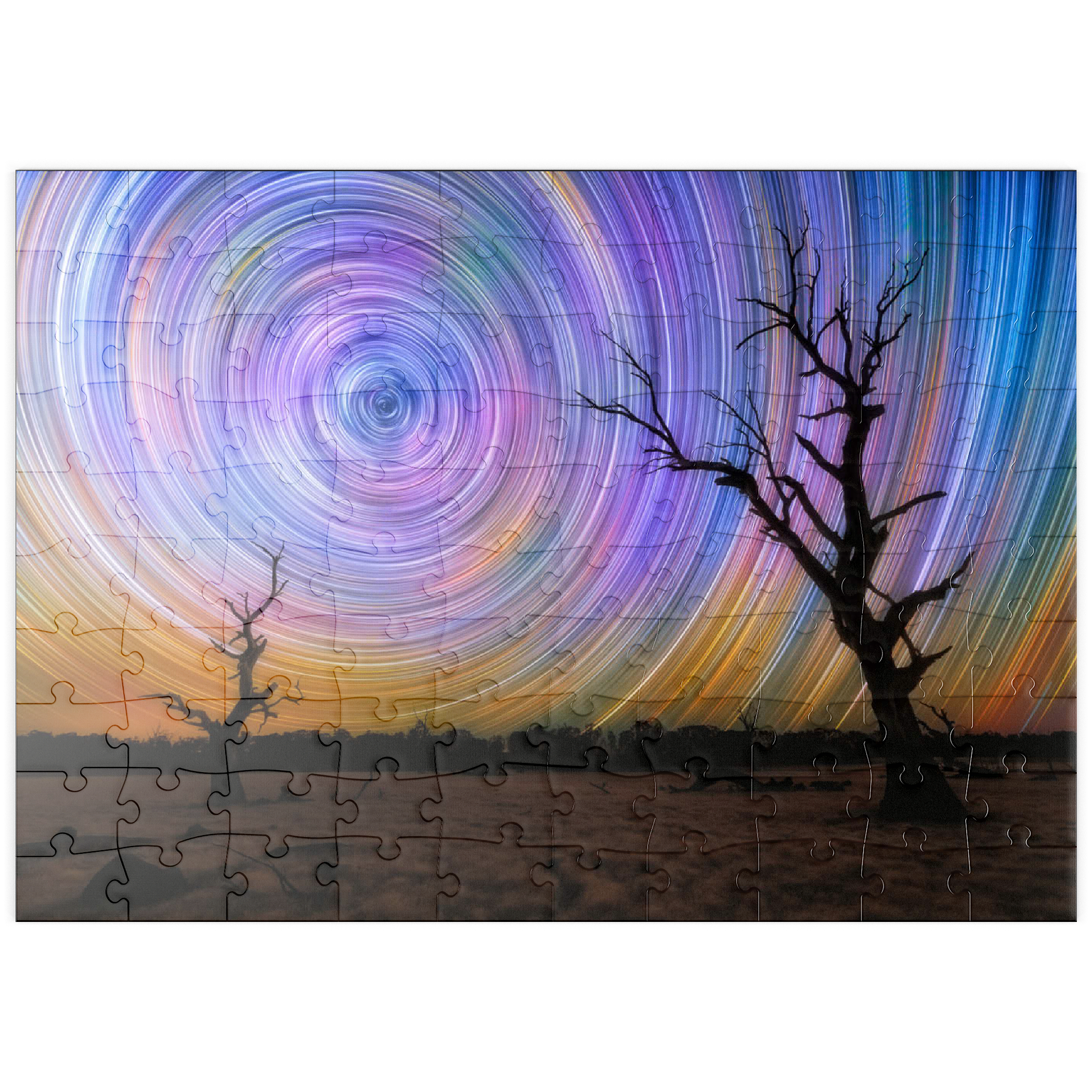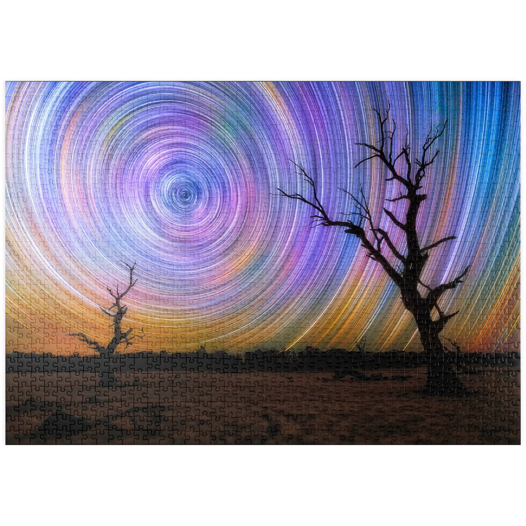 Dieses faszinierende Bild fängt die Brillanz von Sternspuren ein, die in lebhaften kreisförmigen Bewegungen über dem australischen Outback wirbeln. Die Komposition zeigt zwei verwitterte, blattlose Bäume, die sich vor einem surrealen Nachthimmel abzeichnen, der von regenbogenartigen Bögen durchzogen ist, die durch Langzeitbelichtung in der Astrofotografie entstanden sind. Der dunkle Vordergrund bildet einen wunderschönen Kontrast zu der Explosion von Farben am Himmel, die von tiefem Blau und Violett bis zu leuchtendem Orange und Gelb reicht. Diese Szene verdeutlicht die raue Schönheit und Abgeschiedenheit des australischen Landesinneren, wo die Lichtverschmutzung minimal ist und die Himmelsmuster deutlich zu sehen sind. Dieses Bild ist perfekt für Astronomie-Liebhaber, Sammler von Nachtlandschaften oder alle, die von den Wundern des Universums fasziniert sind. Es zelebriert das Zusammenspiel zwischen der Einsamkeit der Natur und der Bewegung des Kosmos.