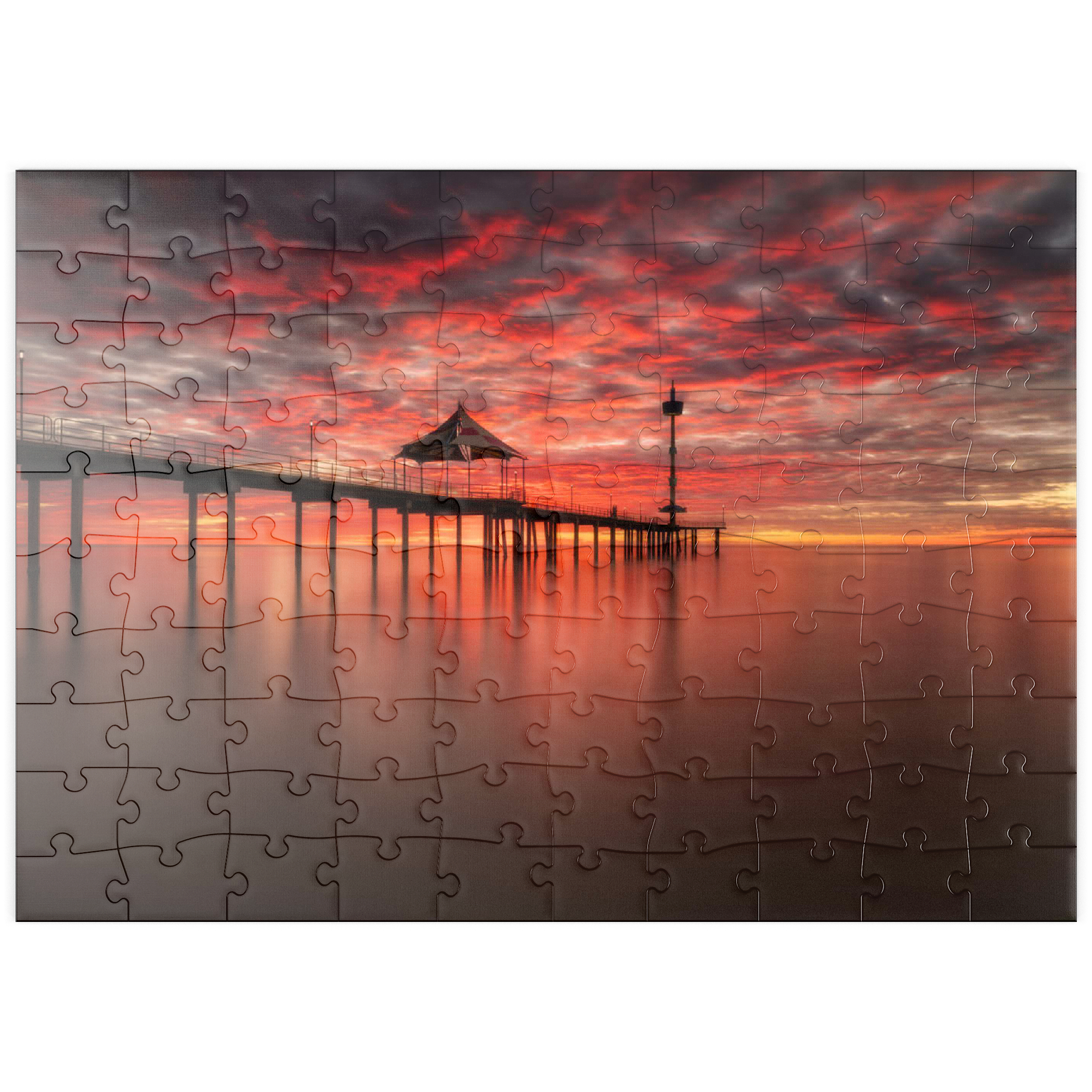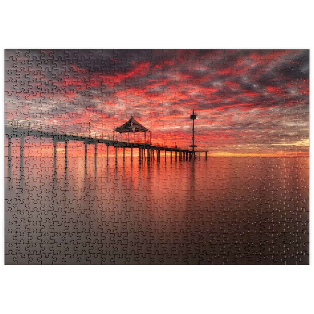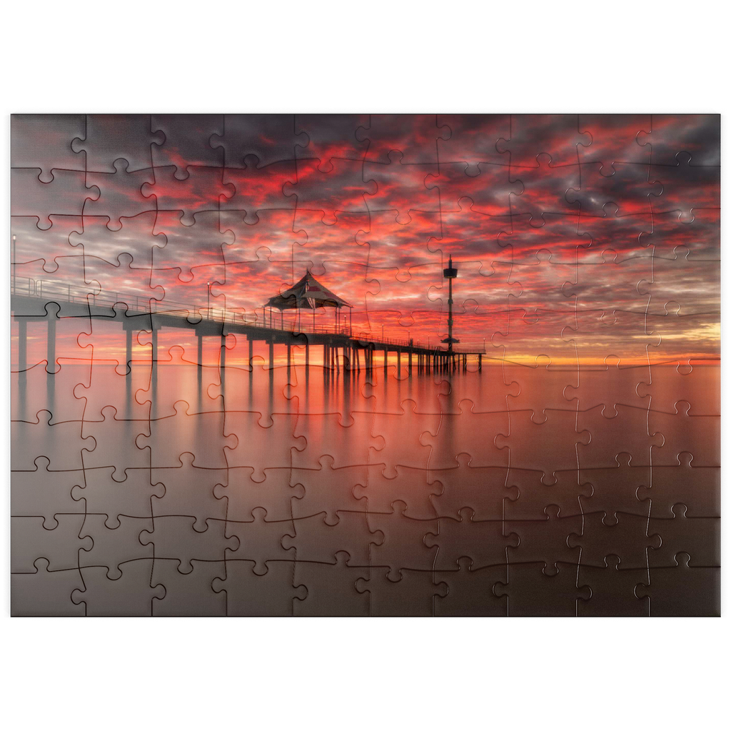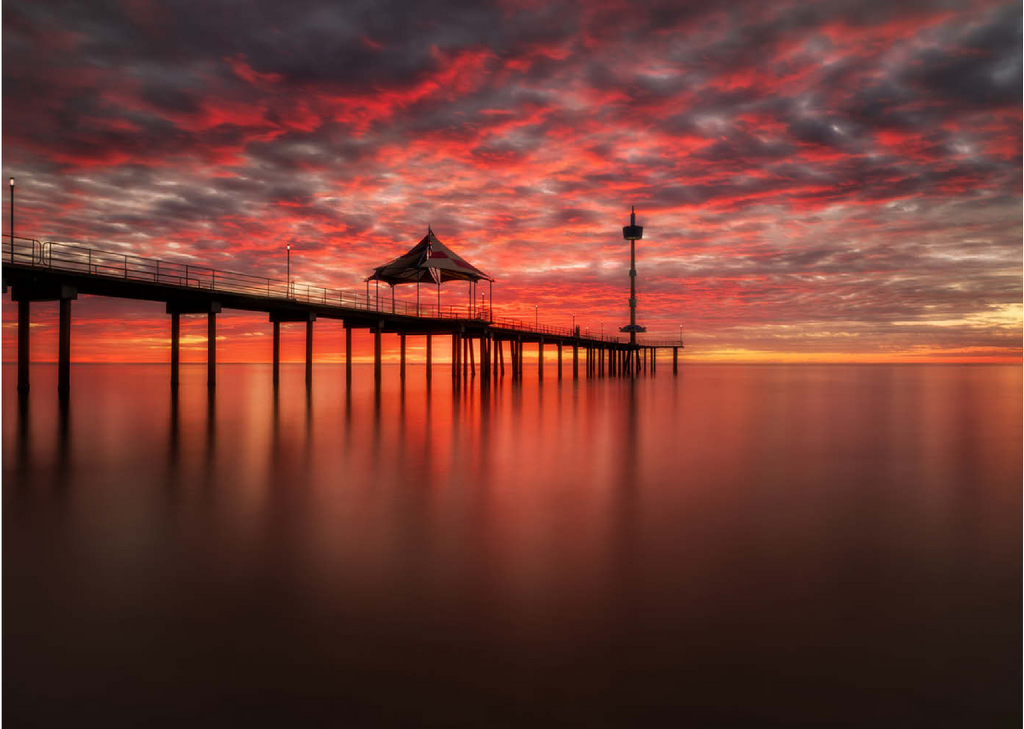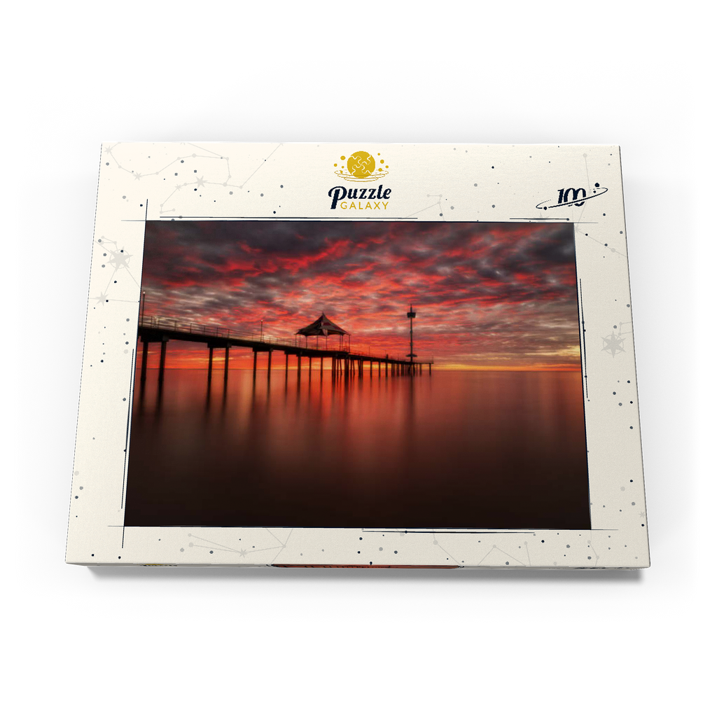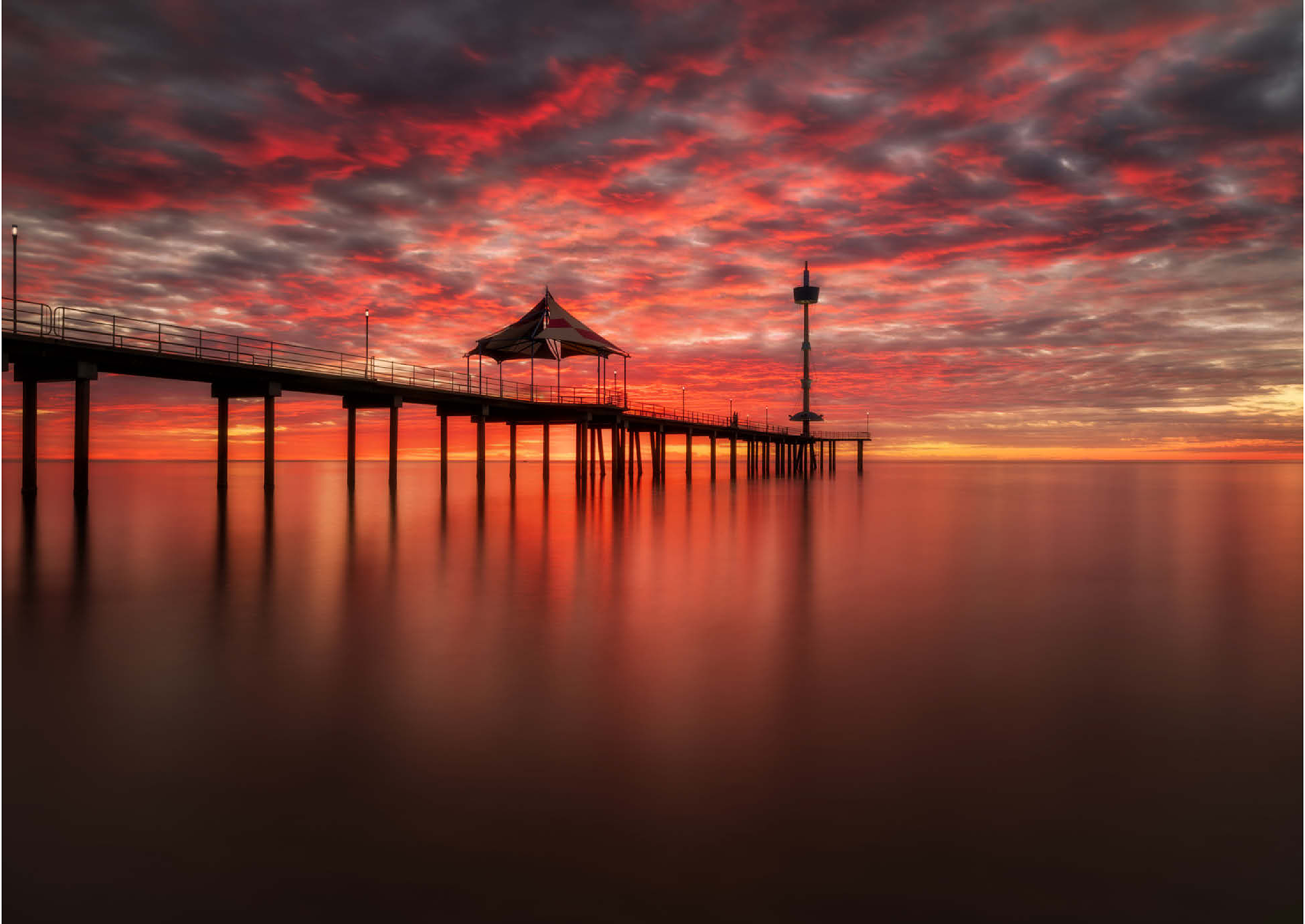 Der Brighton Jetty in Südaustralien bietet einen atemberaubenden Blick auf den Sonnenuntergang, wobei sich leuchtende Rot-, Orange- und Violetttöne auf dem ruhigen Wasser widerspiegeln. Der lange Pier, der sich in den Golf von St. Vincent erstreckt, bildet eine perfekte Silhouette vor dem dramatischen Himmel. Der bei Einheimischen und Touristen gleichermaßen beliebte Steg ist ein beliebter Ort für Spaziergänge, zum Angeln und Fotografieren. Der einzigartige Pavillon und die Leuchtturmstruktur verleihen der Szenerie Charakter und schaffen eine idyllische Küstenatmosphäre, die die Essenz eines ruhigen australischen Abends einfängt.