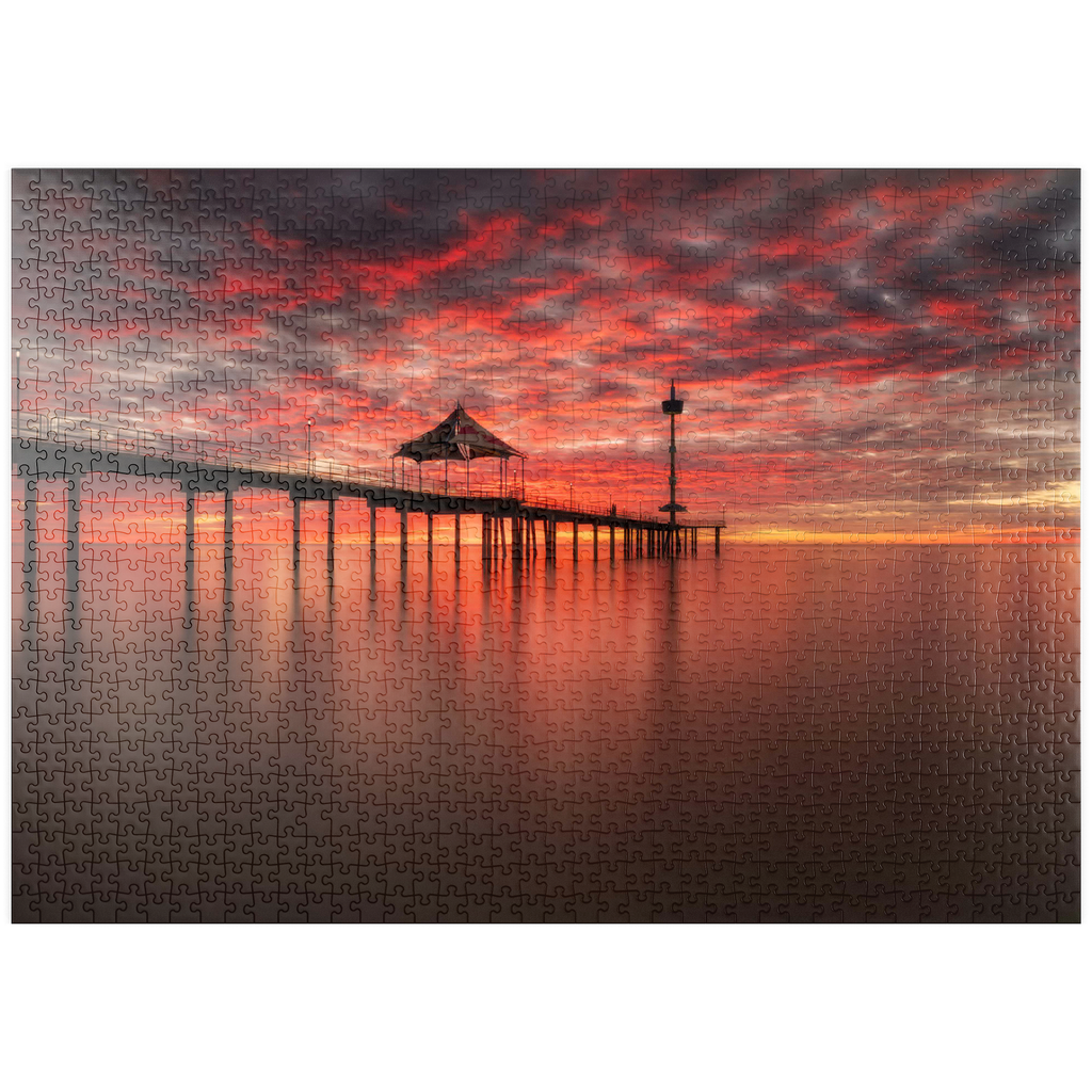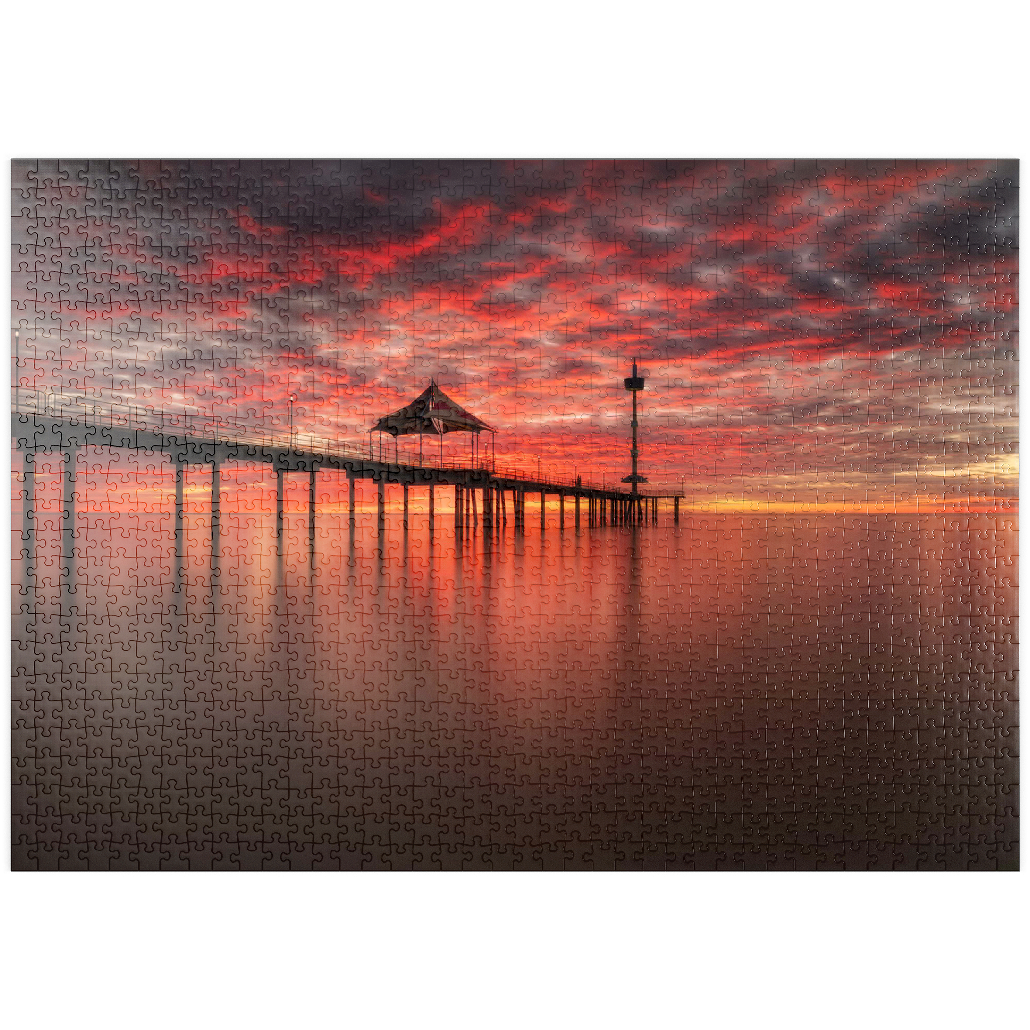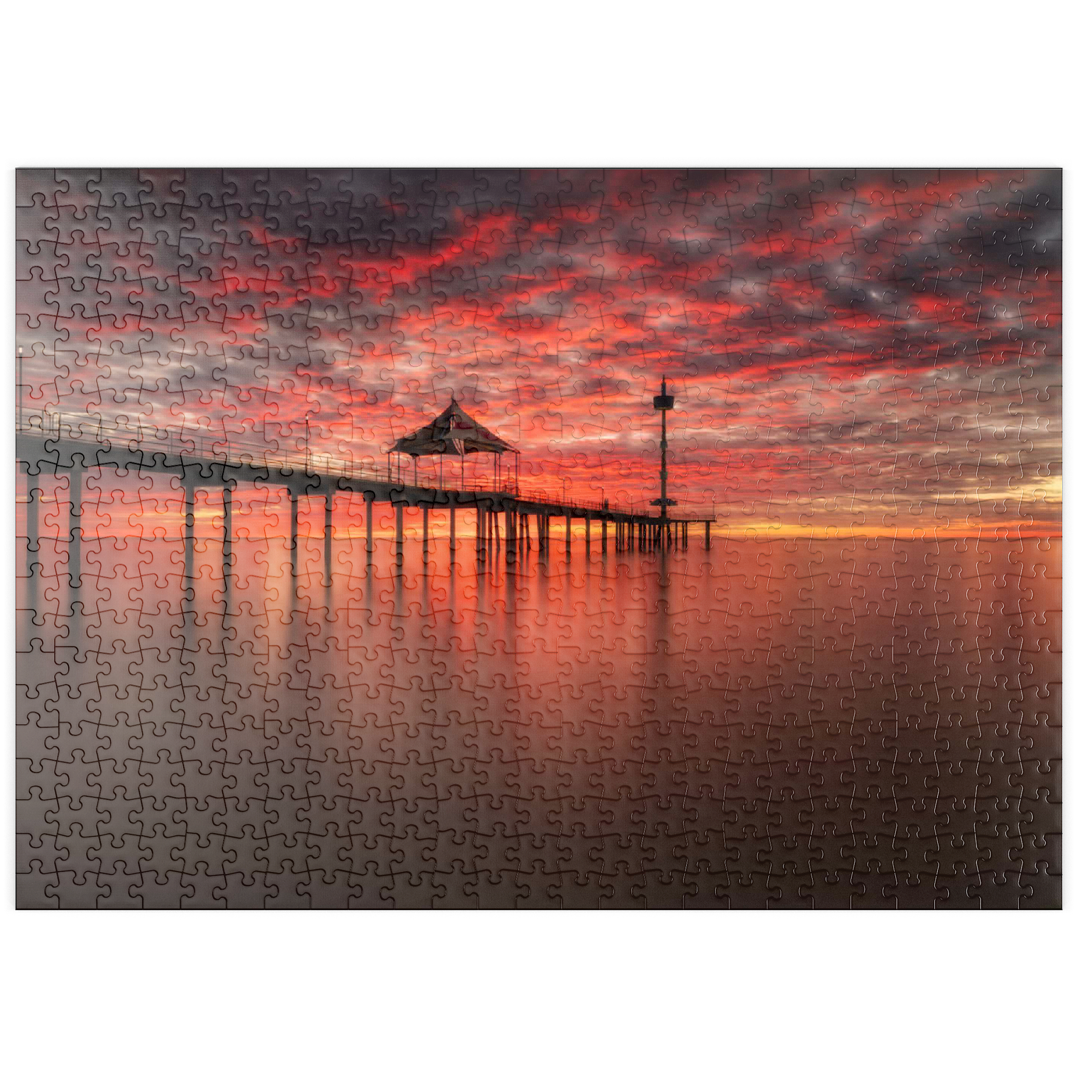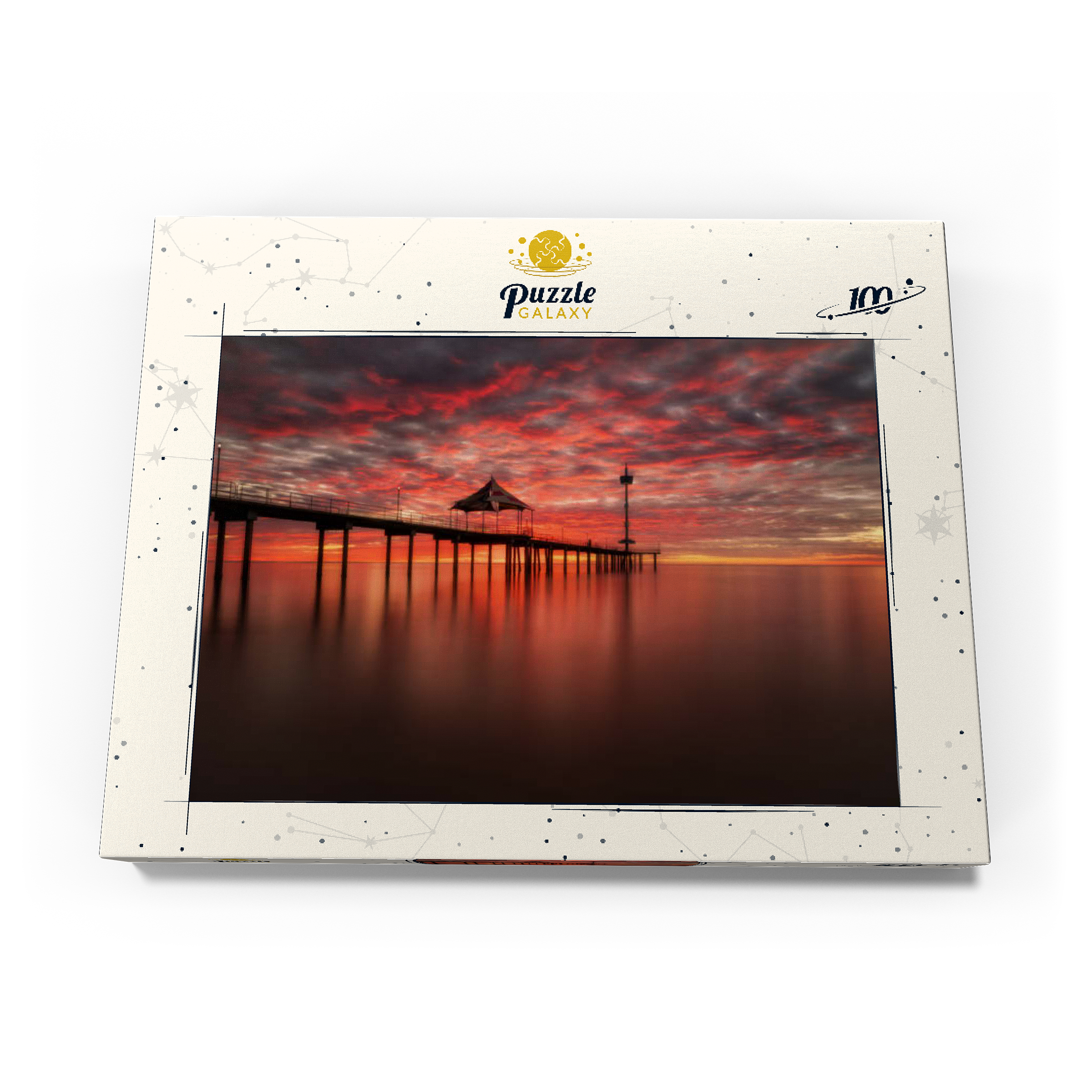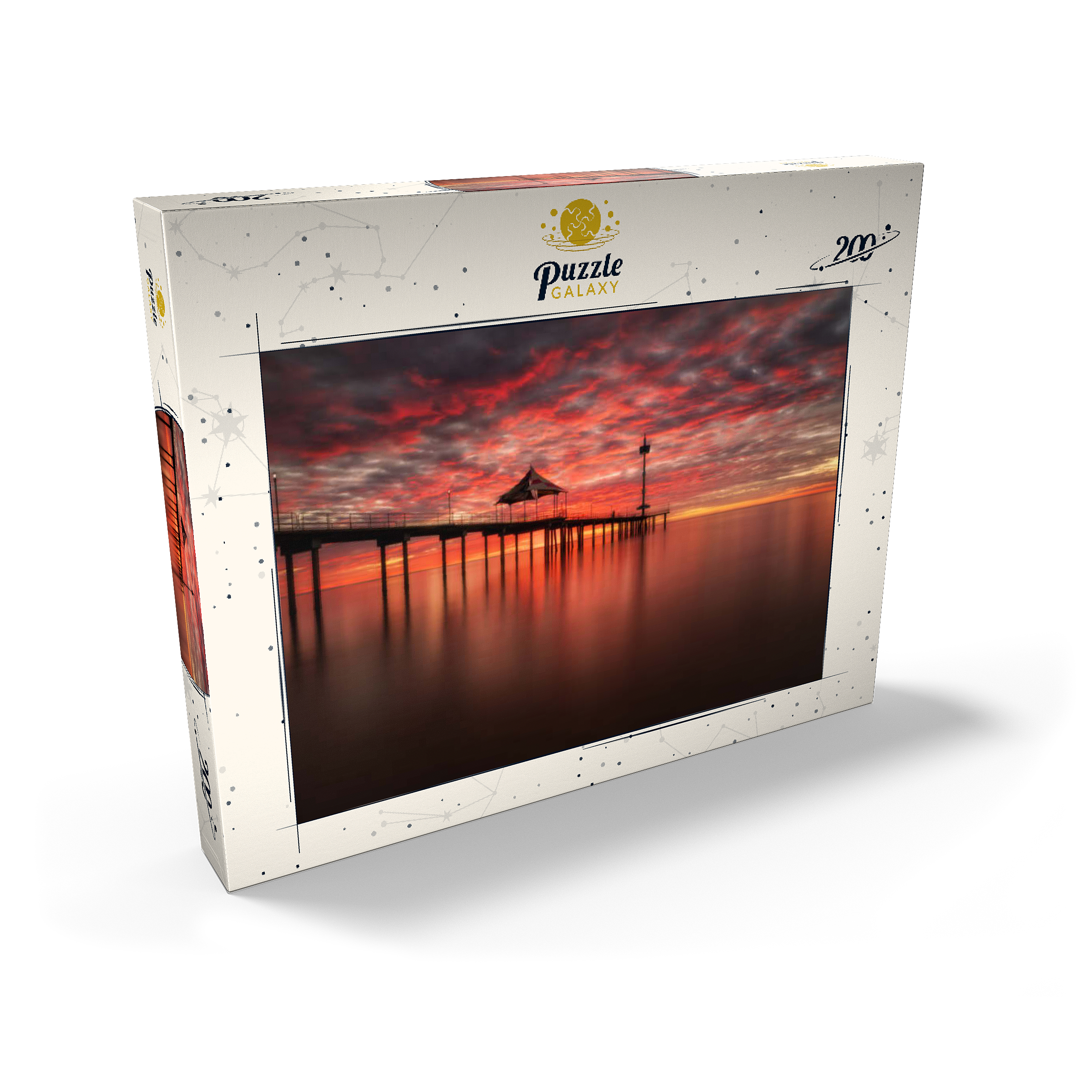 Der Brighton Jetty in Südaustralien bietet einen atemberaubenden Blick auf den Sonnenuntergang, wobei sich leuchtende Rot-, Orange- und Violetttöne auf dem ruhigen Wasser widerspiegeln. Der lange Pier, der sich in den Golf von St. Vincent erstreckt, bildet eine perfekte Silhouette vor dem dramatischen Himmel. Der bei Einheimischen und Touristen gleichermaßen beliebte Steg ist ein beliebter Ort für Spaziergänge, zum Angeln und Fotografieren. Der einzigartige Pavillon und die Leuchtturmstruktur verleihen der Szenerie Charakter und schaffen eine idyllische Küstenatmosphäre, die die Essenz eines ruhigen australischen Abends einfängt.
