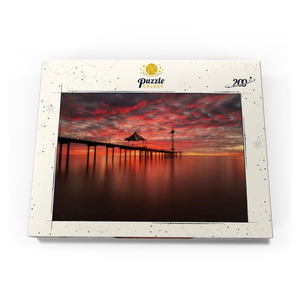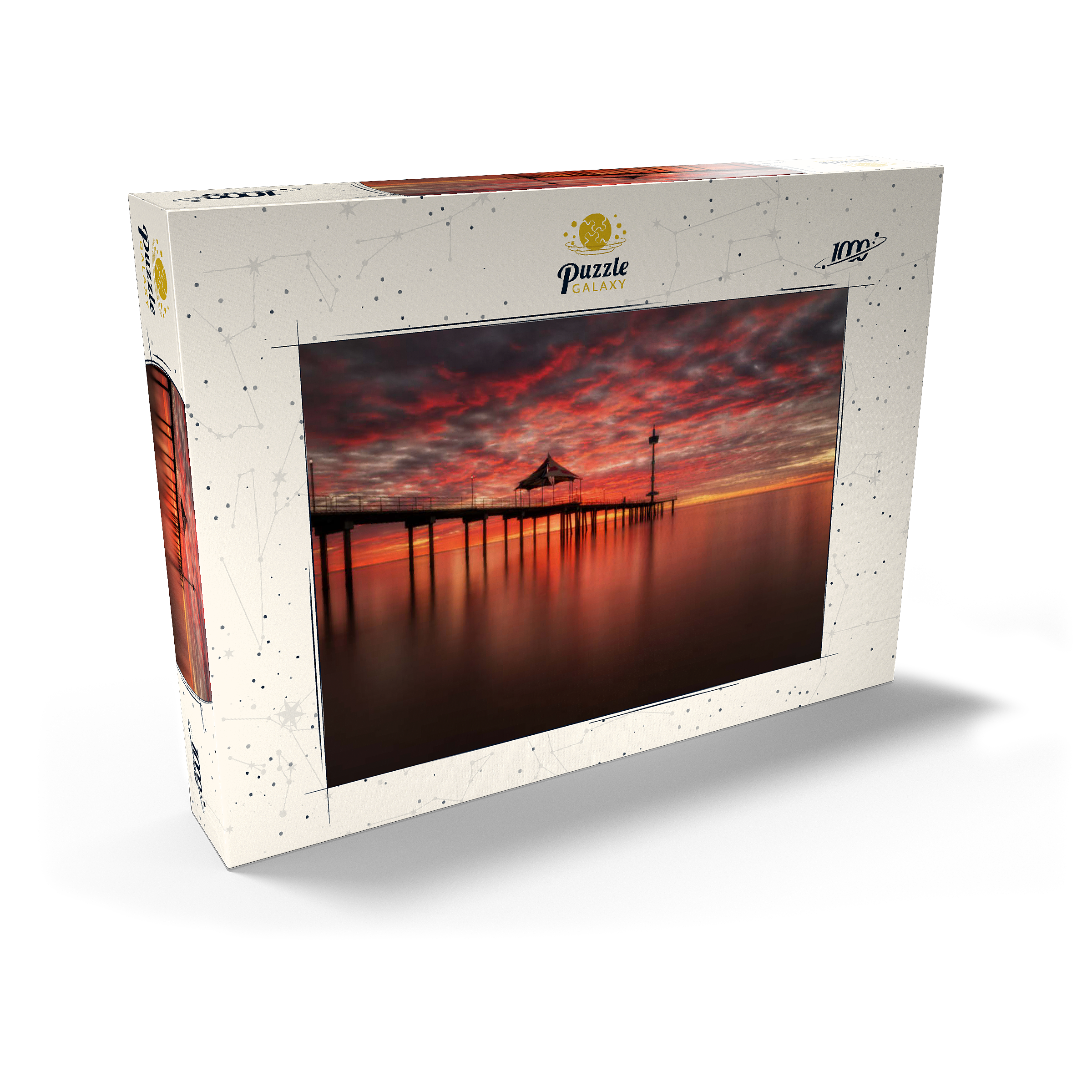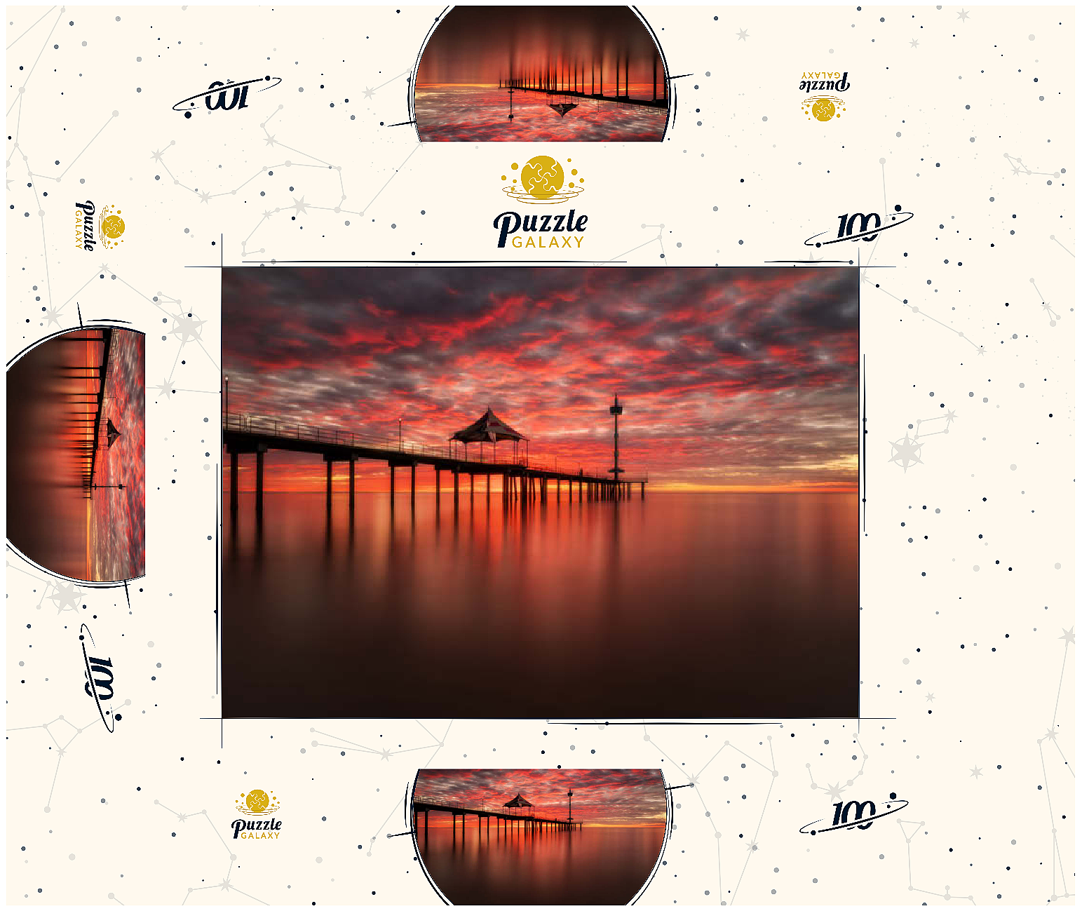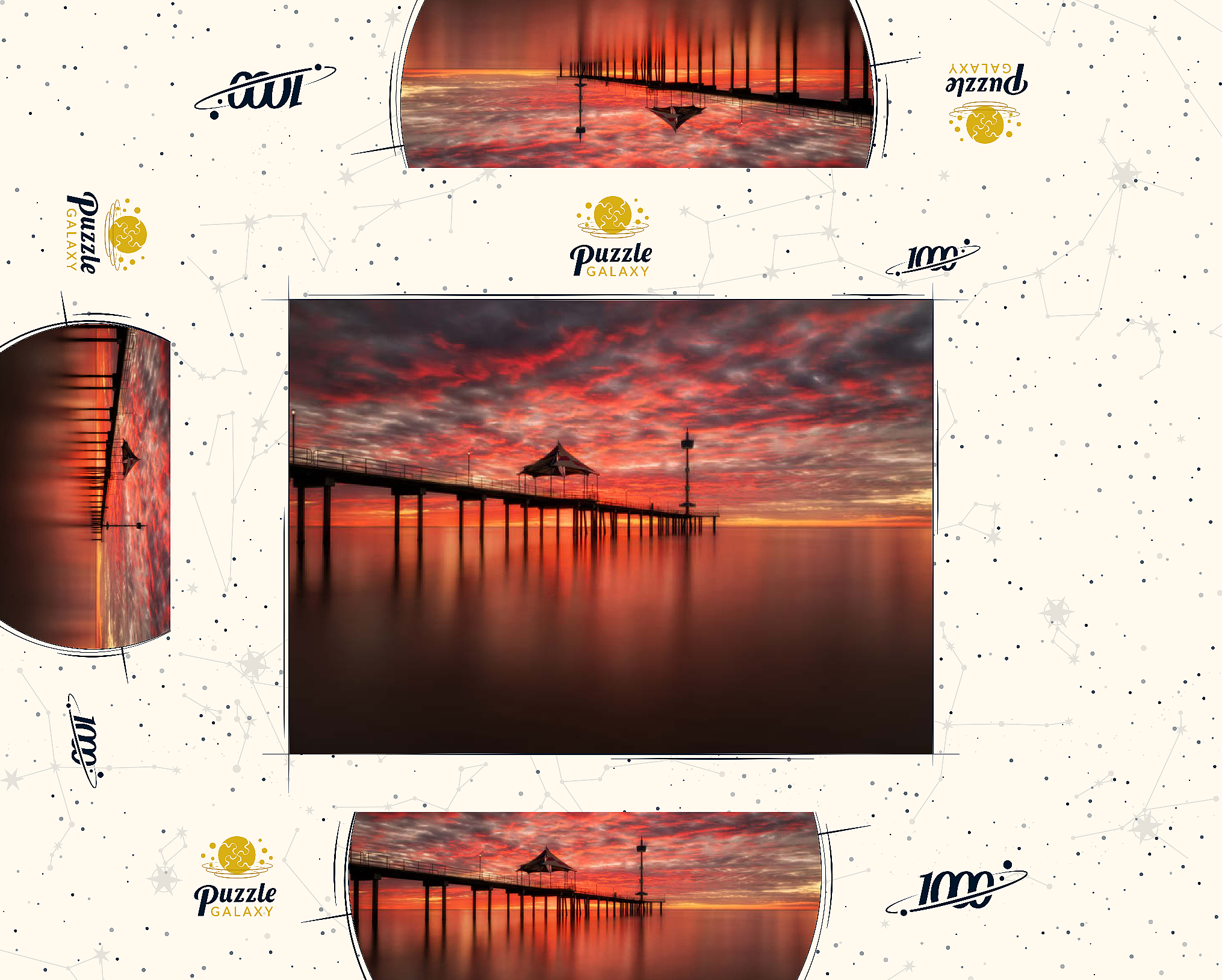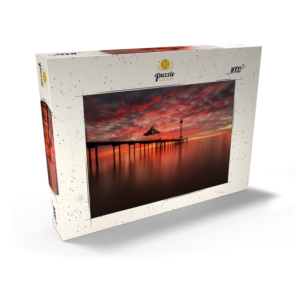 Der Brighton Jetty in Südaustralien bietet einen atemberaubenden Blick auf den Sonnenuntergang, wobei sich leuchtende Rot-, Orange- und Violetttöne auf dem ruhigen Wasser widerspiegeln. Der lange Pier, der sich in den Golf von St. Vincent erstreckt, bildet eine perfekte Silhouette vor dem dramatischen Himmel. Der bei Einheimischen und Touristen gleichermaßen beliebte Steg ist ein beliebter Ort für Spaziergänge, zum Angeln und Fotografieren. Der einzigartige Pavillon und die Leuchtturmstruktur verleihen der Szenerie Charakter und schaffen eine idyllische Küstenatmosphäre, die die Essenz eines ruhigen australischen Abends einfängt.