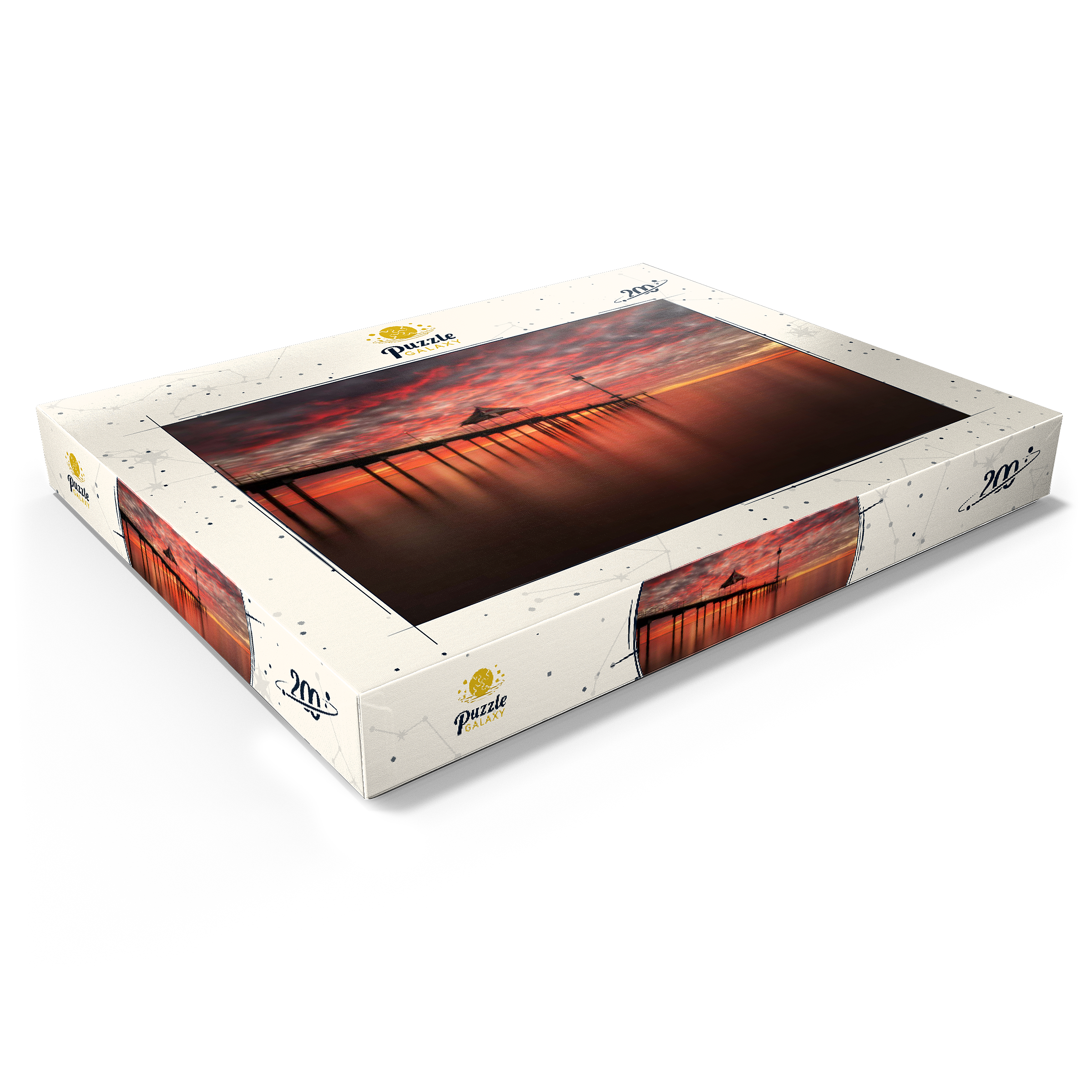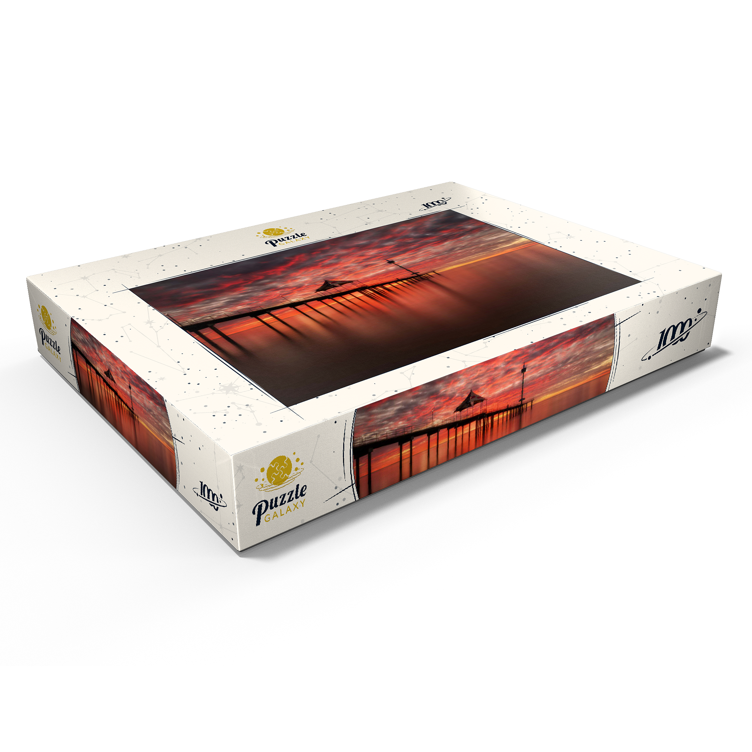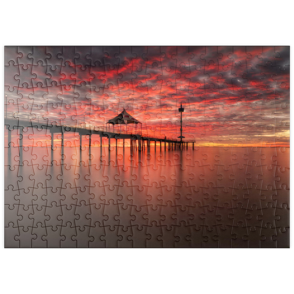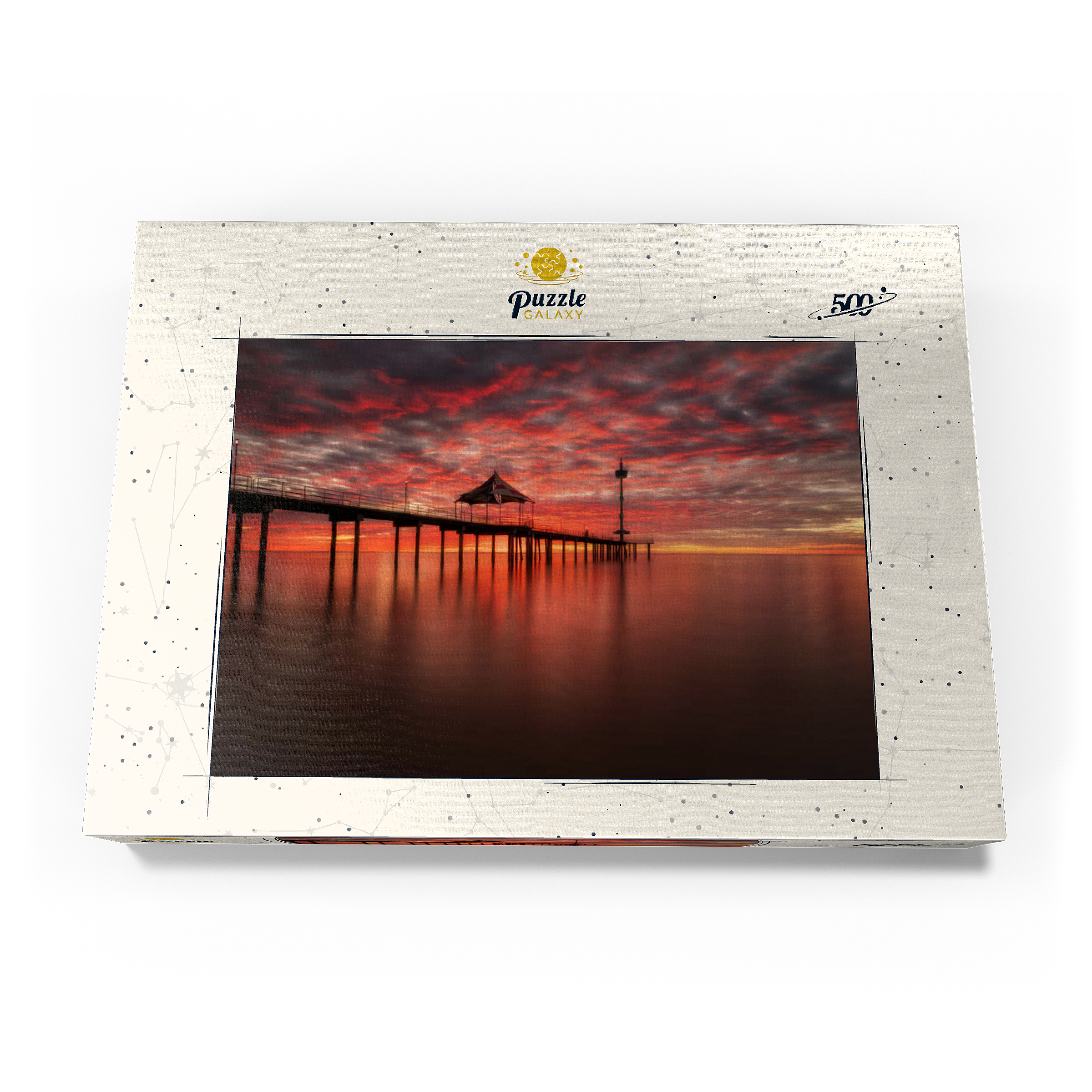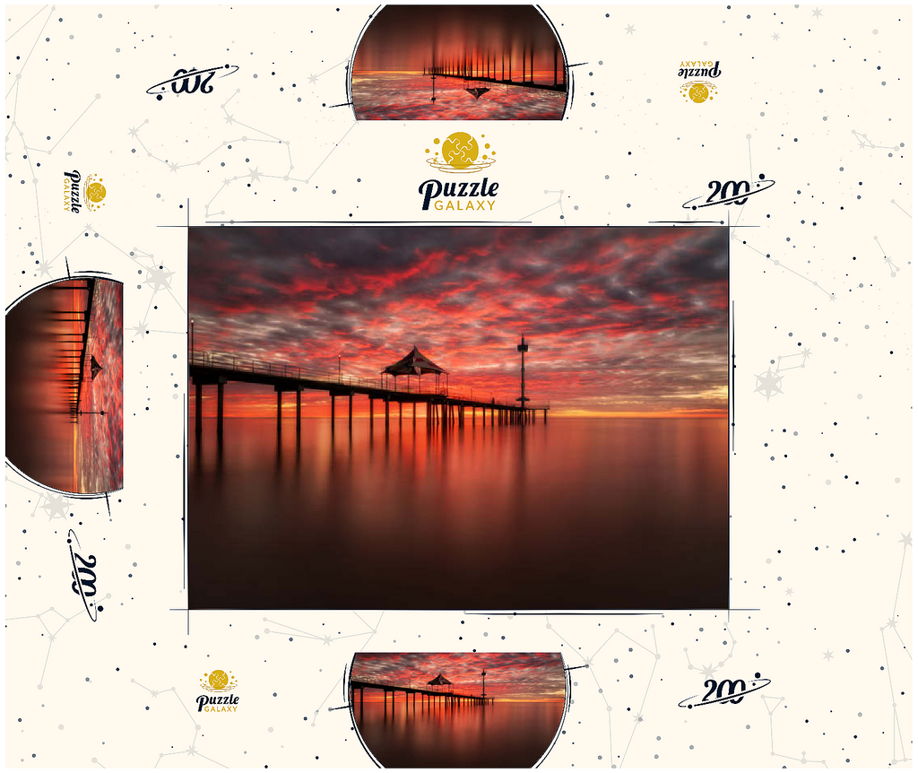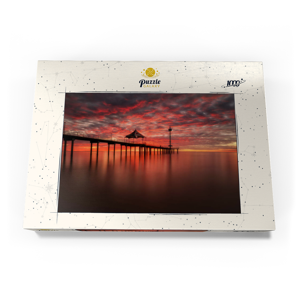 Der Brighton Jetty in Südaustralien bietet einen atemberaubenden Blick auf den Sonnenuntergang, wobei sich leuchtende Rot-, Orange- und Violetttöne auf dem ruhigen Wasser widerspiegeln. Der lange Pier, der sich in den Golf von St. Vincent erstreckt, bildet eine perfekte Silhouette vor dem dramatischen Himmel. Der bei Einheimischen und Touristen gleichermaßen beliebte Steg ist ein beliebter Ort für Spaziergänge, zum Angeln und Fotografieren. Der einzigartige Pavillon und die Leuchtturmstruktur verleihen der Szenerie Charakter und schaffen eine idyllische Küstenatmosphäre, die die Essenz eines ruhigen australischen Abends einfängt.