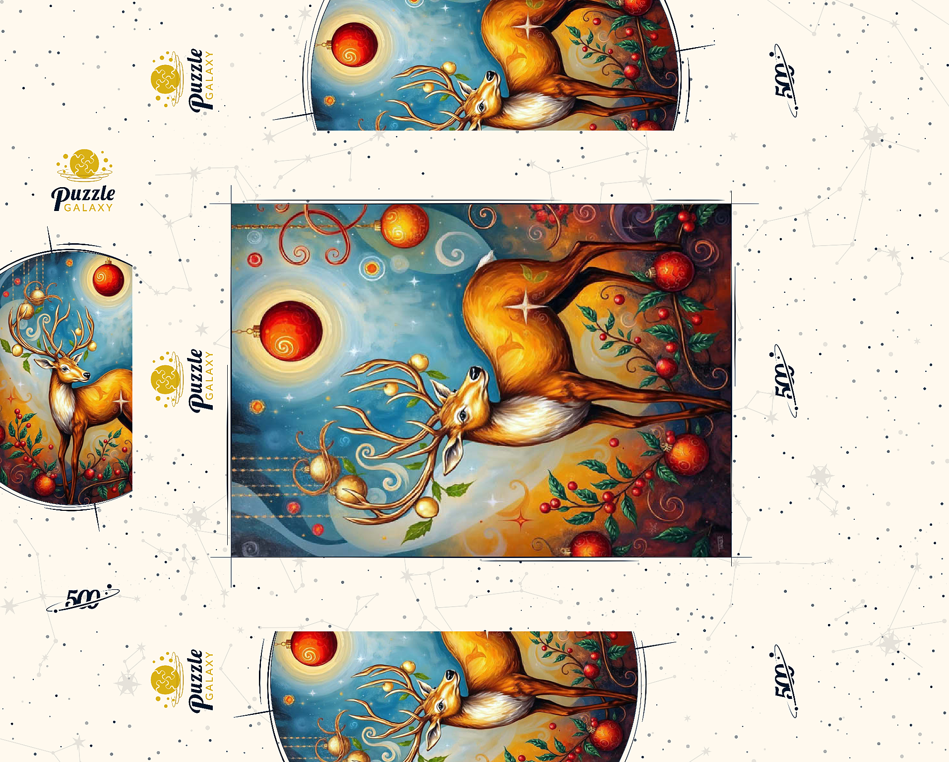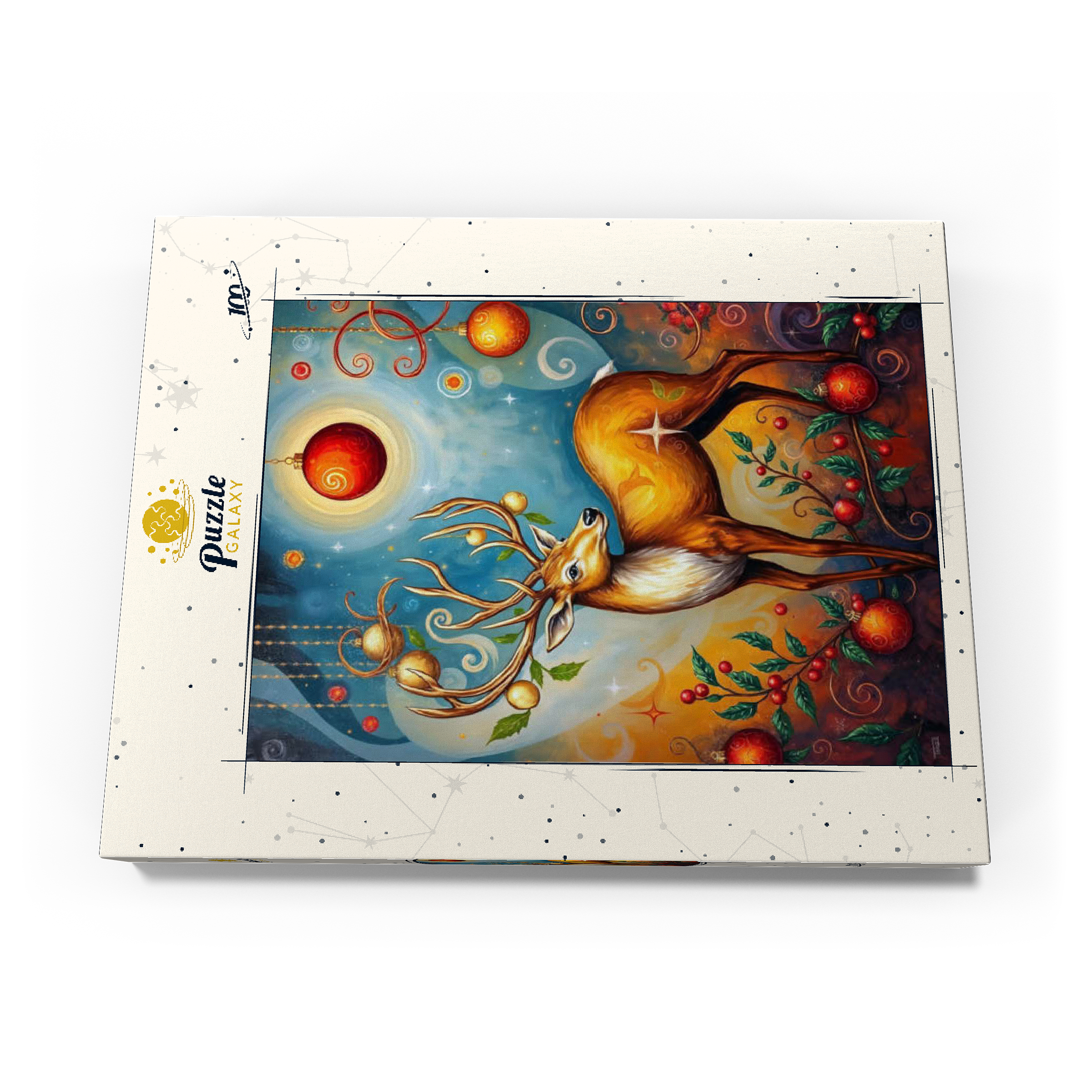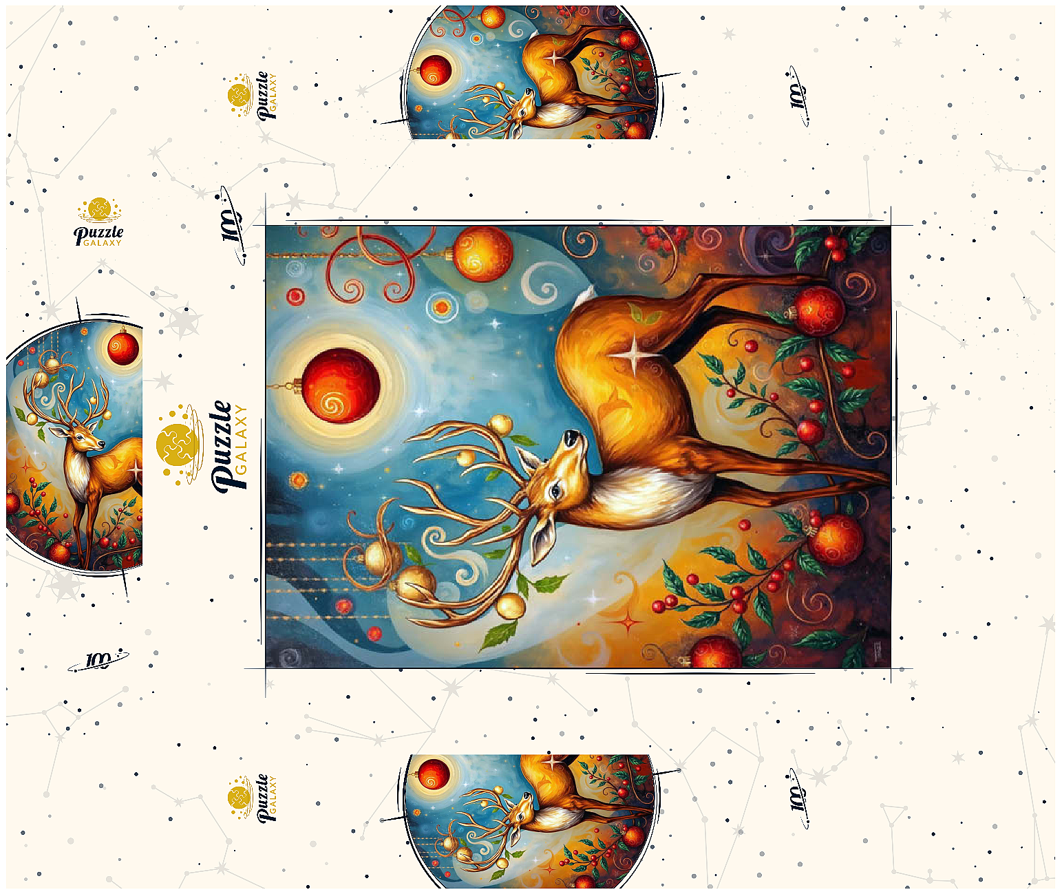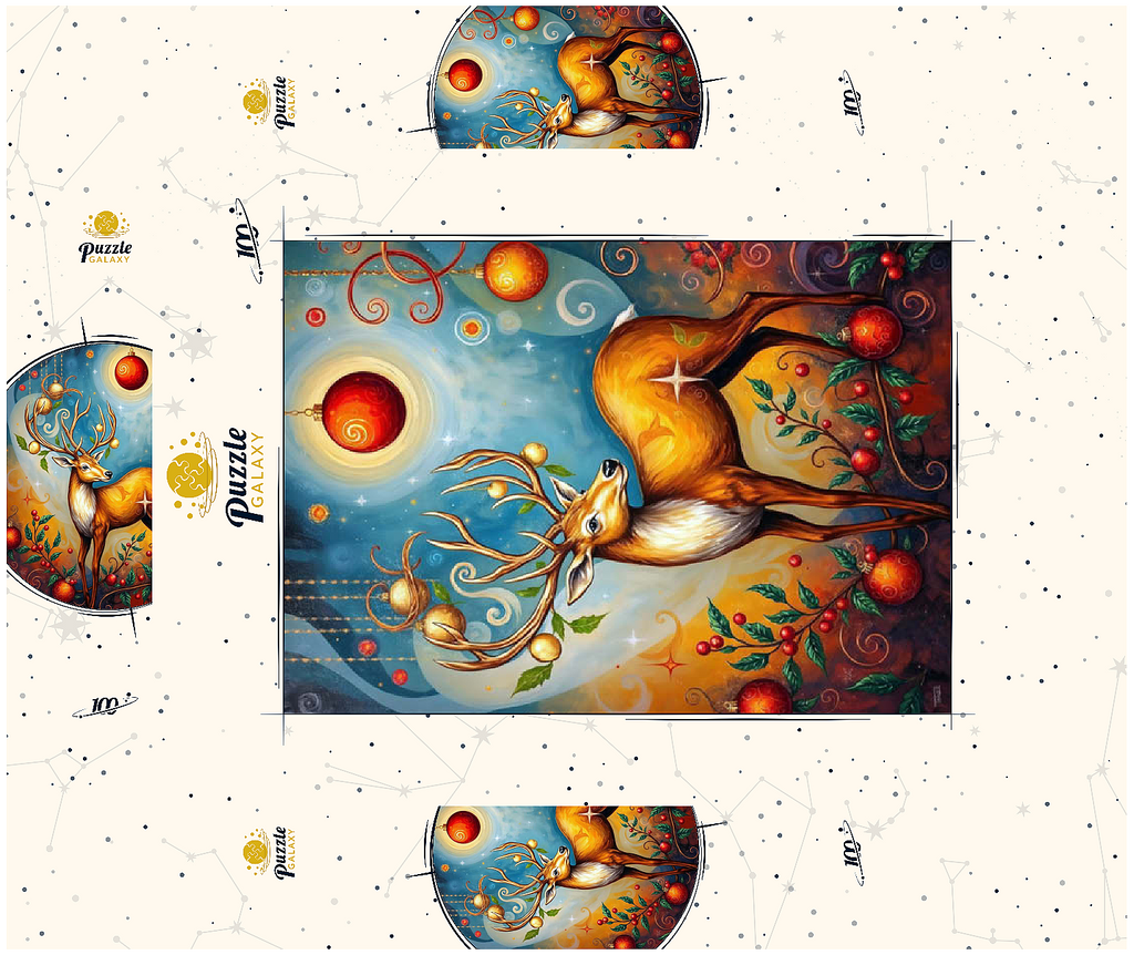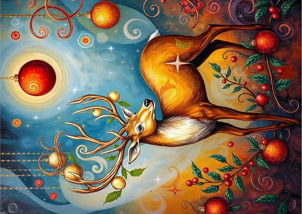 Ein verspieltes digitales Kunstwerk mit einem majestätischen Hirsch, der mit goldenen Geweihen geschmückt ist, die mit glitzernden Weihnachtsornamenten und Stechpalmenblättern verziert sind. Der Hintergrund ist ein magischer Wirbel aus tiefen Blau-, Gold- und Rottönen, mit leuchtenden Sternen und funkelnden Kugeln, die in der Luft schweben. Leuchtend rote Beeren und festliches Grün umgeben den Hirsch und verleihen dem Bild einen klassischen weihnachtlichen Touch. Der sanfte Ausdruck und die elegante Haltung des Hirsches strahlen Wärme und Wunder aus und machen dieses Kunstwerk perfekt für die saisonale Dekoration. Ideal für alle, die Weihnachtsmotive, festliche Tierkunst und bezaubernde Weihnachtsillustrationen lieben.