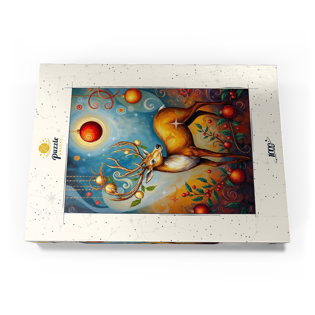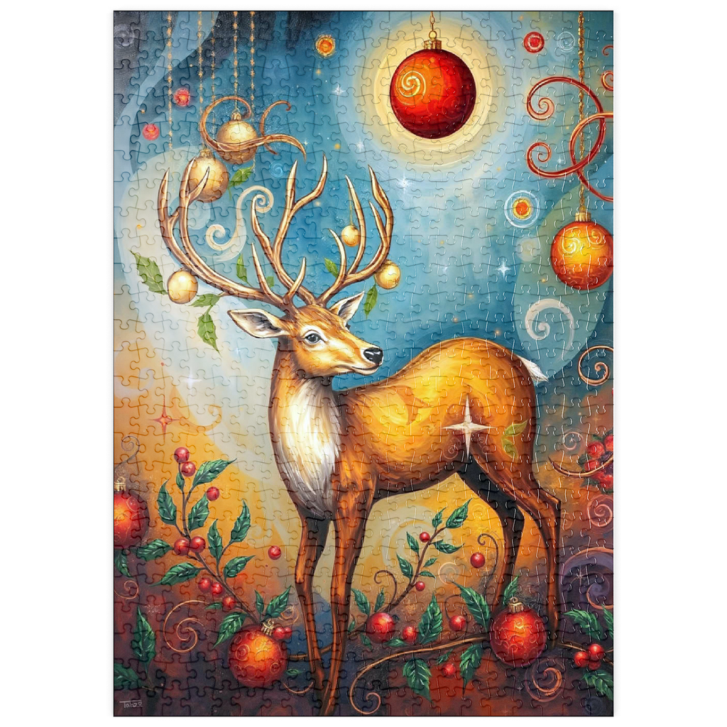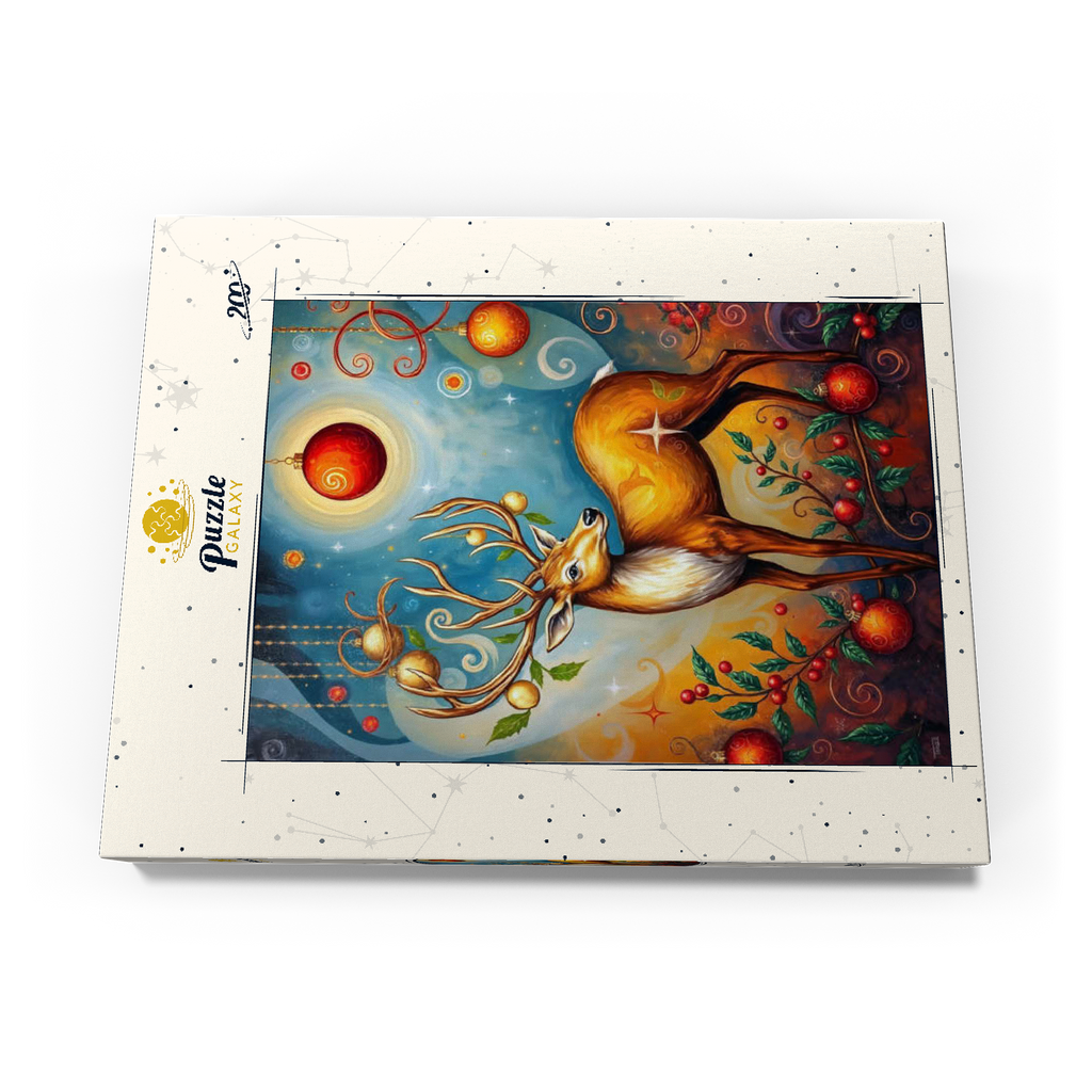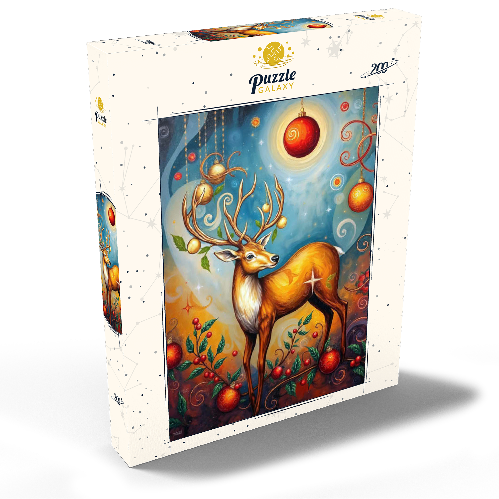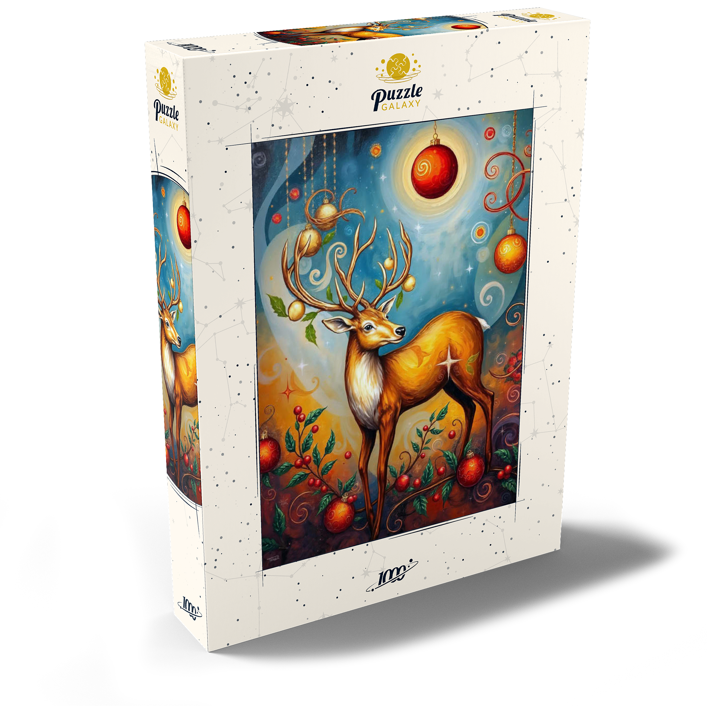 Ein verspieltes digitales Kunstwerk mit einem majestätischen Hirsch, der mit goldenen Geweihen geschmückt ist, die mit glitzernden Weihnachtsornamenten und Stechpalmenblättern verziert sind. Der Hintergrund ist ein magischer Wirbel aus tiefen Blau-, Gold- und Rottönen, mit leuchtenden Sternen und funkelnden Kugeln, die in der Luft schweben. Leuchtend rote Beeren und festliches Grün umgeben den Hirsch und verleihen dem Bild einen klassischen weihnachtlichen Touch. Der sanfte Ausdruck und die elegante Haltung des Hirsches strahlen Wärme und Wunder aus und machen dieses Kunstwerk perfekt für die saisonale Dekoration. Ideal für alle, die Weihnachtsmotive, festliche Tierkunst und bezaubernde Weihnachtsillustrationen lieben.