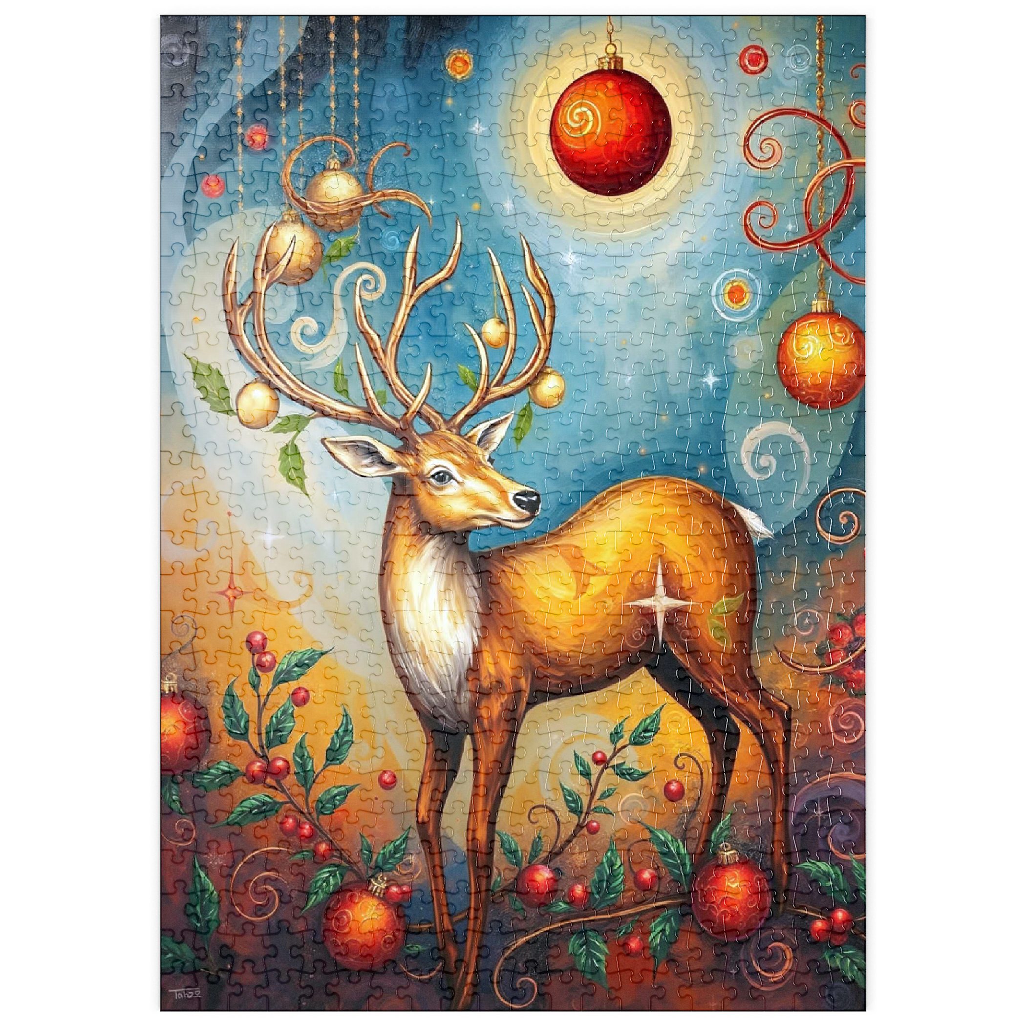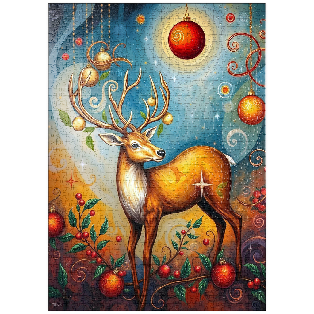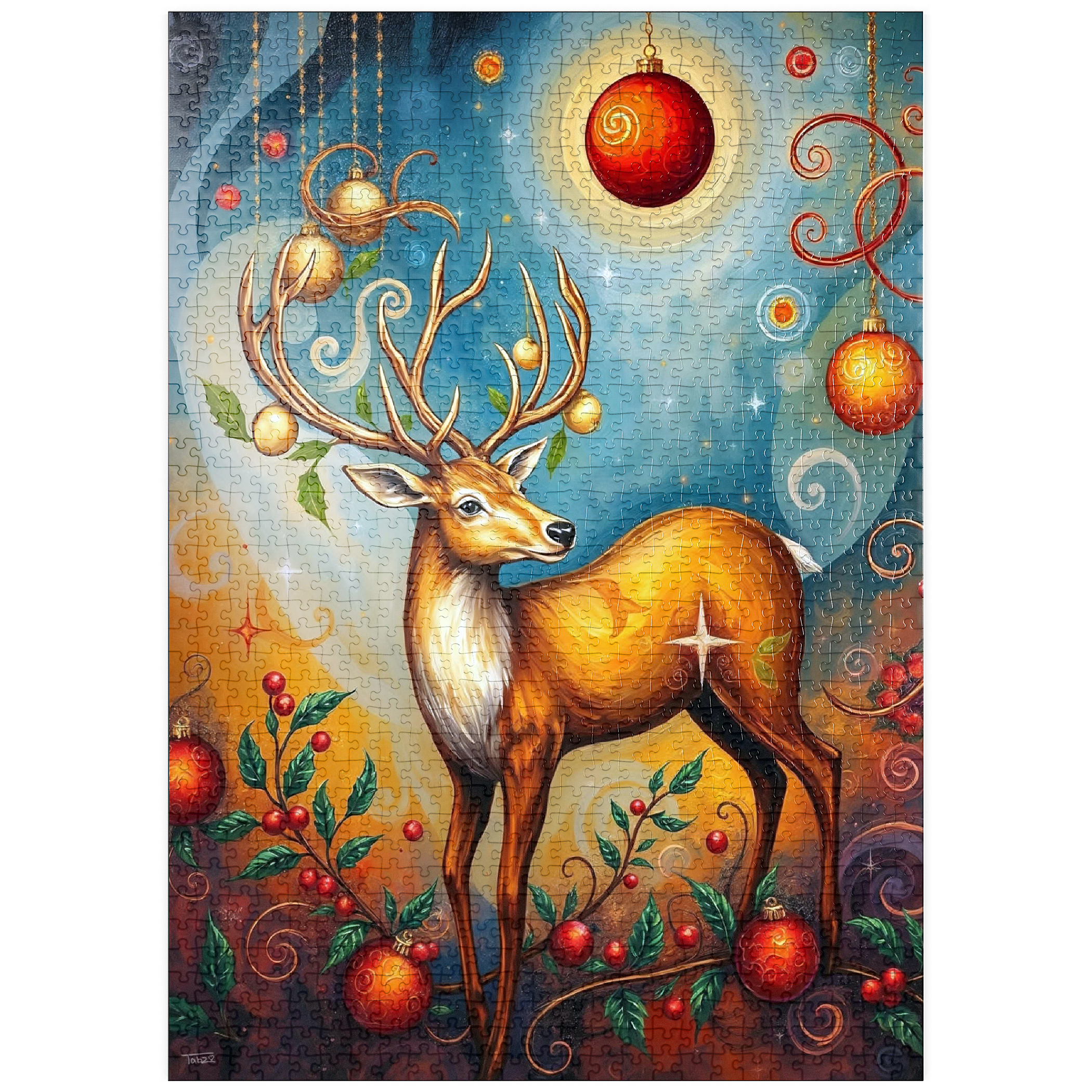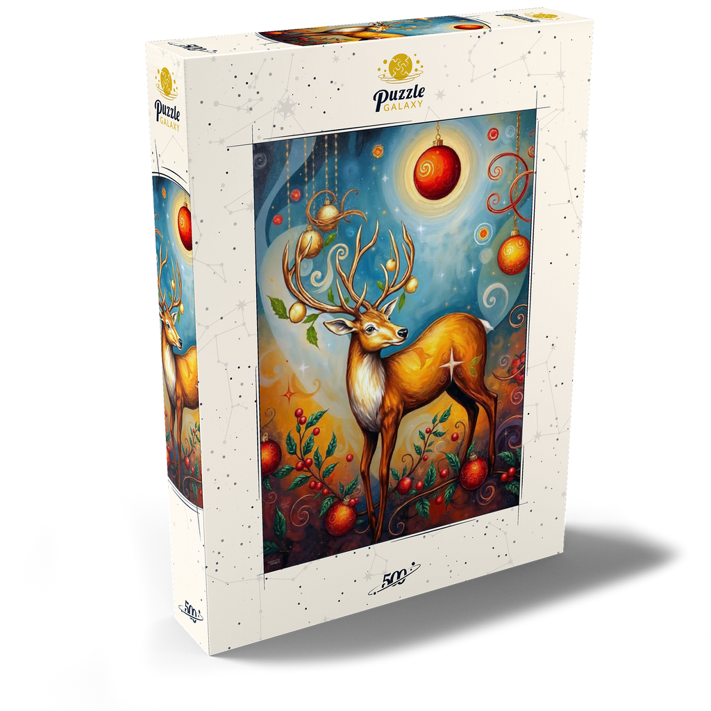 Ein verspieltes digitales Kunstwerk mit einem majestätischen Hirsch, der mit goldenen Geweihen geschmückt ist, die mit glitzernden Weihnachtsornamenten und Stechpalmenblättern verziert sind. Der Hintergrund ist ein magischer Wirbel aus tiefen Blau-, Gold- und Rottönen, mit leuchtenden Sternen und funkelnden Kugeln, die in der Luft schweben. Leuchtend rote Beeren und festliches Grün umgeben den Hirsch und verleihen dem Bild einen klassischen weihnachtlichen Touch. Der sanfte Ausdruck und die elegante Haltung des Hirsches strahlen Wärme und Wunder aus und machen dieses Kunstwerk perfekt für die saisonale Dekoration. Ideal für alle, die Weihnachtsmotive, festliche Tierkunst und bezaubernde Weihnachtsillustrationen lieben.